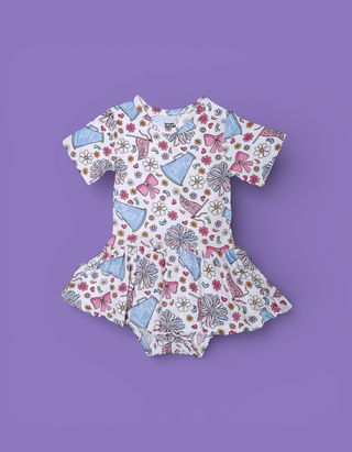 This seems to run pretty small. It is very cute but also very tight on my 9 month old. Not much stretch at all and the bottoms were tiny. Does not seem to accomodate for a swim diaper