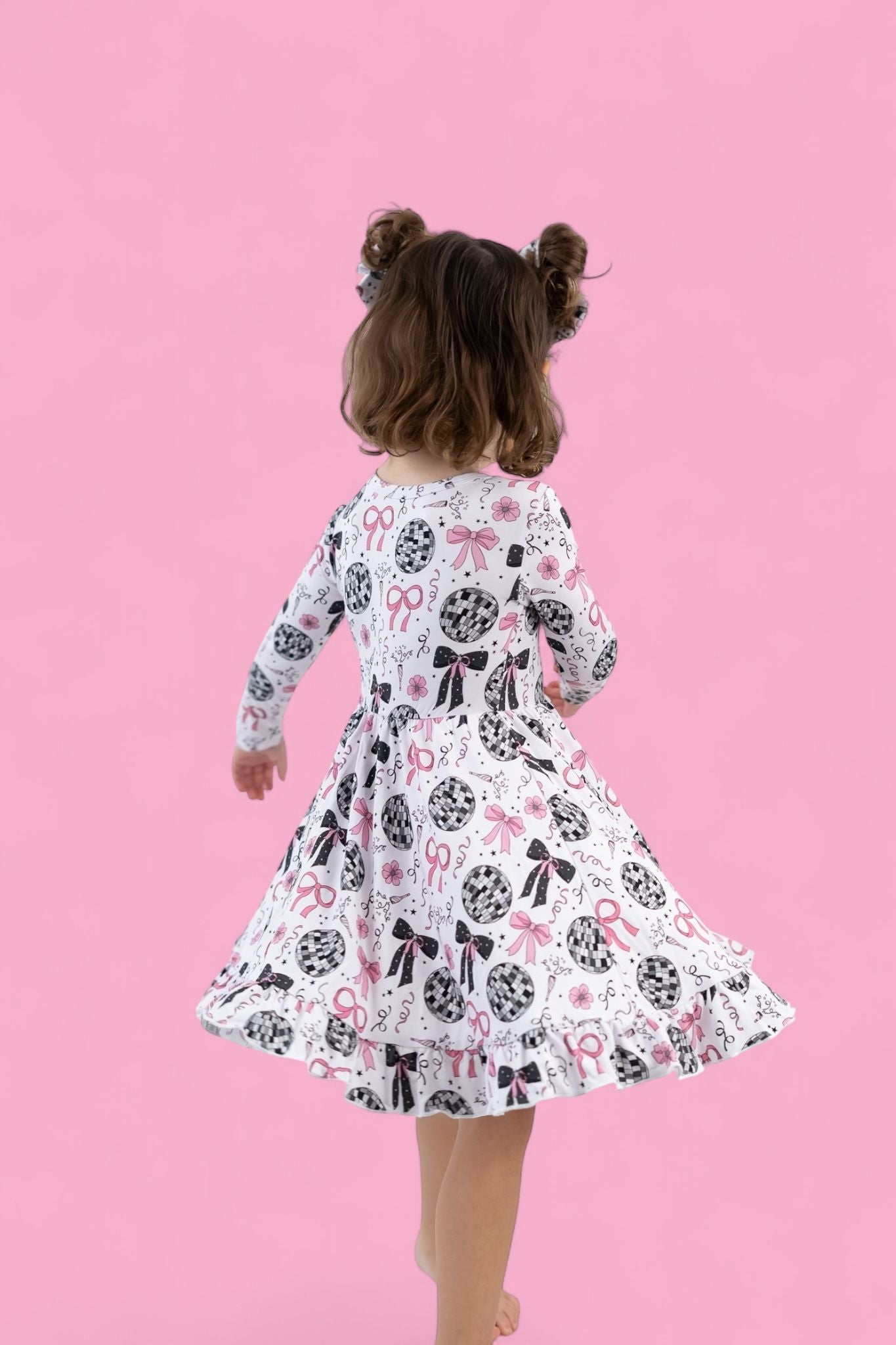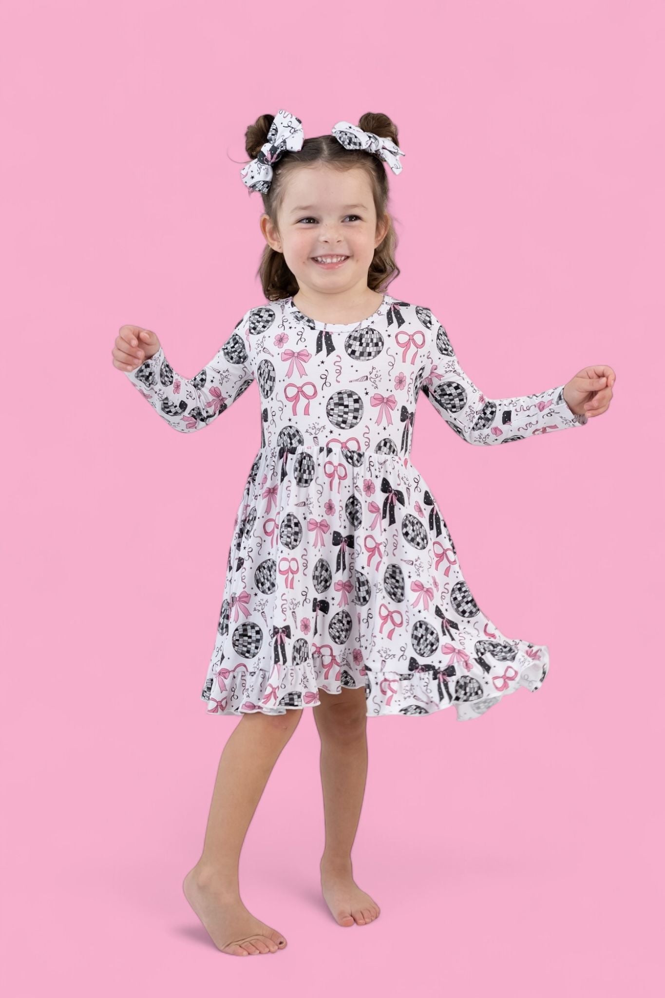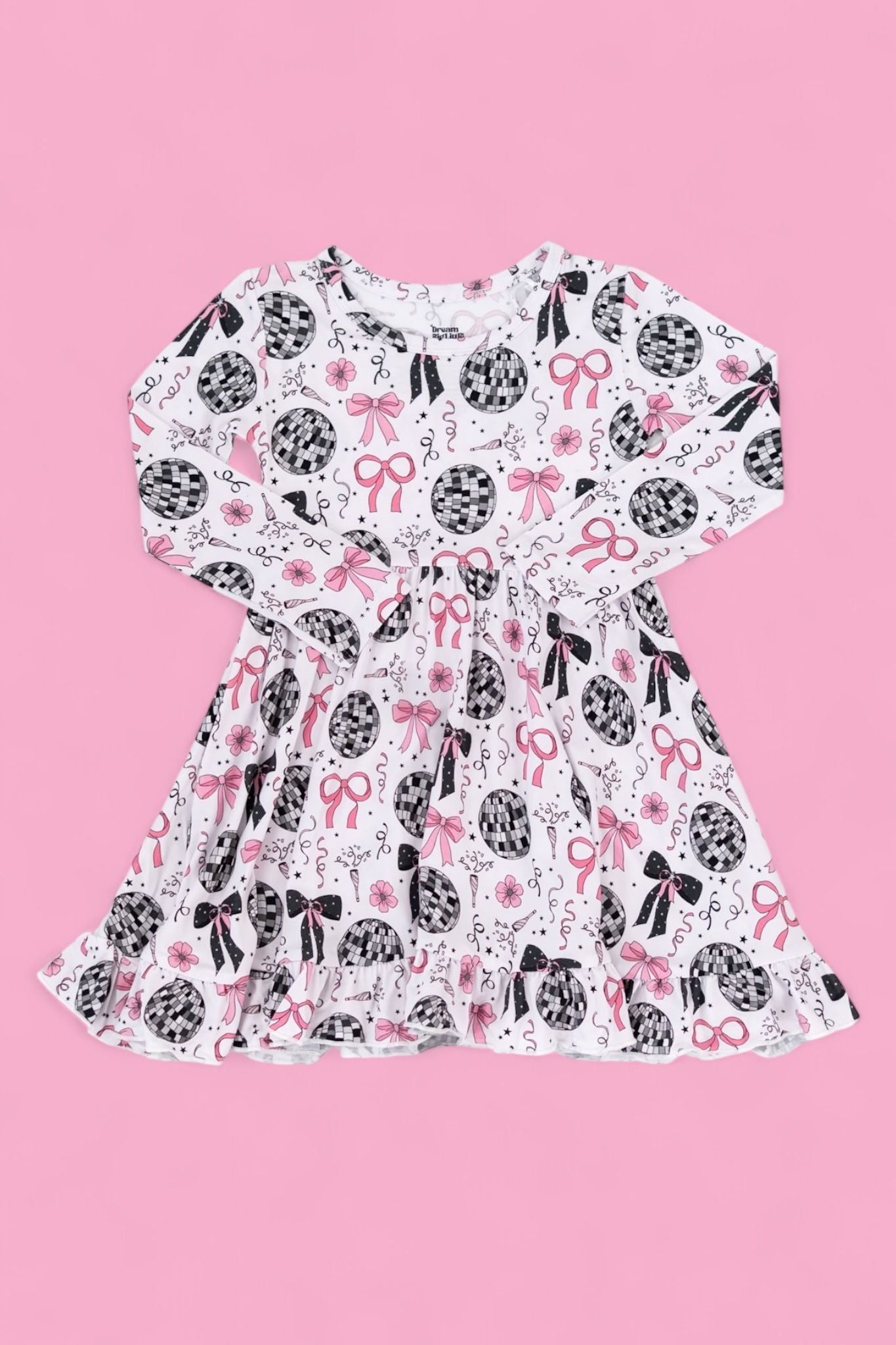 Sparkle, twirl, and shine in the Midnight Disco Darling Dream Ruffle Dress! This dazzling dress features glittery disco balls, festive confetti, and sweet pink bows—all set against a starry backdrop for the ultimate party-ready look. Made from buttery-soft bamboo and finished with playful ruffle details, it’s as comfy as it is charming.