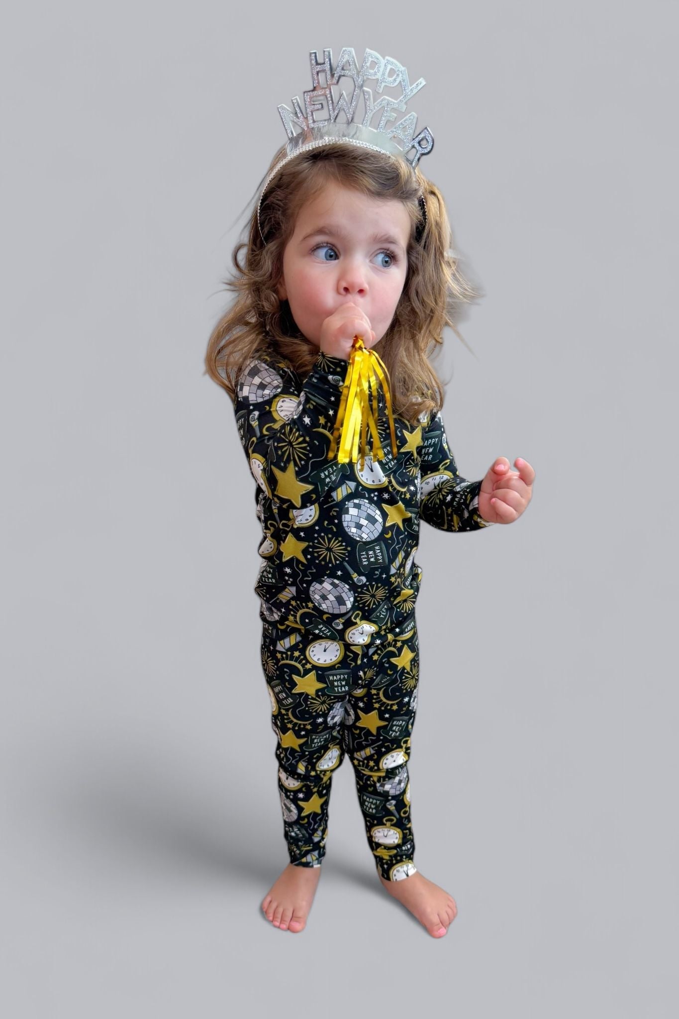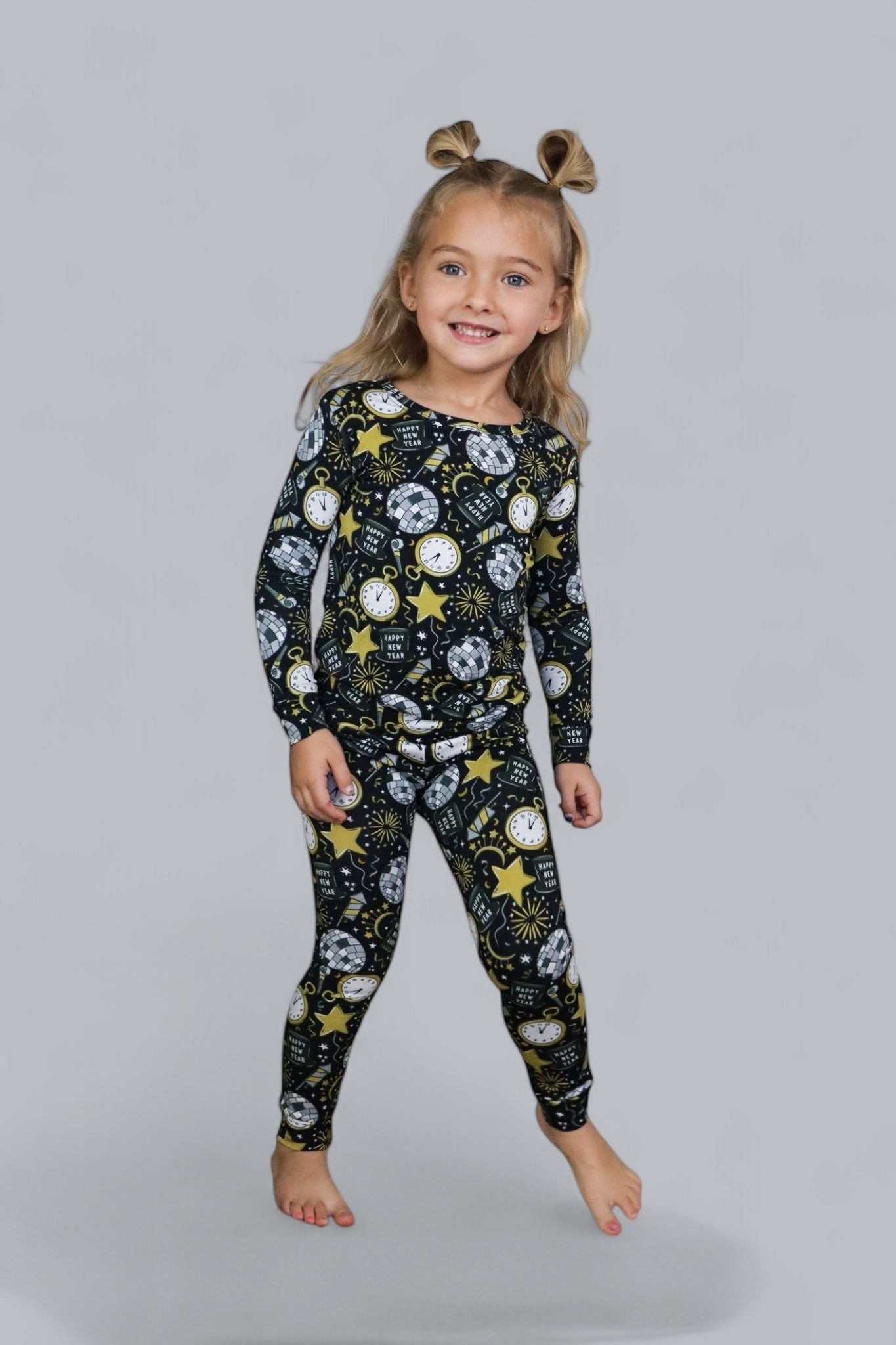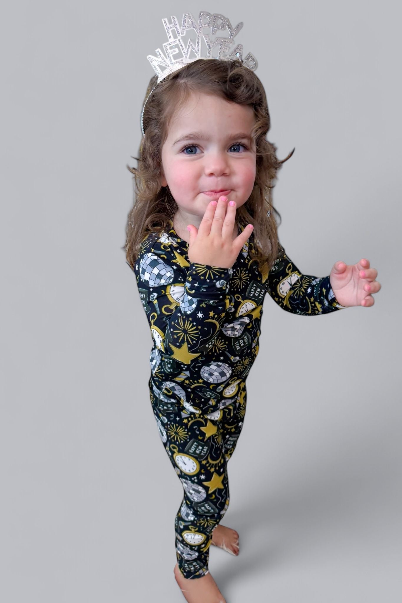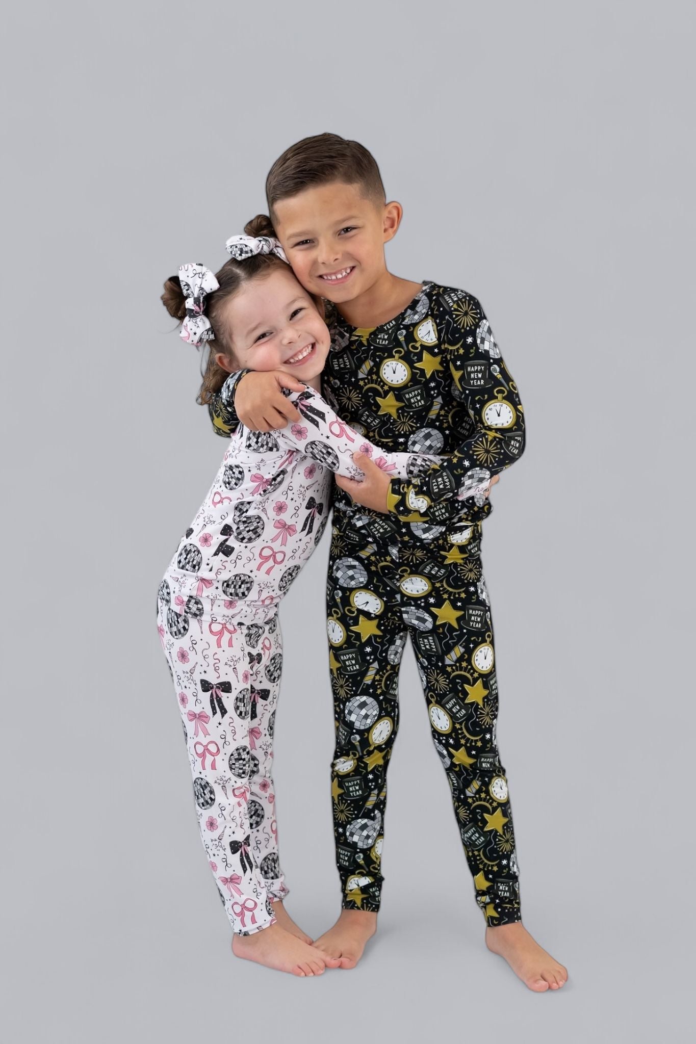 Let your little one shine into the new year with the NYE Disco & Dreams Dream Set! This dazzling pajama set features shimmering disco balls, party hats, countdown clocks, rockets, and festive stars—all on a chic black background with pops of silver and gold. Made from our buttery-soft bamboo fabric, it's the perfect mix of celebration and cozy.