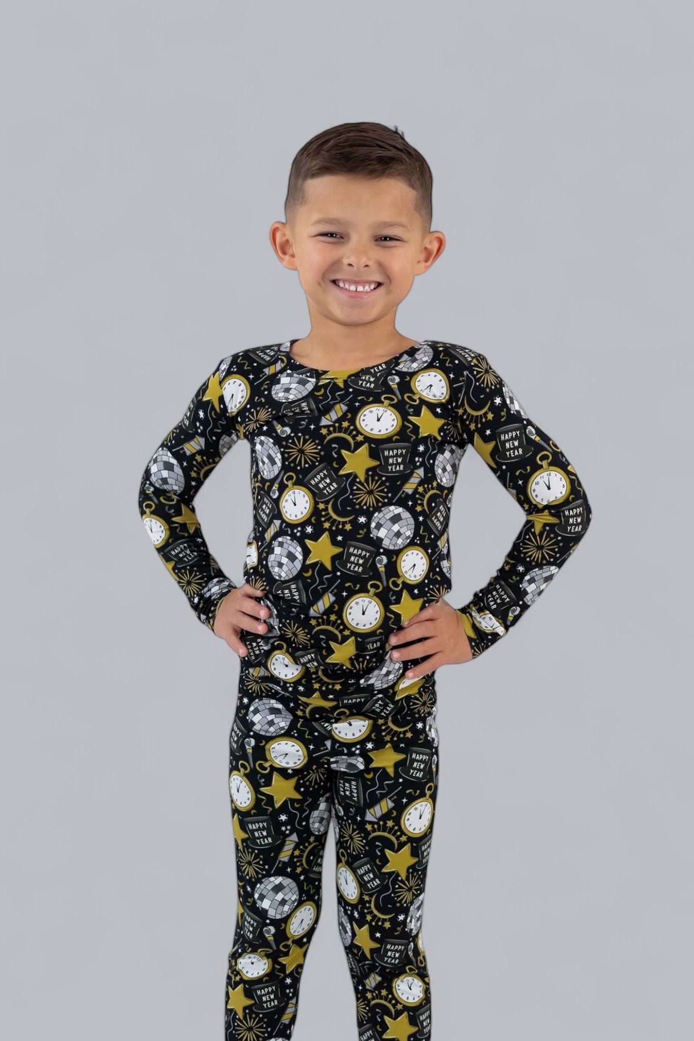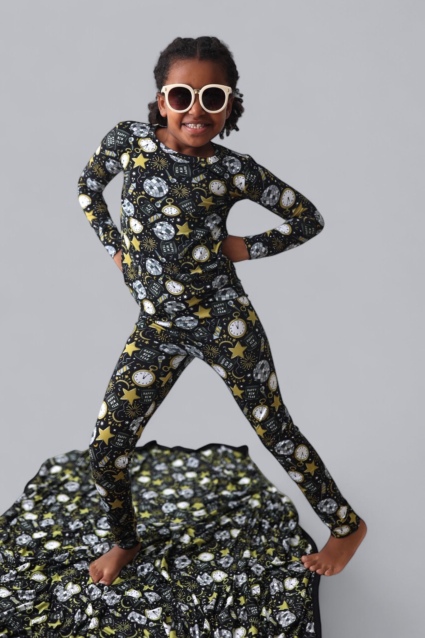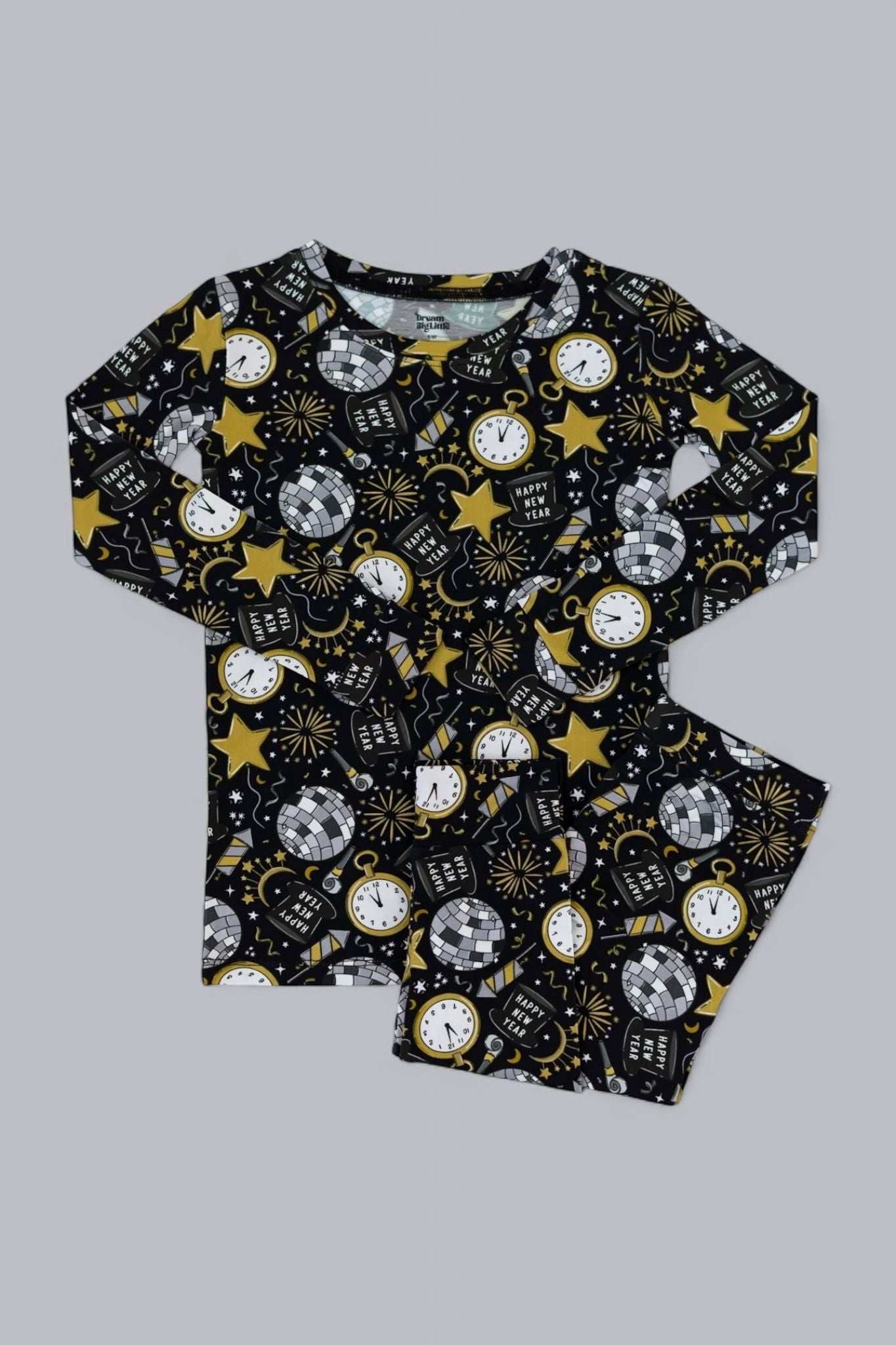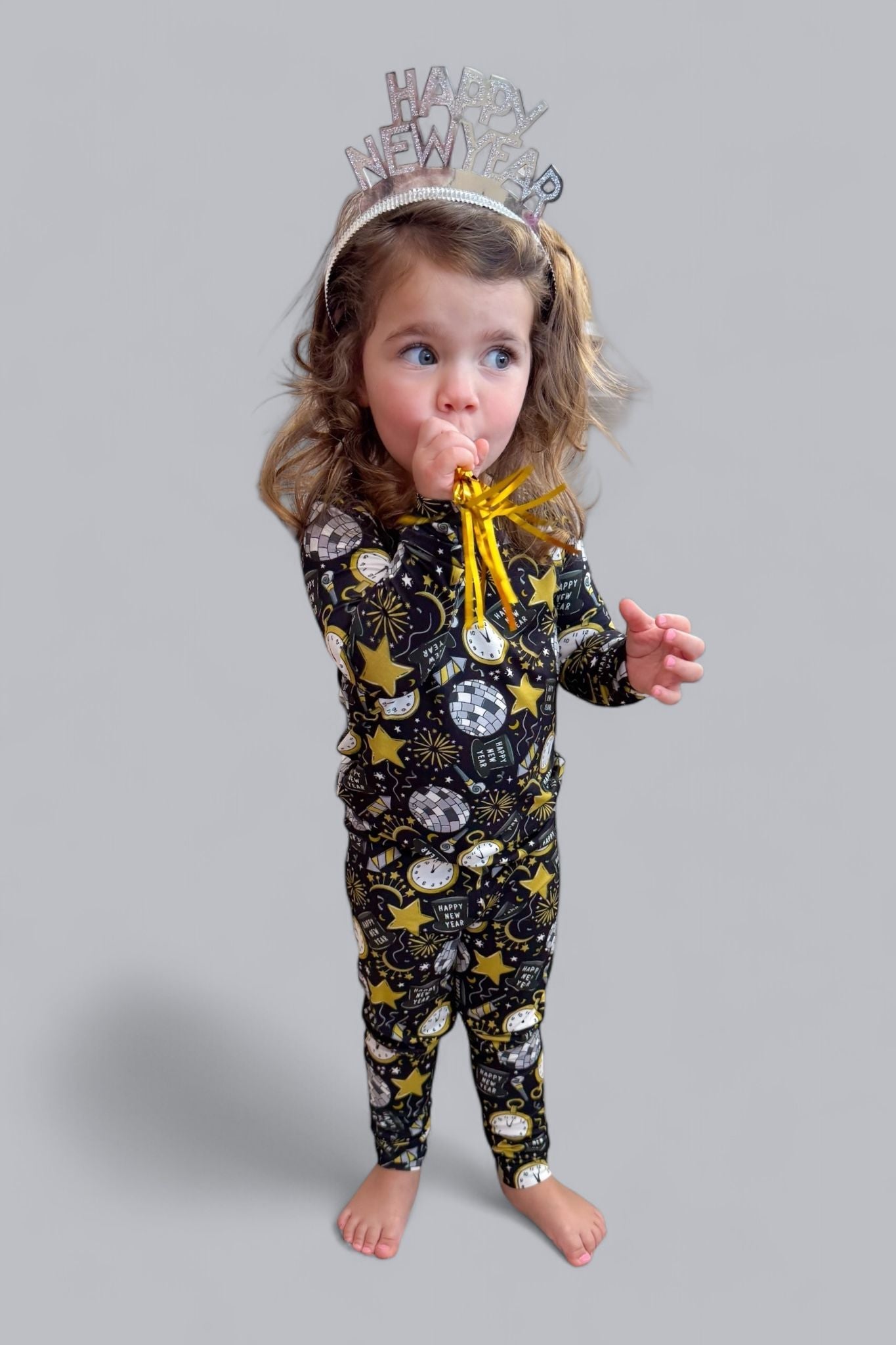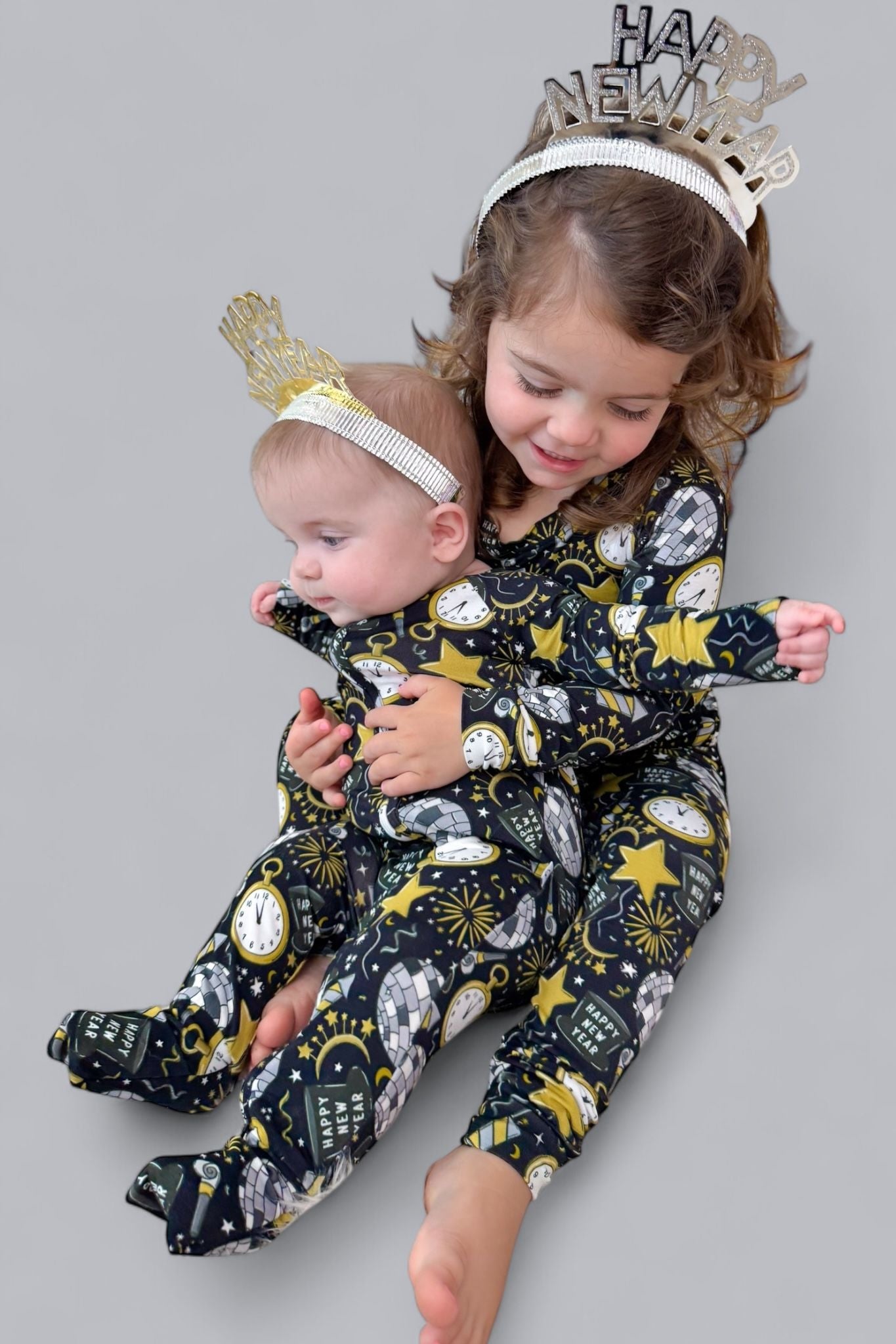 Let your little one shine into the new year with the NYE Disco & Dreams Dream Set! This dazzling pajama set features shimmering disco balls, party hats, countdown clocks, rockets, and festive stars—all on a chic black background with pops of silver and gold. Made from our buttery-soft bamboo fabric, it's the perfect mix of celebration and cozy.