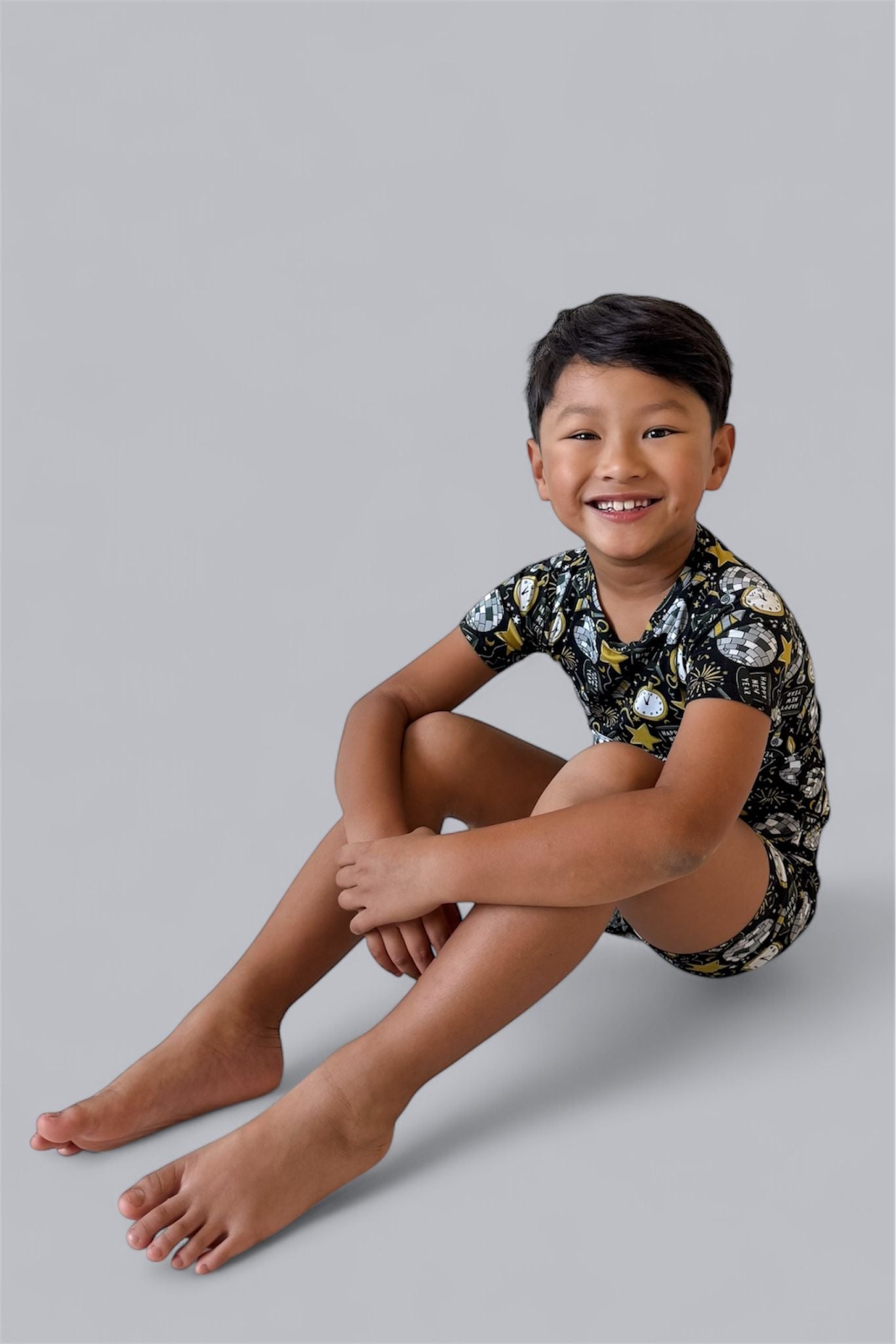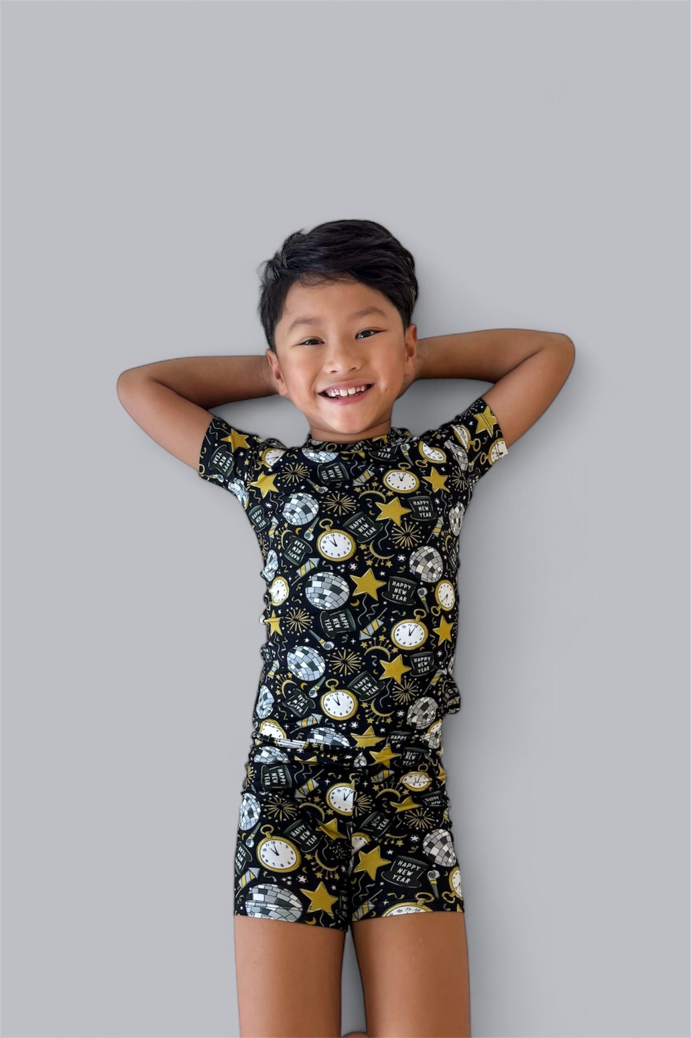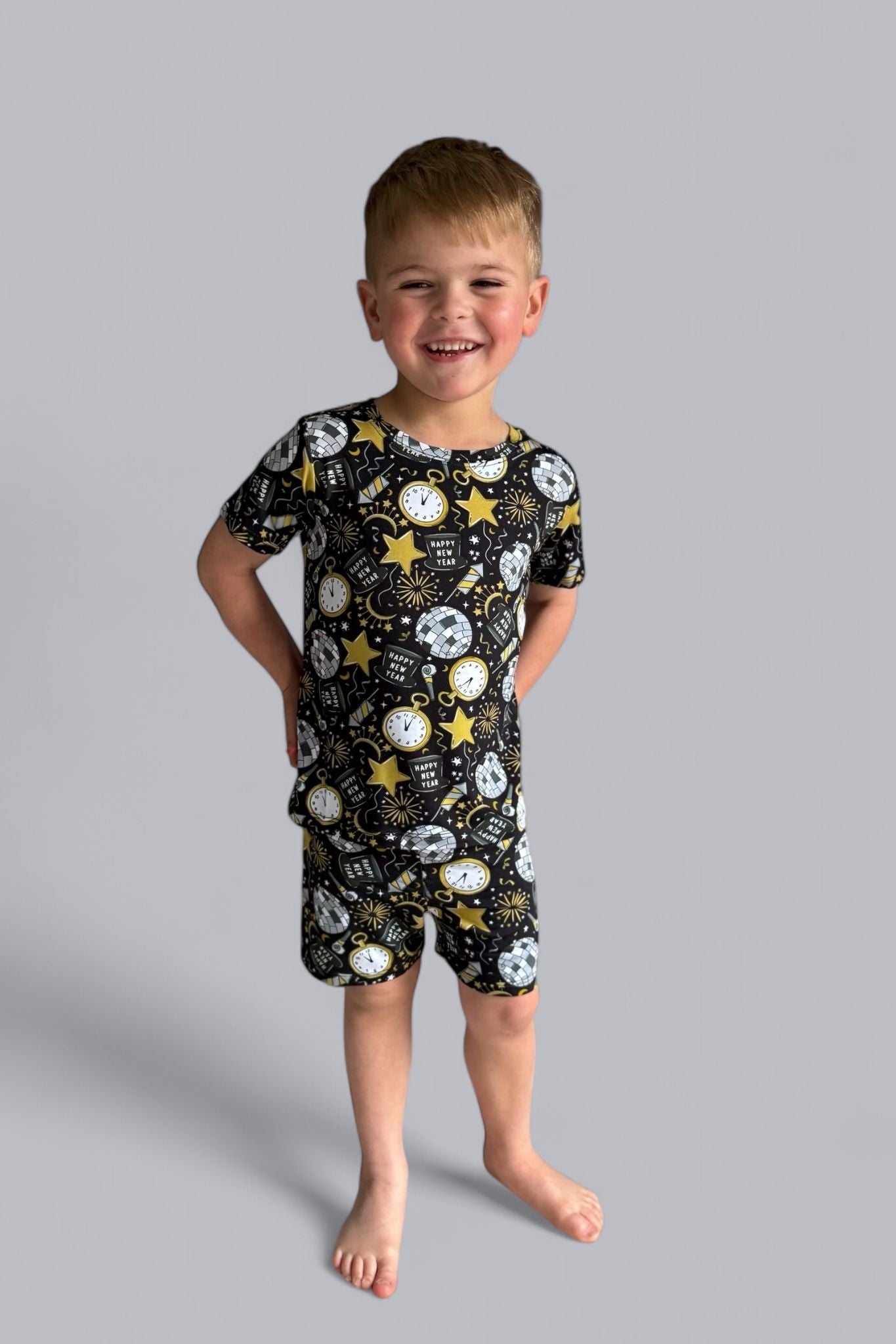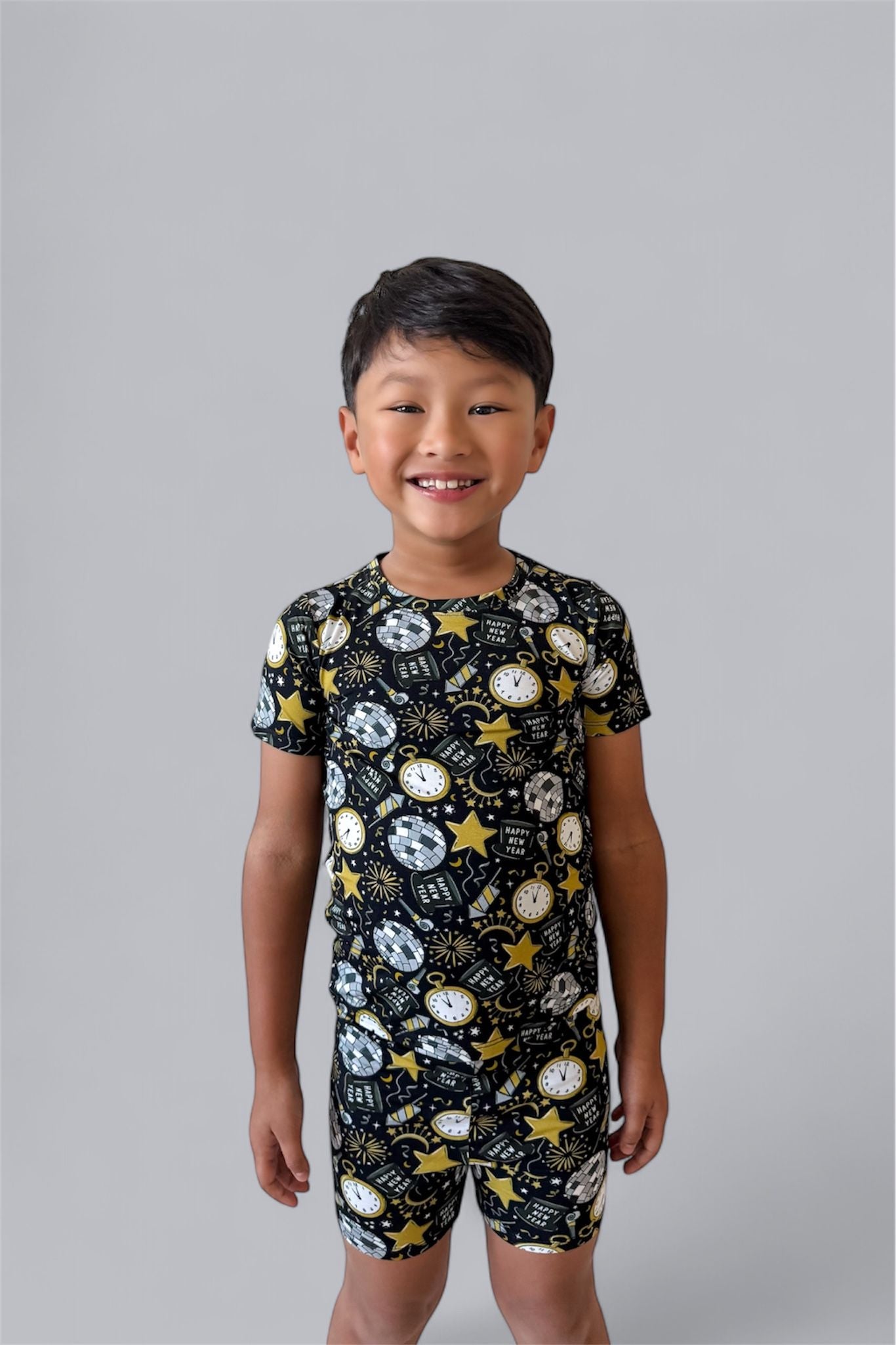 Celebrate in style with the NYE Disco & Dreams Dream Short Set! This festive favorite features sparkling disco balls, countdown clocks, rockets, and party hats in glam gold and silver on a sleek black backdrop. Crafted from our buttery-soft bamboo, it’s the perfect combo of comfy and cool for ringing in the new year—or any day that needs a little extra sparkle!
