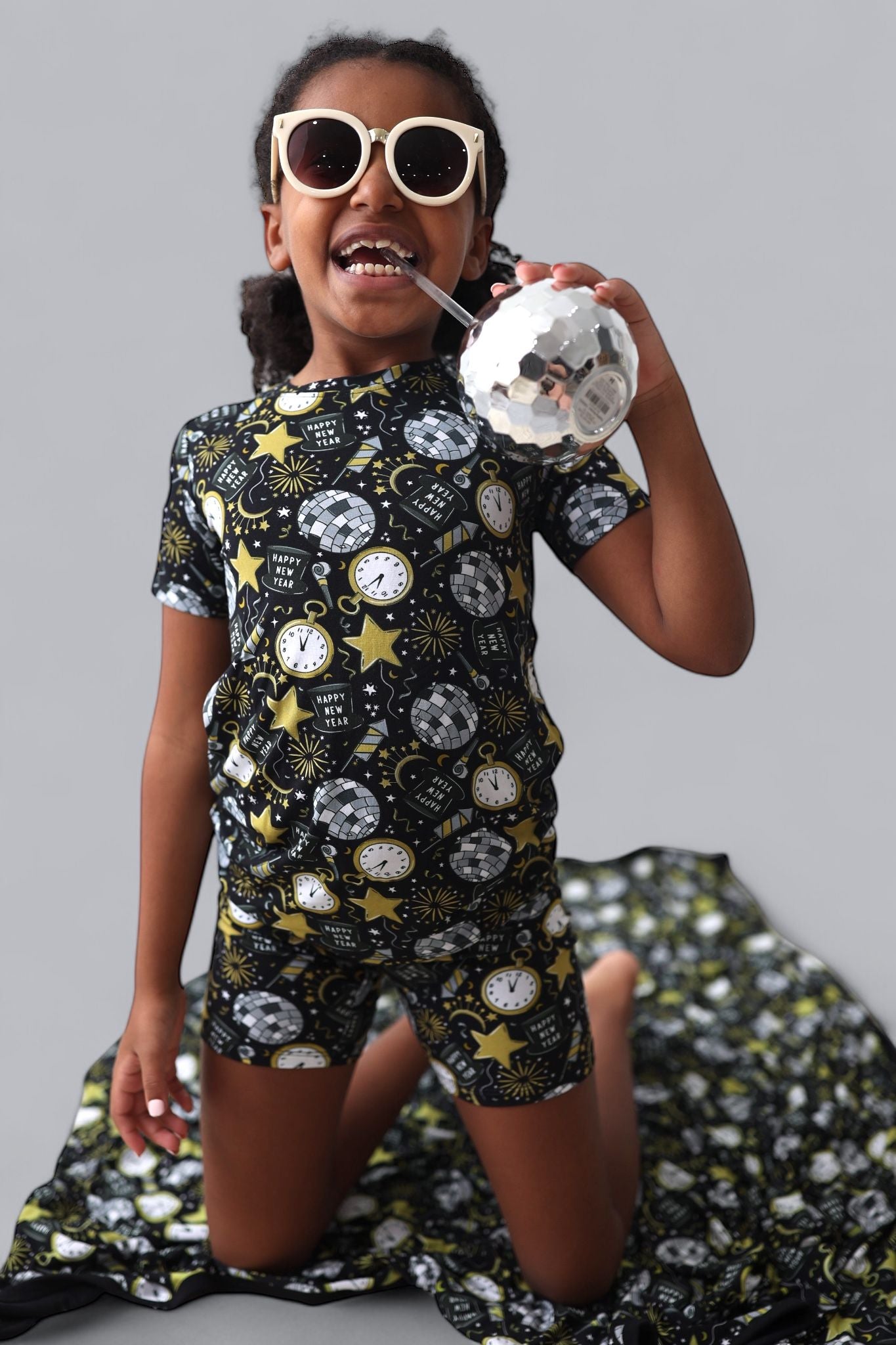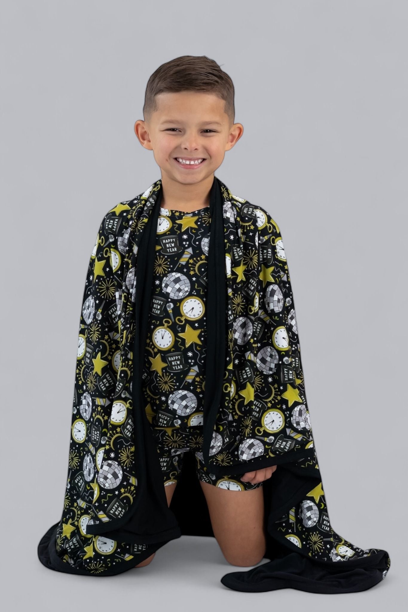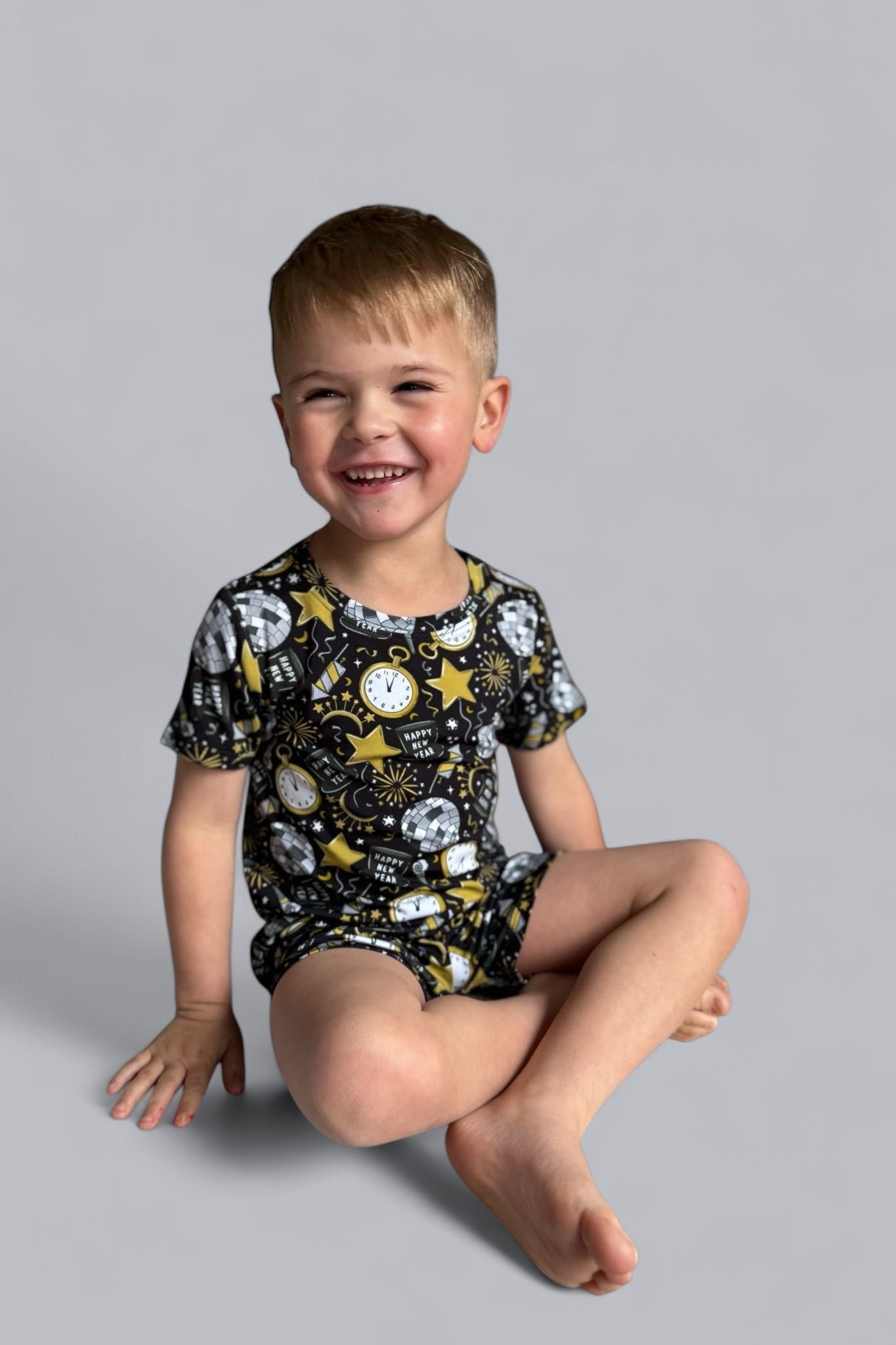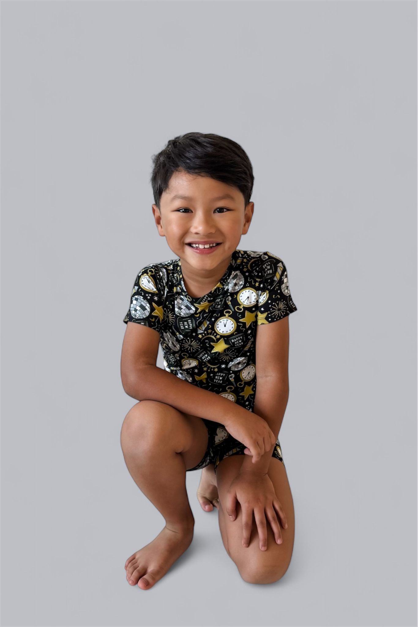 Celebrate in style with the NYE Disco & Dreams Dream Short Set! This festive favorite features sparkling disco balls, countdown clocks, rockets, and party hats in glam gold and silver on a sleek black backdrop. Crafted from our buttery-soft bamboo, it’s the perfect combo of comfy and cool for ringing in the new year—or any day that needs a little extra sparkle!
