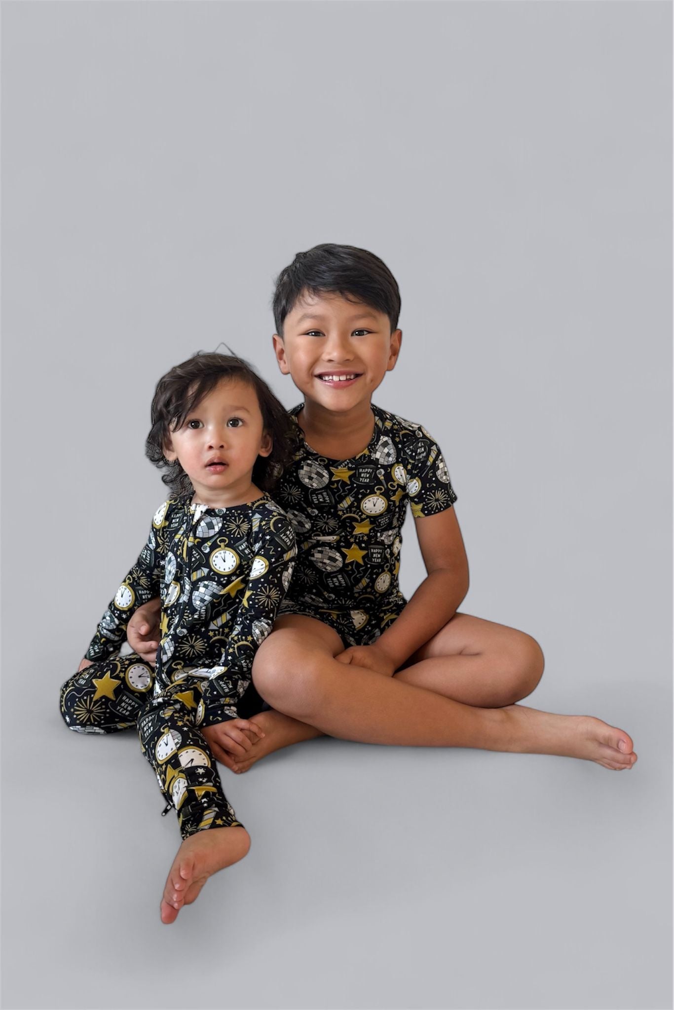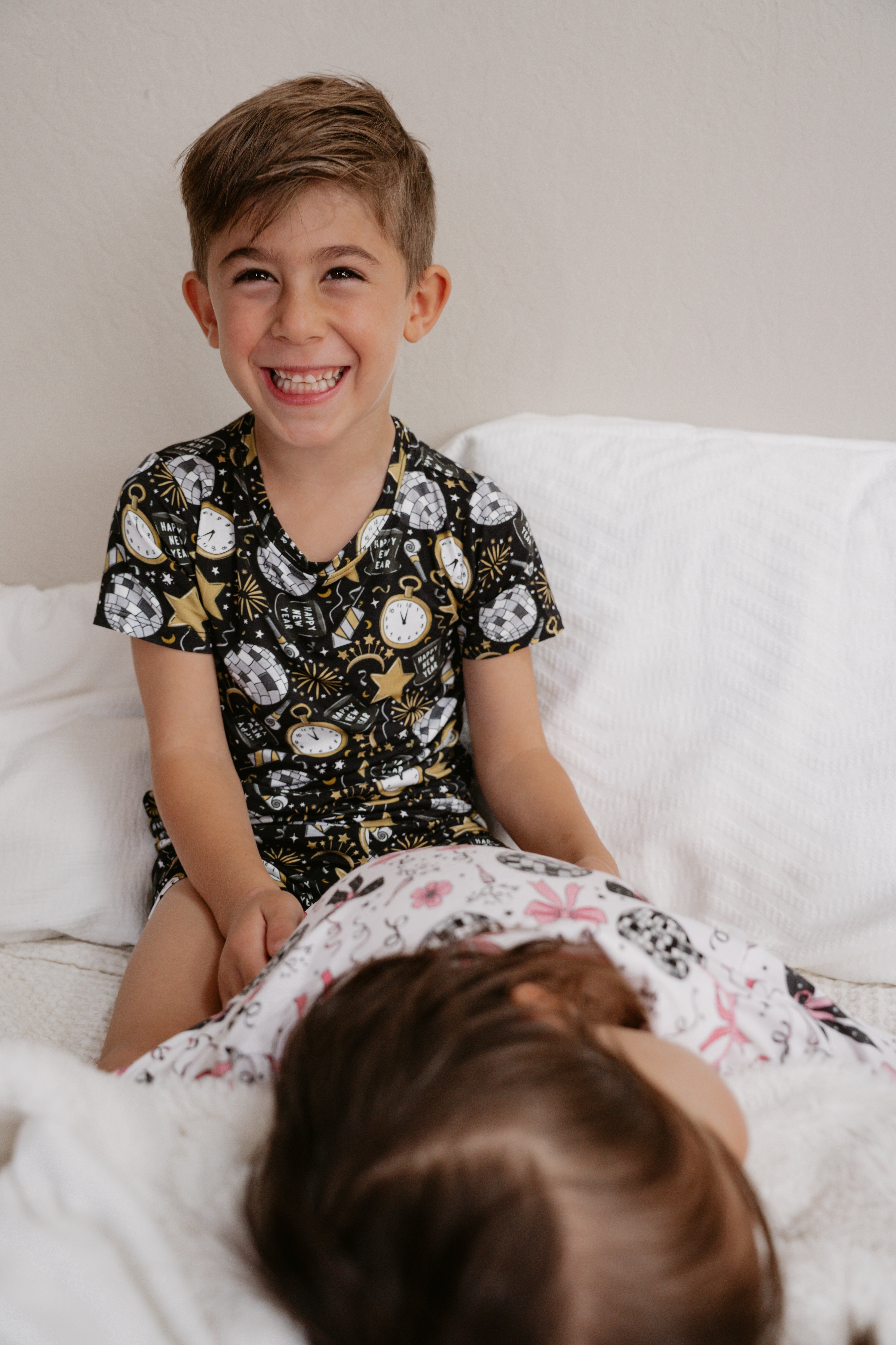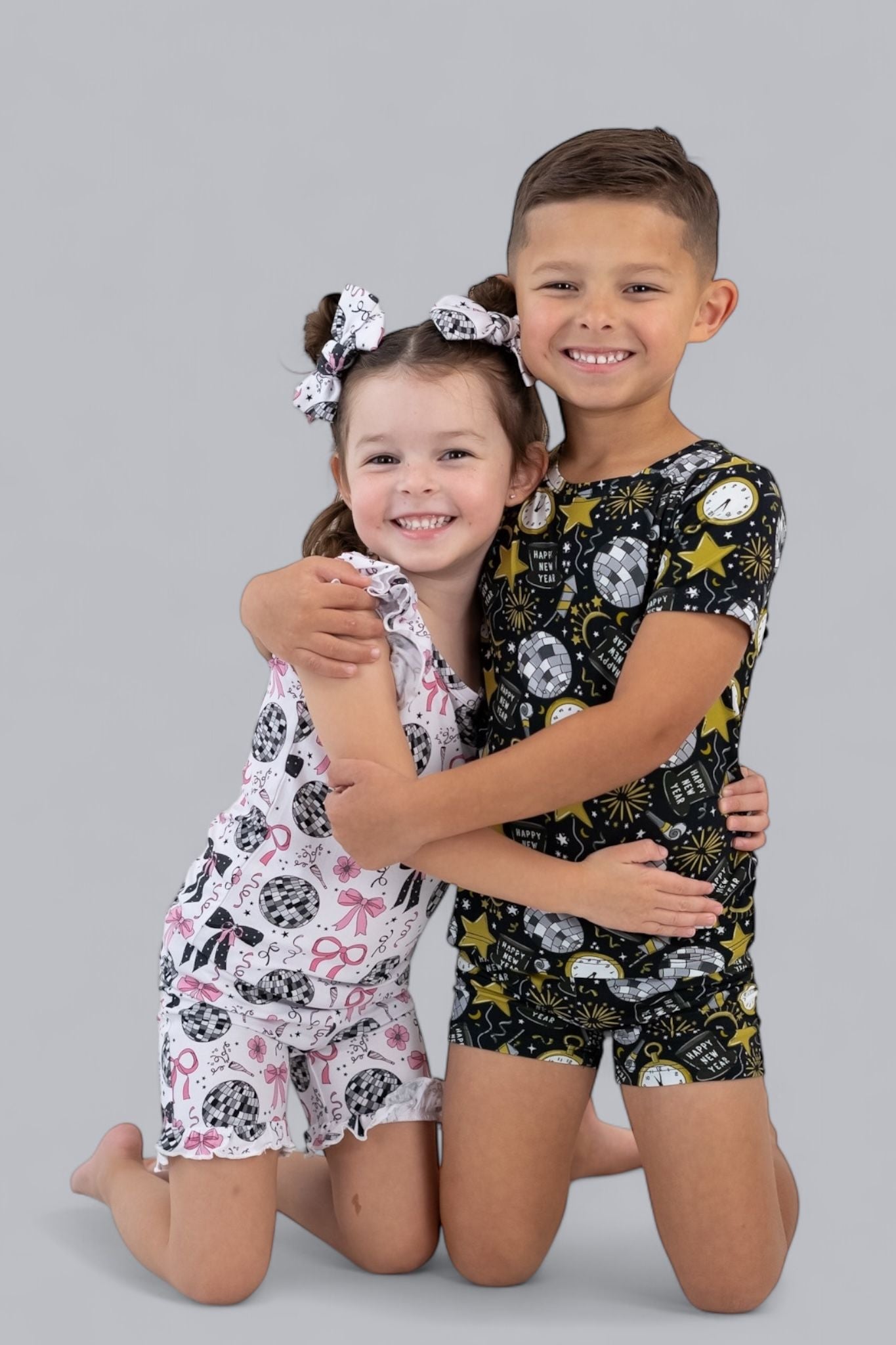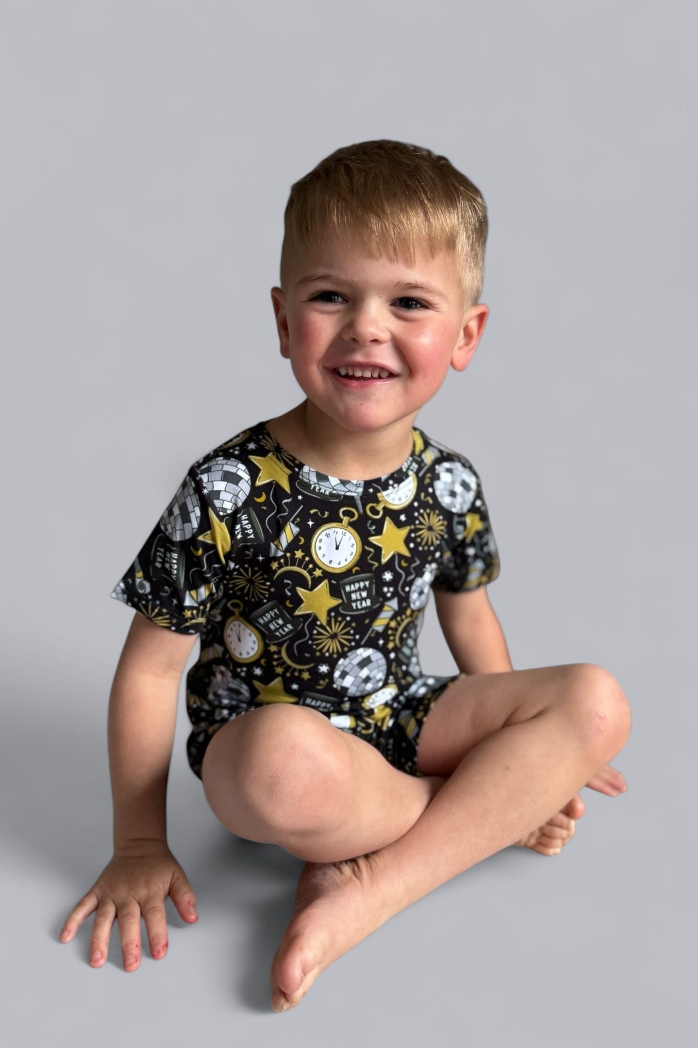 Celebrate in style with the NYE Disco & Dreams Dream Short Set! This festive favorite features sparkling disco balls, countdown clocks, rockets, and party hats in glam gold and silver on a sleek black backdrop. Crafted from our buttery-soft bamboo, it’s the perfect combo of comfy and cool for ringing in the new year—or any day that needs a little extra sparkle!