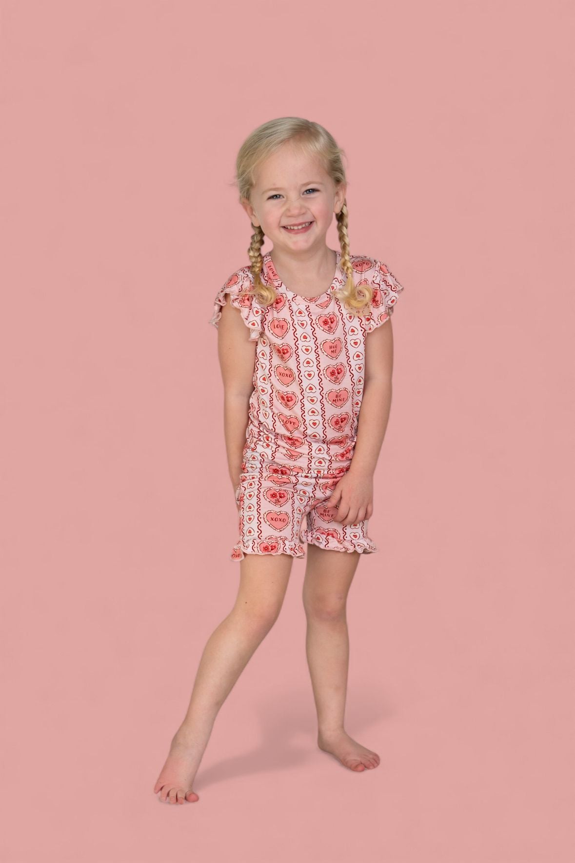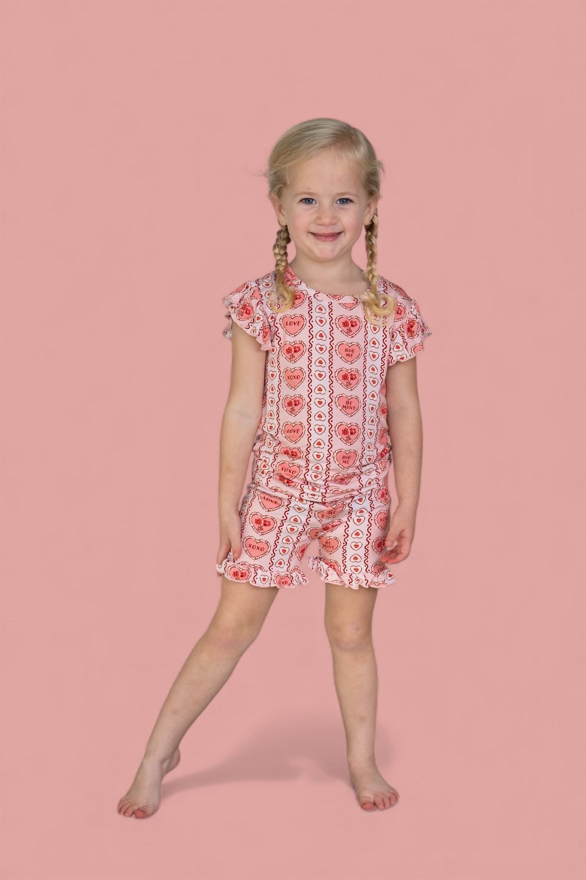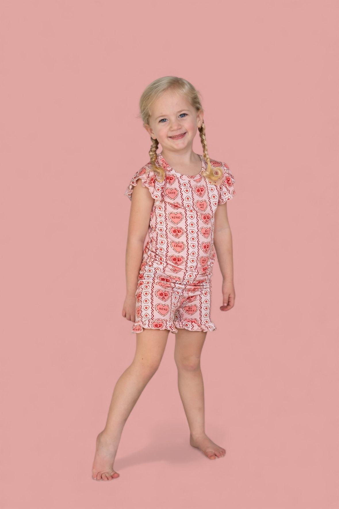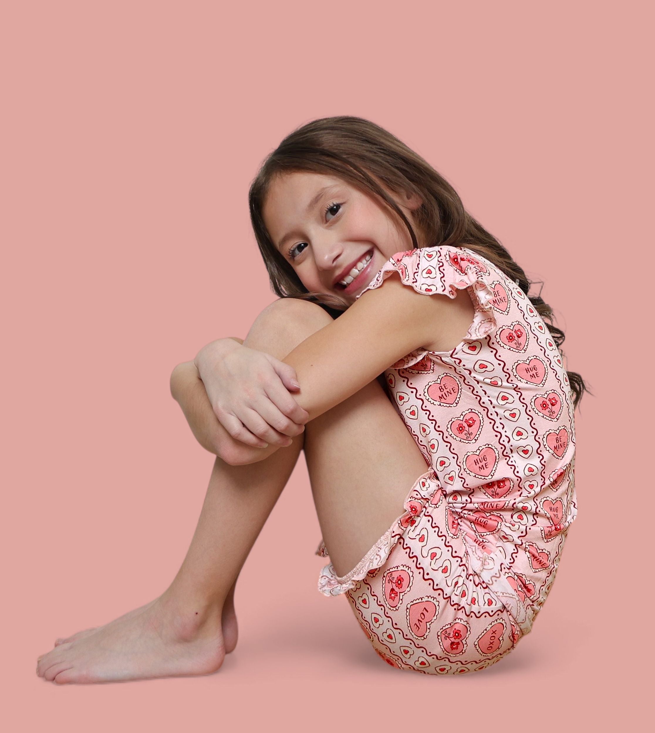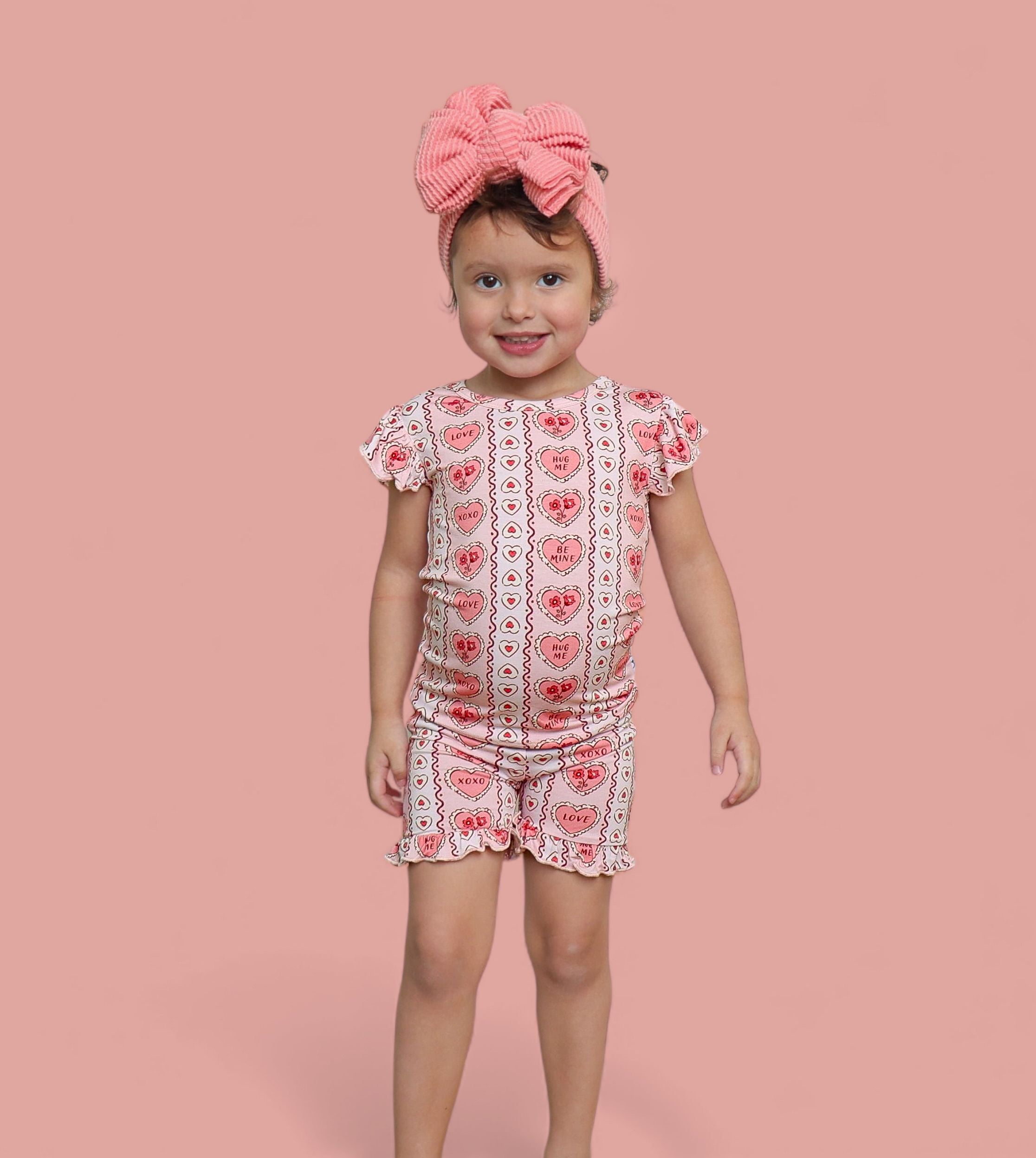 All the “Be Mine” vibes in a breezy little set! The Candy Hearts Dream Ruffle Short Set features our playful pastel candy-heart print with sweet sayings like “Love,” “XOXO,” and “Hug Me” on buttery-soft bamboo. The ruffle-trimmed top and matching shorts are lightweight, breathable, and perfect for warm days, playdates, or cozy lounging.