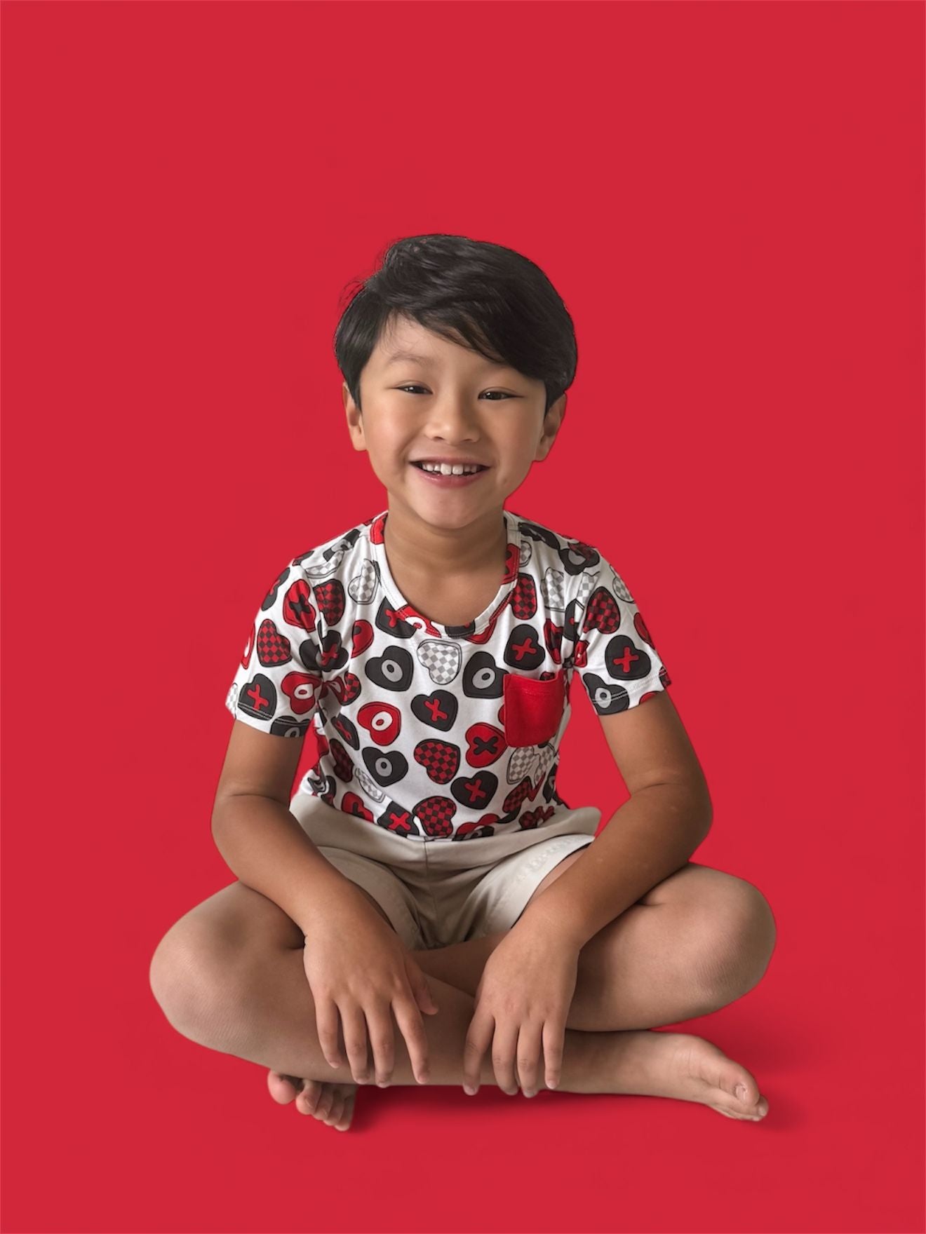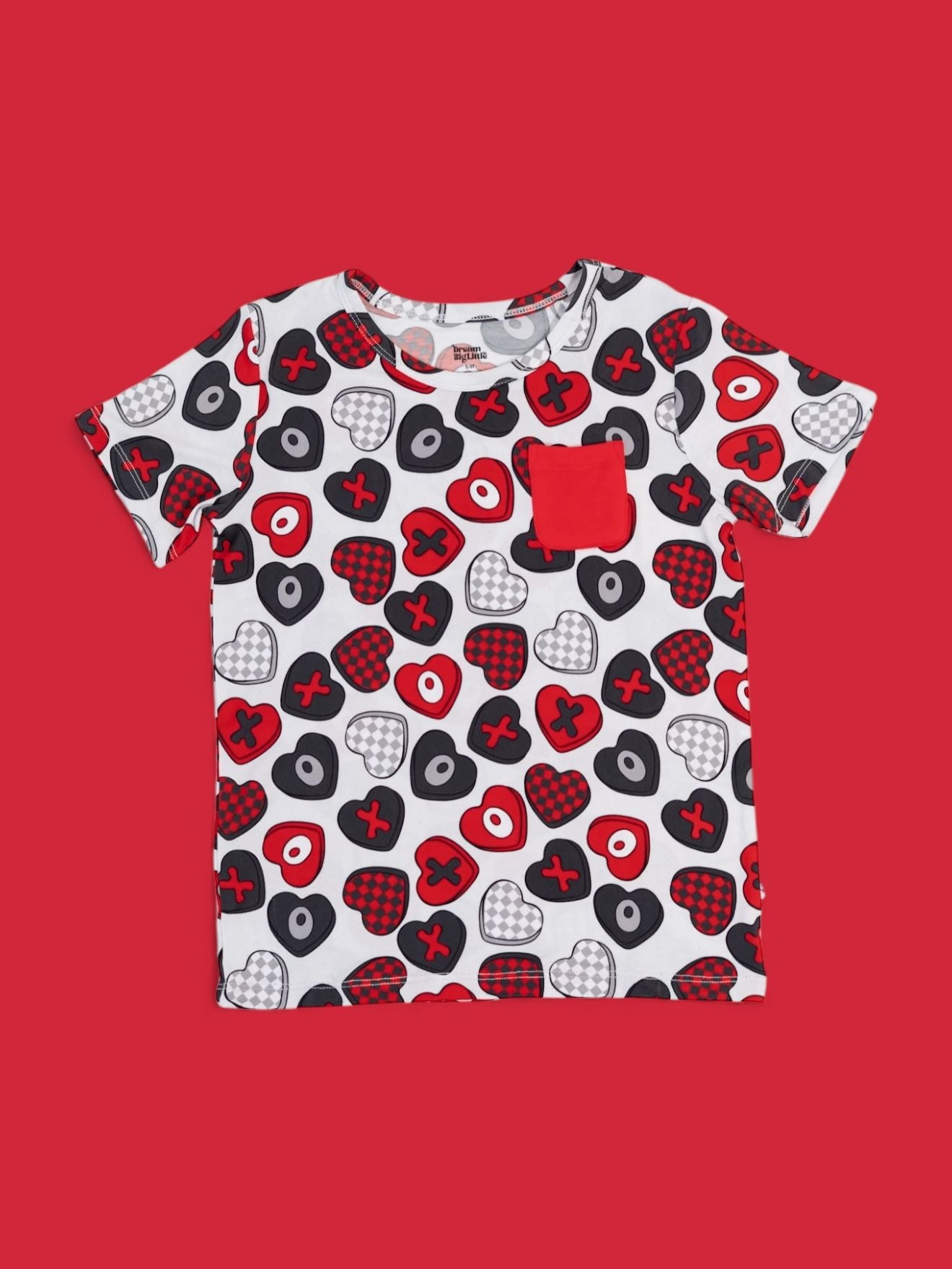 Everyday comfort with a pop of love! The Cross My Heart Dream Pocket Tee is crafted from our signature buttery-soft bamboo fabric and features a bold all-over print of hearts and X’s in shades of red, black, and white. Finished with a functional chest pocket, it’s perfect for pairing with joggers, shorts, or layering for all-day play.