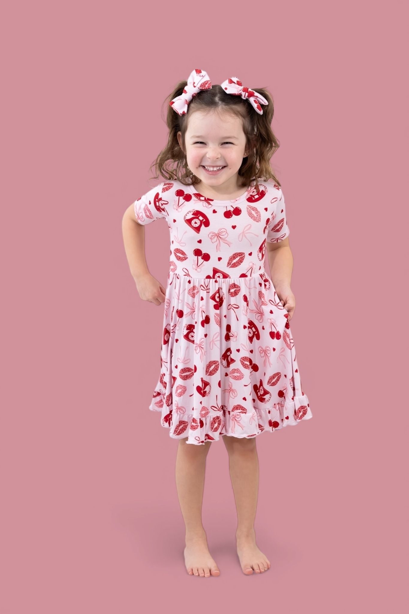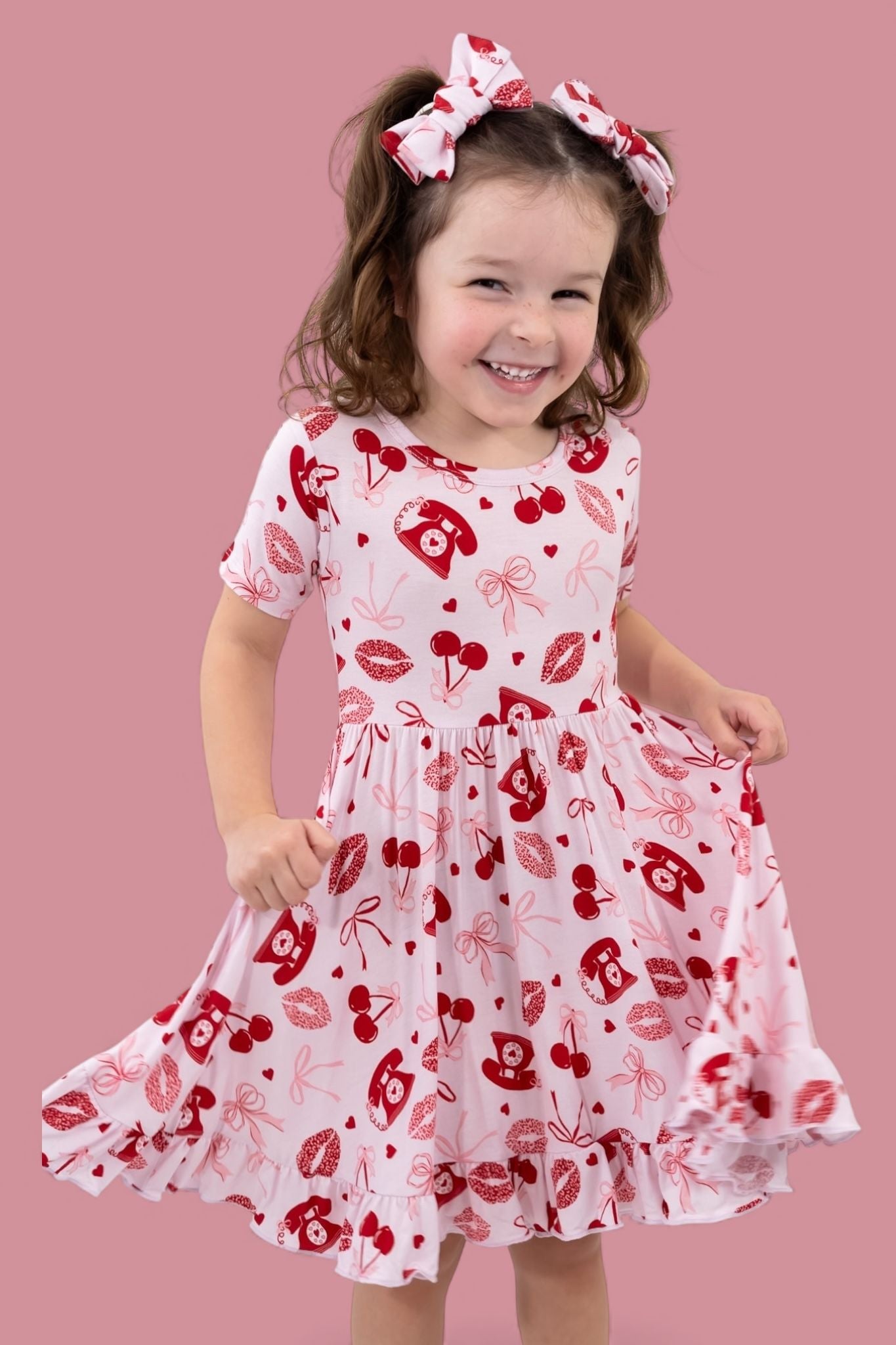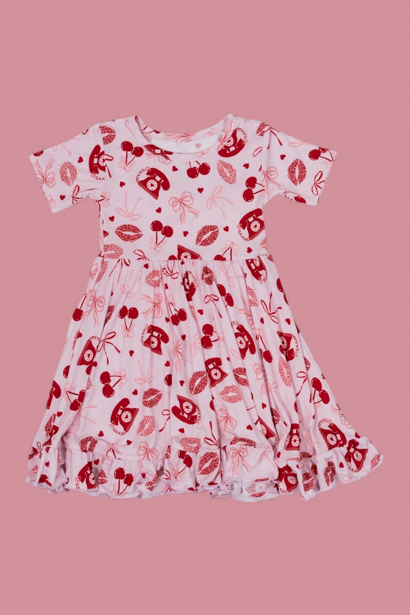 Signed, sealed, and ready to twirl! The Sealed With Love Dream Ruffle Dress is made from our signature buttery-soft bamboo and features a whimsical all-over print of retro telephones, kissy lips, cherries, and bows. Finished with delicate ruffle details and a flowy silhouette, it’s perfect for playdates, pictures, or drifting into sweet dreams.