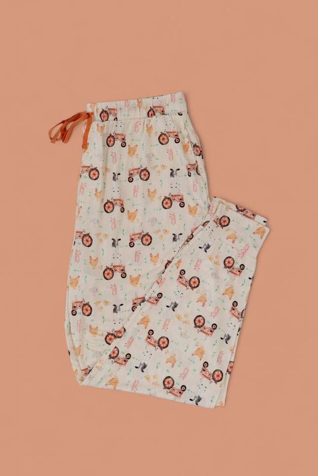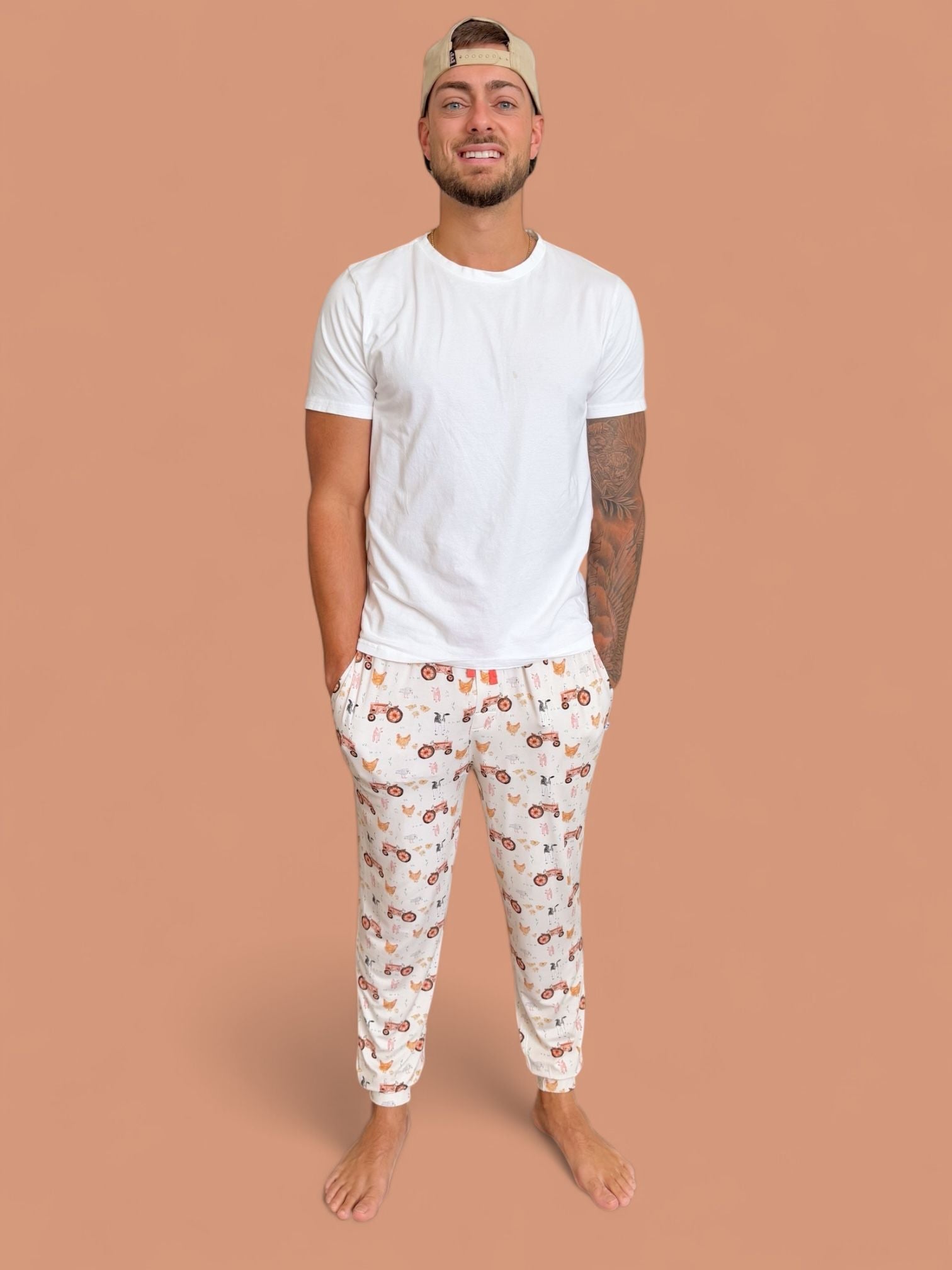 The Farmyard Friends Men’s Dream Jogger Pant brings ultimate softness and playful charm to your loungewear lineup. Featuring our signature breathable bamboo viscose and a whimsical countryside print with baby animals and tractors on a soft cream base—these joggers are made for everything from family snuggles to Sunday lounging.
