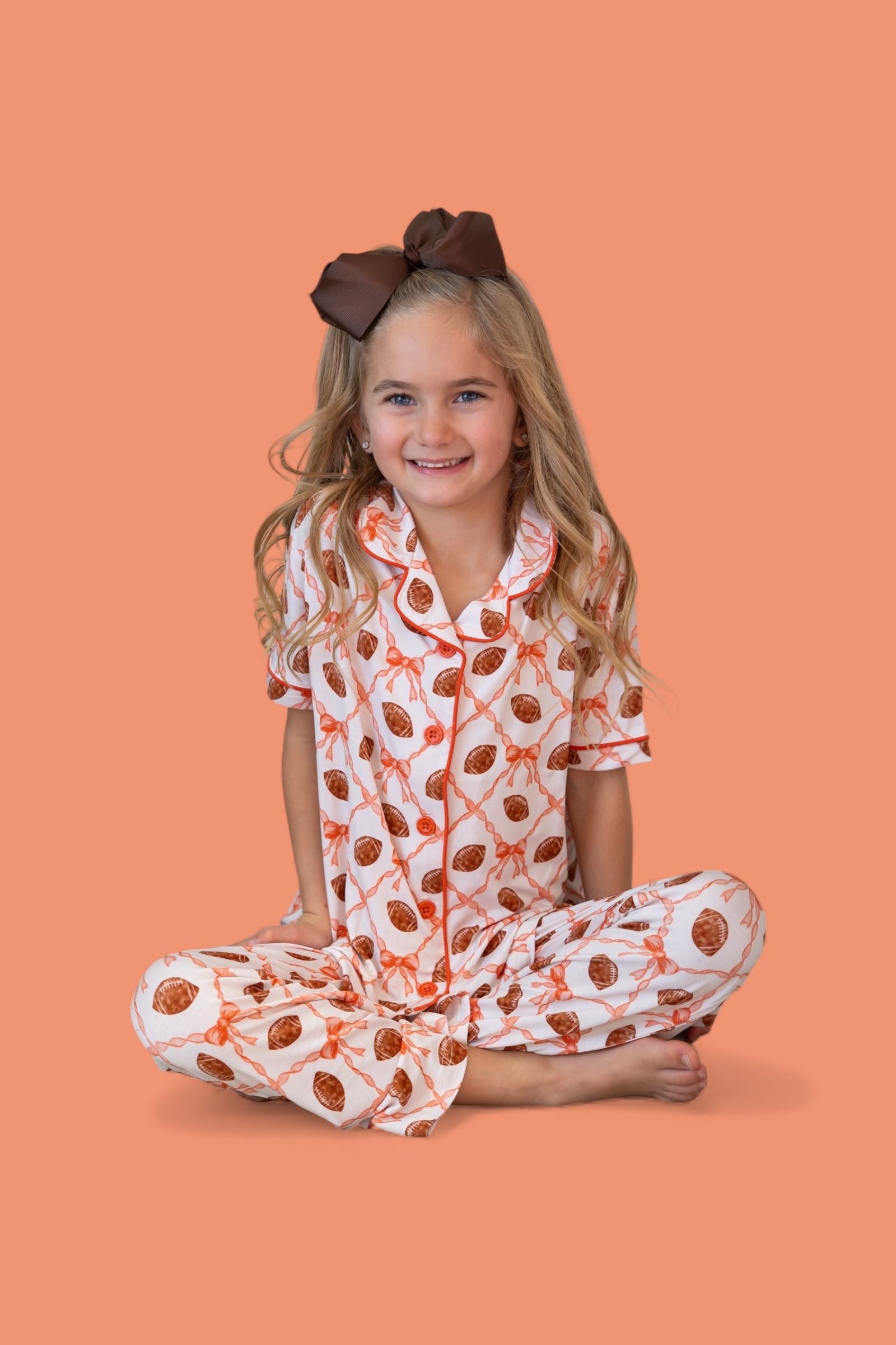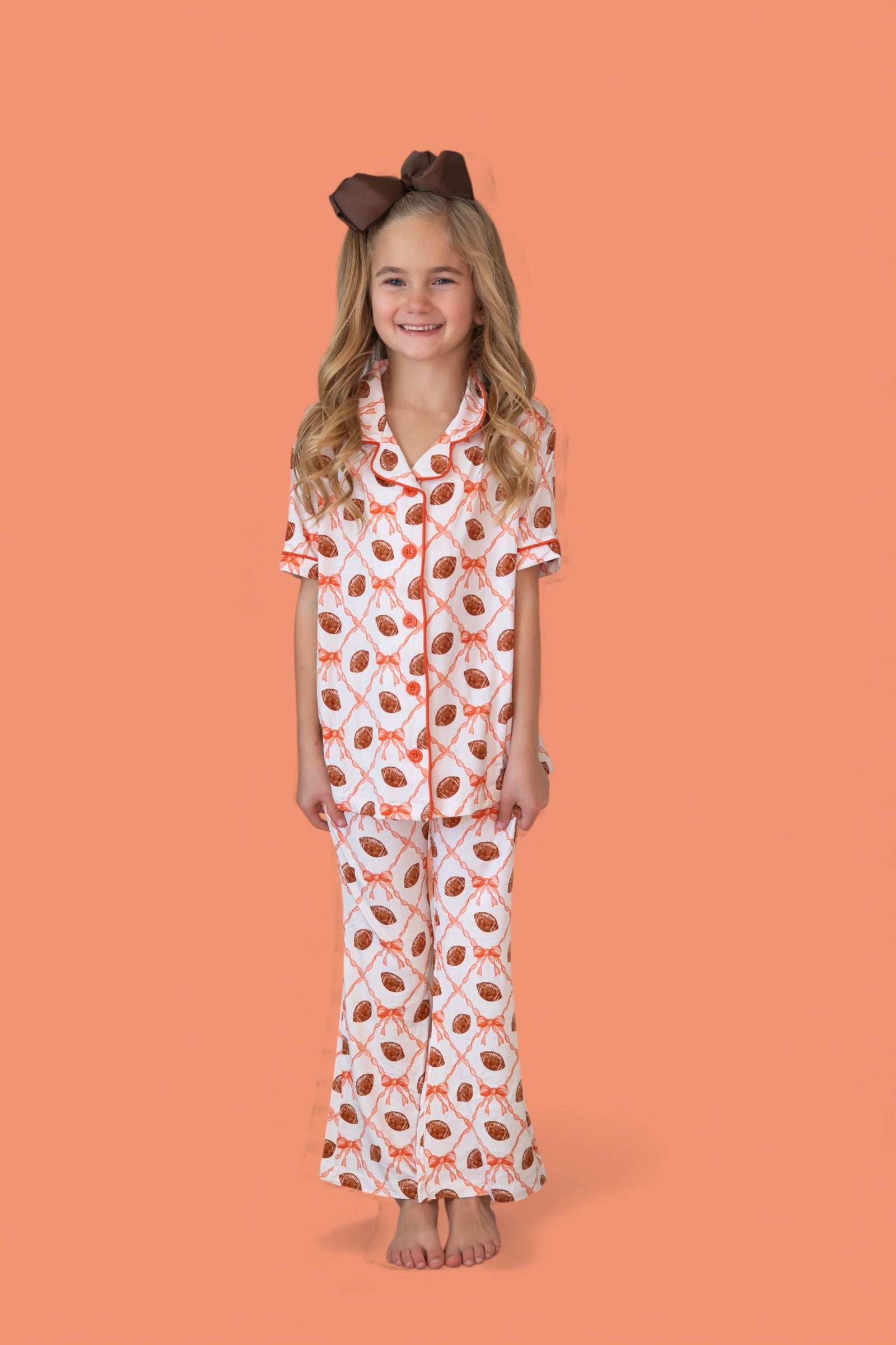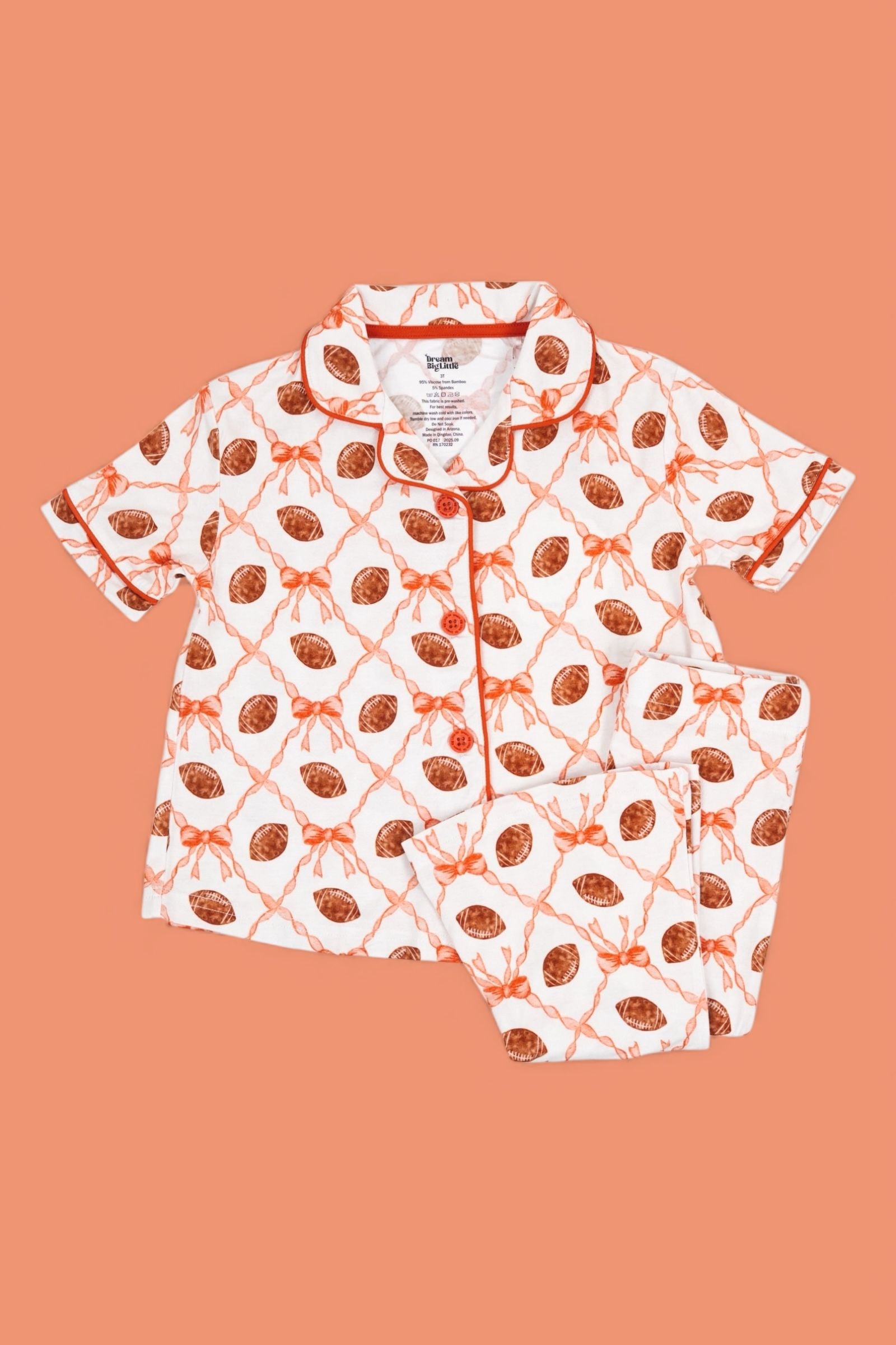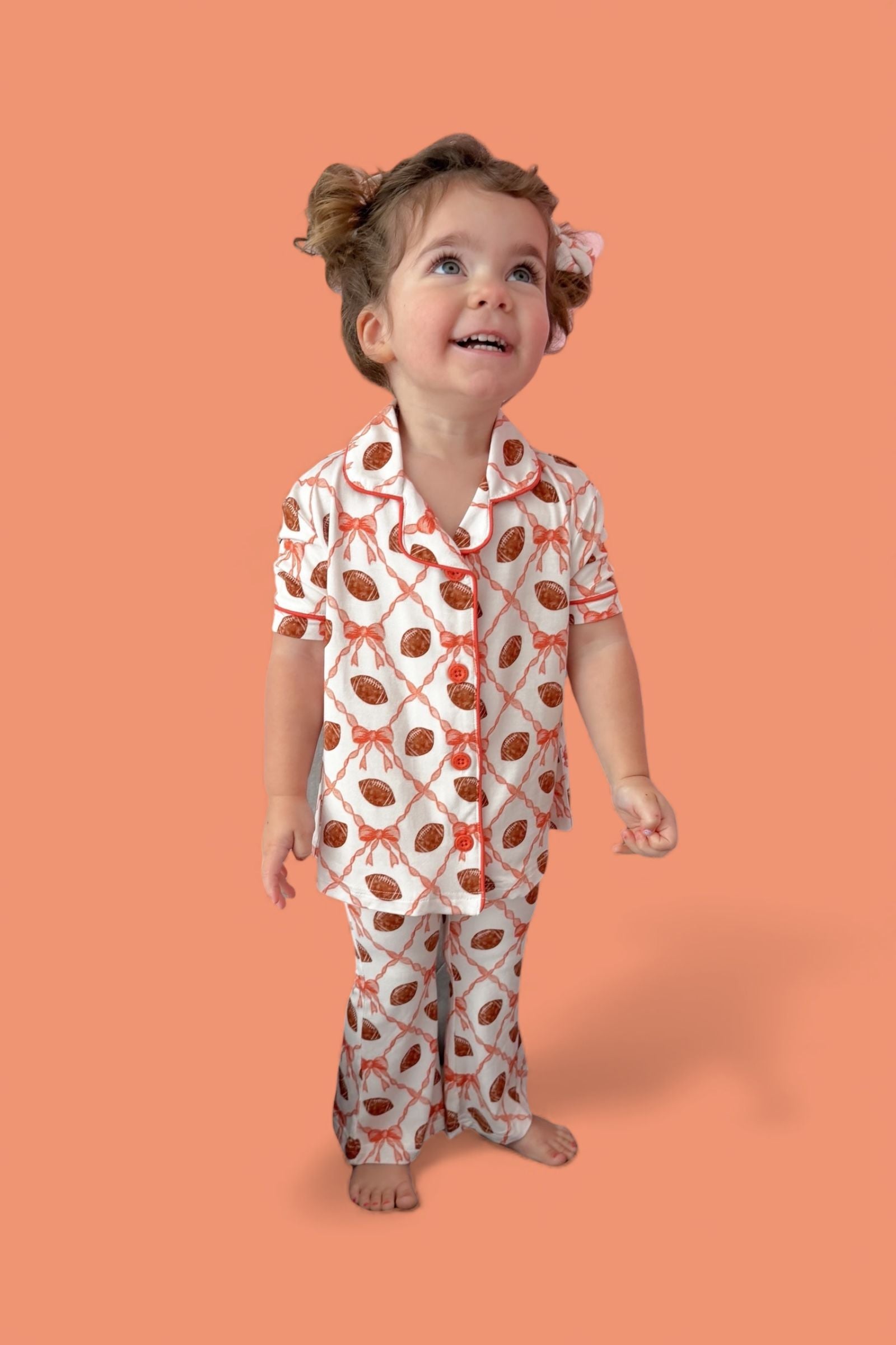 Game day, but make it glam! The Game Day Glam Dream Girl’s Flare Set features a playful mix of footballs + bows in a sporty-chic print, paired with flared pants made for twirling and cheering. Crafted in our buttery-soft bamboo fabric, this set keeps your little fan comfy while adding the cutest touch of sparkle to the sidelines.