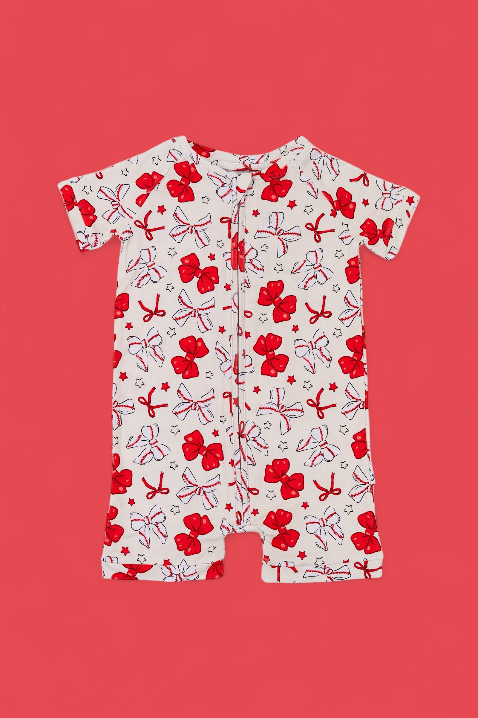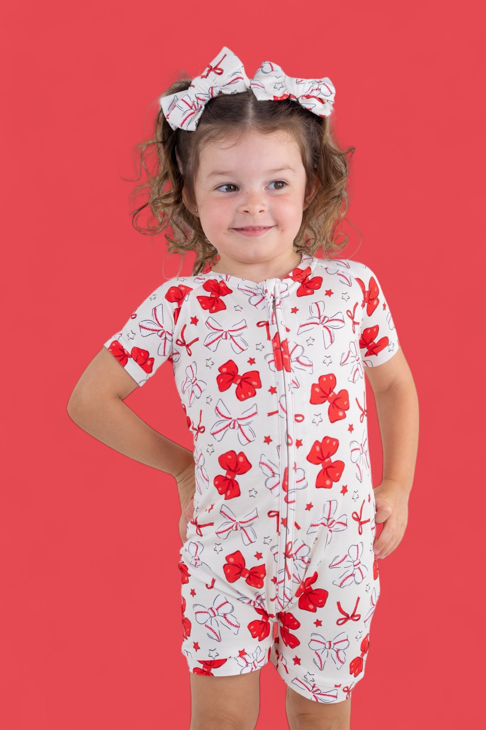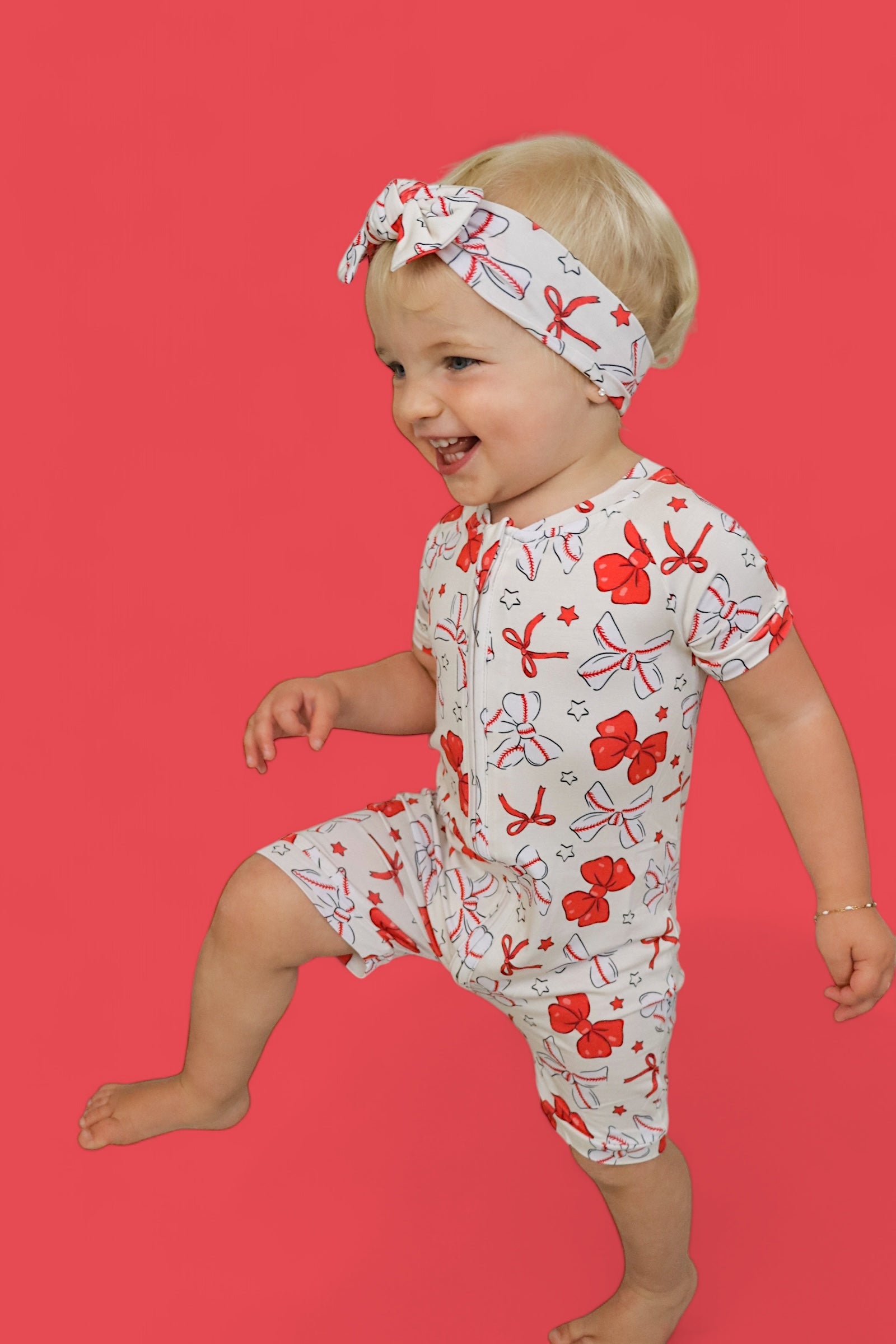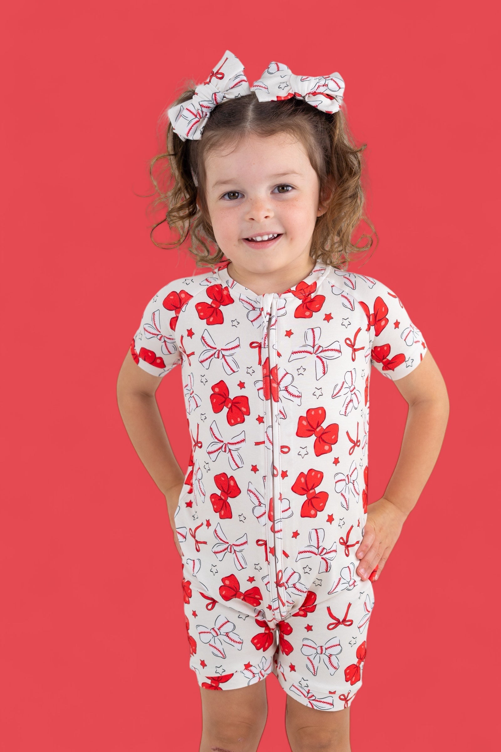 Step up to the plate with the Pitch Perfect Dream Shortie, where sporty charm meets all-star comfort! This short romper knocks it out of the park with its fun and energetic "Pitch Perfect Bows" print, featuring red-stitched bows that mimic the seams of a baseball. Whether your little MVP is sliding into playtime or rounding third towards naptime, this shortie is the perfect uniform for every inning of the day.