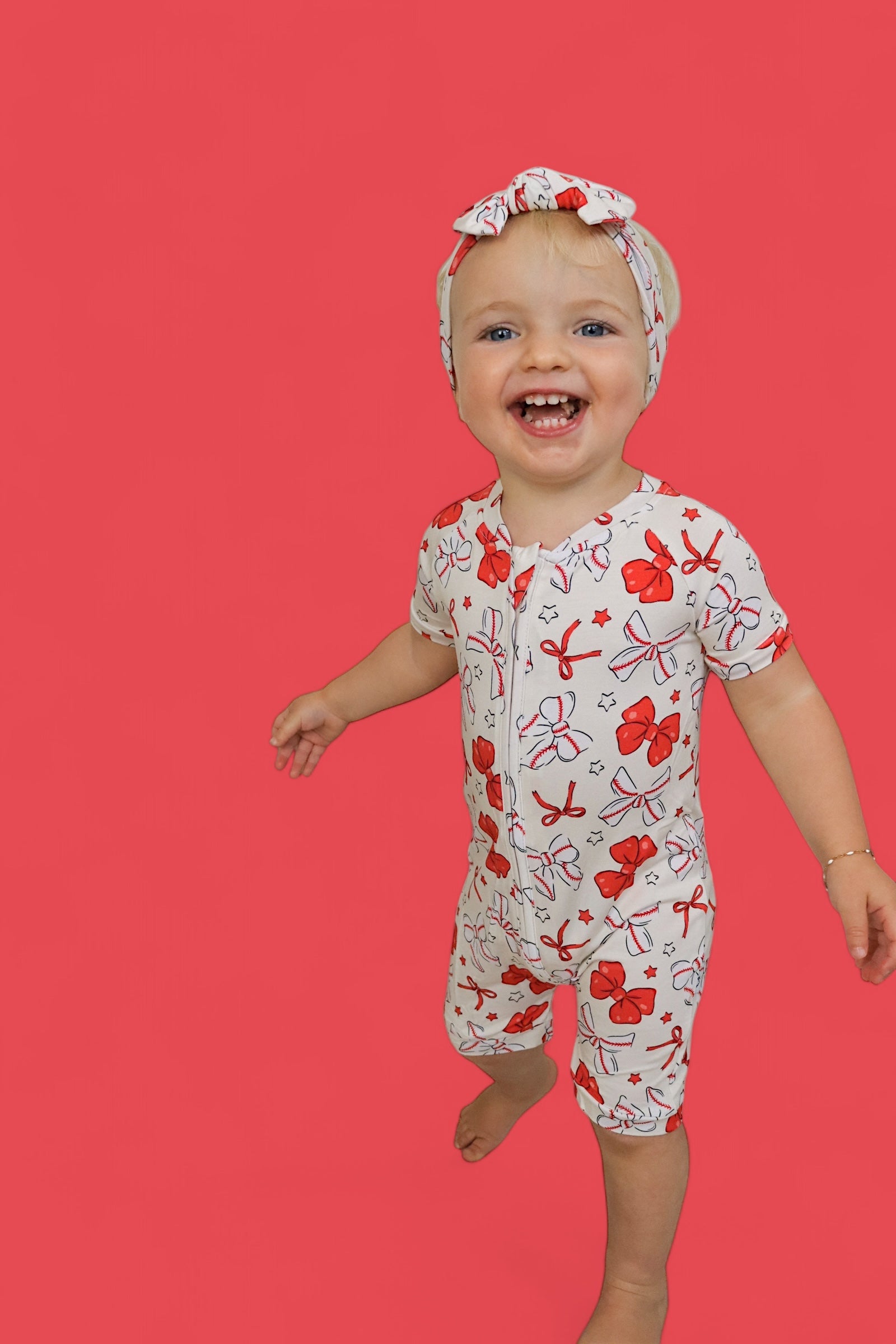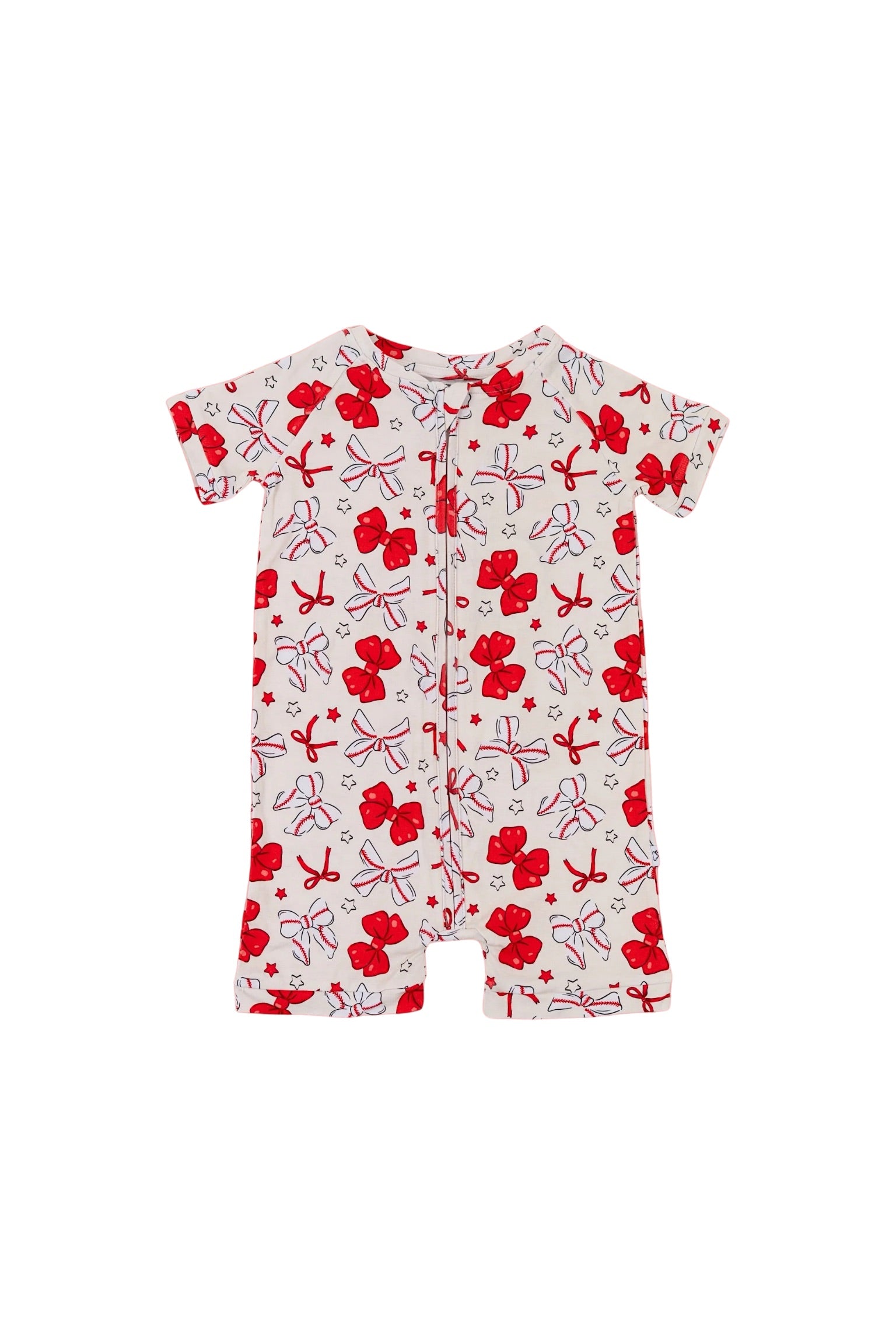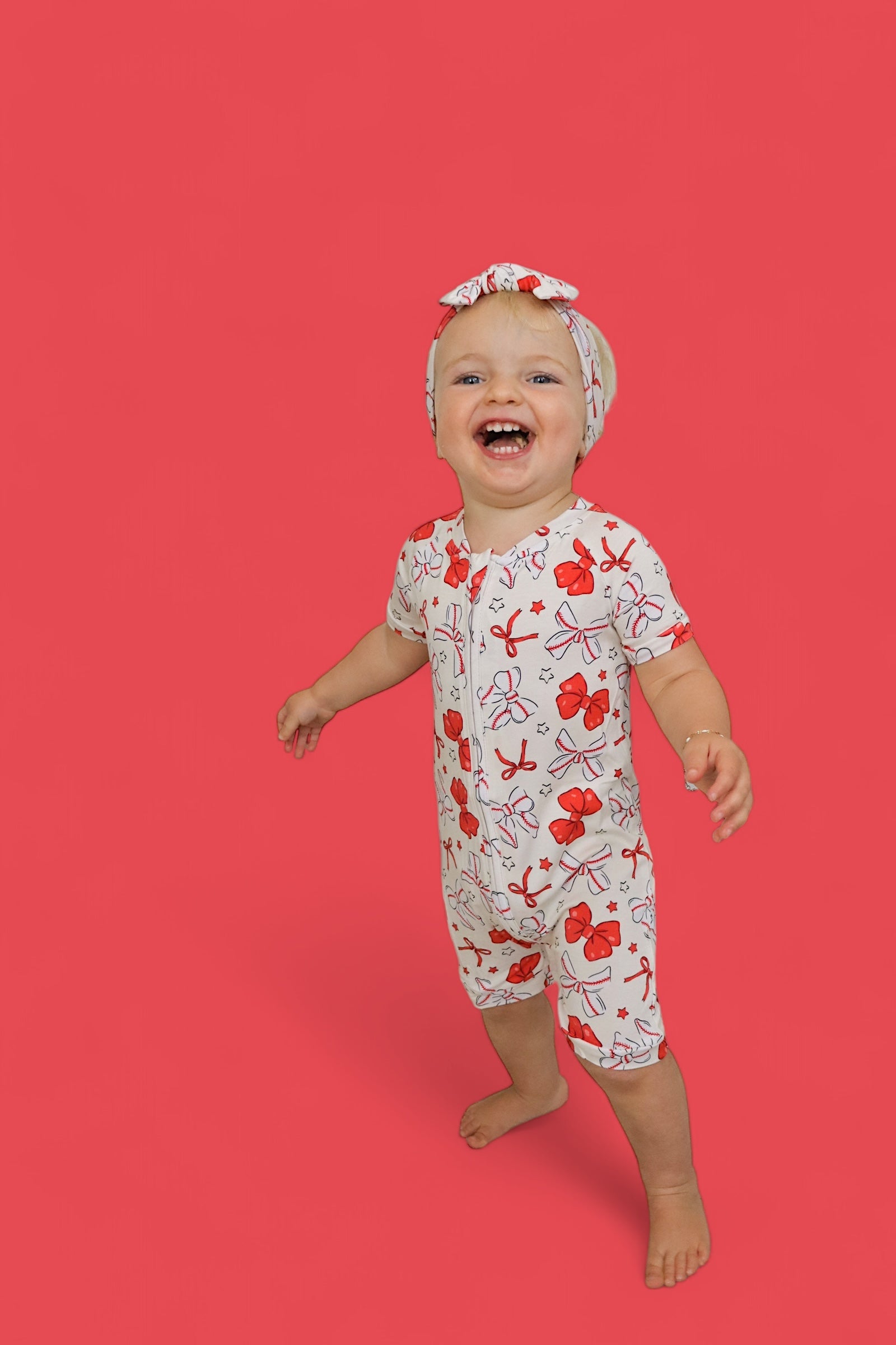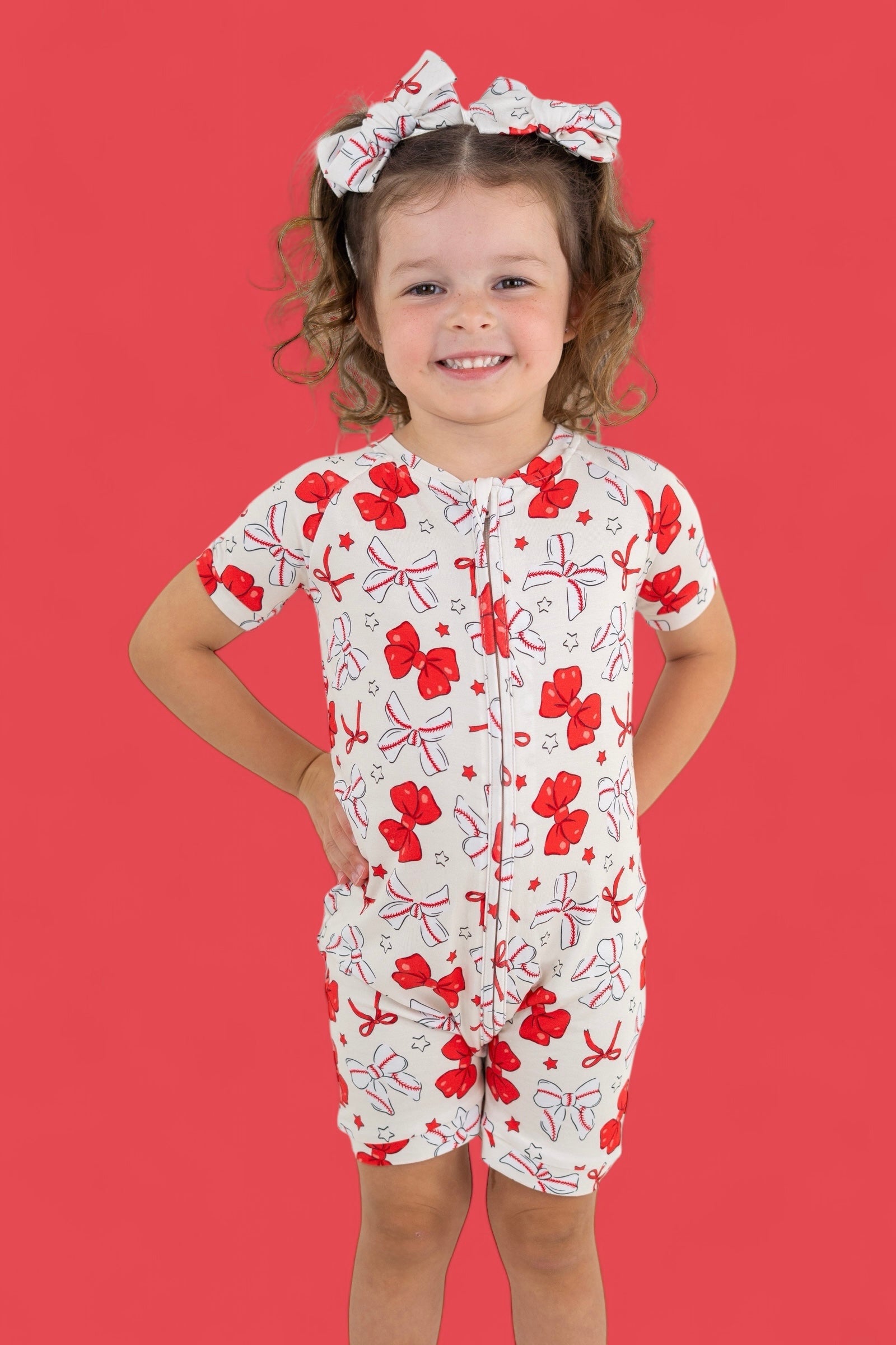 Step up to the plate with the Pitch Perfect Dream Shortie, where sporty charm meets all-star comfort! This short romper knocks it out of the park with its fun and energetic "Pitch Perfect Bows" print, featuring red-stitched bows that mimic the seams of a baseball. Whether your little MVP is sliding into playtime or rounding third towards naptime, this shortie is the perfect uniform for every inning of the day.