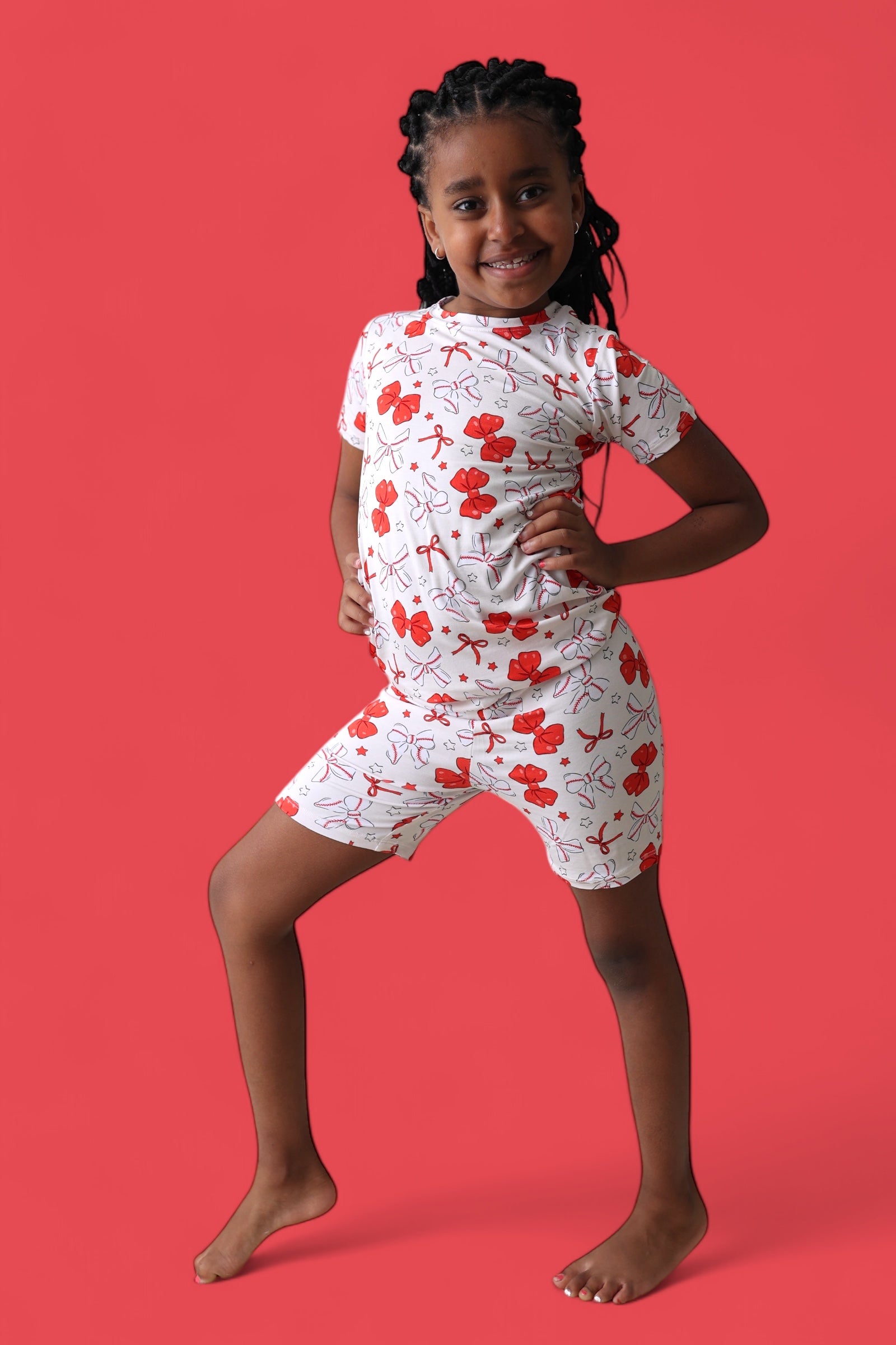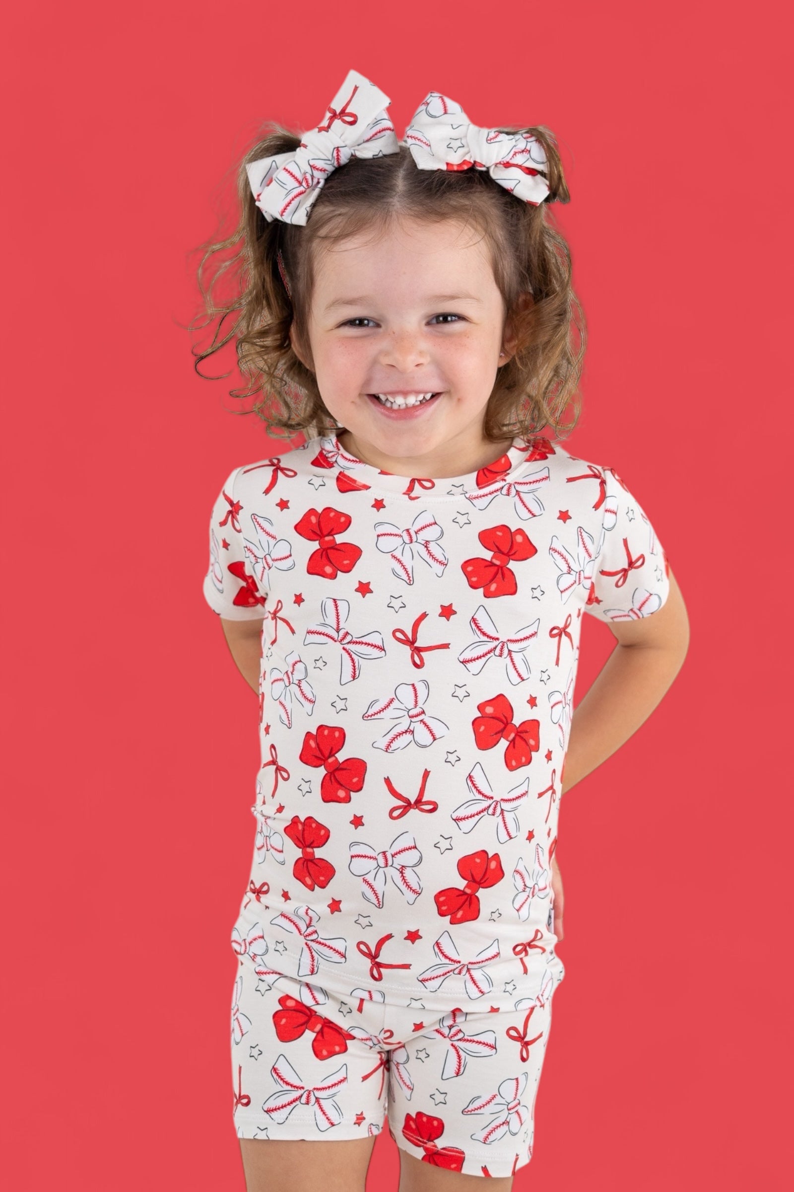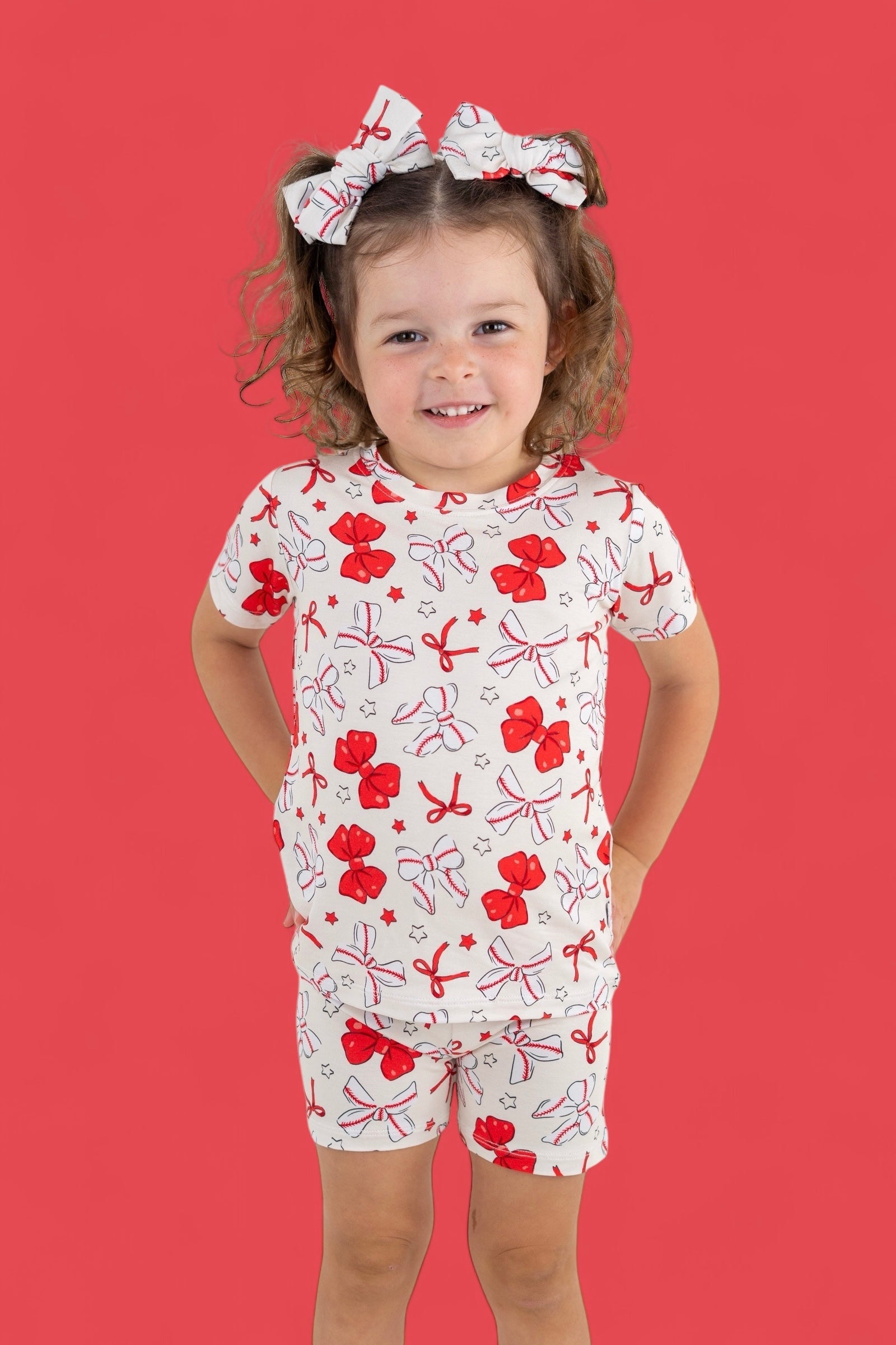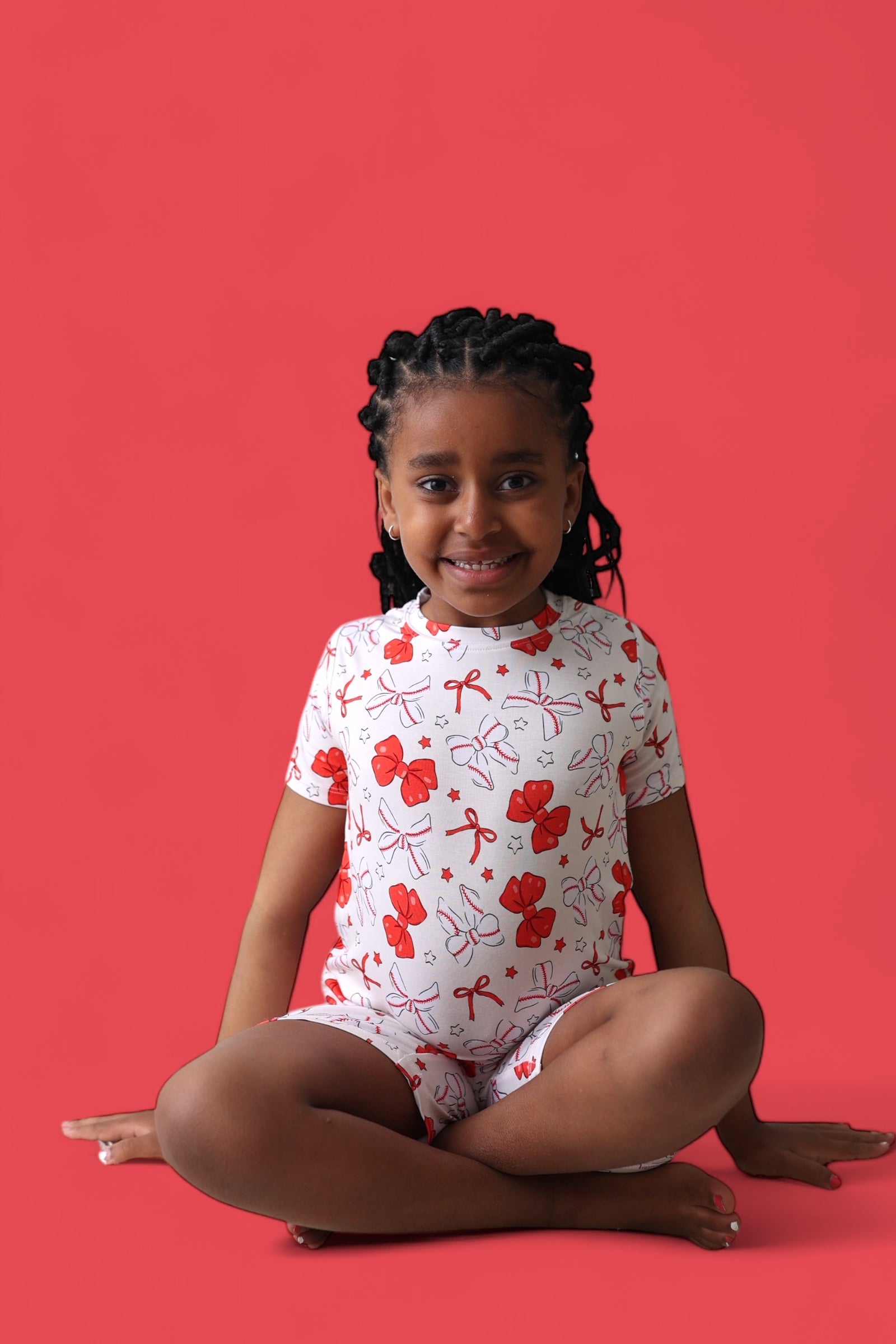 Hit a home run in comfort and cuteness with our Pitch Perfect Dream Short Set! Designed for little sluggers who love the game and a touch of flair, this pajama set knocks bedtime out of the park. The Pitch Perfect Bows print blends classic baseball vibes with playful elegance—featuring red-stitched bows that mirror the seams of a baseball, alongside ribbon-tied accents for a stylish twist.