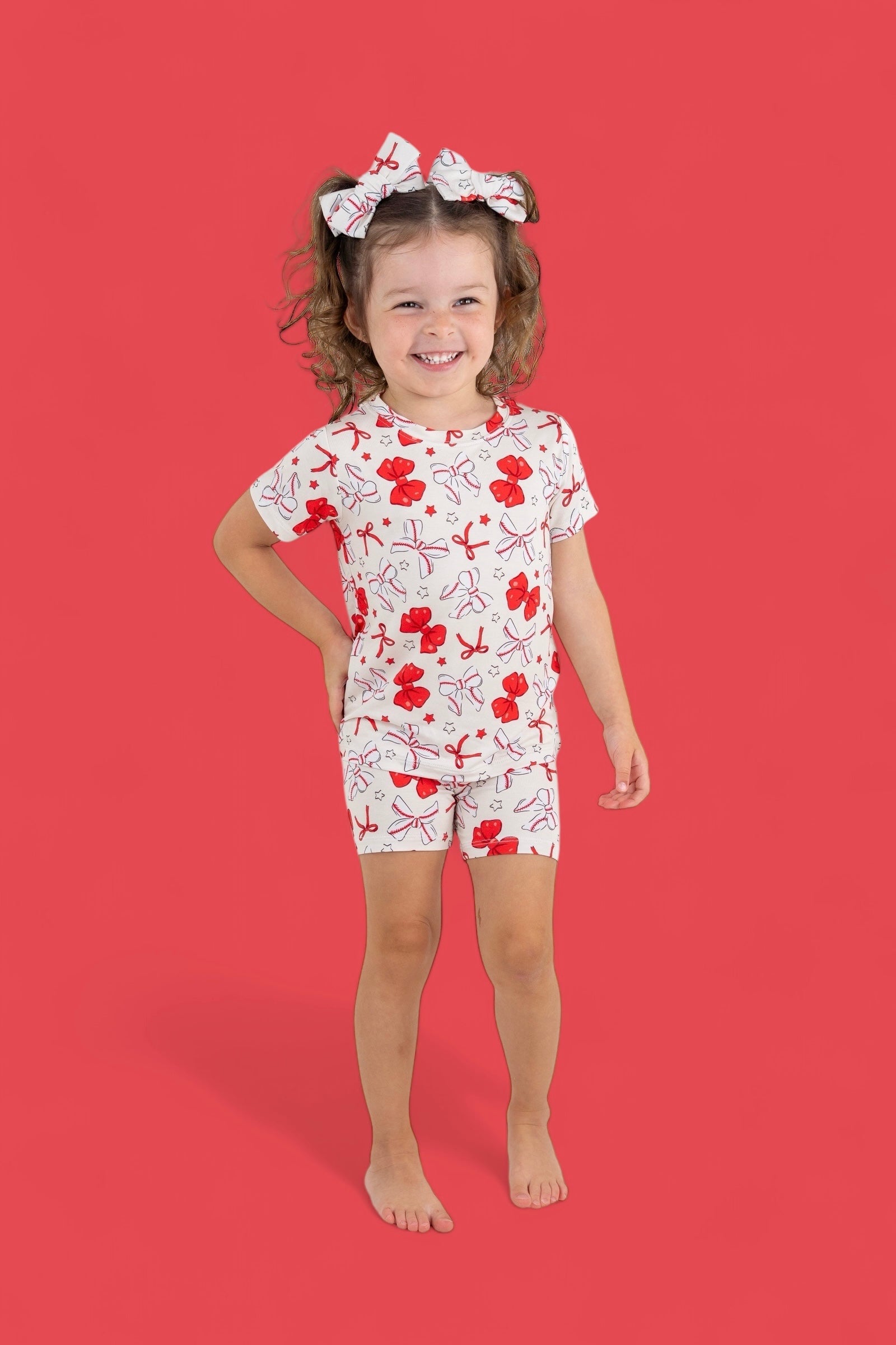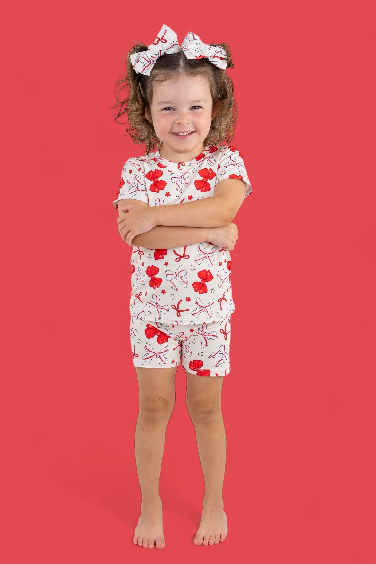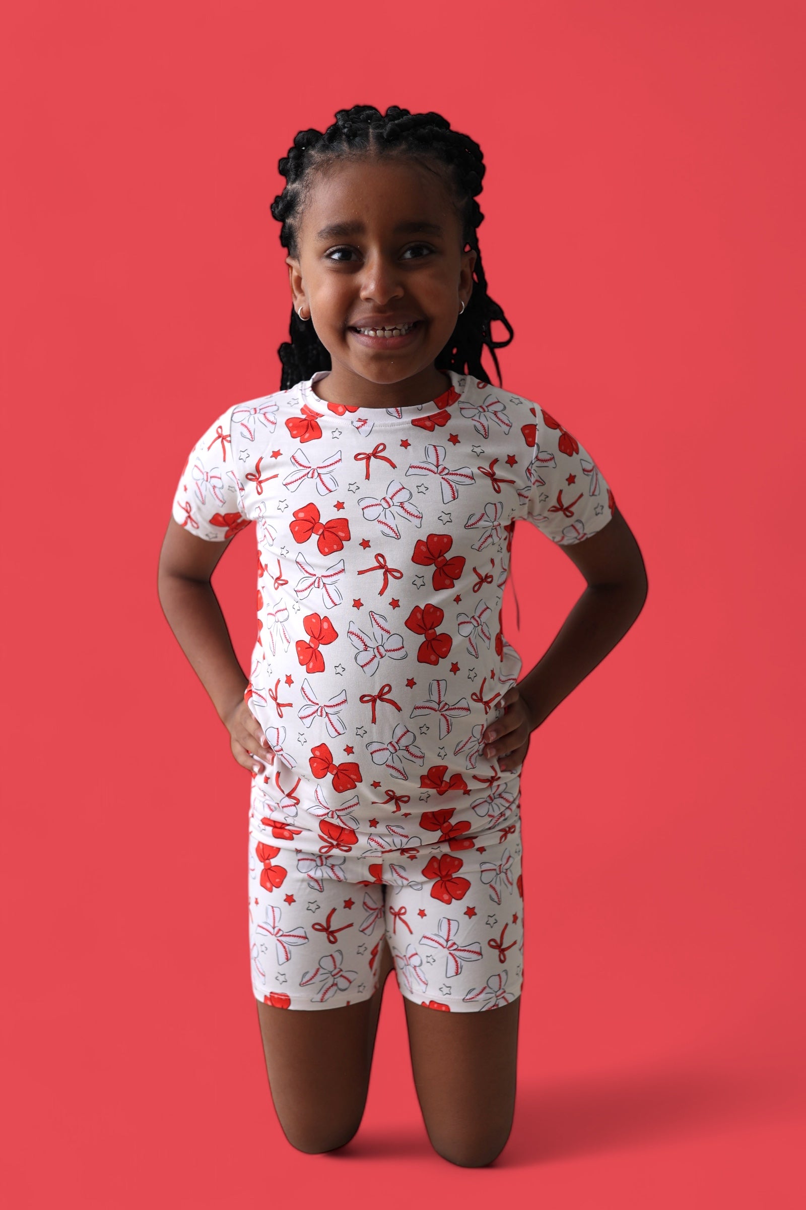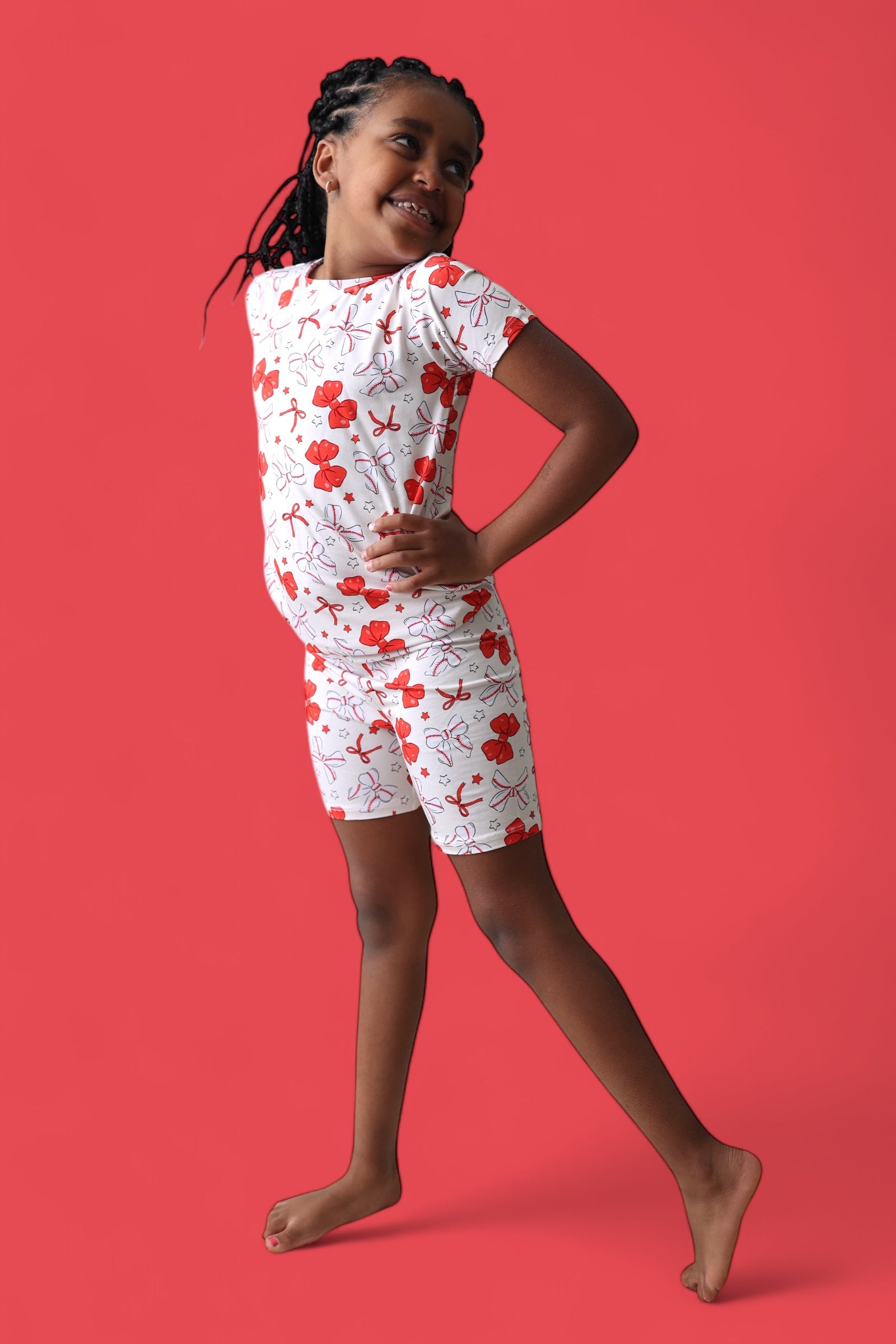 Hit a home run in comfort and cuteness with our Pitch Perfect Dream Short Set! Designed for little sluggers who love the game and a touch of flair, this pajama set knocks bedtime out of the park. The Pitch Perfect Bows print blends classic baseball vibes with playful elegance—featuring red-stitched bows that mirror the seams of a baseball, alongside ribbon-tied accents for a stylish twist.