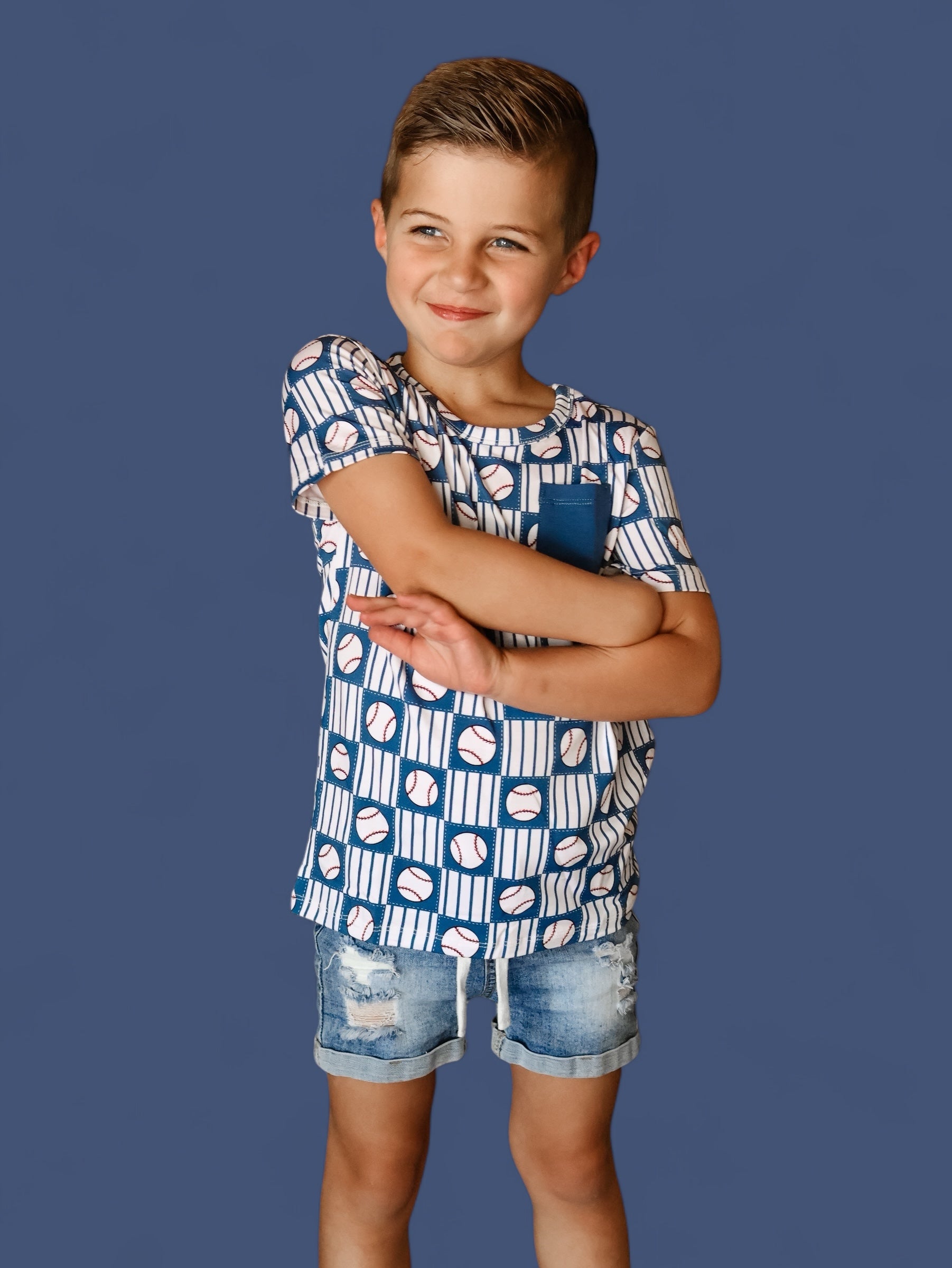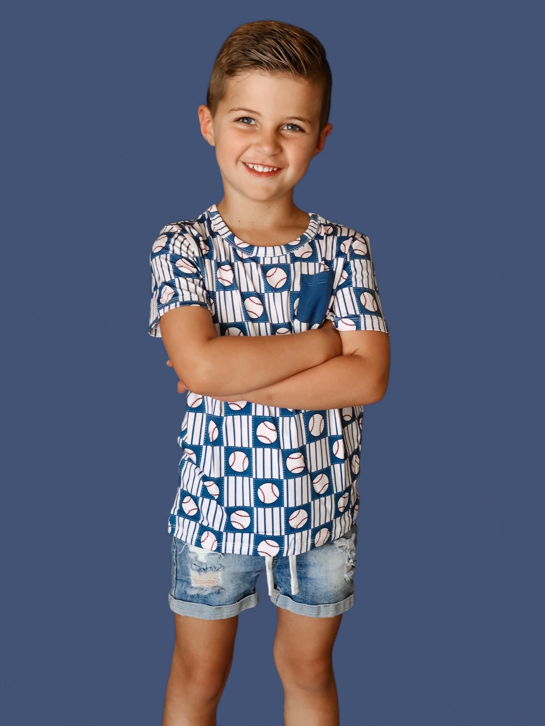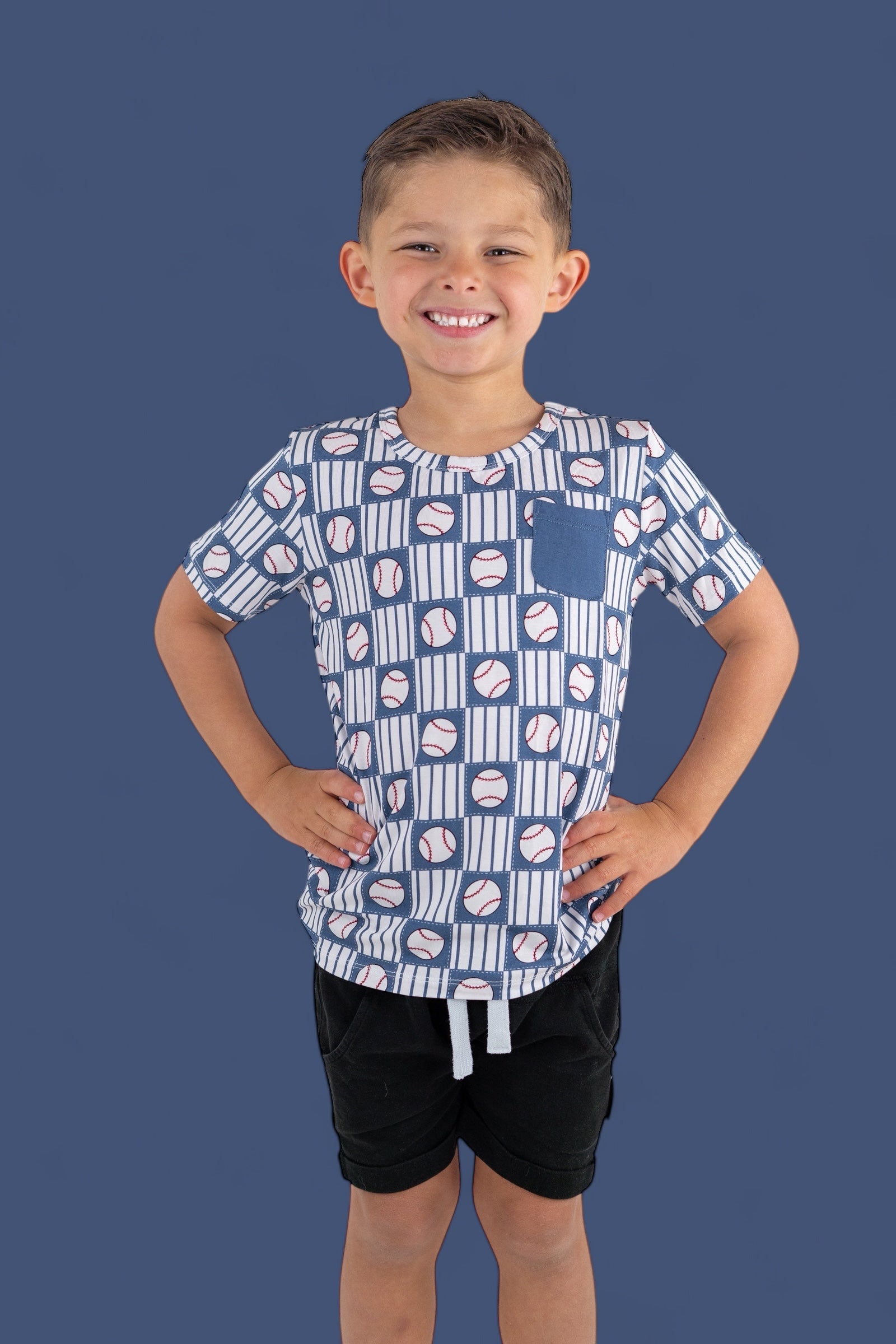 The Grand Slam Grid Dream Pocket Tee is a home run in both style and comfort! Designed for little MVPs who live for the game, this tee features a crisp, structured grid of baseballs with a touch of classic pinstripes—bringing ballpark vibes straight to their wardrobe. The timeless navy and cream colorway ensures it pairs effortlessly with any lineup.