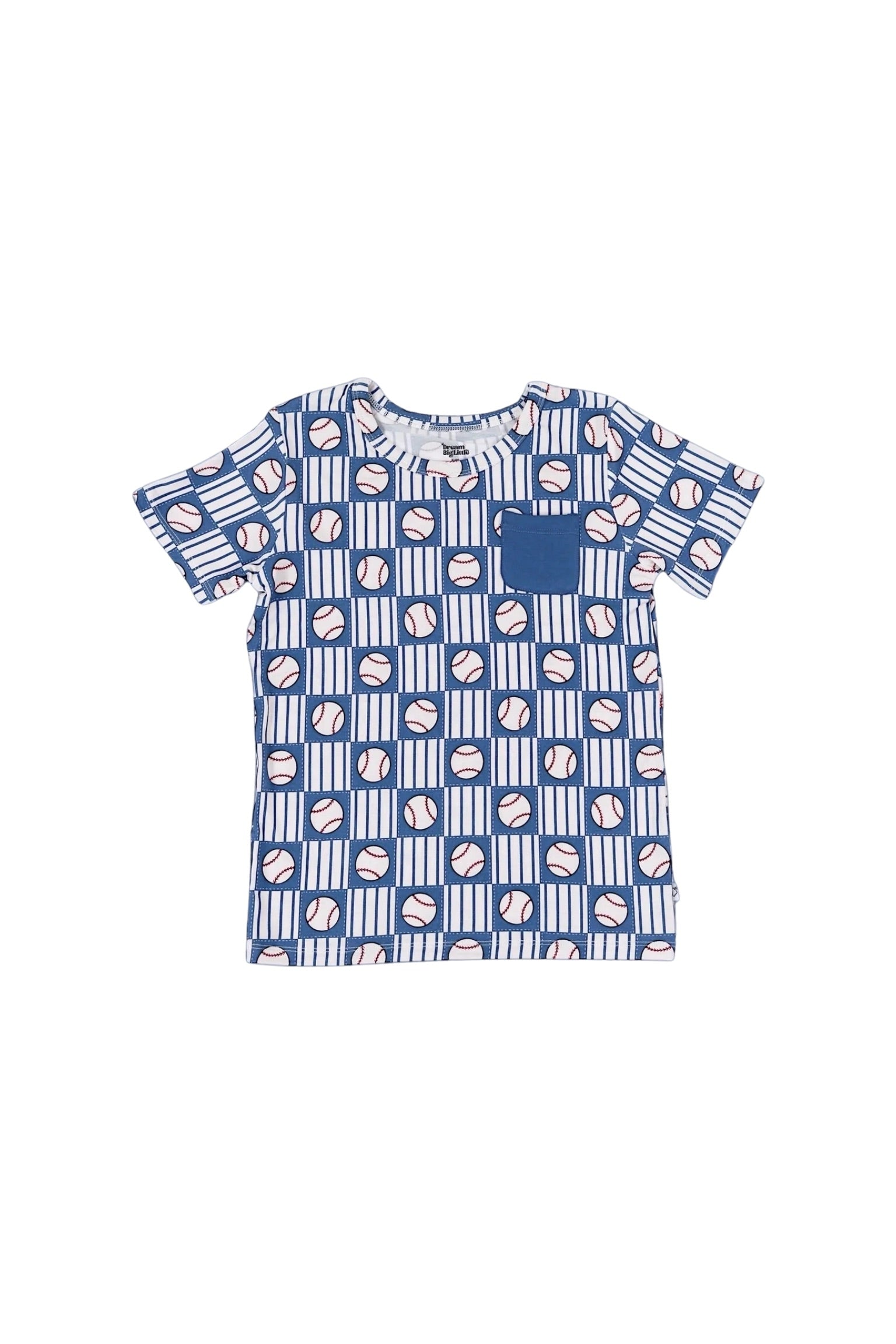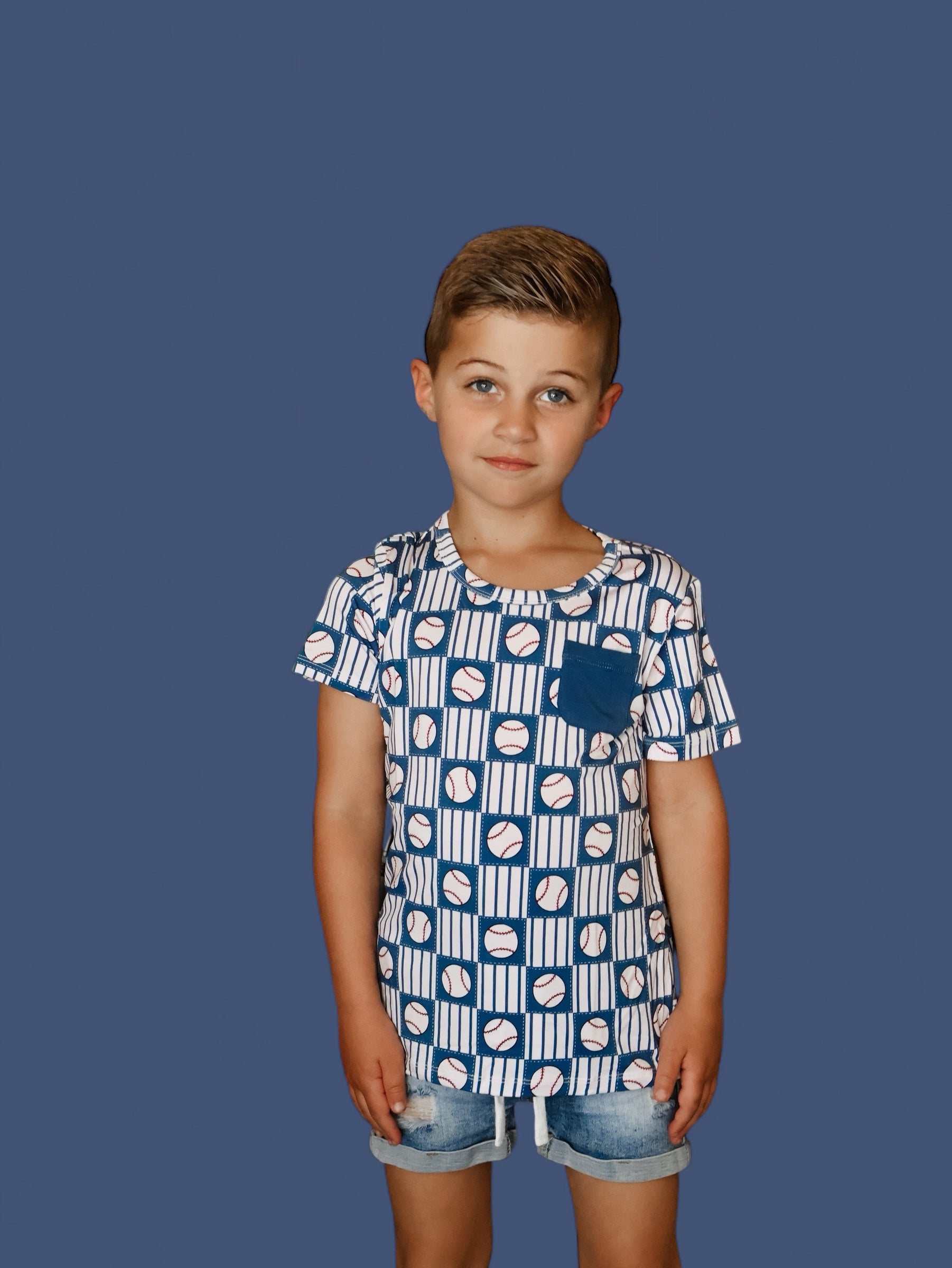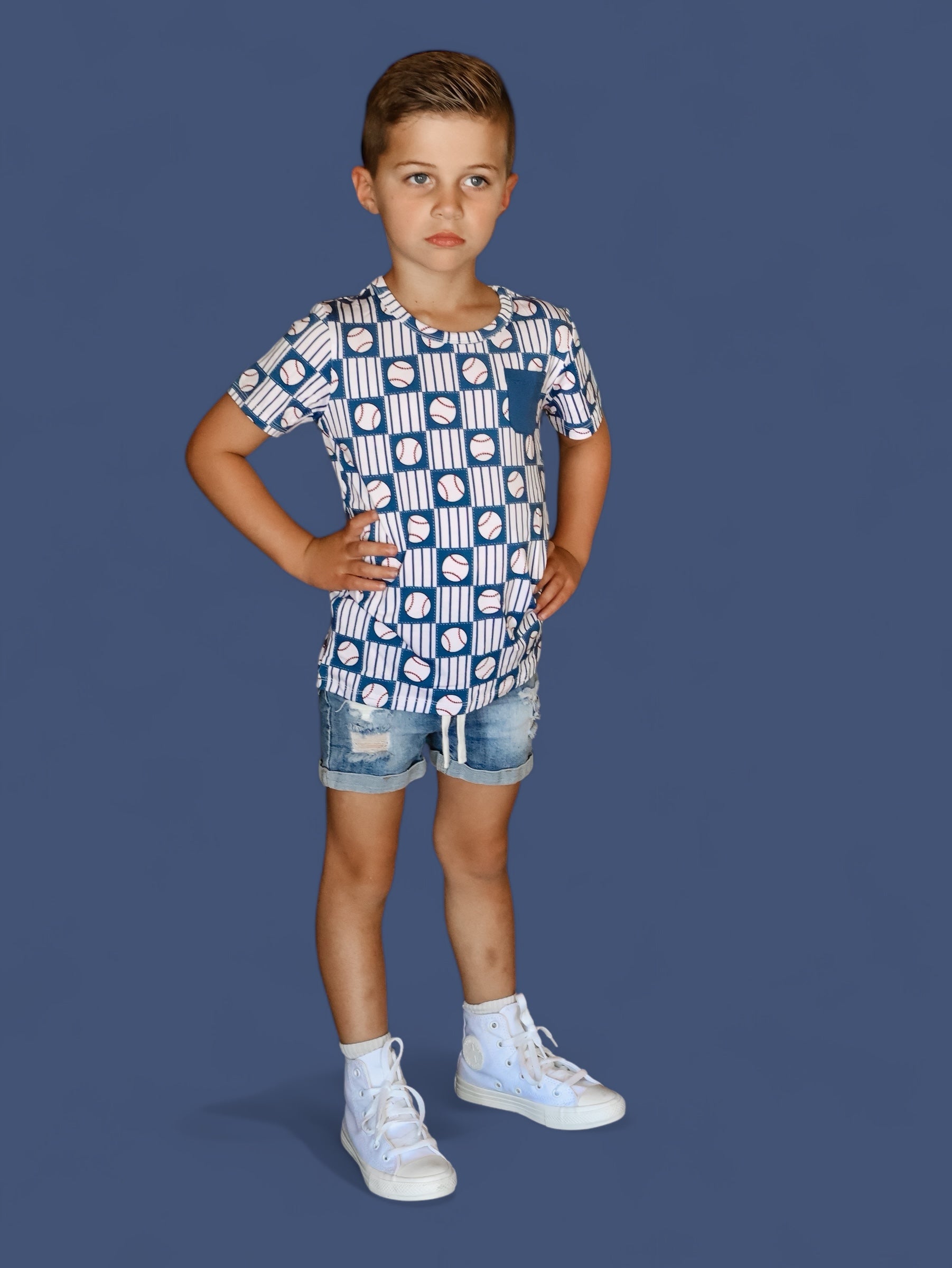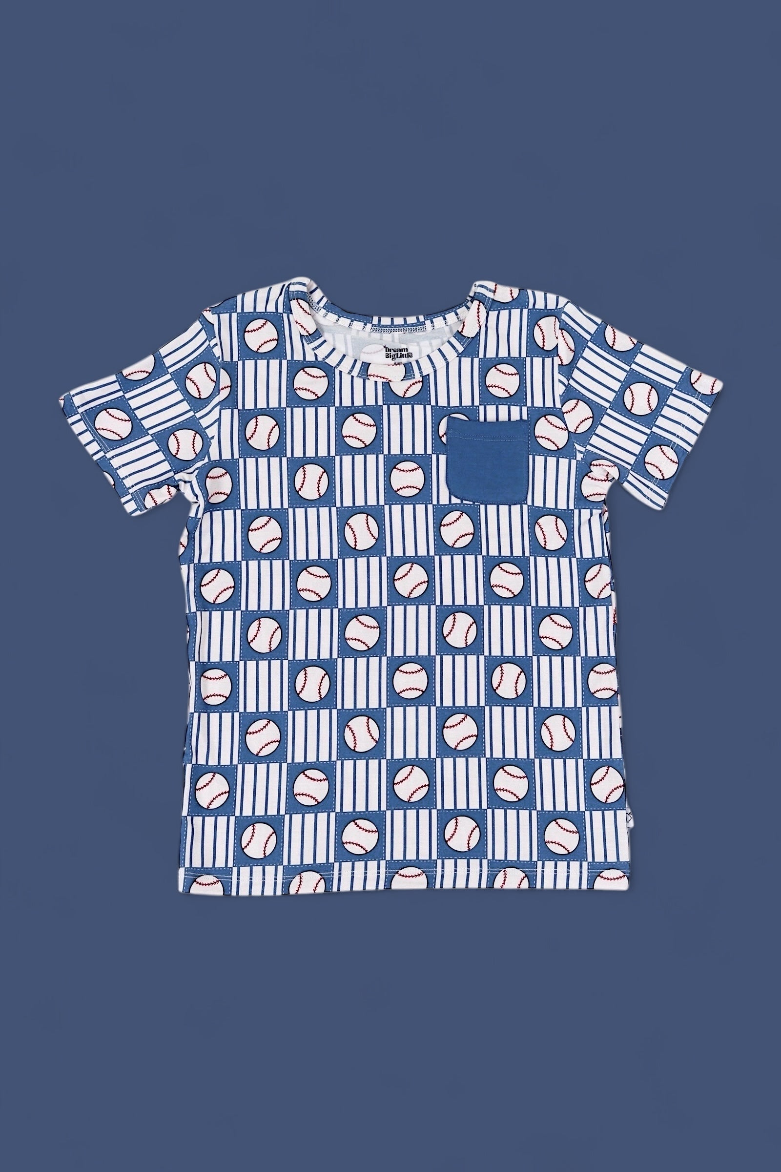 The Grand Slam Grid Dream Pocket Tee is a home run in both style and comfort! Designed for little MVPs who live for the game, this tee features a crisp, structured grid of baseballs with a touch of classic pinstripes—bringing ballpark vibes straight to their wardrobe. The timeless navy and cream colorway ensures it pairs effortlessly with any lineup.