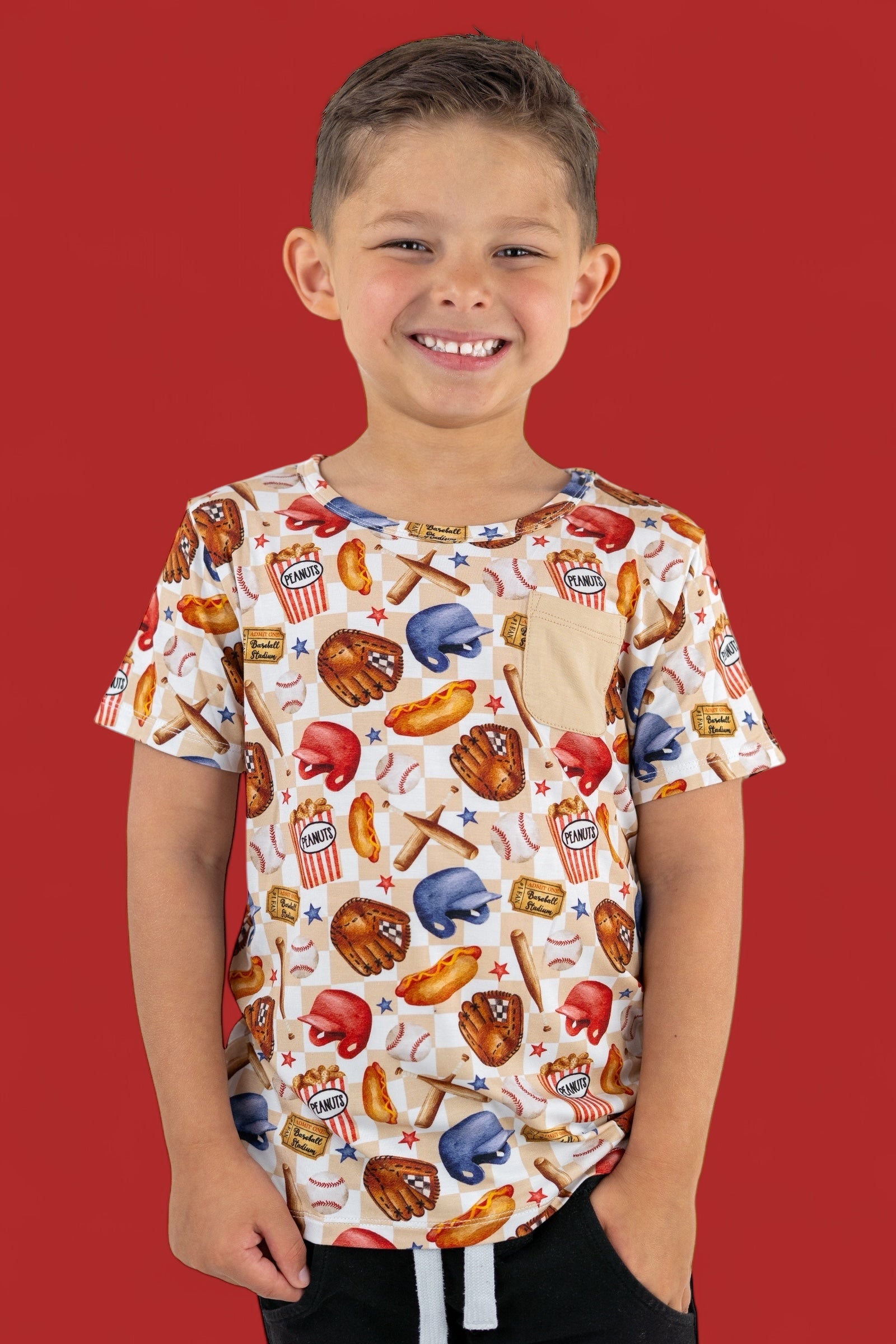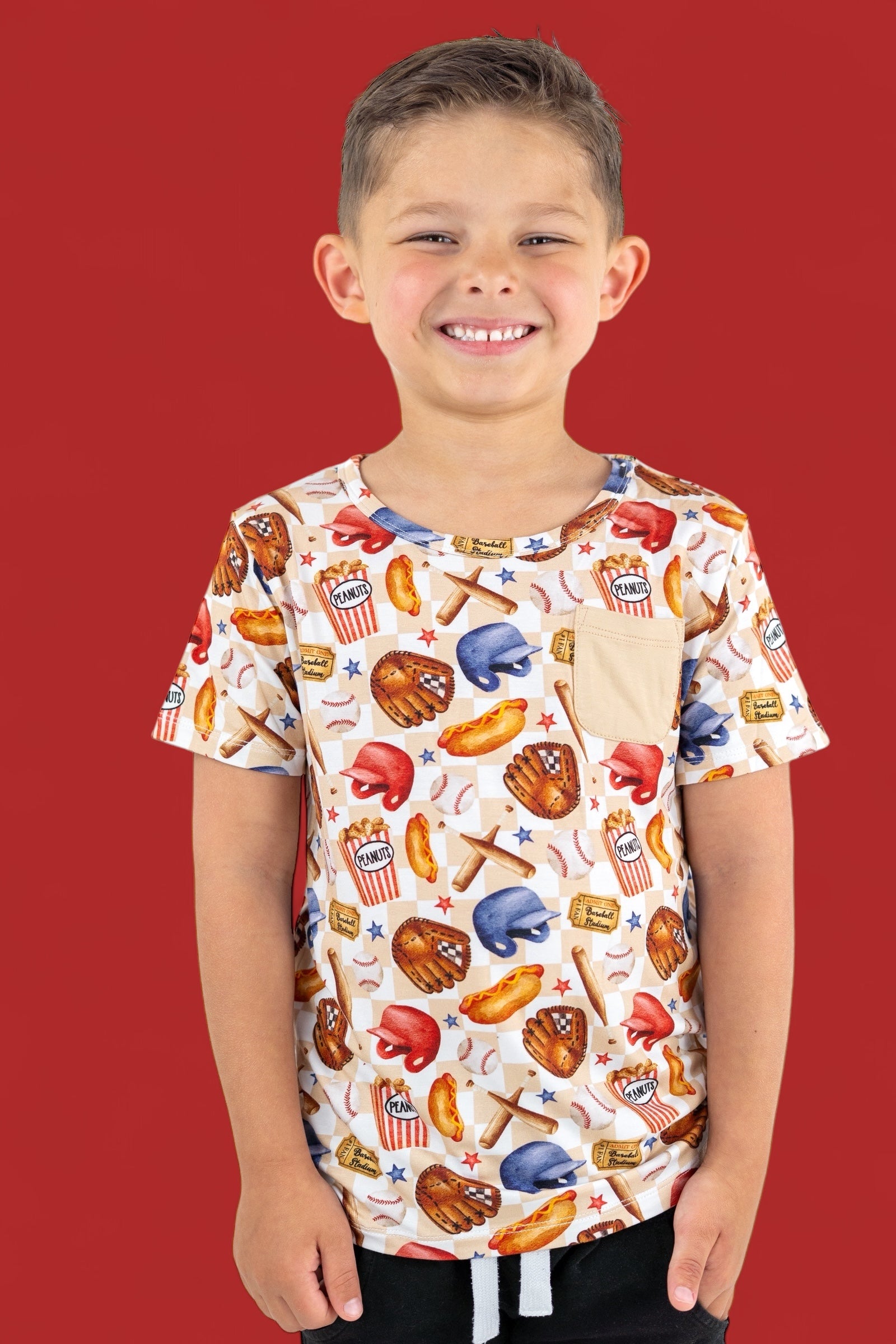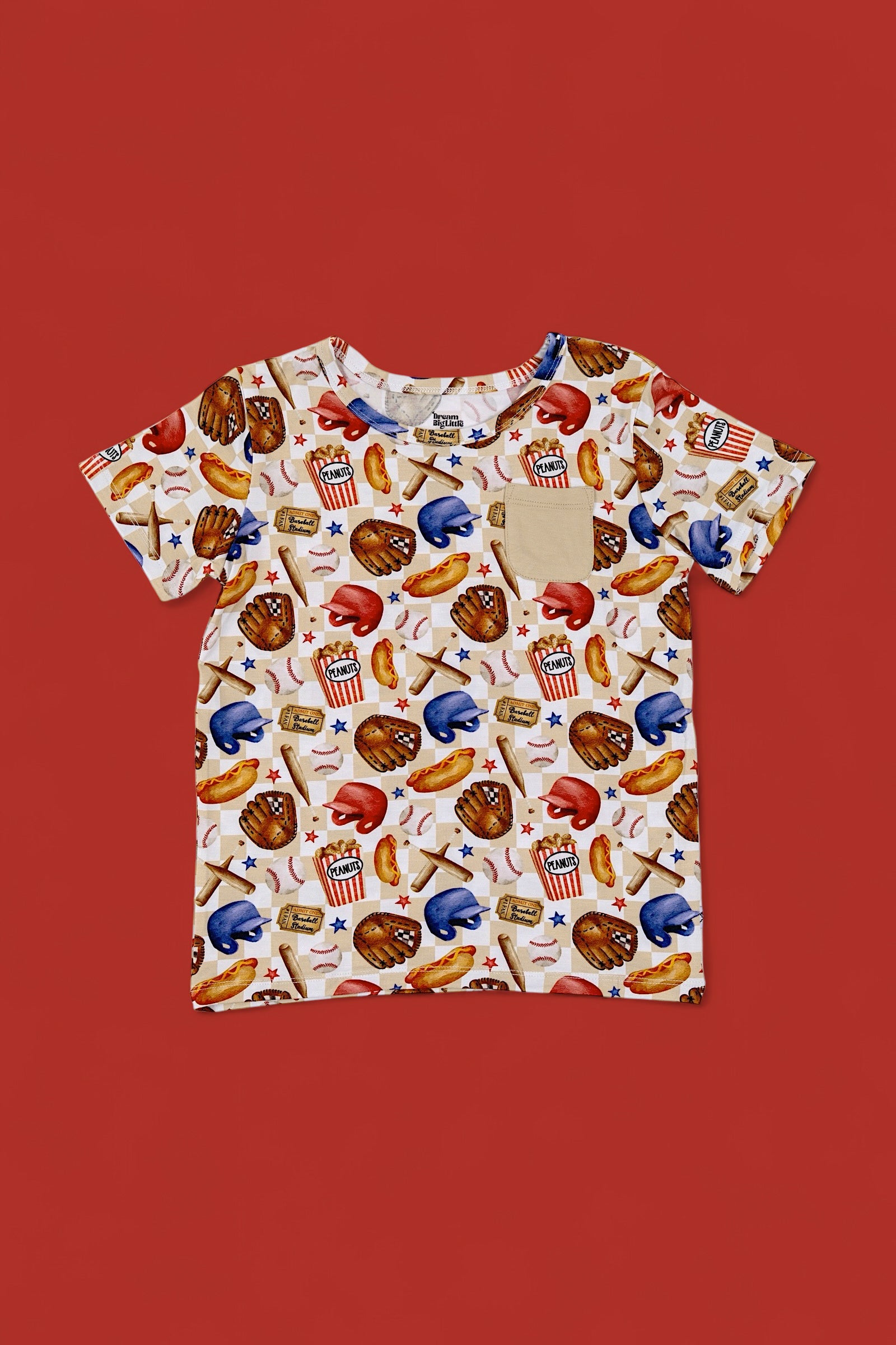 Step up to the plate in our Take Me Out to the Ball Game Dream Pocket Tee, a nostalgic nod to America’s favorite pastime! Designed for little sluggers and future MVPs, this tee knocks it out of the park with a fun, vintage-inspired baseball print. Featuring classic ballpark elements—bats, gloves, helmets, and baseballs—alongside stadium snacks like popcorn, peanuts, and hot dogs, this design is a grand slam for baseball lovers of all ages. A checkered background and scattered stars bring the spirit of game day to life!