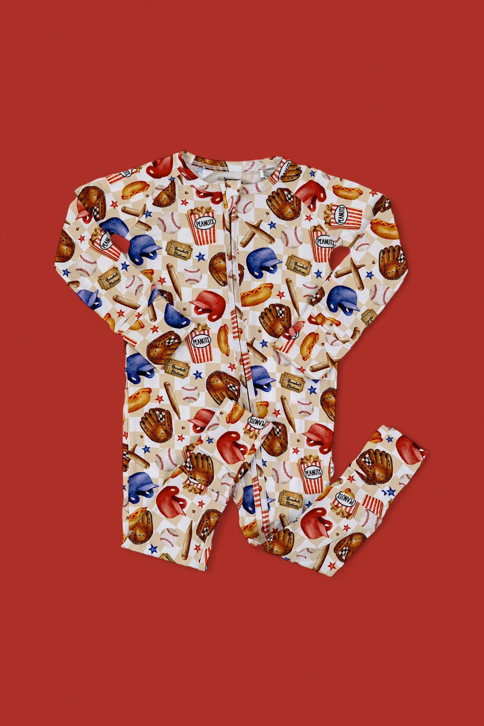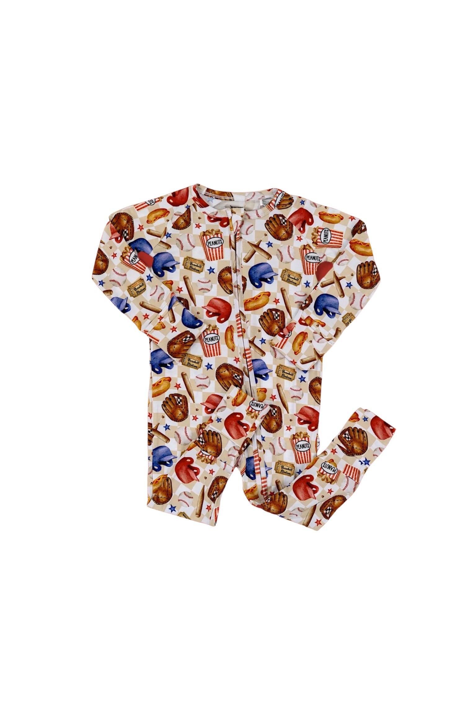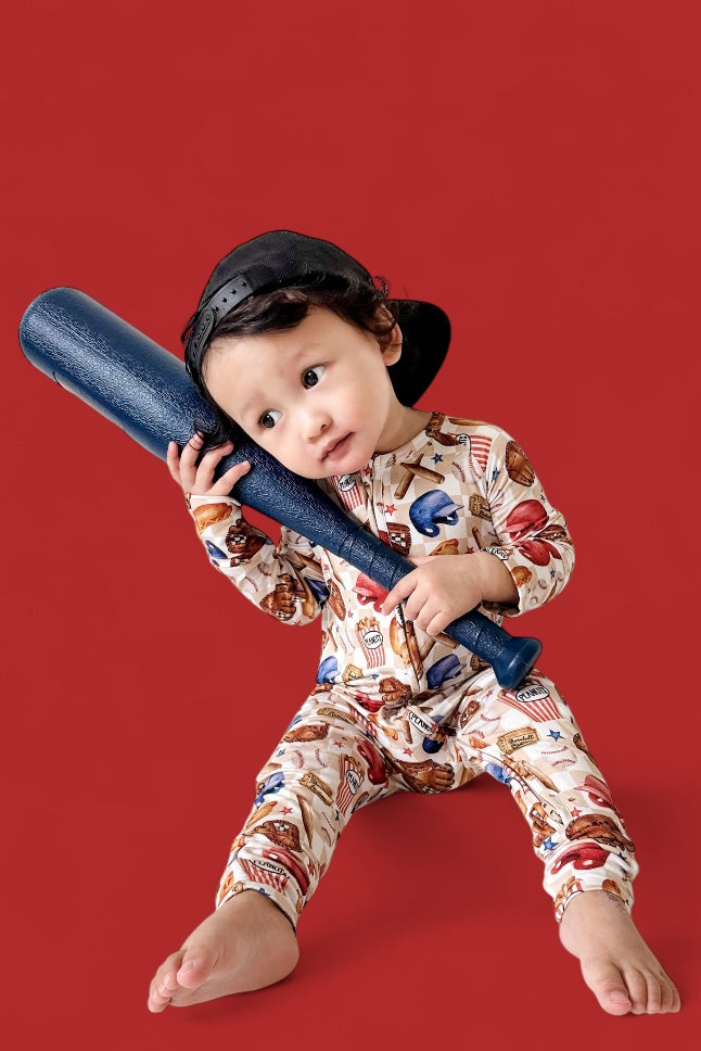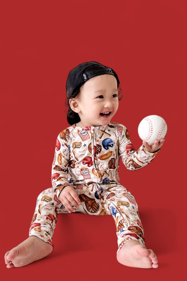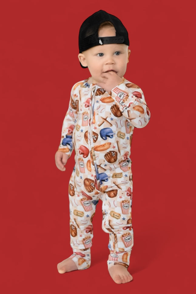 Step up to the plate with the Take Me Out to the Ball Game Dream Romper, a nostalgic grand slam celebrating the magic of baseball! Featuring a playful, vintage-inspired design, this romper is a tribute to America’s favorite pastime. From classic ballpark essentials like bats, gloves, and baseballs to stadium-favorite snacks like peanuts, popcorn, and hot dogs, this print is sure to hit it out of the park. The checkered background and scattered stars add an extra touch of game-day excitement, making this romper a true MVP for little fans.