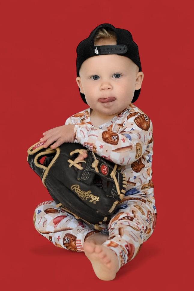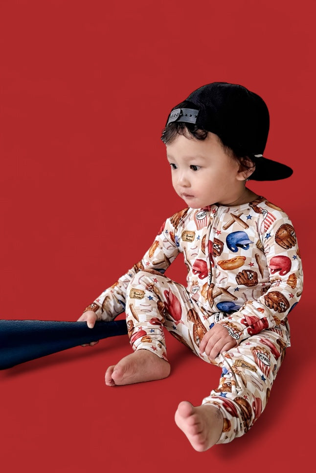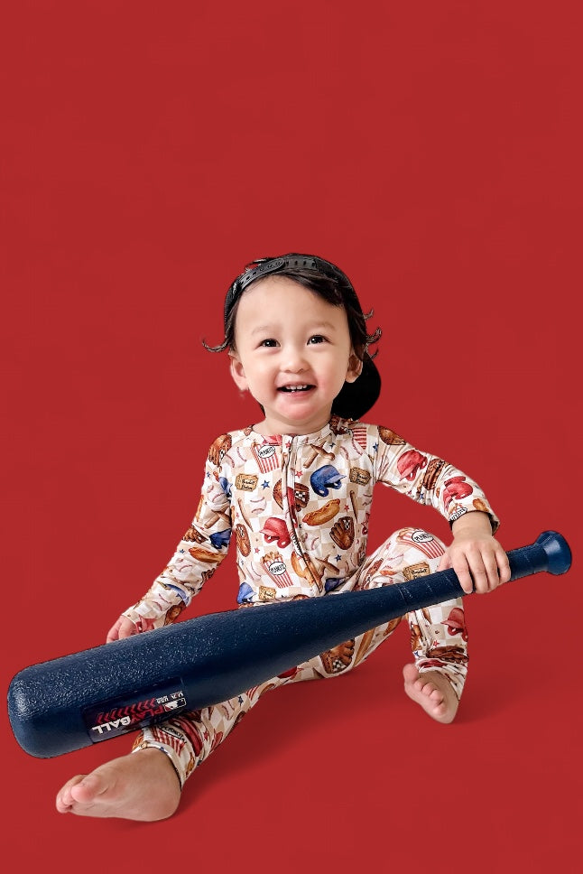 Crafted from ultra-soft and breathable bamboo viscose, this romper is built for both comfort and performance—just like a well-worn baseball glove. With tag-less garment labels, your little slugger will enjoy itch-free wear all day and night. The fold-over hand cuffs and footie option- up to 12-18m provide extra coziness, while the double zipper makes diaper changes a breeze—no extra innings required! Whether it’s game time, nap time, or snack time, this romper is a must-have for every future all-star.