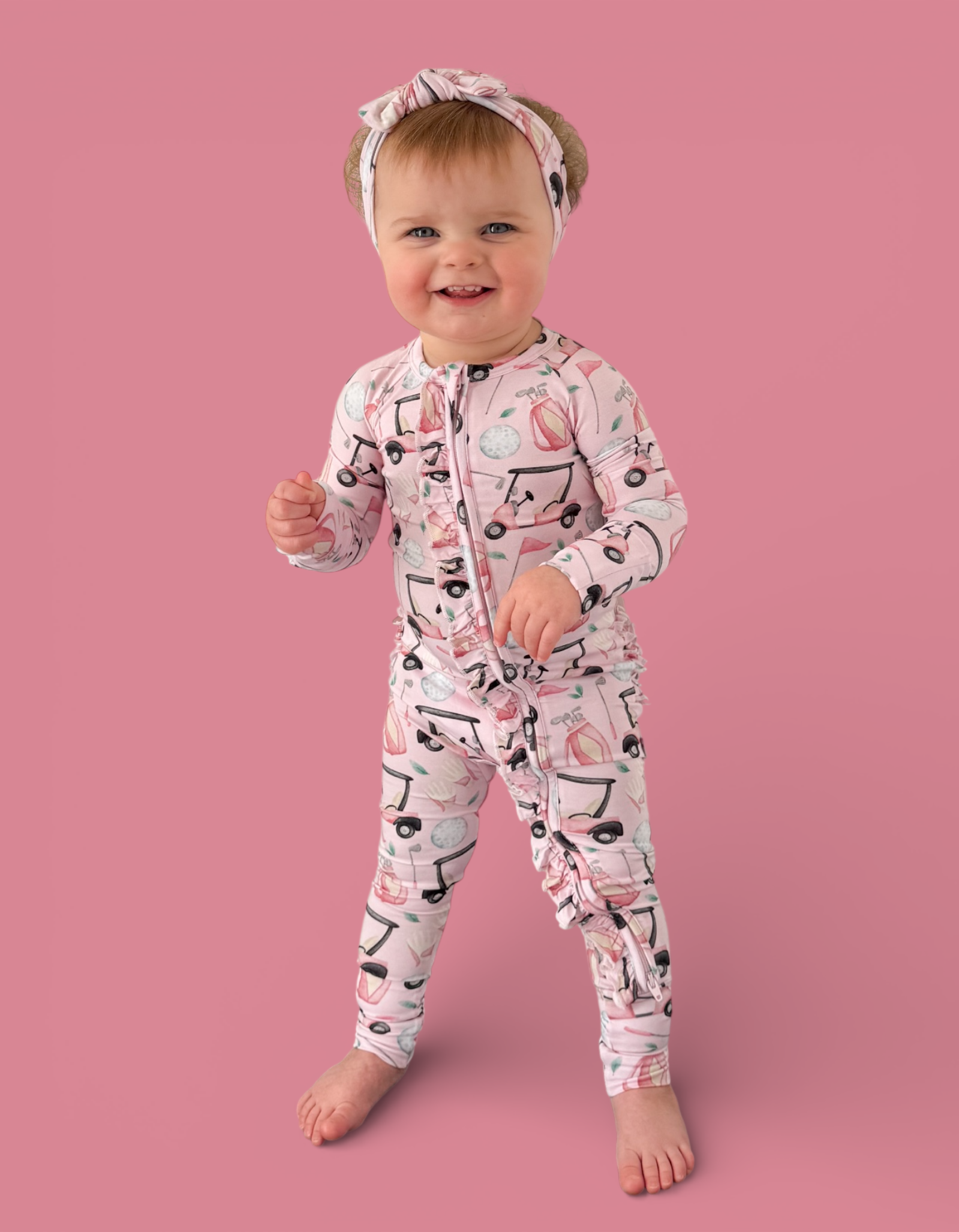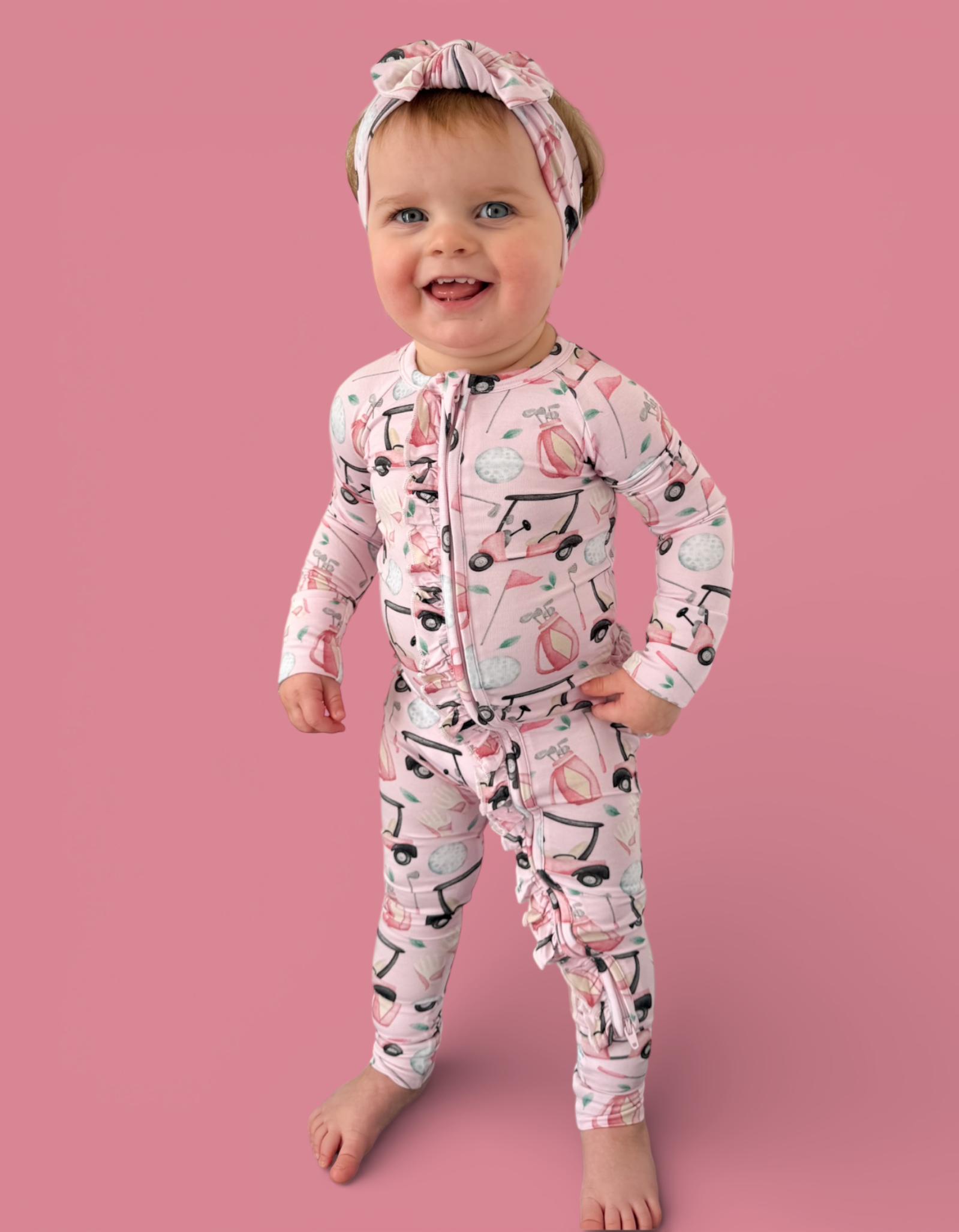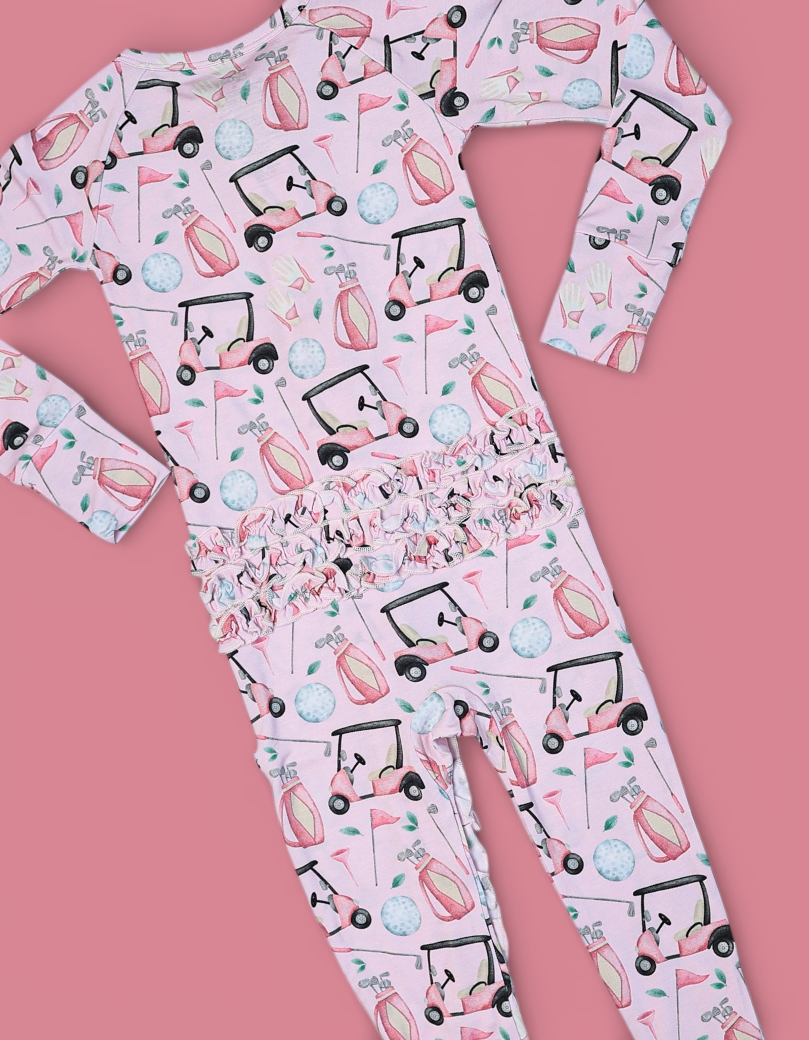 The Pretty and Par Dream Ruffle Romper brings playful elegance to everyday comfort, featuring an adorable golf-inspired print with soft pink details for the cutest sporty vibe. Made from our signature buttery-soft bamboo fabric, this cozy one-piece is breathable, gentle, and perfect for all-day wear. Finished with darling ruffle accents for an extra dose of charm.