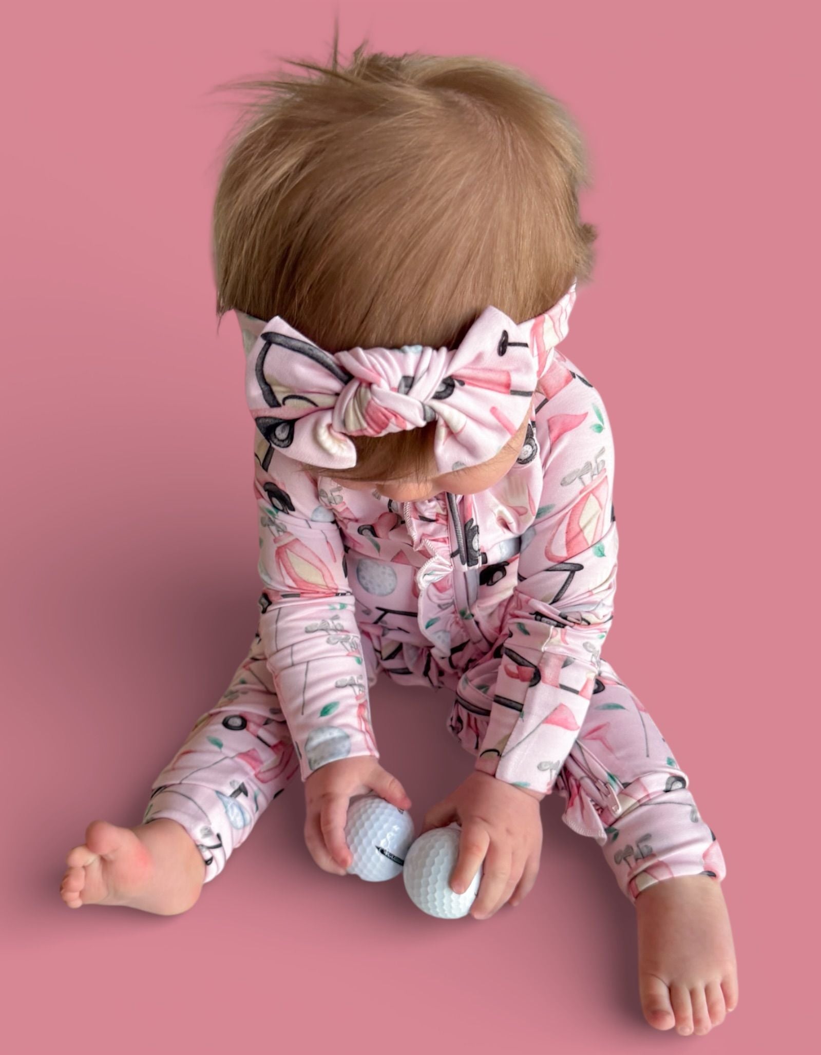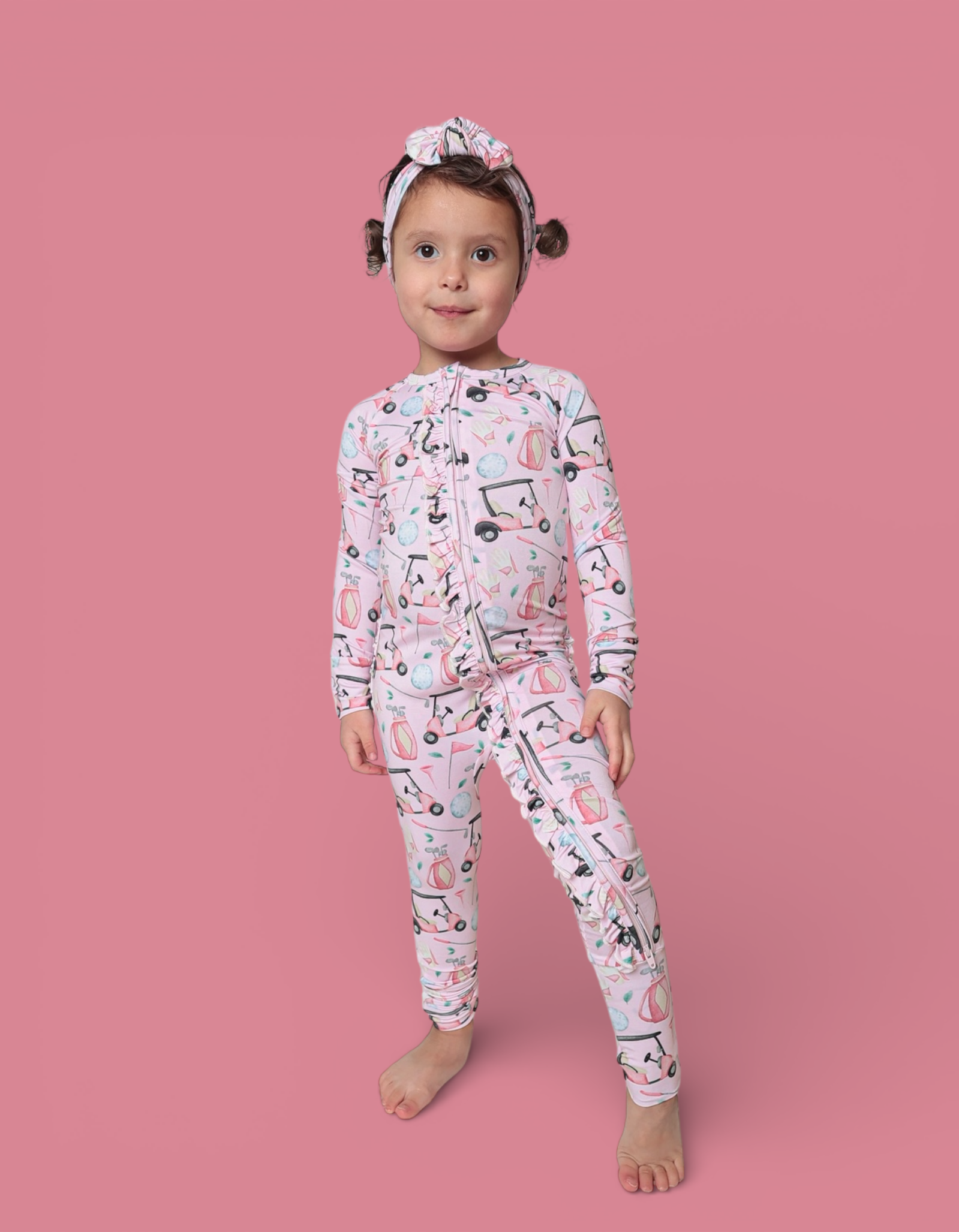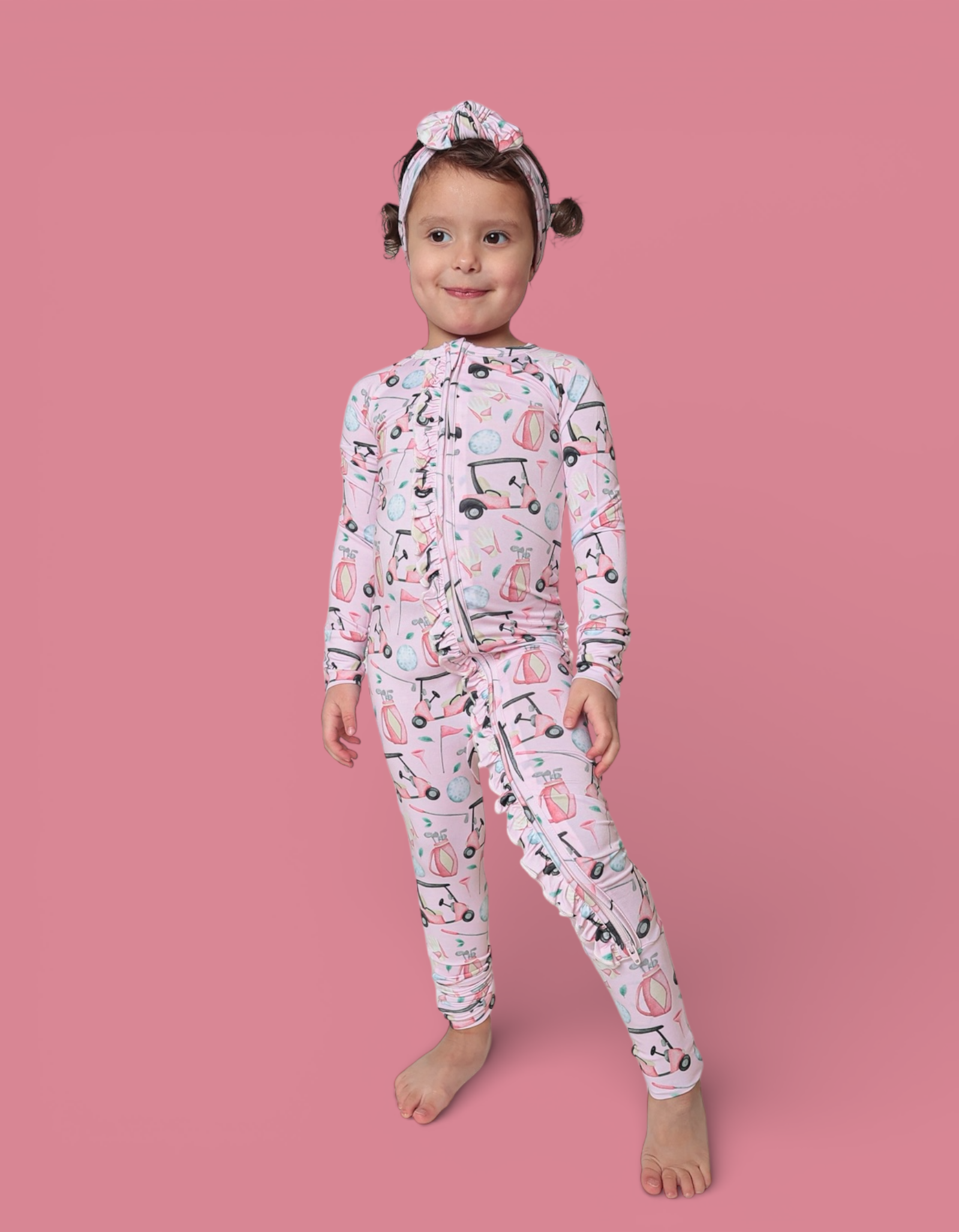 The Pretty and Par Dream Ruffle Romper brings playful elegance to everyday comfort, featuring an adorable golf-inspired print with soft pink details for the cutest sporty vibe. Made from our signature buttery-soft bamboo fabric, this cozy one-piece is breathable, gentle, and perfect for all-day wear. Finished with darling ruffle accents for an extra dose of charm.