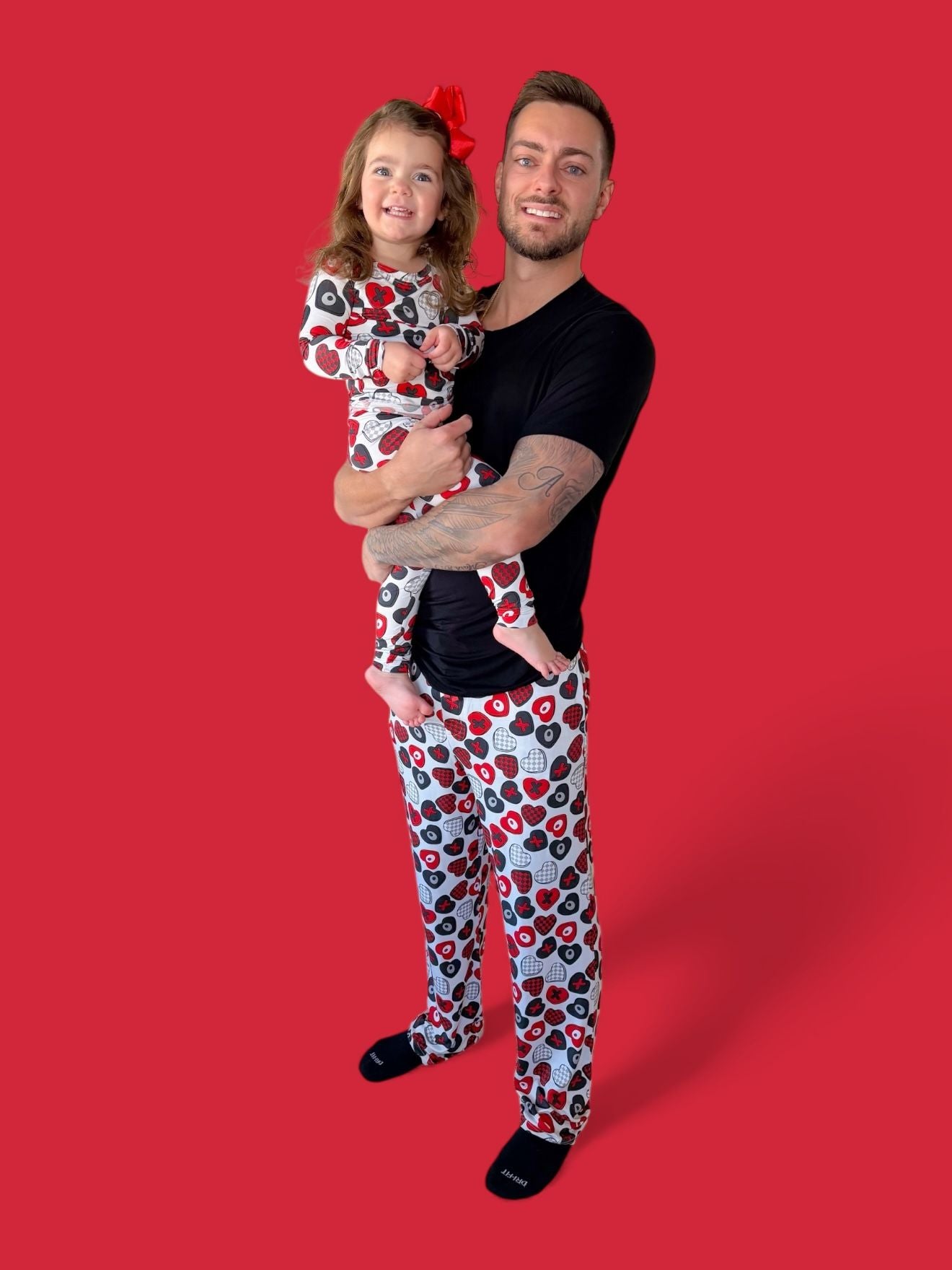 Cozy comfort with a playful edge! The Cross My Heart Dream Men’s Pants are crafted from our signature buttery-soft bamboo fabric and feature a bold all-over print of hearts and X’s in shades of red, black, and white. With a stretchy waistband, adjustable drawstring, and relaxed fit, they’re perfect for lounging, sleeping, or matching with the family.