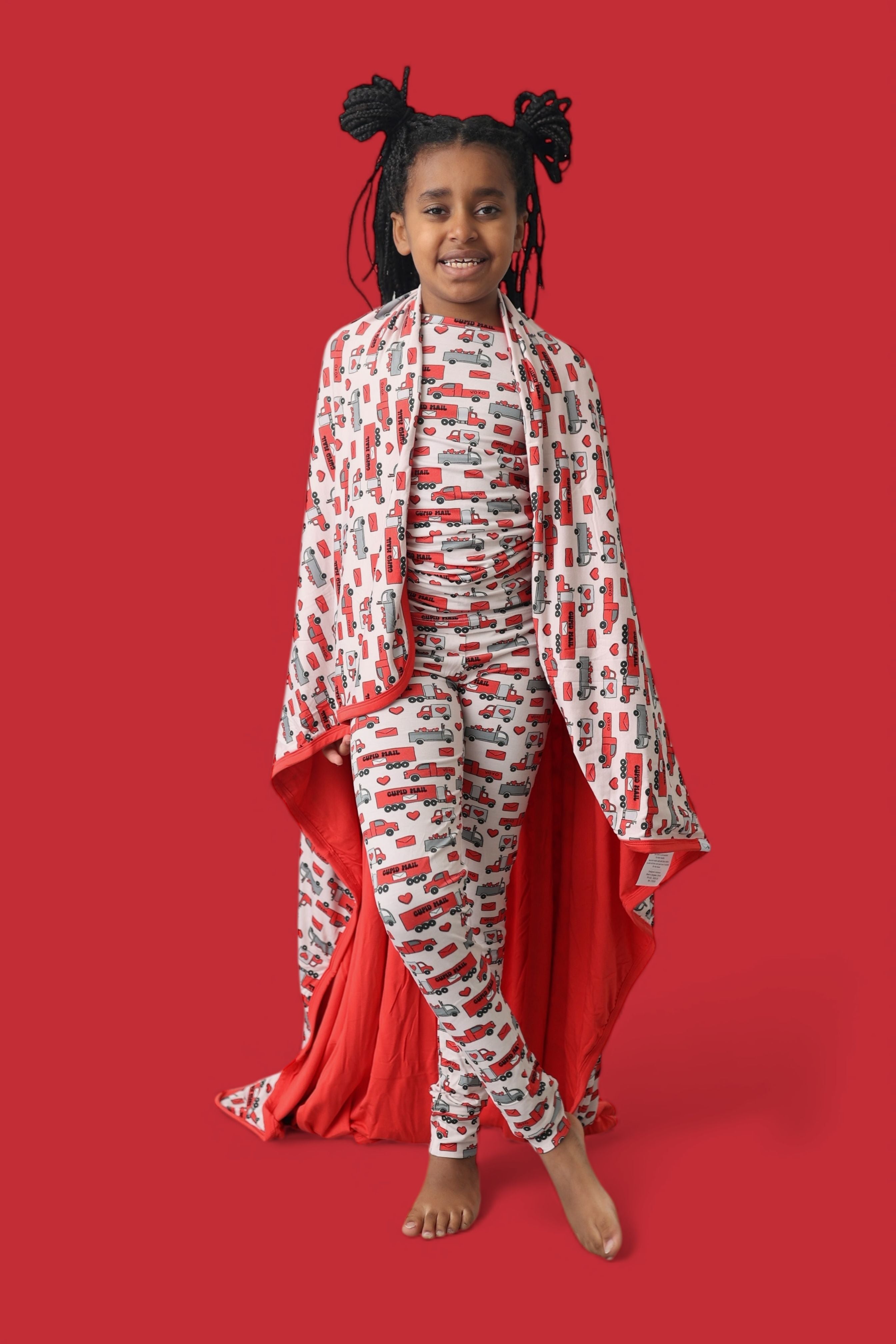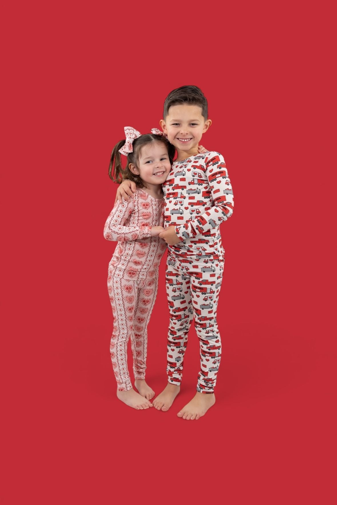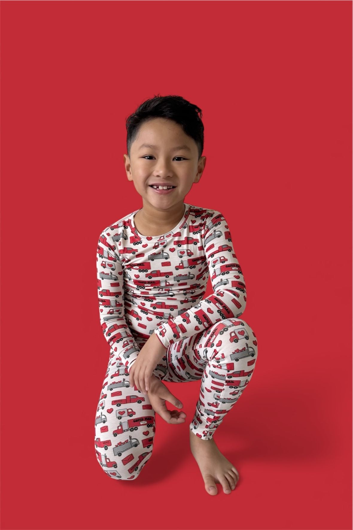 Love on the go, now in a two-piece! The Haulin’ Hearts Dream Set features a long sleeve top and matching pants with a cheerful print of red + gray trucks, letters, and hearts delivering “Cupid Mail.” Crafted from our signature buttery-soft bamboo fabric, this set is breathable, stretchy, and perfect for snuggles, playtime, or drifting into heart-filled dreams.