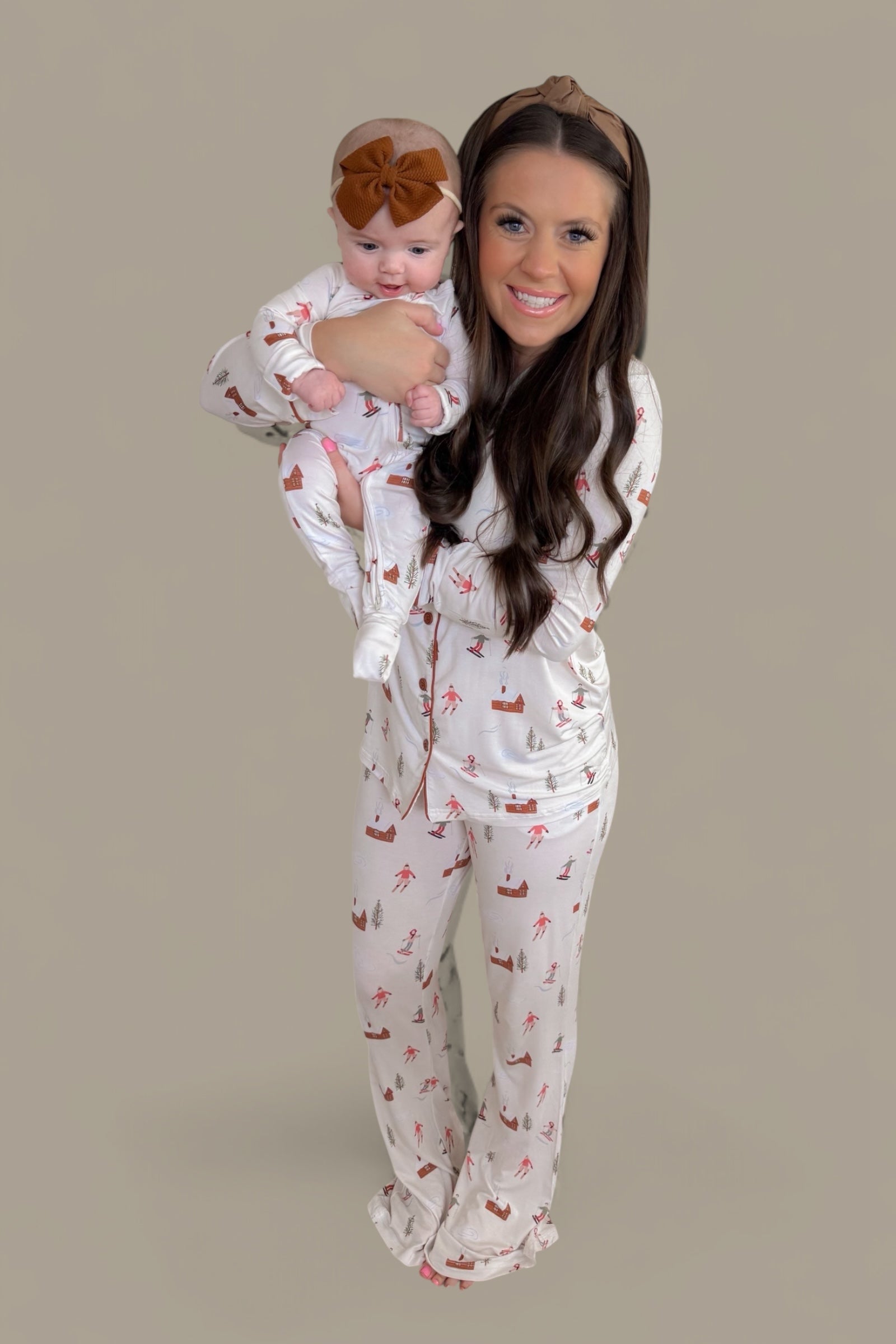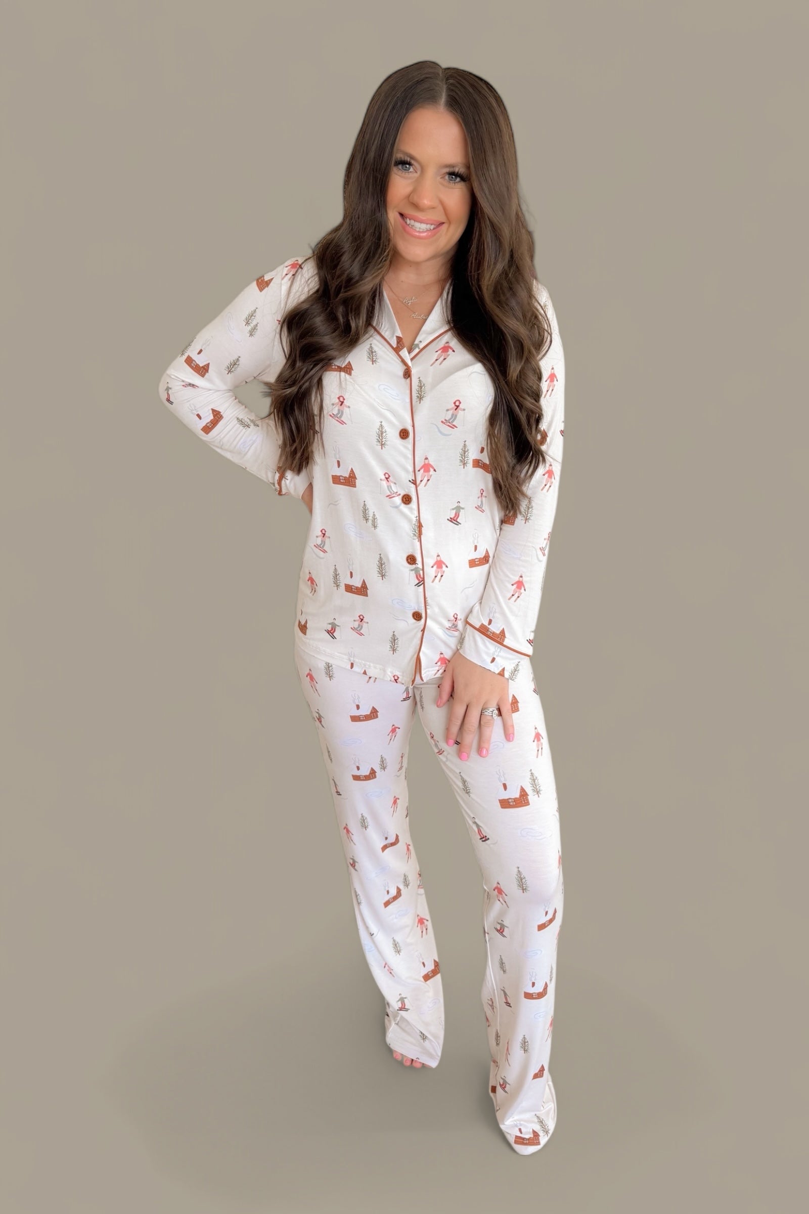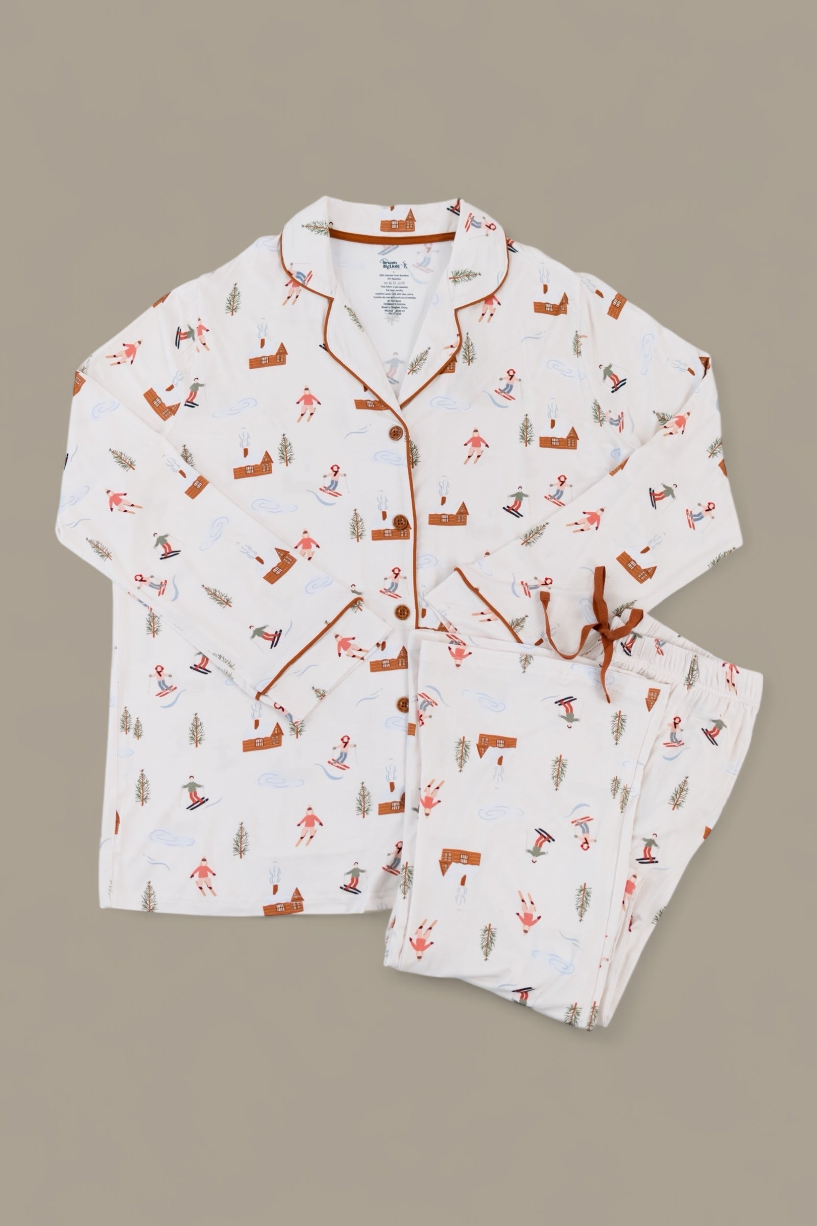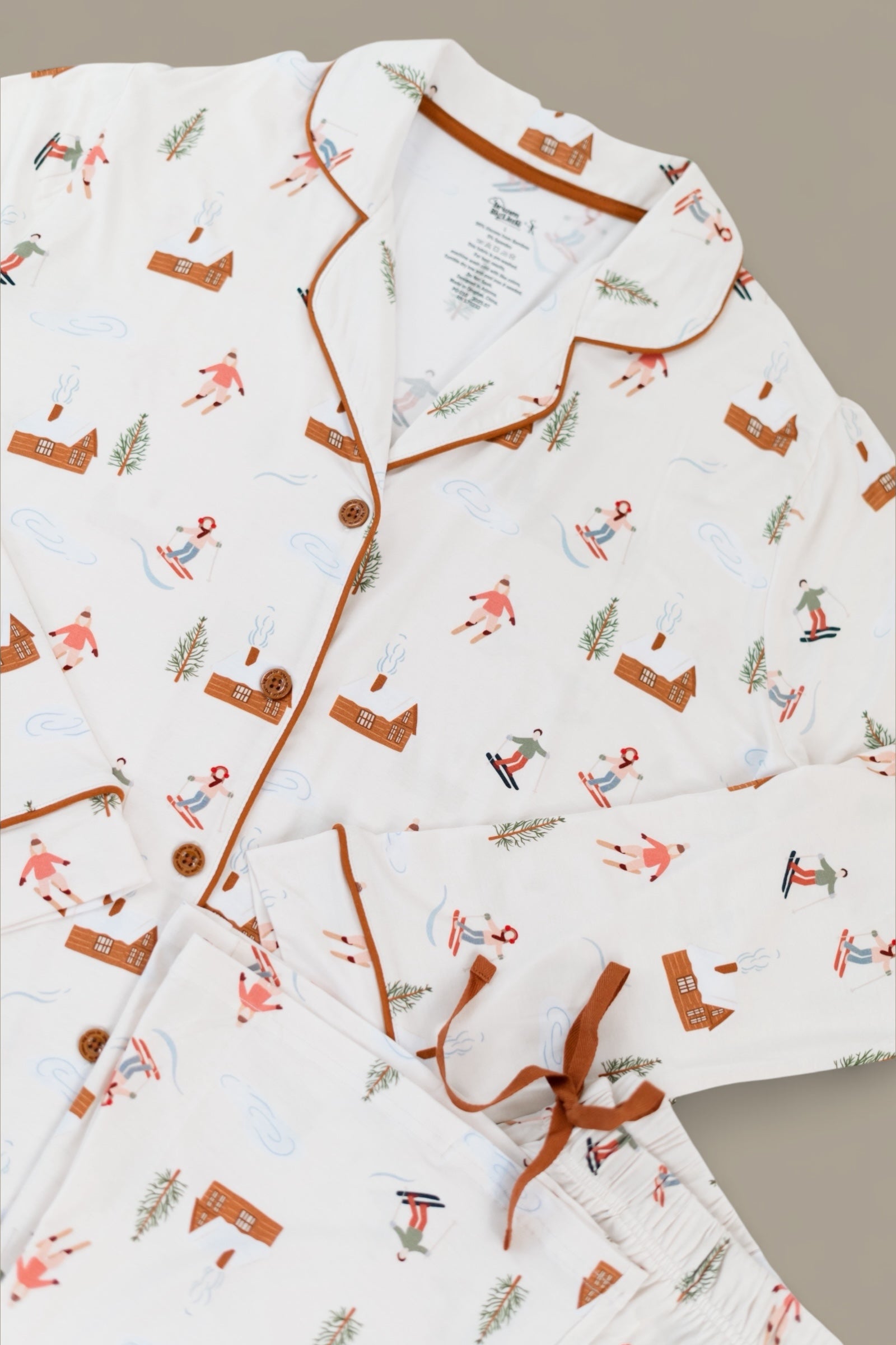 Escape to your own winter wonderland with our Cozy Chalet Women’s Dream Flare Set. Featuring an ultra-soft fabric blend and a whimsical chalet-inspired print, this set brings the magic of the mountains right to your bedtime routine. With a flattering flare pant, contrast piping, and darling button-front top, it's equal parts stylish and snuggly. Whether you're sipping cocoa fireside or enjoying a slow Sunday morning, this pajama set is your go-to for dreamy comfort and effortless charm.