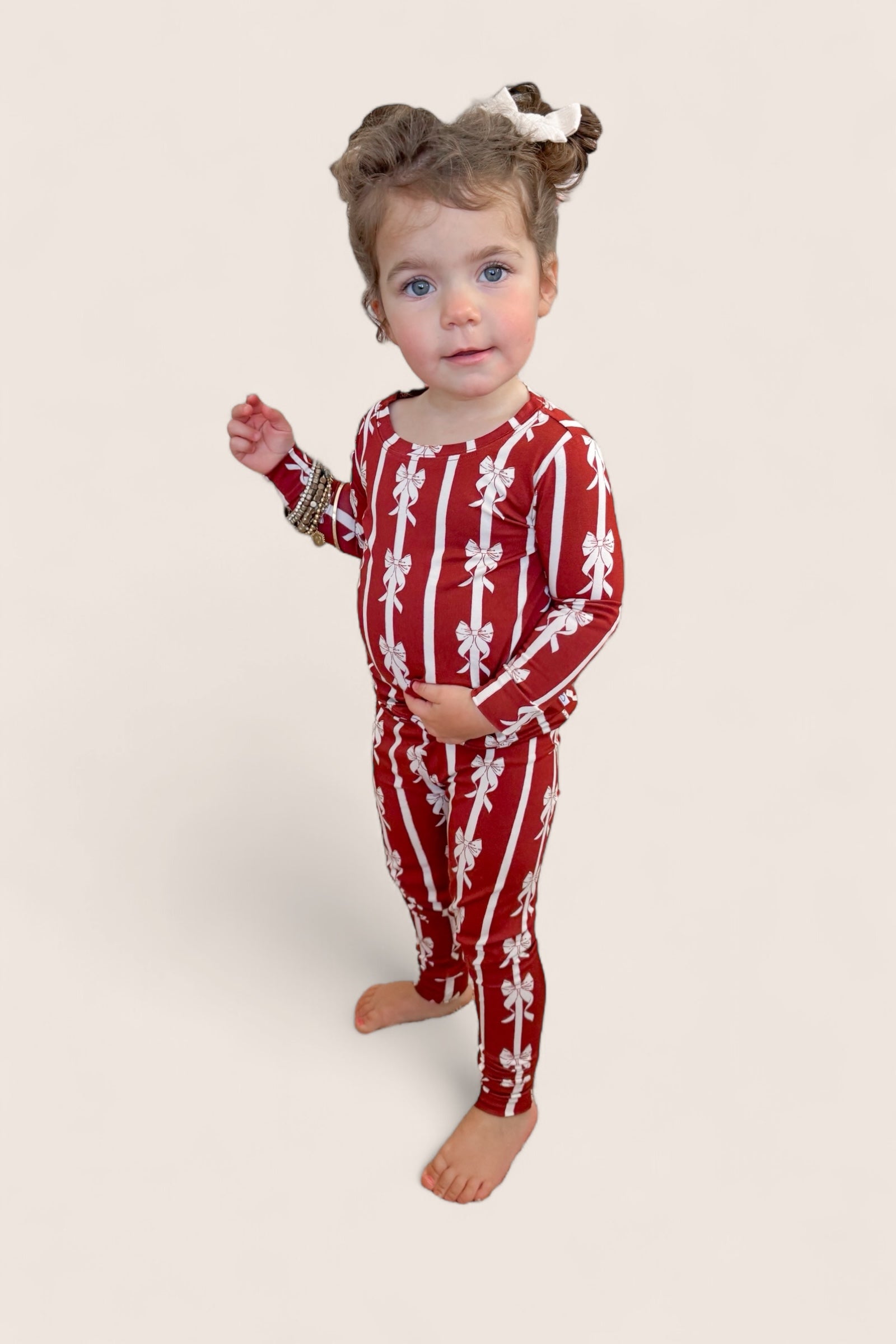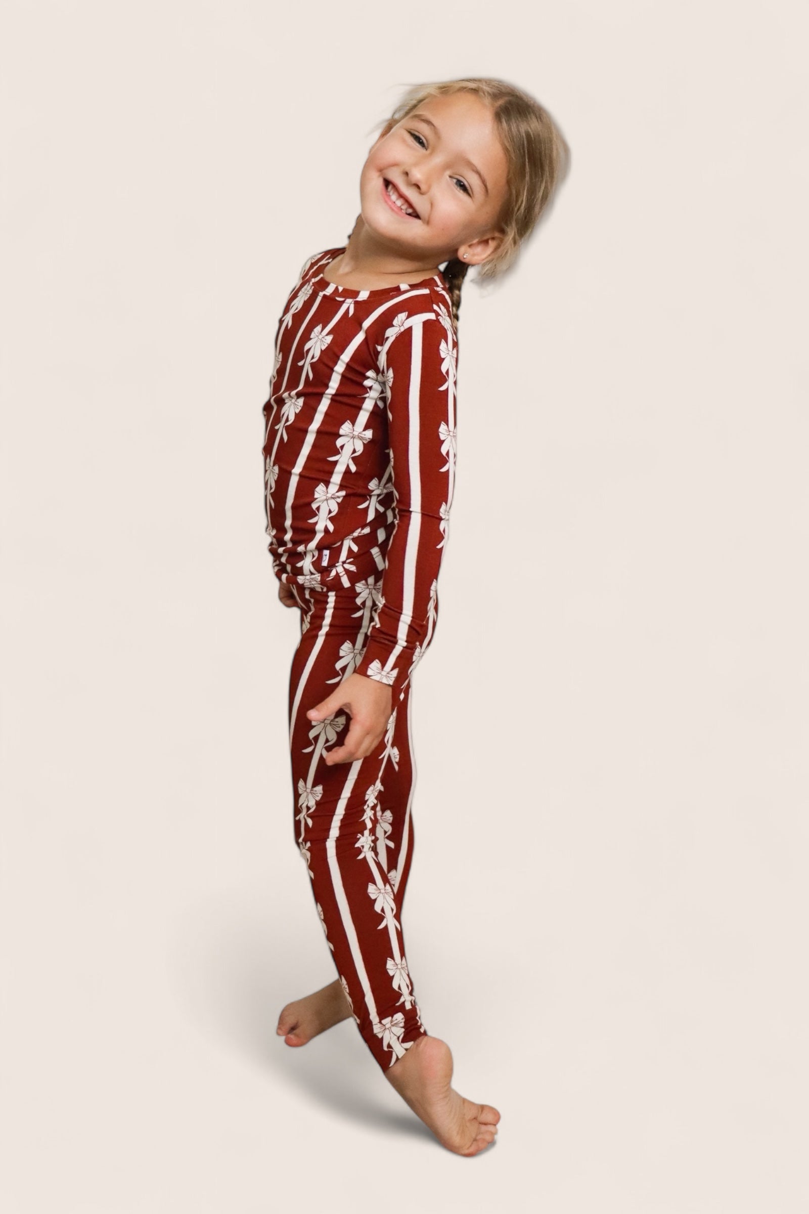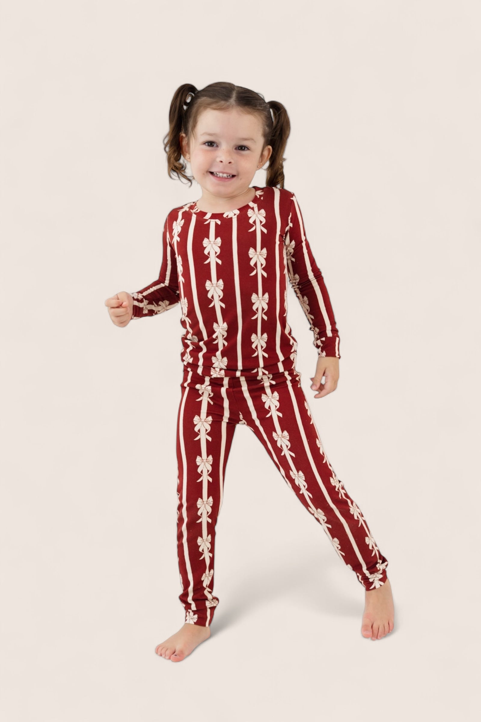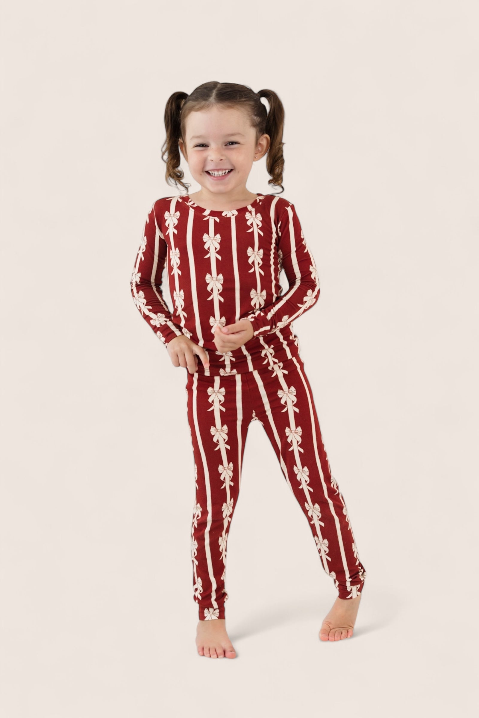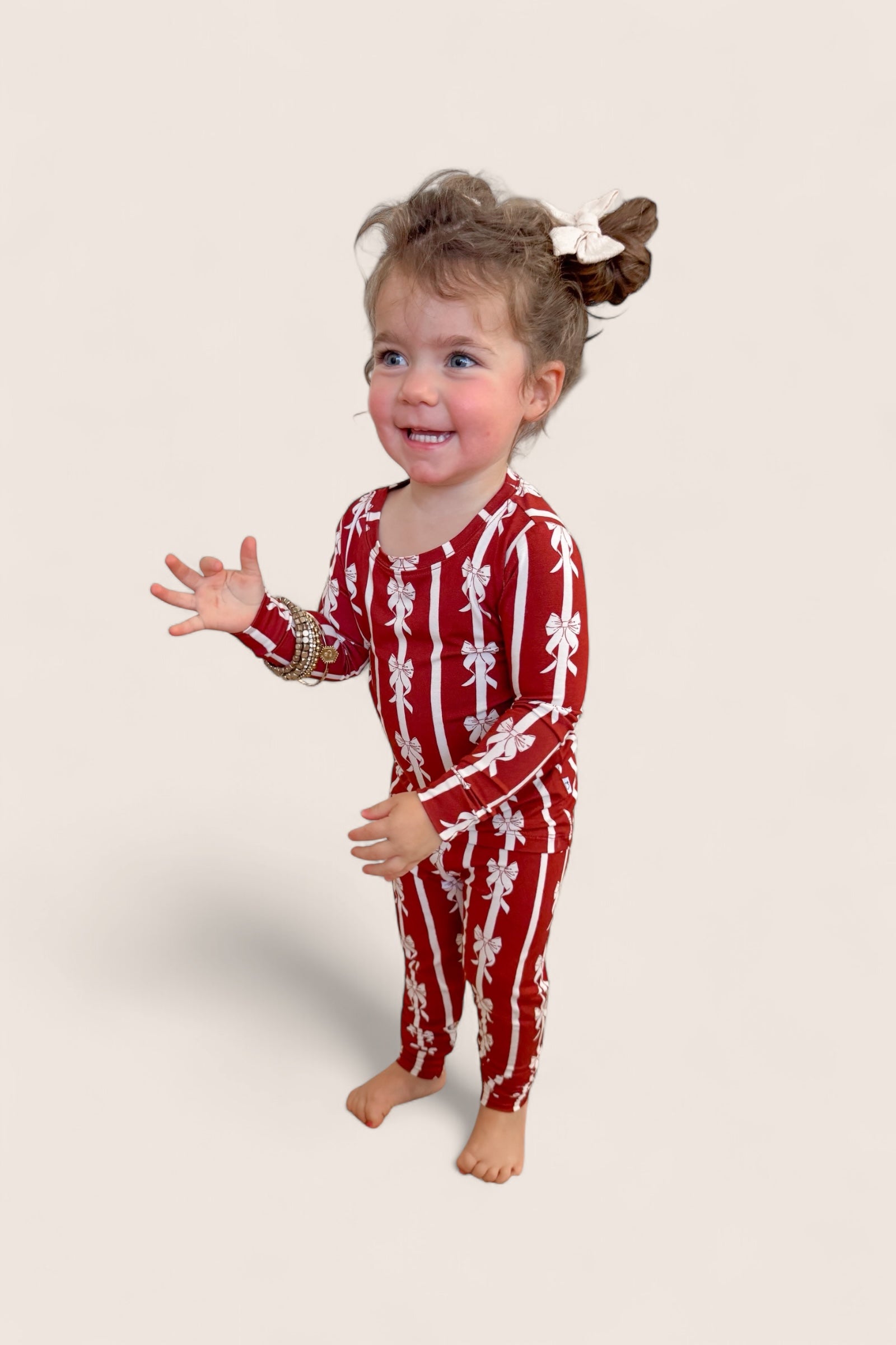 Wrap up in the holiday spirit with the Mistle-Bows Dream Set! This two-piece long sleeve pajama set features a rich, burgundy backdrop with dainty cream bows and candy stripe vibes—just like your favorite wrapped presents. Crafted from buttery-soft bamboo for the coziest nights and merry mornings, this set is made for twirling by the tree, sipping cocoa, and making magical memories.