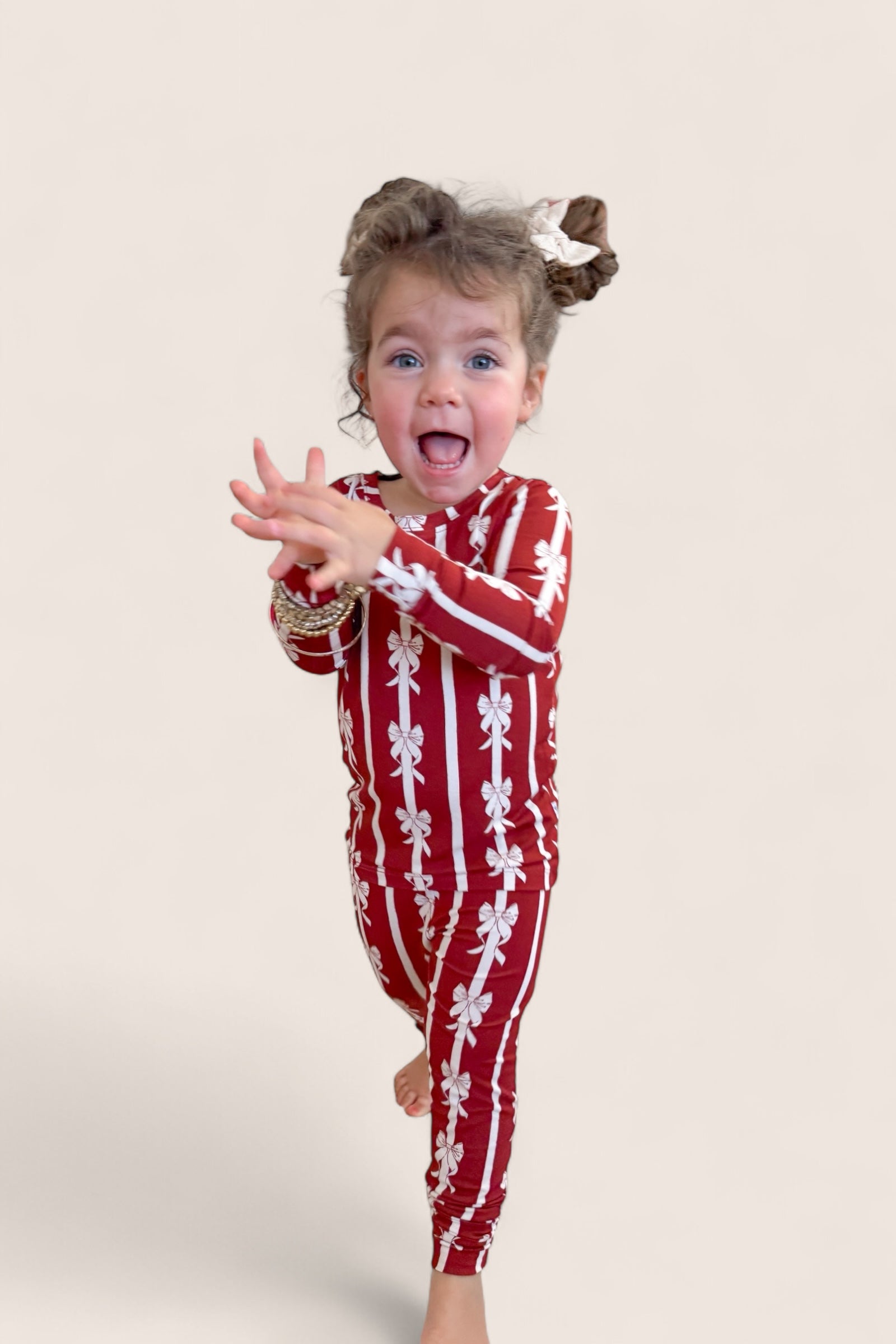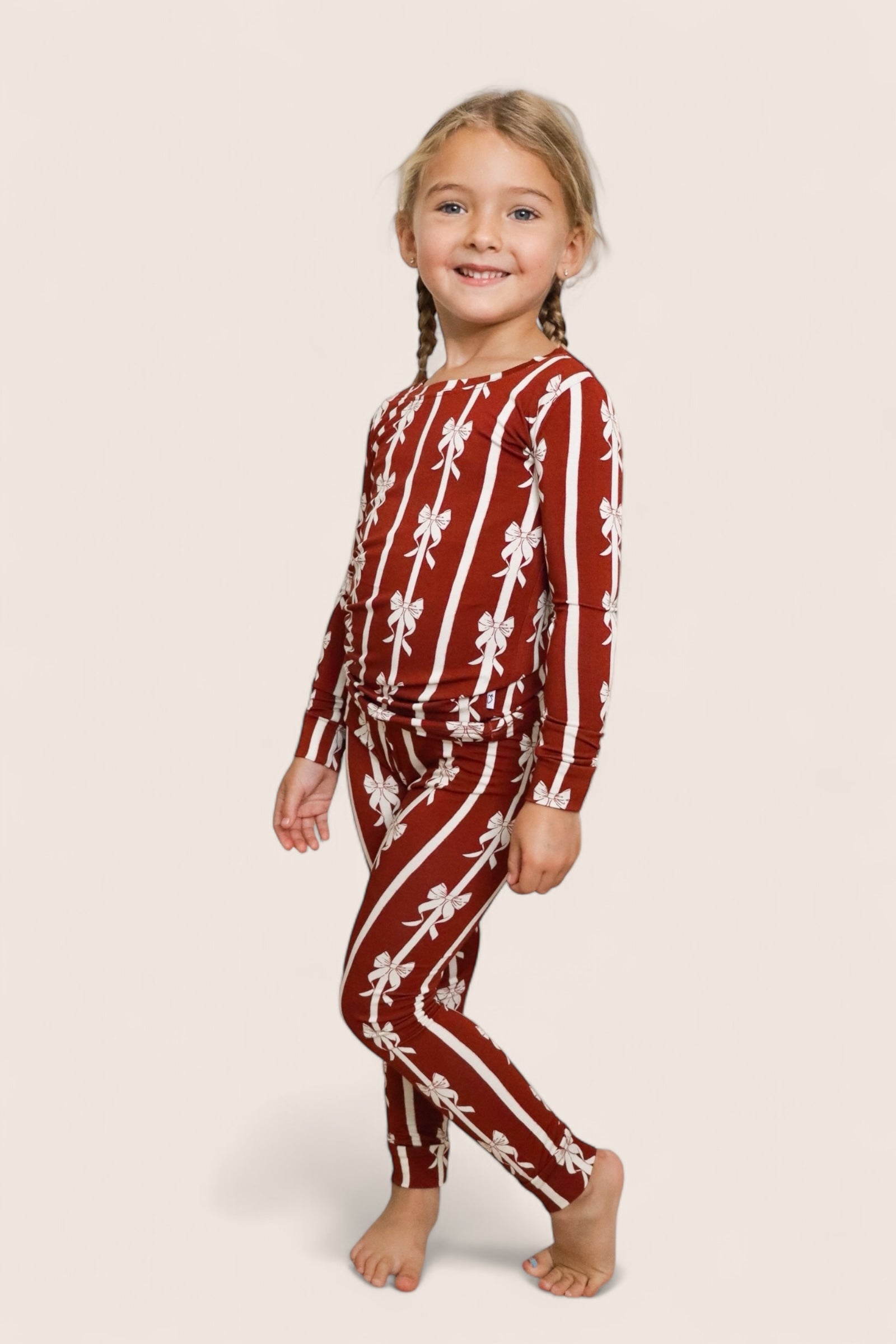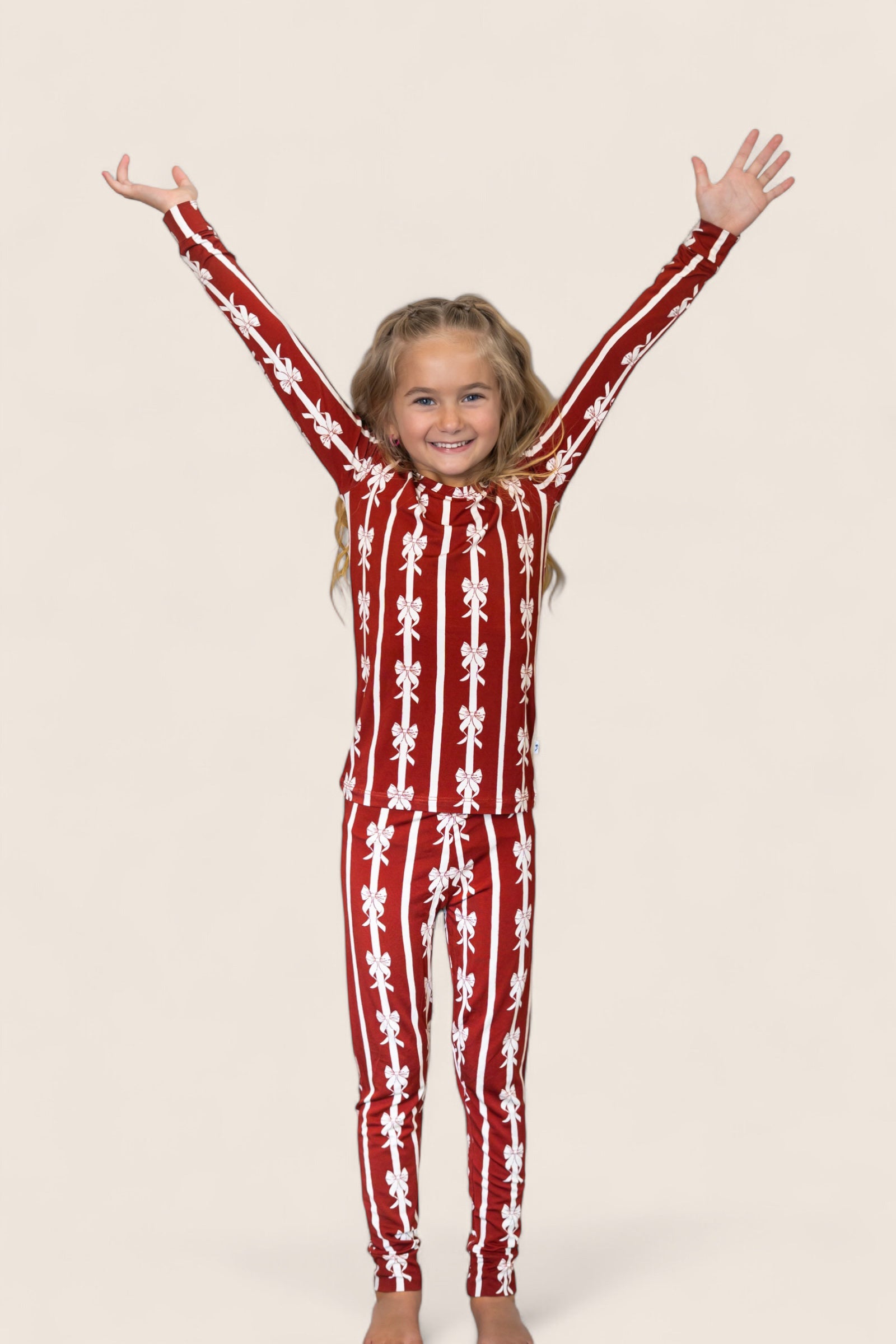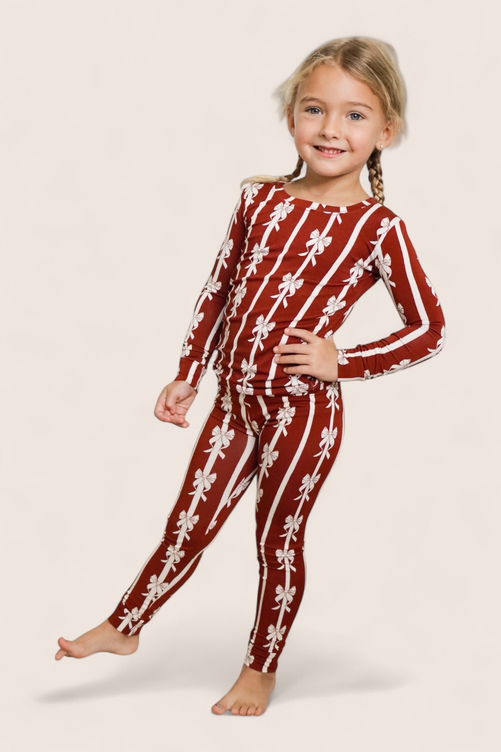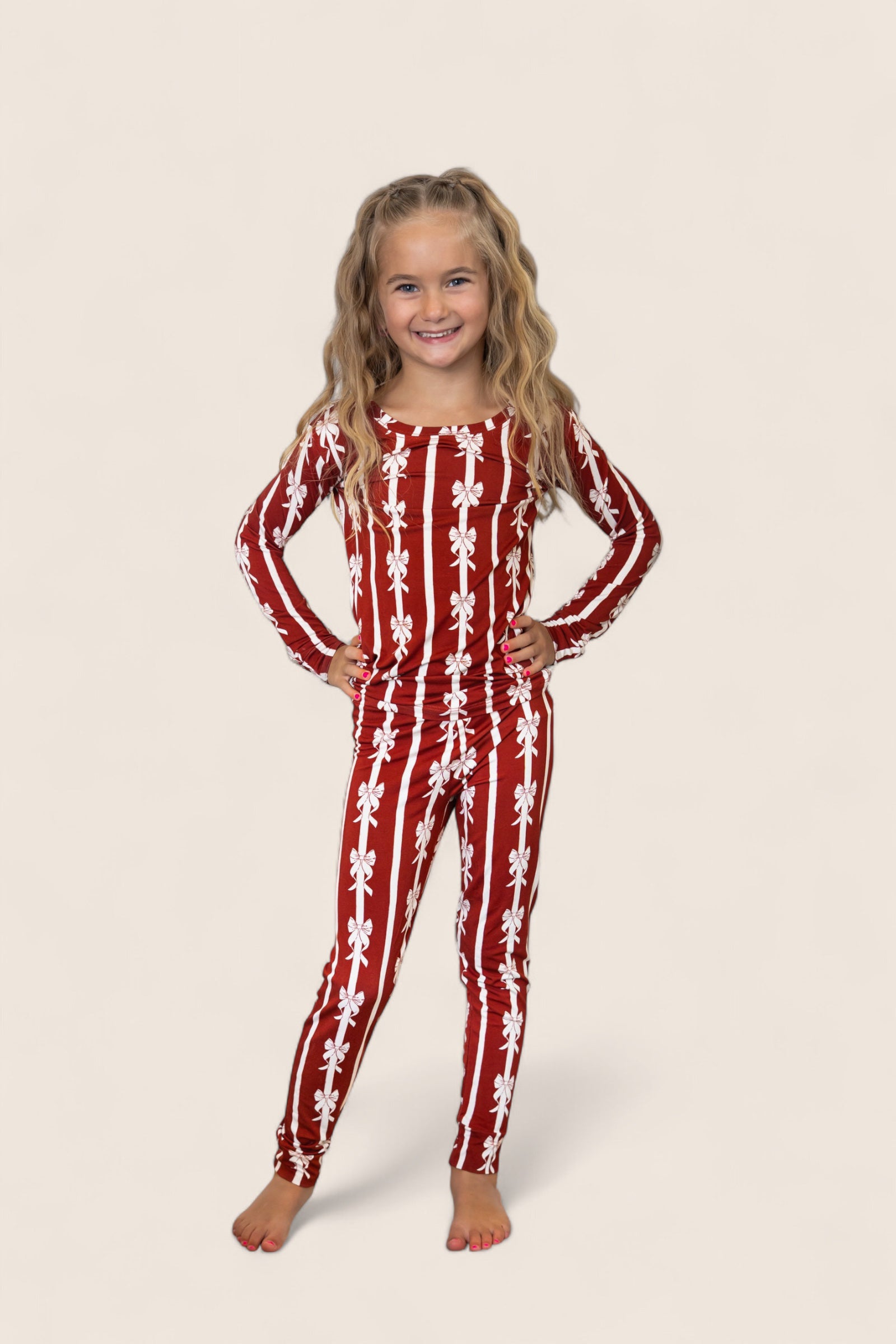 Wrap up in the holiday spirit with the Mistle-Bows Dream Set! This two-piece long sleeve pajama set features a rich, burgundy backdrop with dainty cream bows and candy stripe vibes—just like your favorite wrapped presents. Crafted from buttery-soft bamboo for the coziest nights and merry mornings, this set is made for twirling by the tree, sipping cocoa, and making magical memories.
