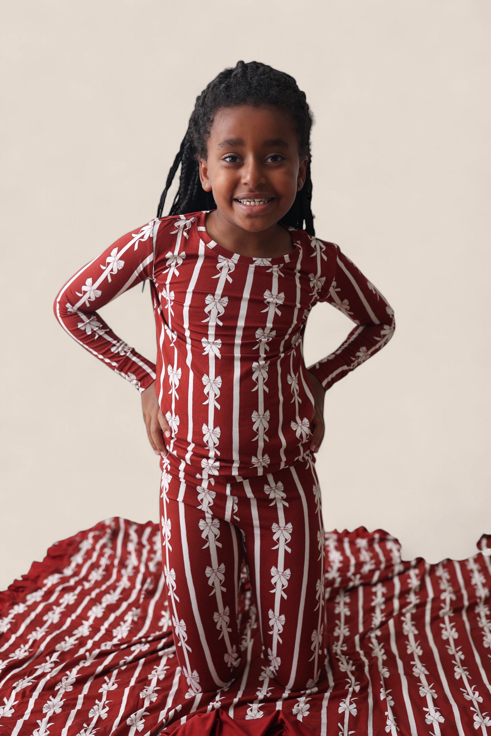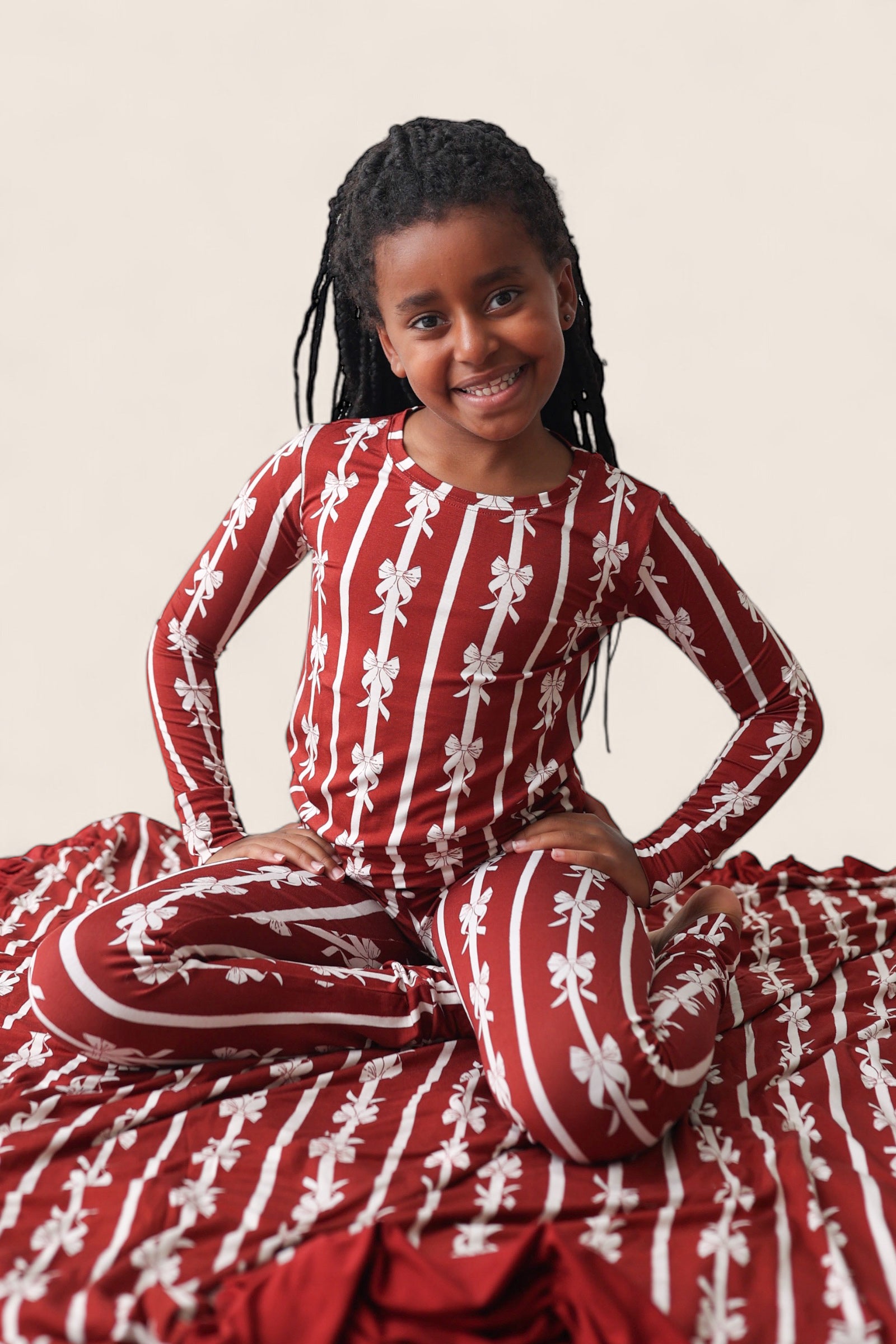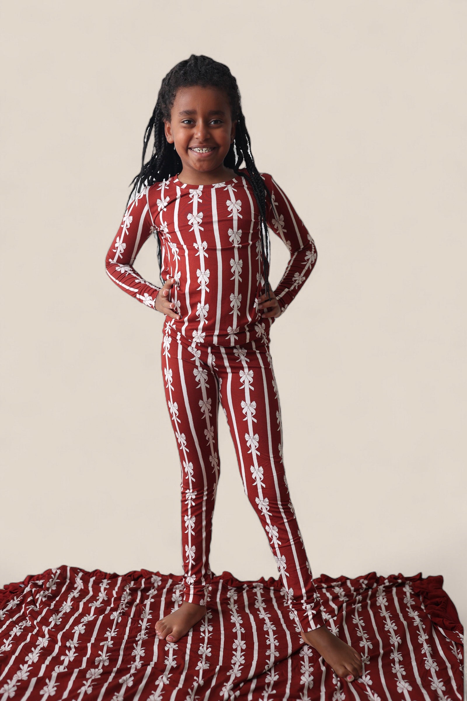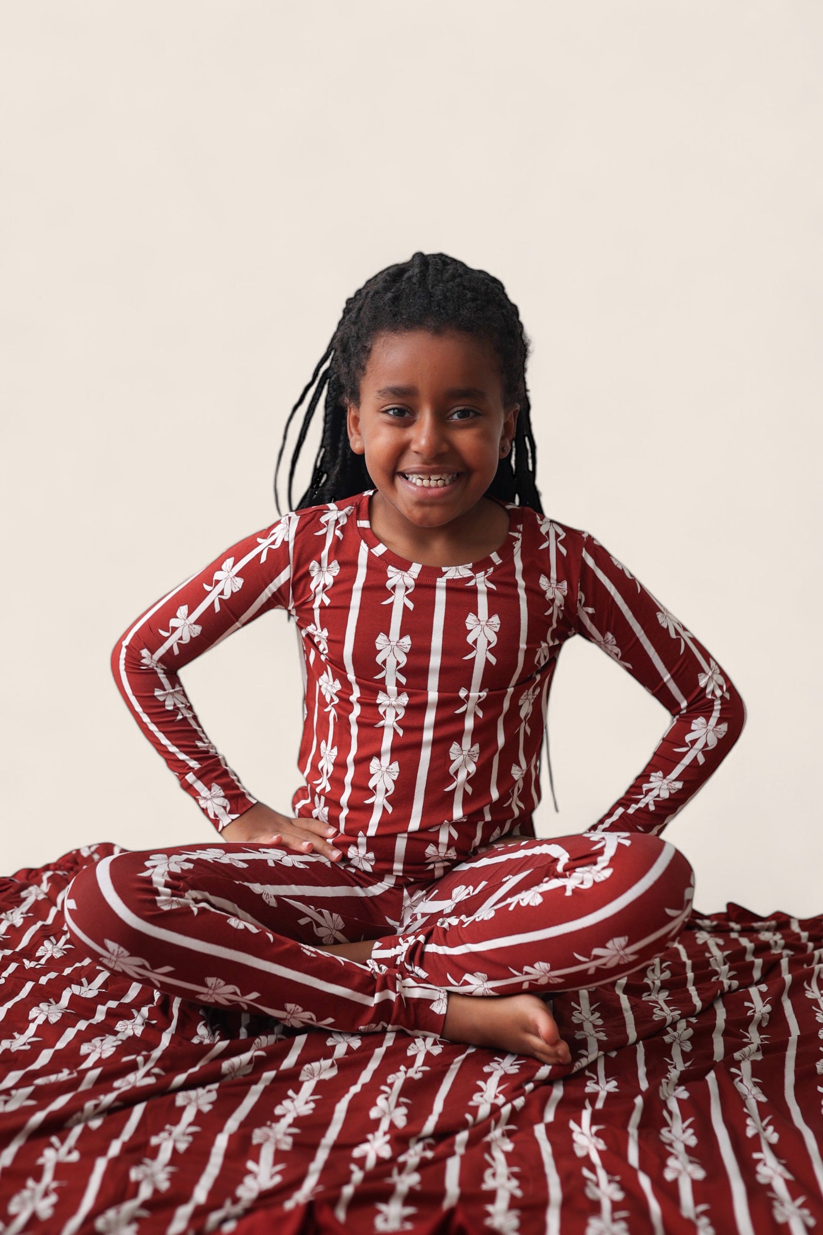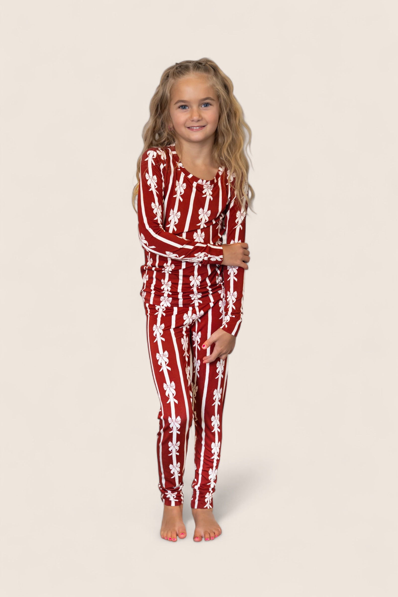 Wrap up in the holiday spirit with the Mistle-Bows Dream Set! This two-piece long sleeve pajama set features a rich, burgundy backdrop with dainty cream bows and candy stripe vibes—just like your favorite wrapped presents. Crafted from buttery-soft bamboo for the coziest nights and merry mornings, this set is made for twirling by the tree, sipping cocoa, and making magical memories.