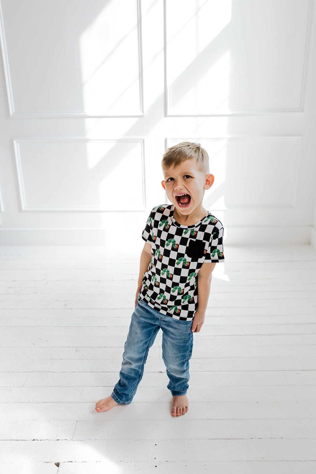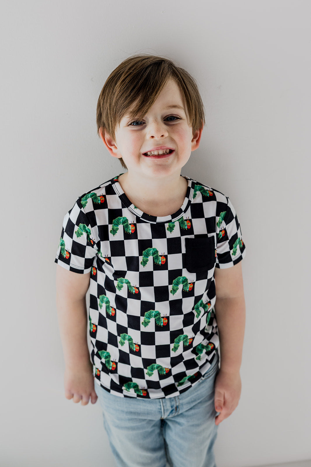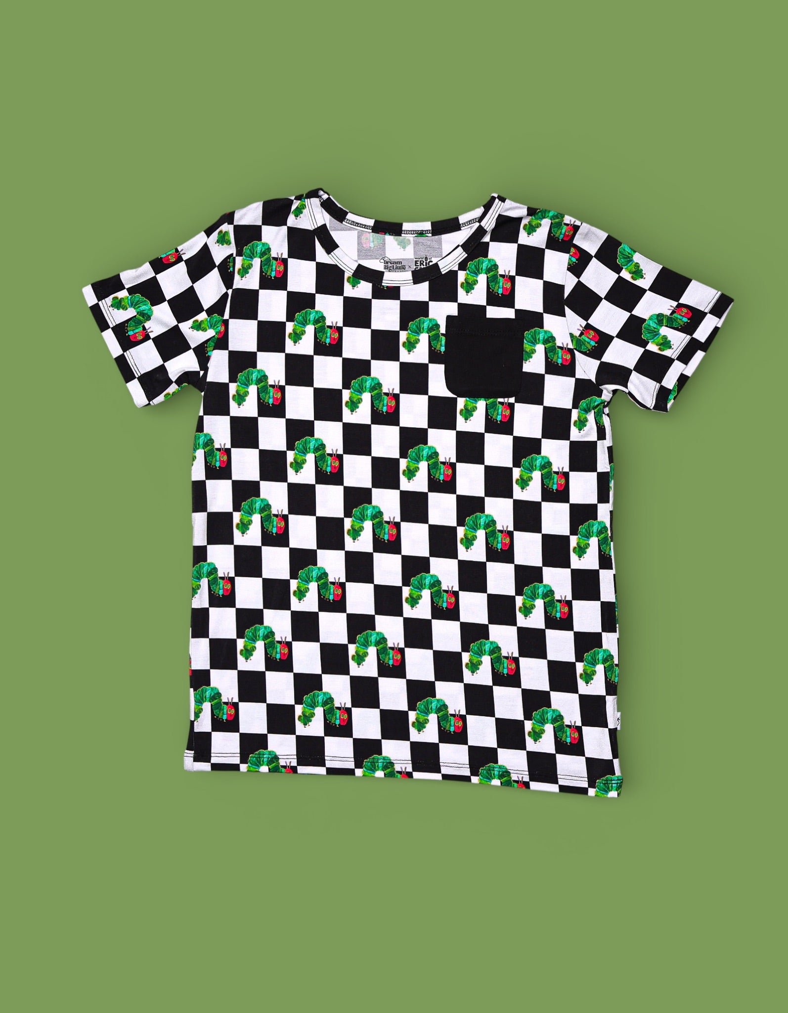 The Caterpillar Check Dream Pocket Tee brings a playful pop of nostalgia to everyday wear. Part of our exclusive DBLC x World of Eric Carle collaboration, this bold black-and-white check is sprinkled with the beloved hungry caterpillar and finished with a classic pocket detail. Made from our signature buttery-soft bamboo fabric, it’s lightweight, breathable, and perfect for play, lounging, and matching moments.