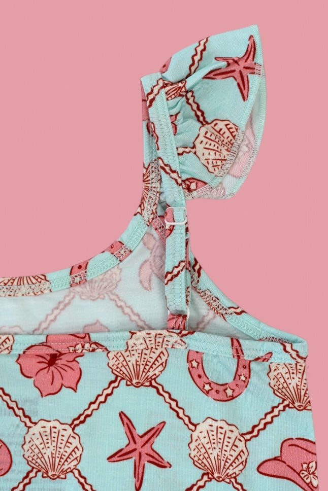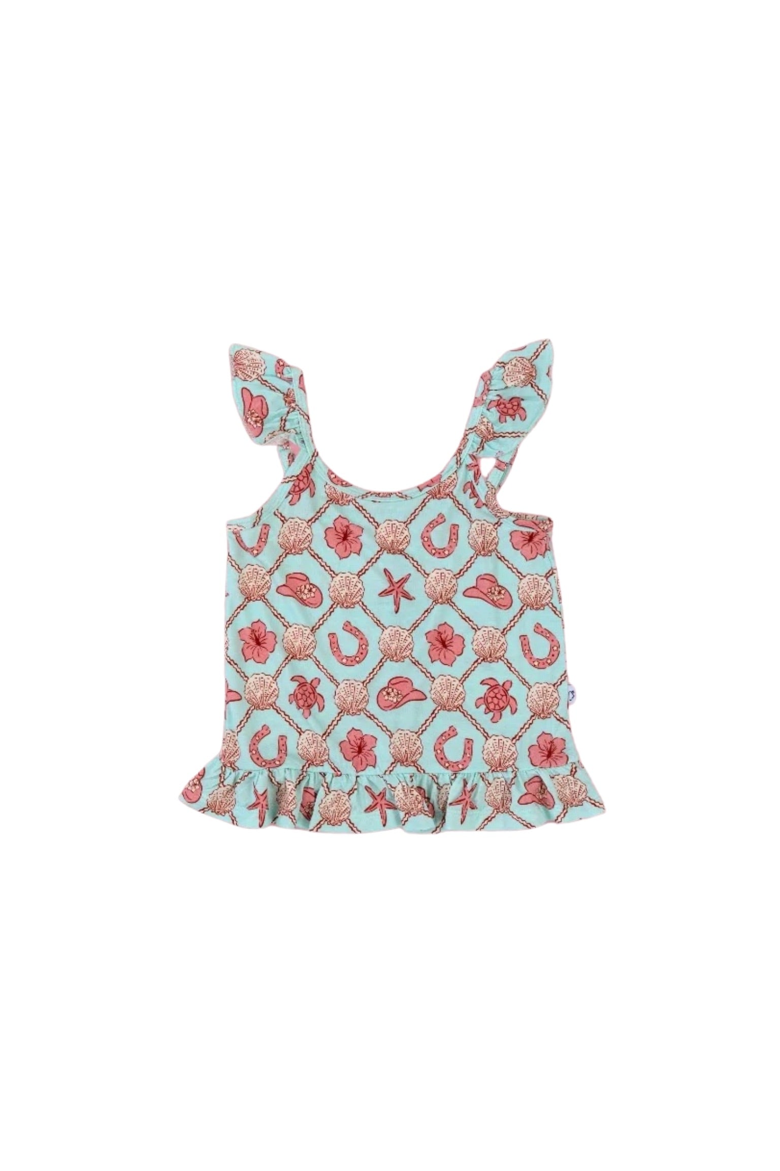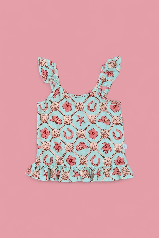 The Coastal Cowgirl Dream Ruffle Tank is made for sun-soaked days and twirl-filled play. Featuring a soft blue base with charming pink and coral details—like floral cowgirl hats, lucky horseshoes, sea turtles, and scallop shells—this tank brings a beachy Western vibe to your little one’s everyday look.