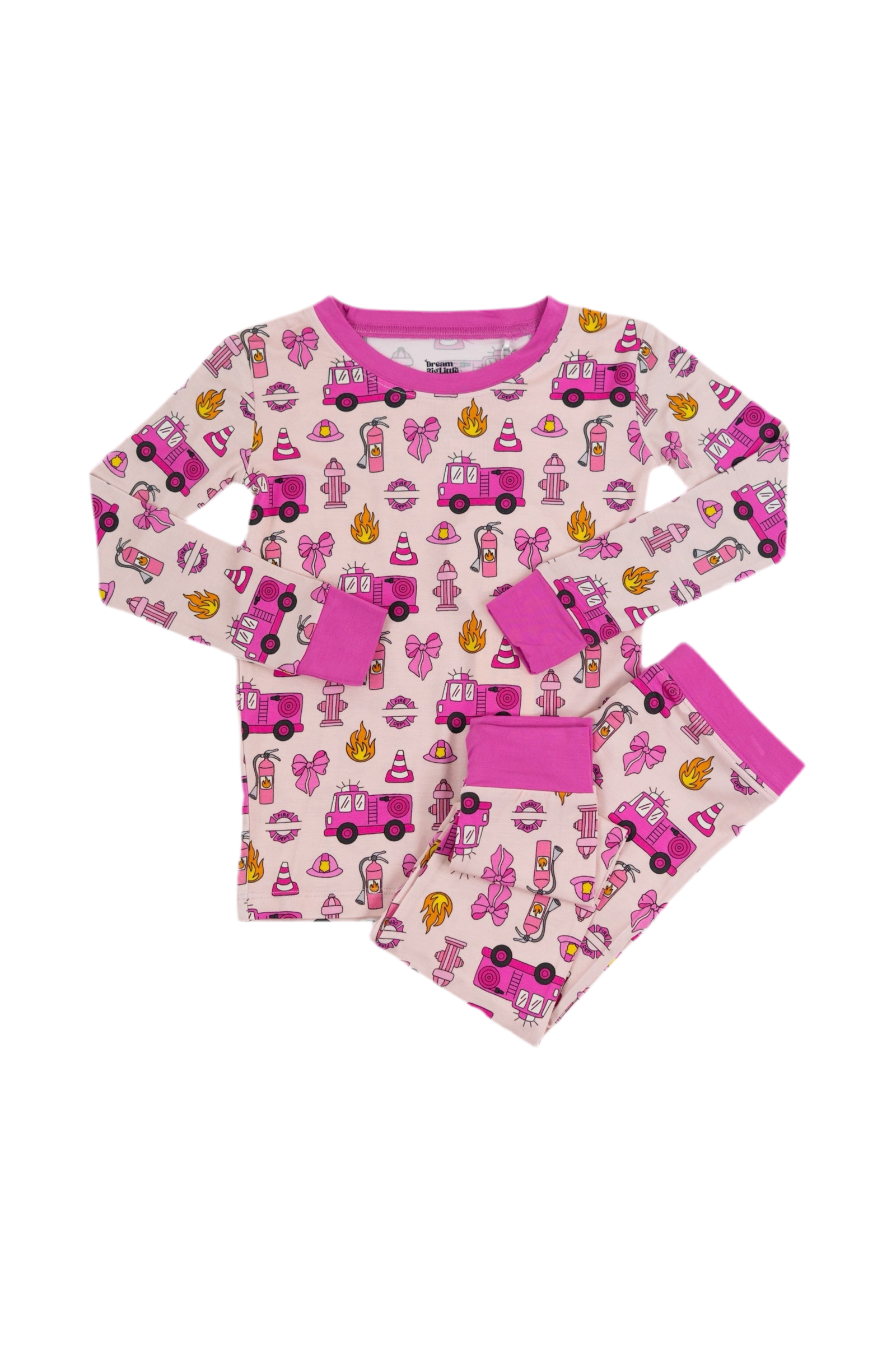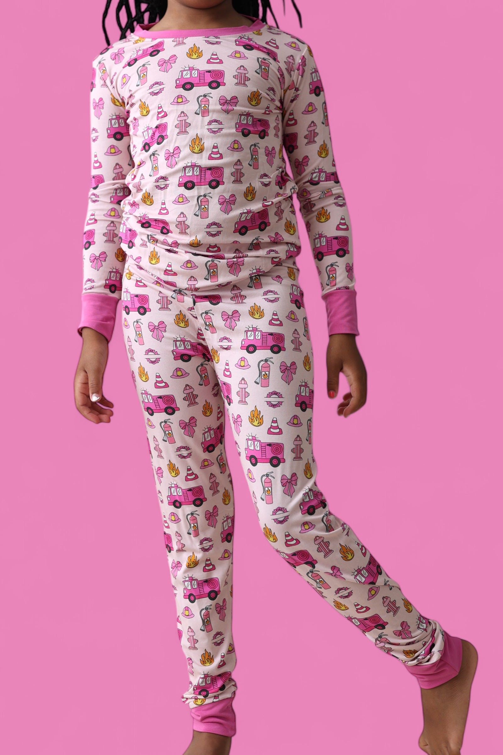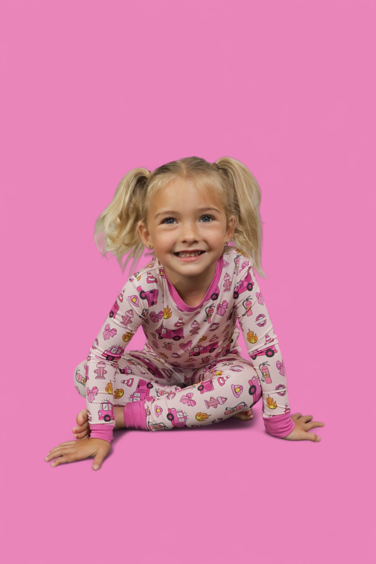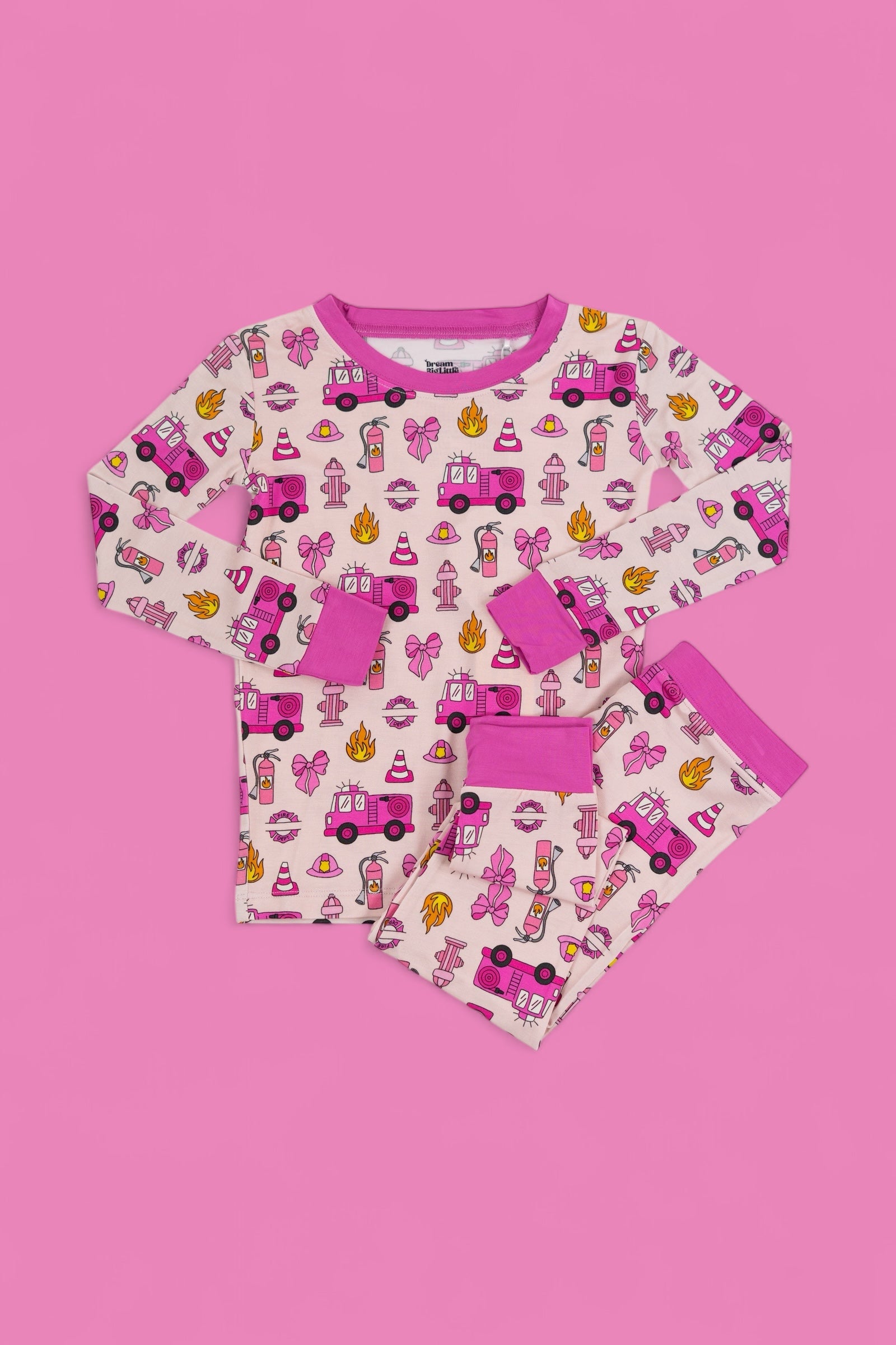Gear up for bedtime like a true hero with our Blazing Bows and Hydrants Dream Set! This premium pajama set is inspired by the fearless world of firefighting, featuring bold pink firetrucks, hydrants, and safety gear intertwined with charming bows and playful flames. Designed for the little firefighters-in-training, this print brings an exciting, adventurous spirit to cozy sleepwear.