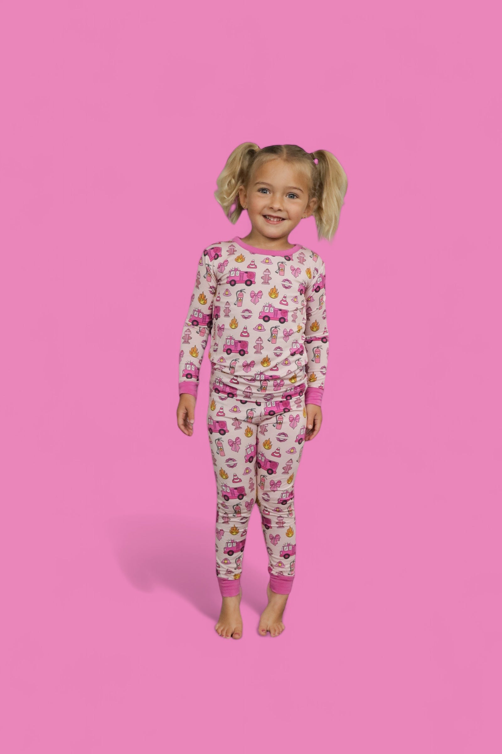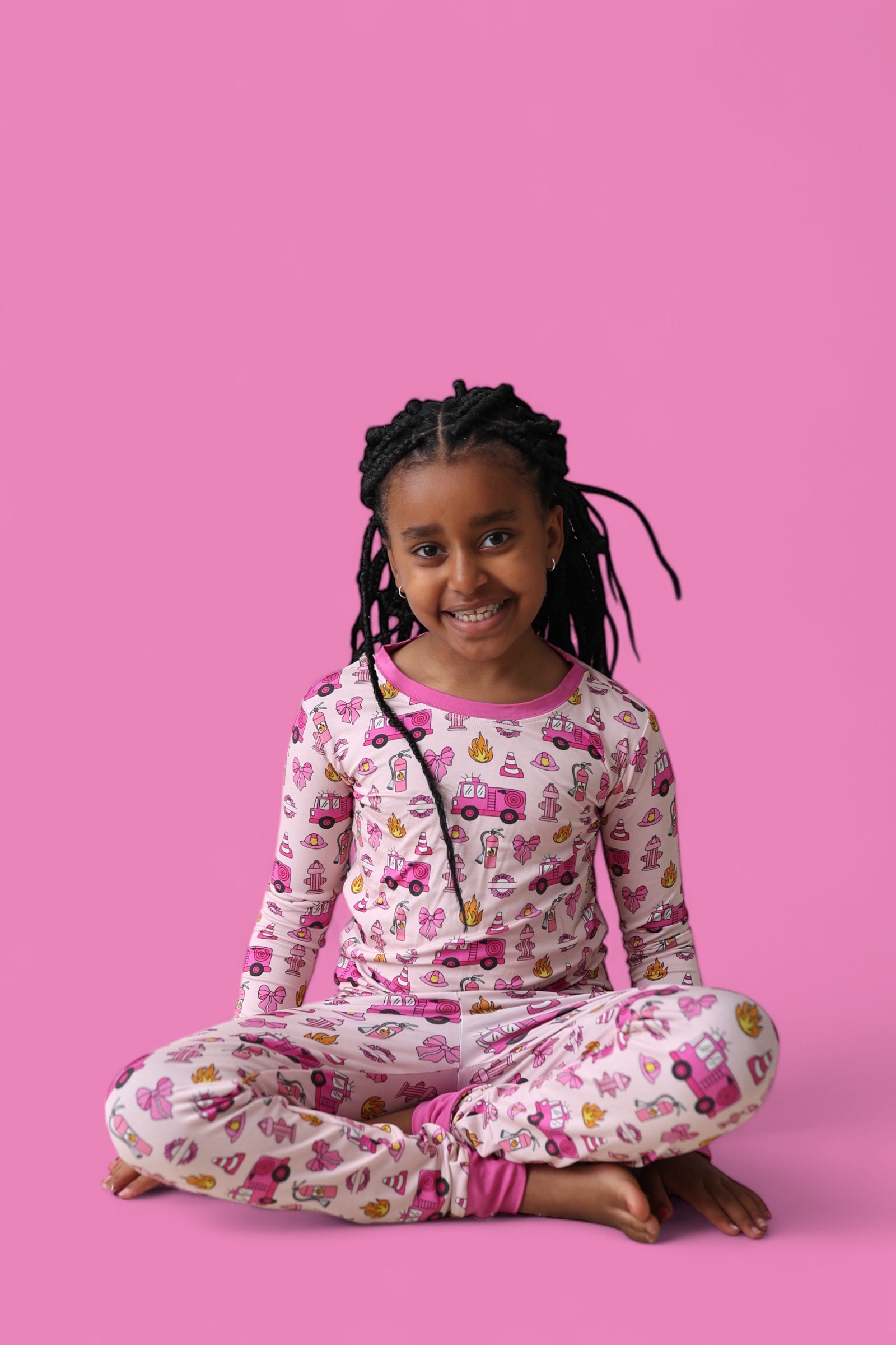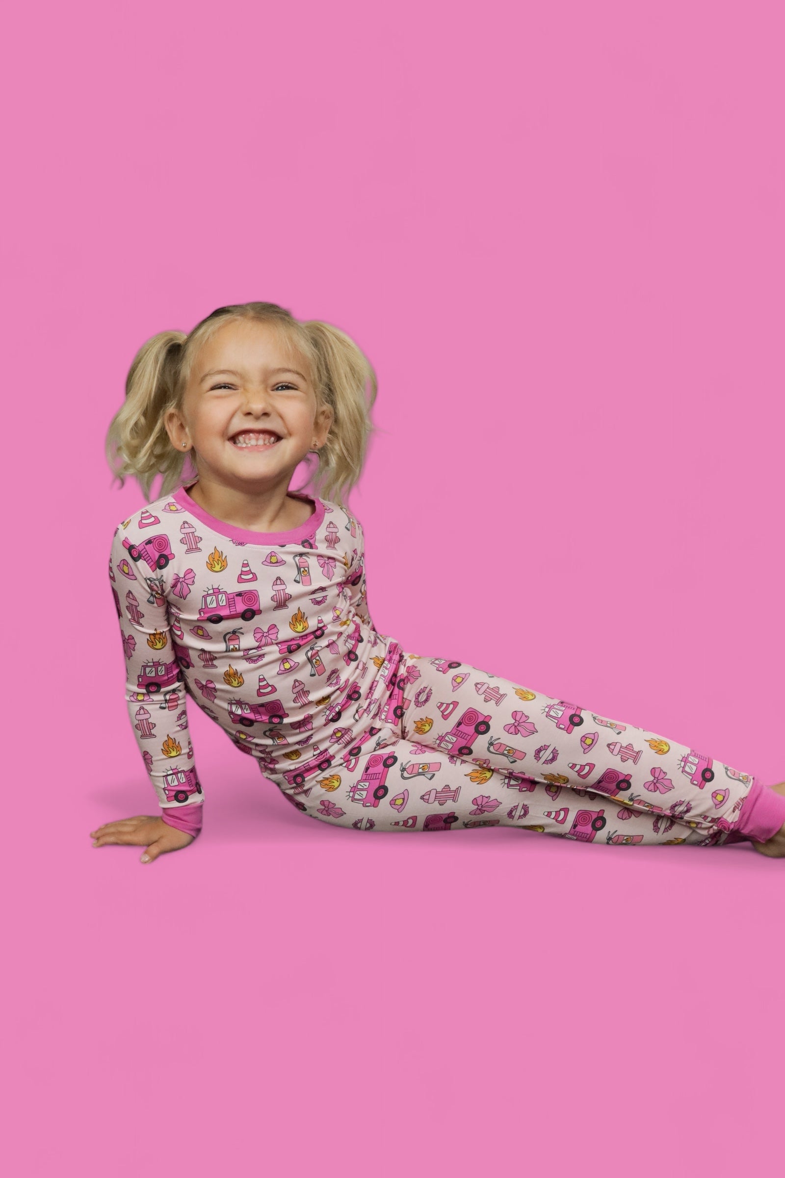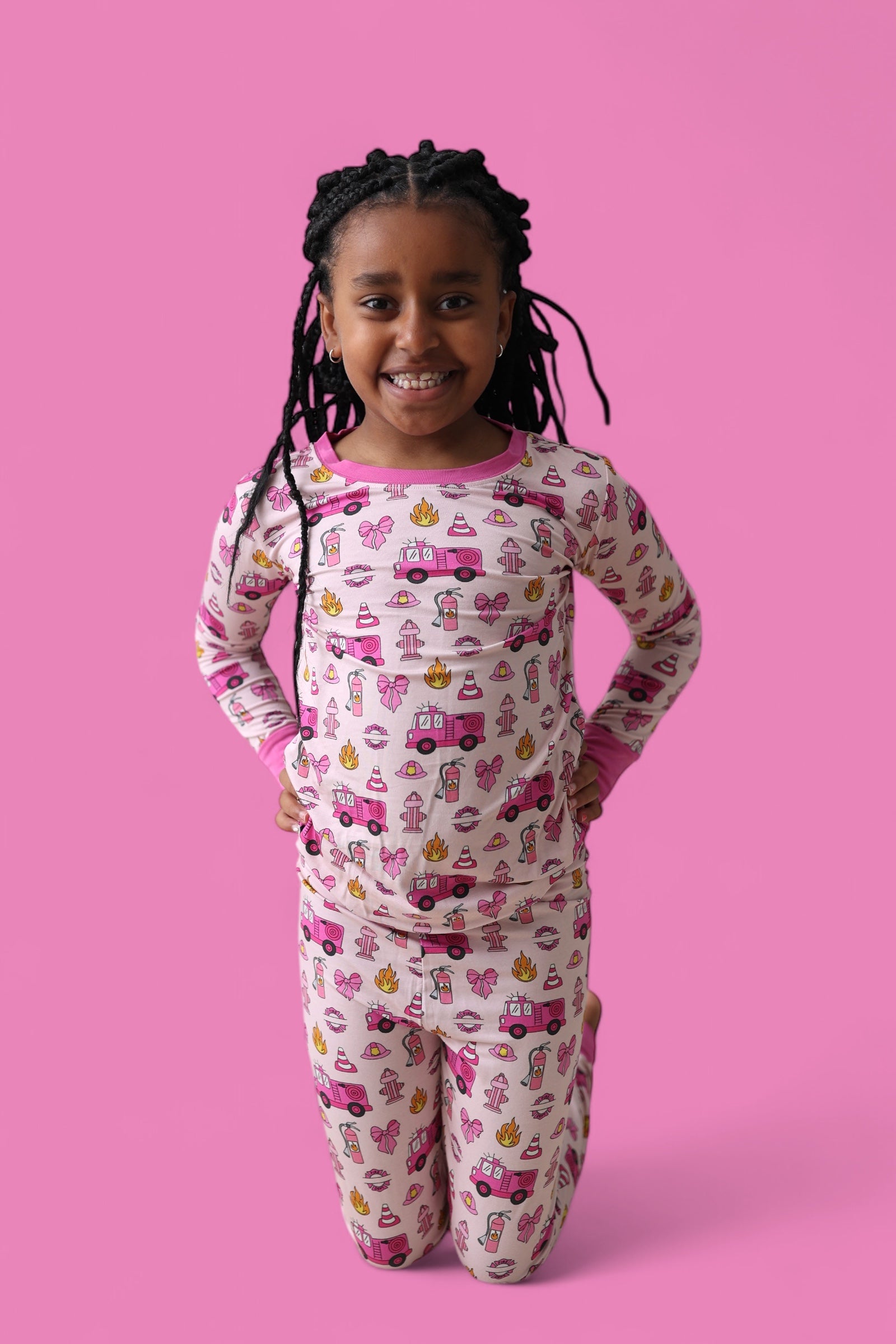 Gear up for bedtime like a true hero with our Blazing Bows and Hydrants Dream Set! This premium pajama set is inspired by the fearless world of firefighting, featuring bold pink firetrucks, hydrants, and safety gear intertwined with charming bows and playful flames. Designed for the little firefighters-in-training, this print brings an exciting, adventurous spirit to cozy sleepwear.