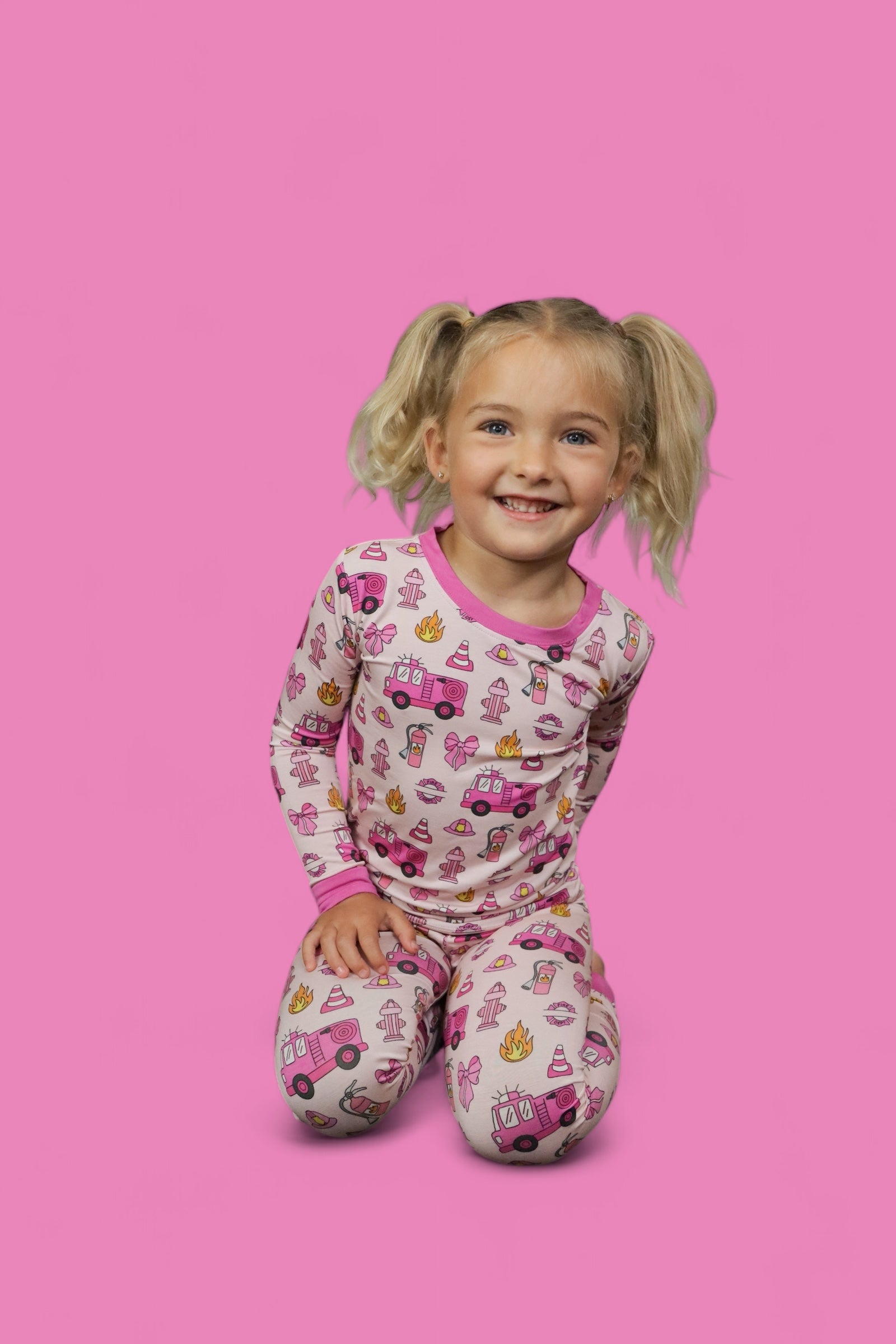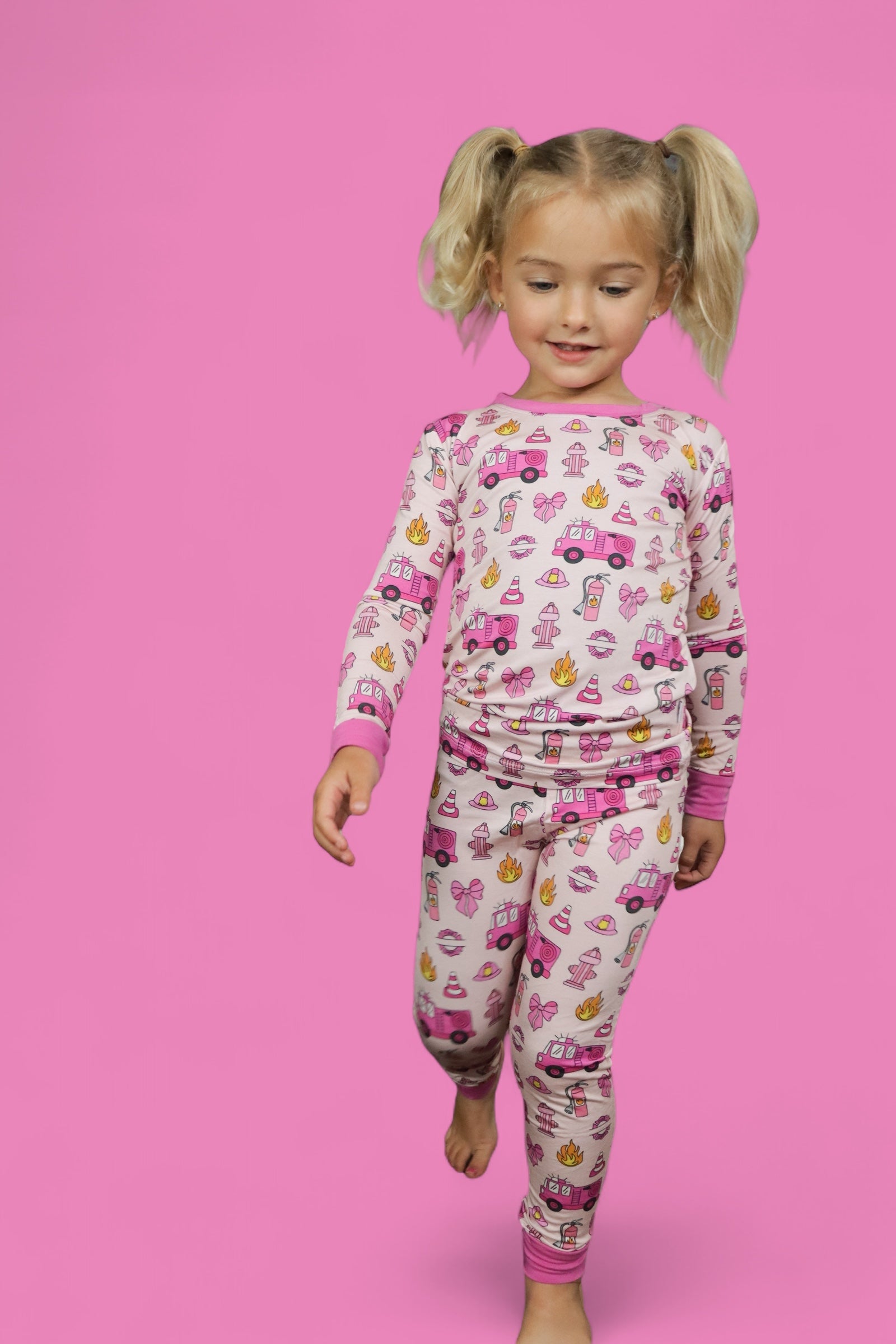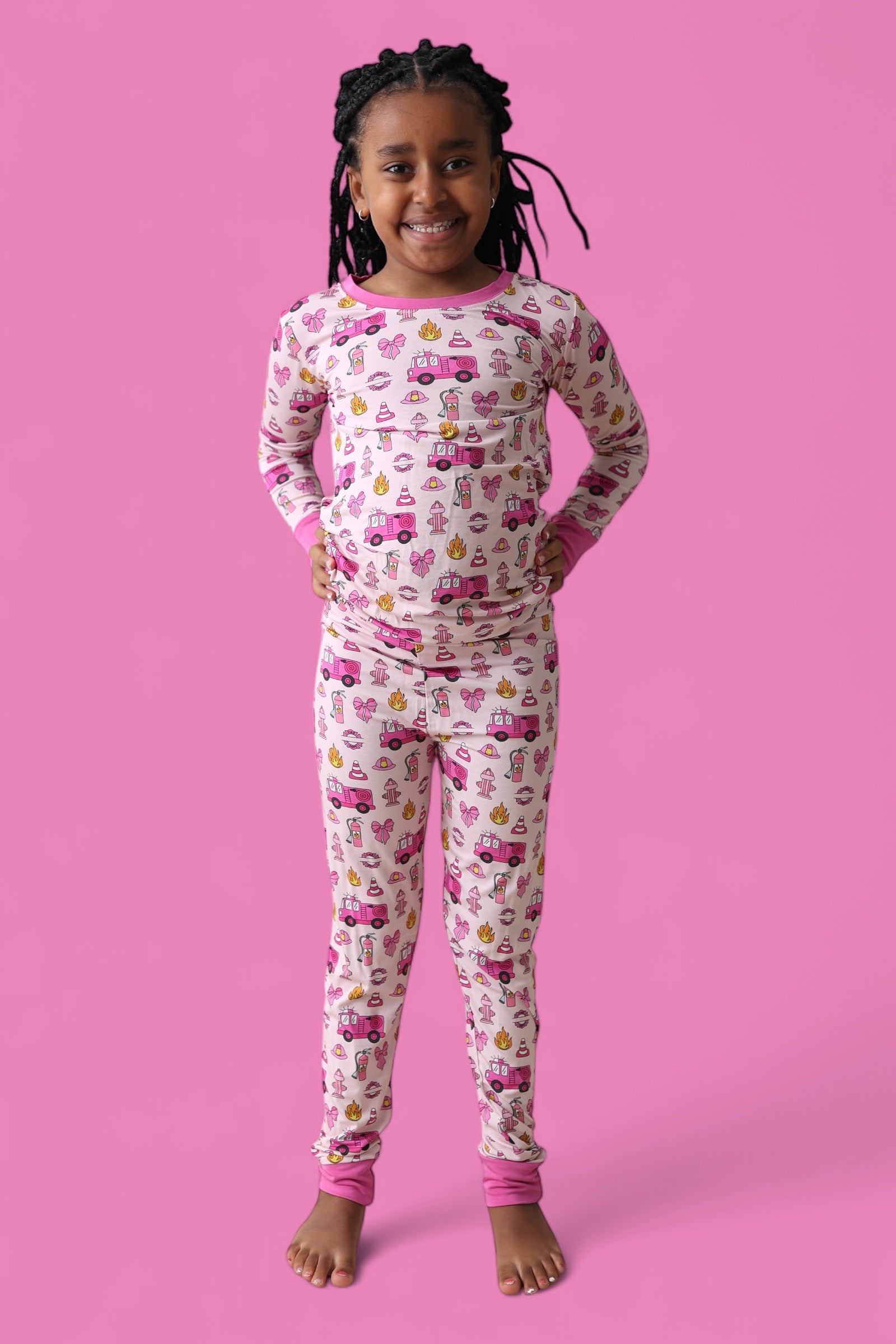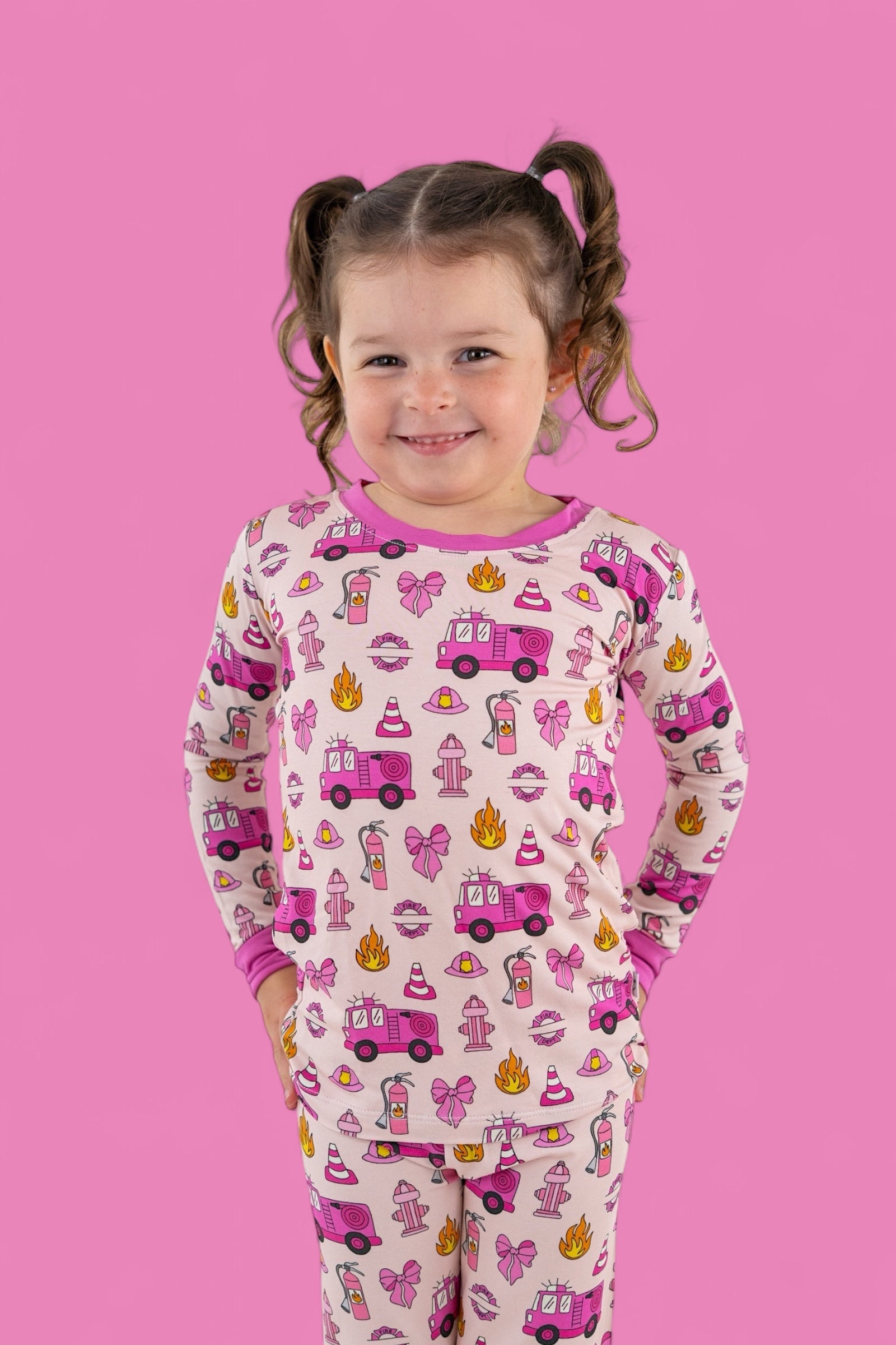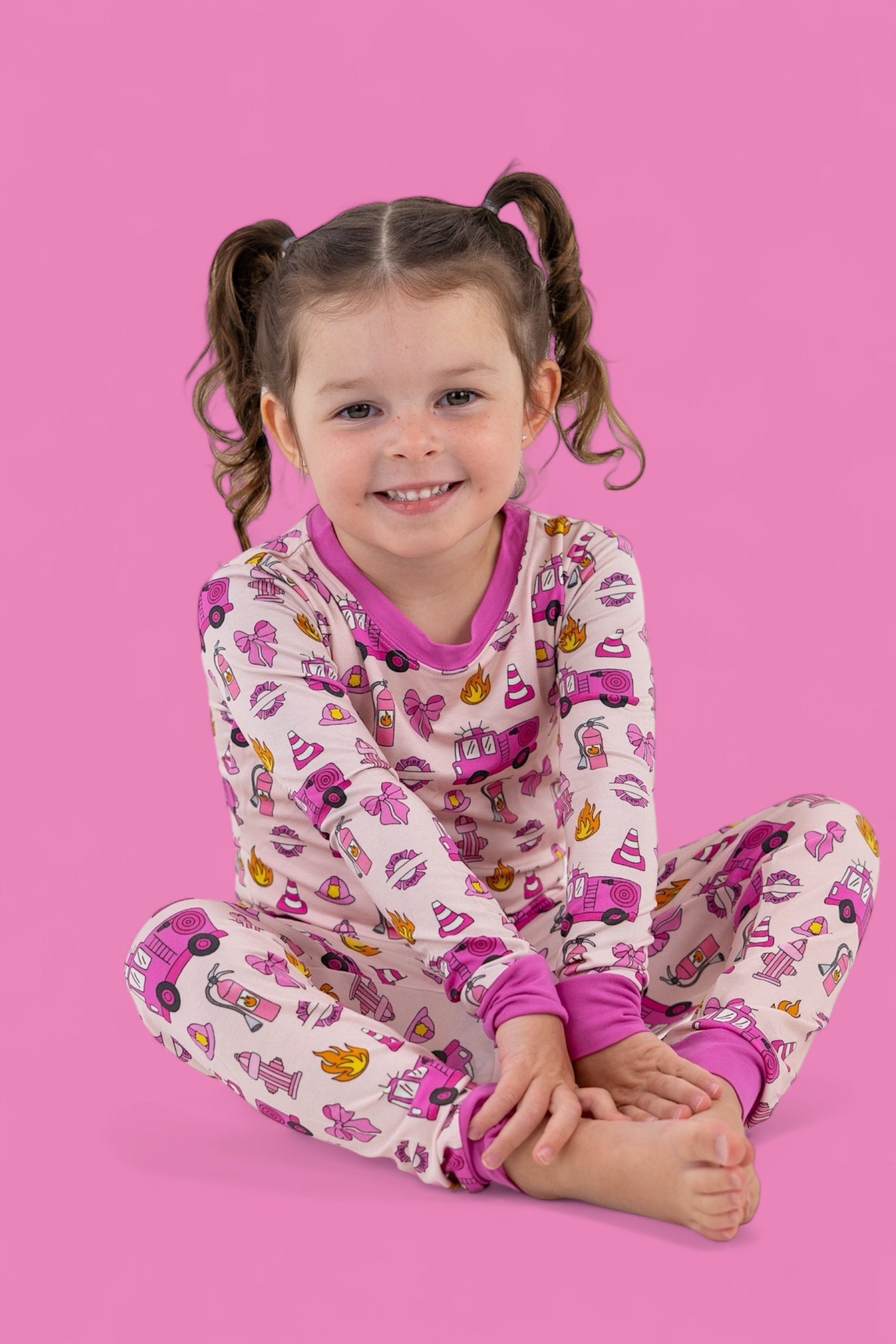 Gear up for bedtime like a true hero with our Blazing Bows and Hydrants Dream Set! This premium pajama set is inspired by the fearless world of firefighting, featuring bold pink firetrucks, hydrants, and safety gear intertwined with charming bows and playful flames. Designed for the little firefighters-in-training, this print brings an exciting, adventurous spirit to cozy sleepwear.