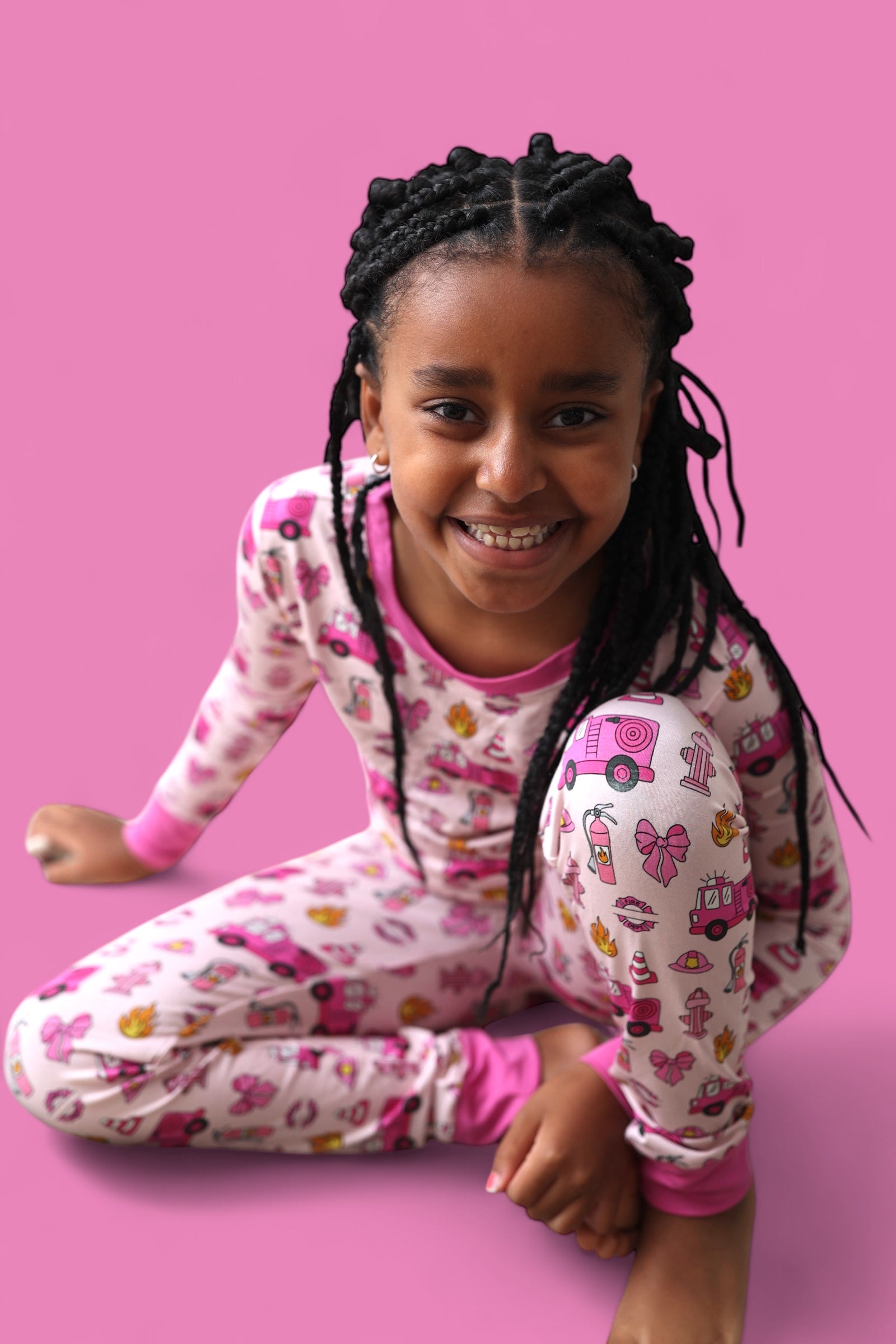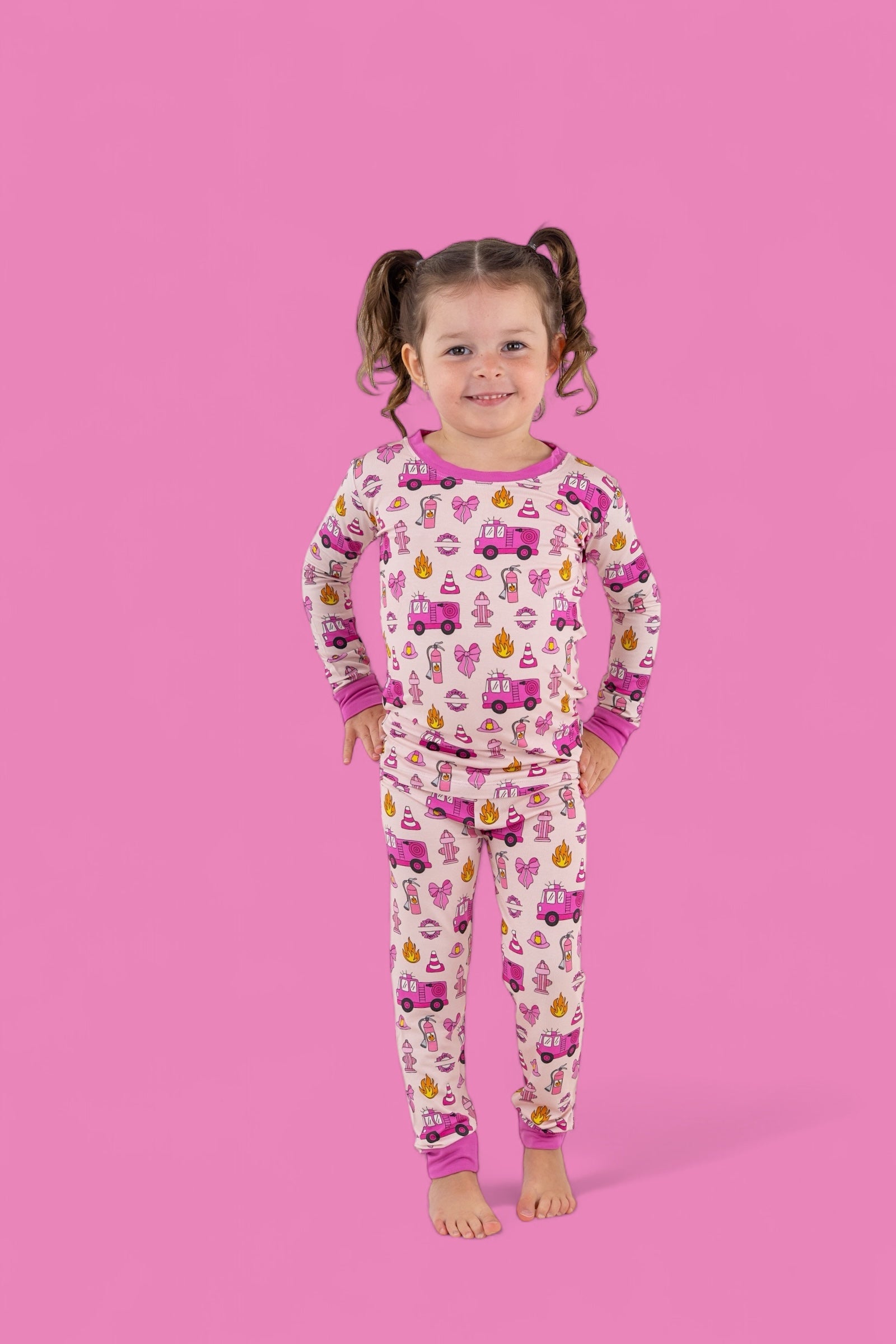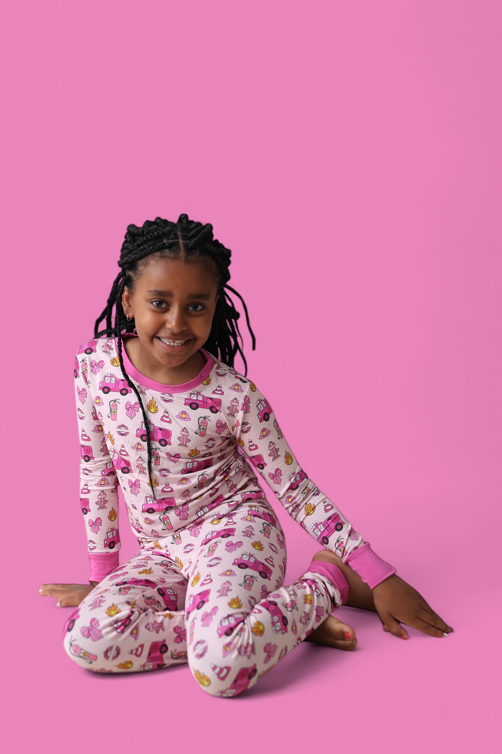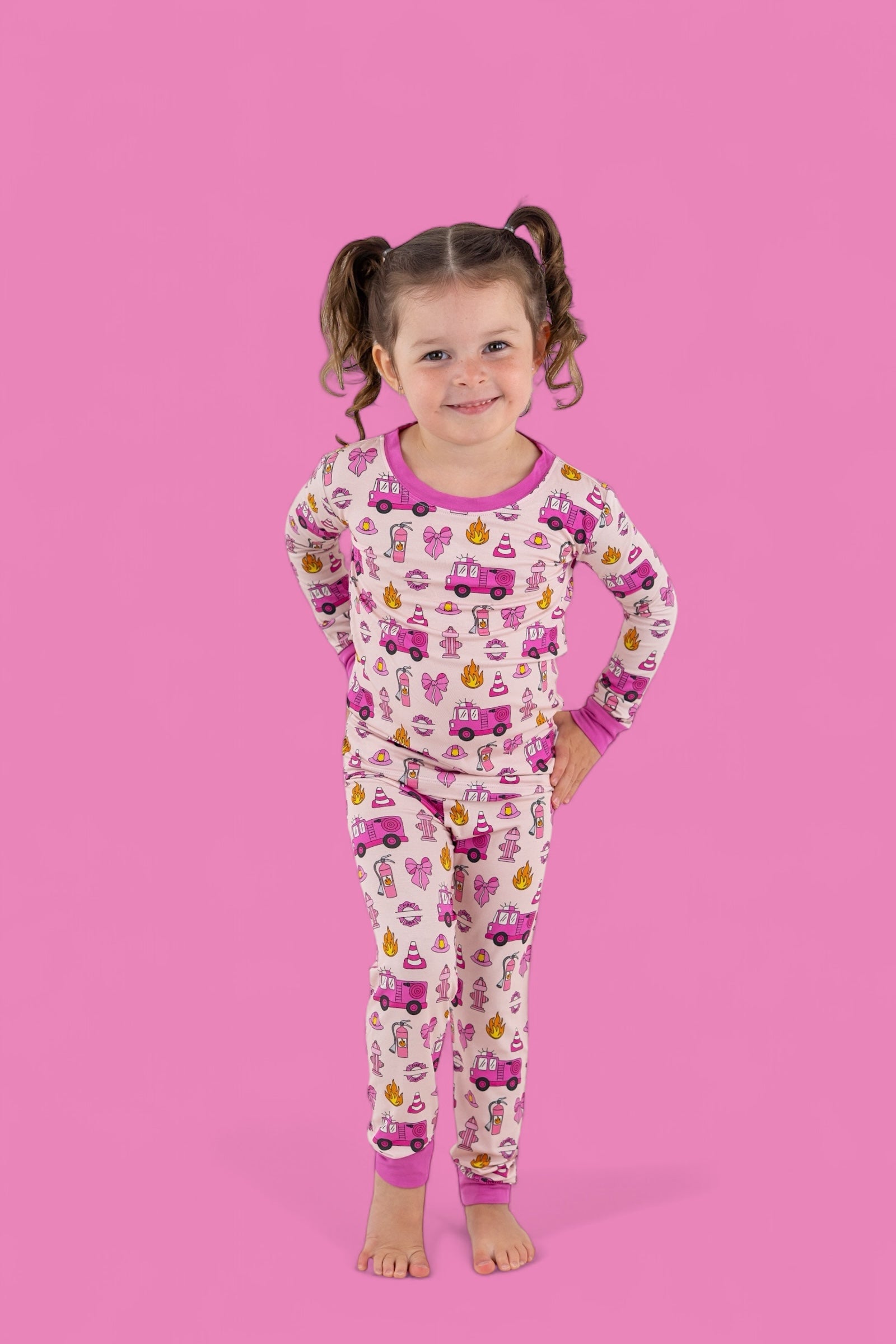 Gear up for bedtime like a true hero with our Blazing Bows and Hydrants Dream Set! This premium pajama set is inspired by the fearless world of firefighting, featuring bold pink firetrucks, hydrants, and safety gear intertwined with charming bows and playful flames. Designed for the little firefighters-in-training, this print brings an exciting, adventurous spirit to cozy sleepwear.