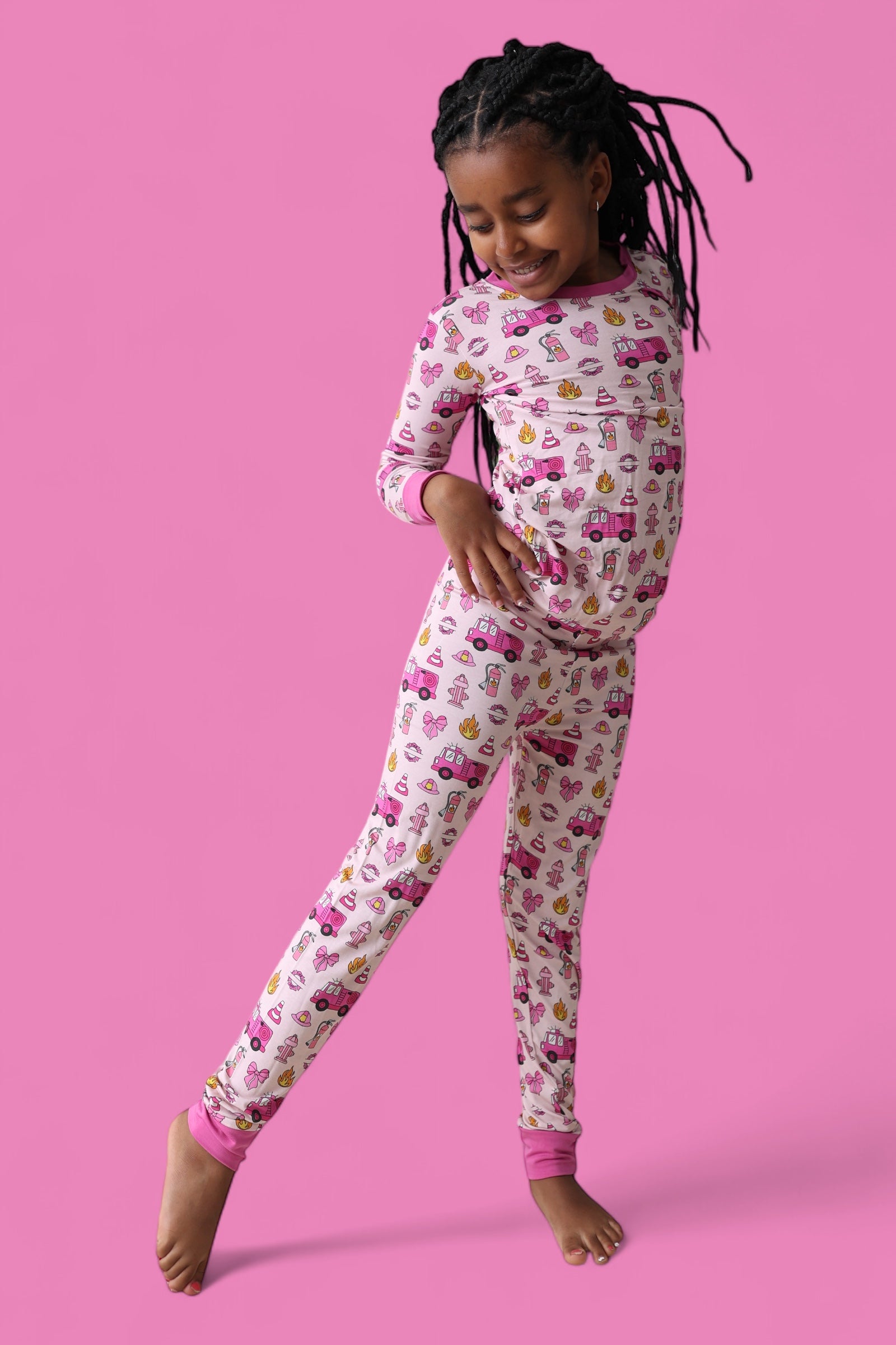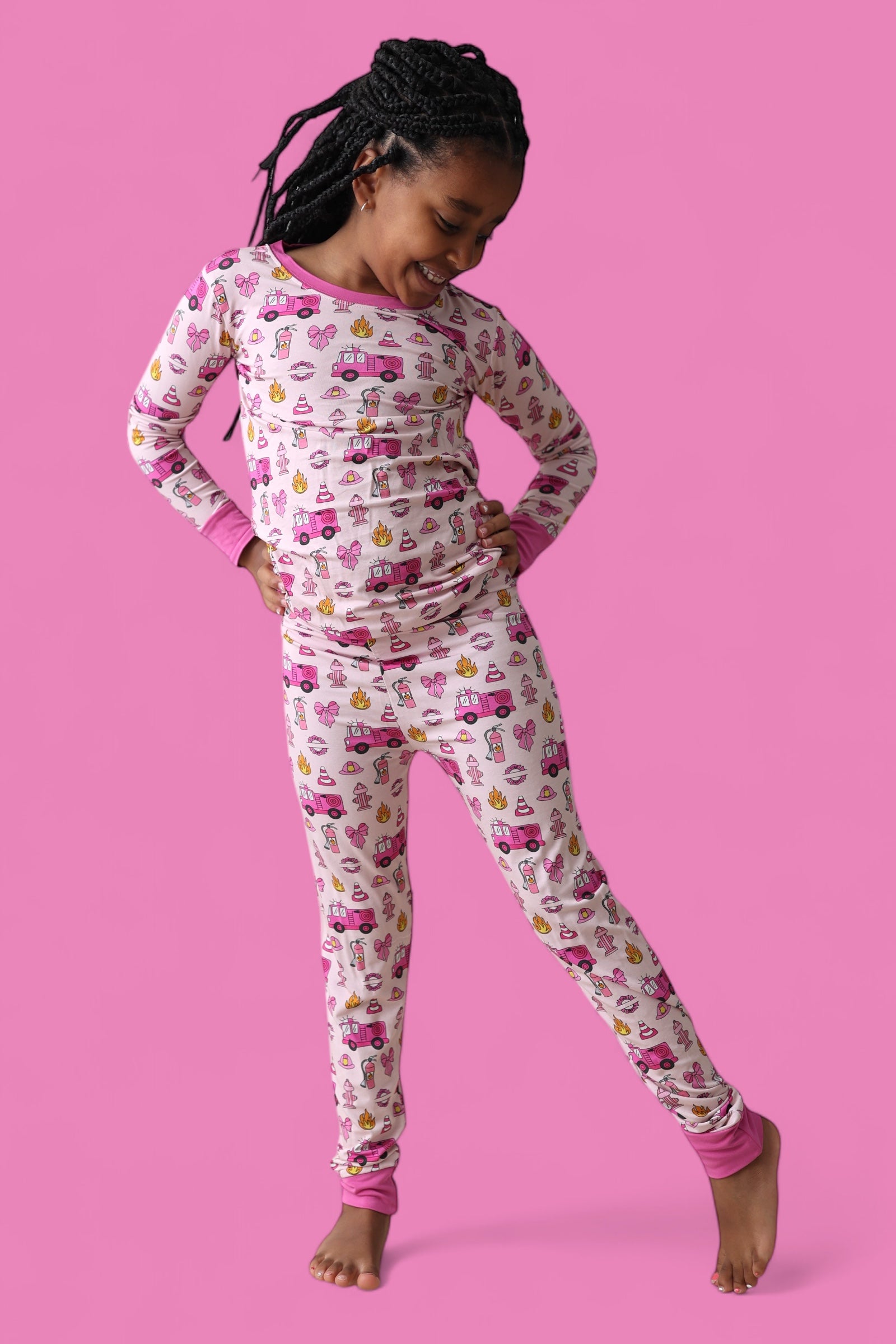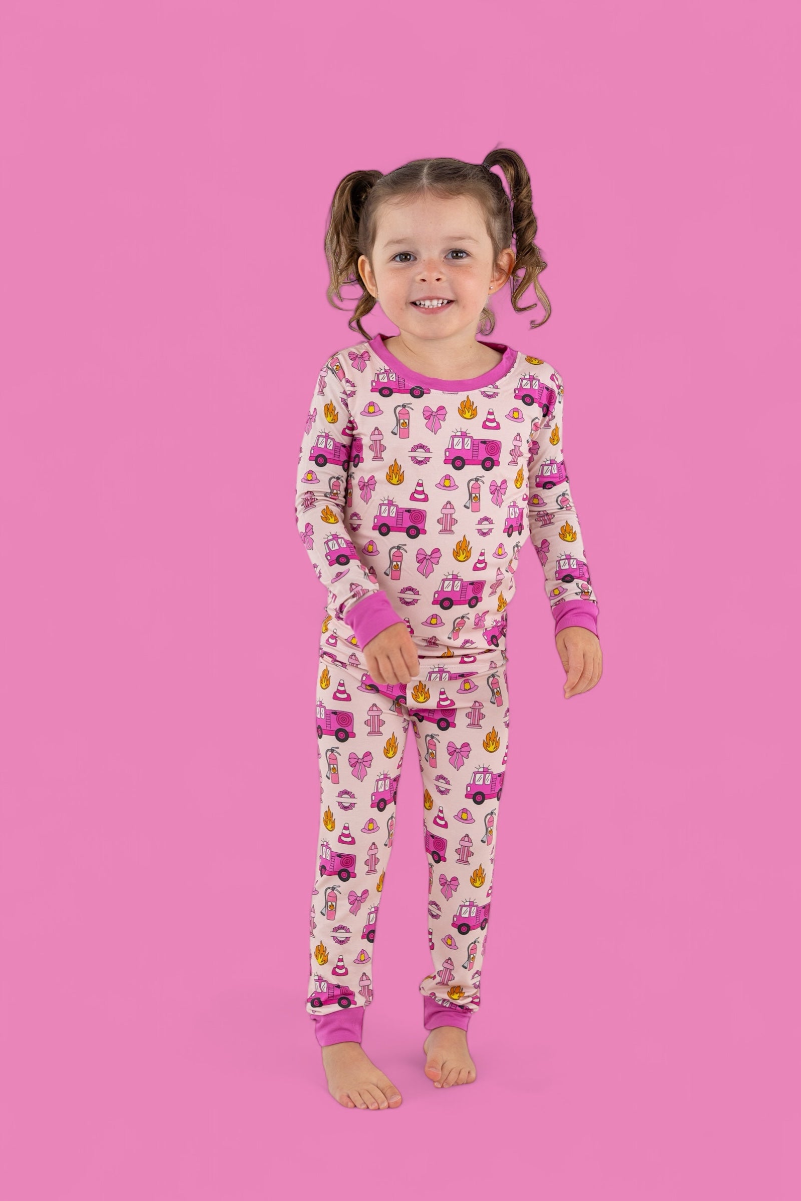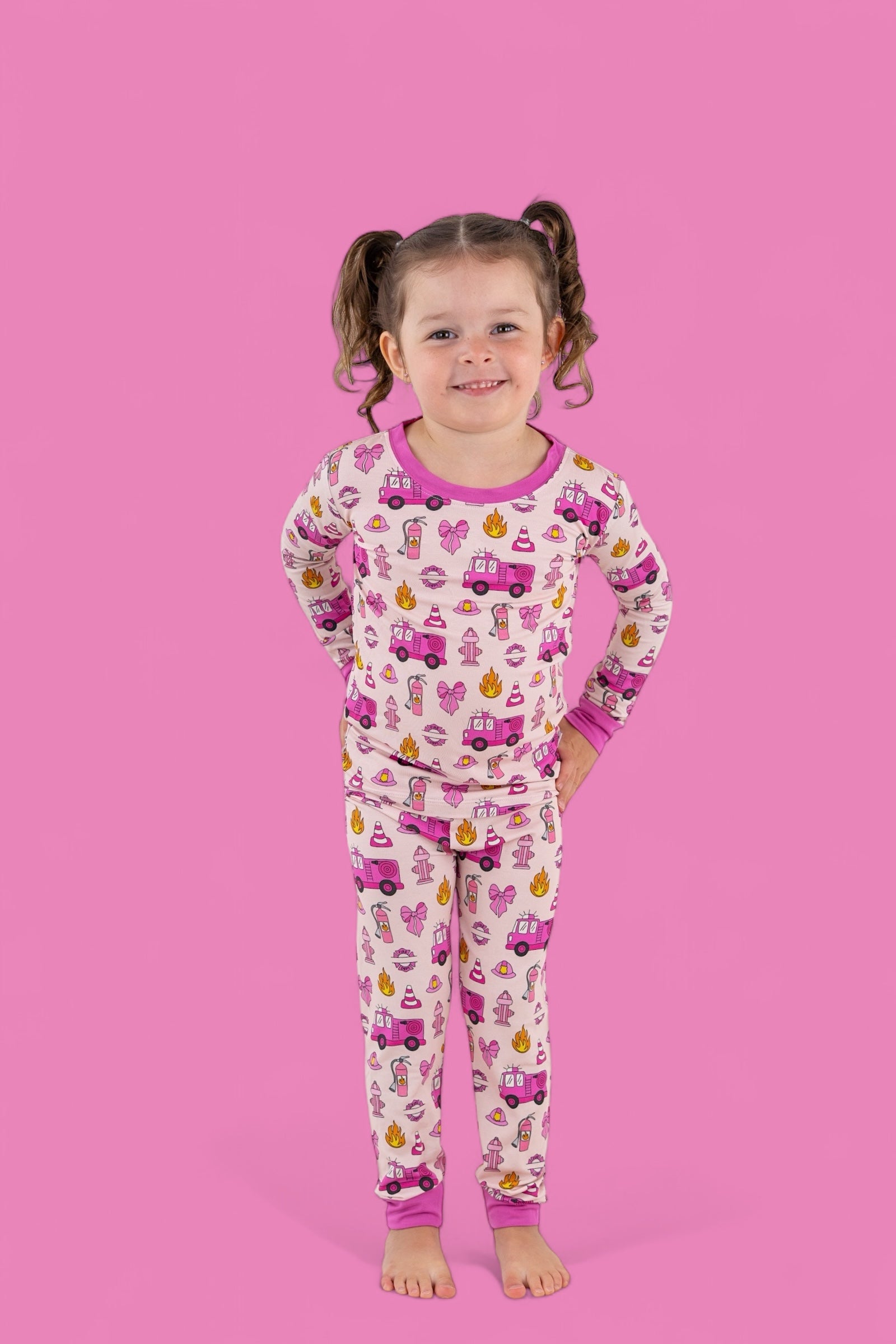 Gear up for bedtime like a true hero with our Blazing Bows and Hydrants Dream Set! This premium pajama set is inspired by the fearless world of firefighting, featuring bold pink firetrucks, hydrants, and safety gear intertwined with charming bows and playful flames. Designed for the little firefighters-in-training, this print brings an exciting, adventurous spirit to cozy sleepwear.