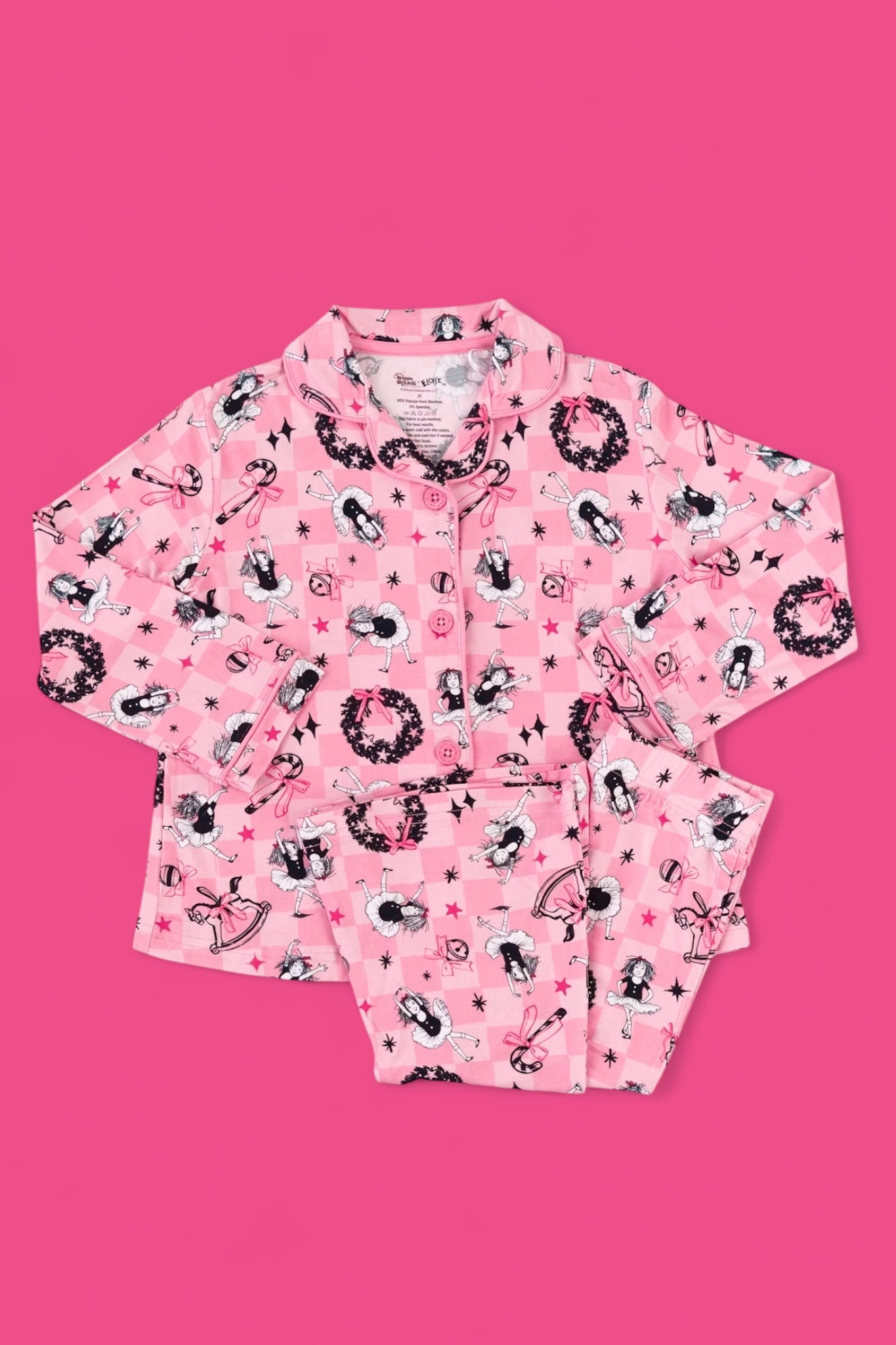 She’ll be pirouetting through the season in the Eloise Holiday Ballet Dream Girl’s Flare Set! Featuring the iconic Eloise in her ballet best, twirling across a pink checkerboard background sprinkled with festive wreaths, stars, bows, and ornaments—this buttery-soft set is made for magical moments. With a comfy long sleeve top and flowy flare pants, it’s the perfect combo of cozy and glam.