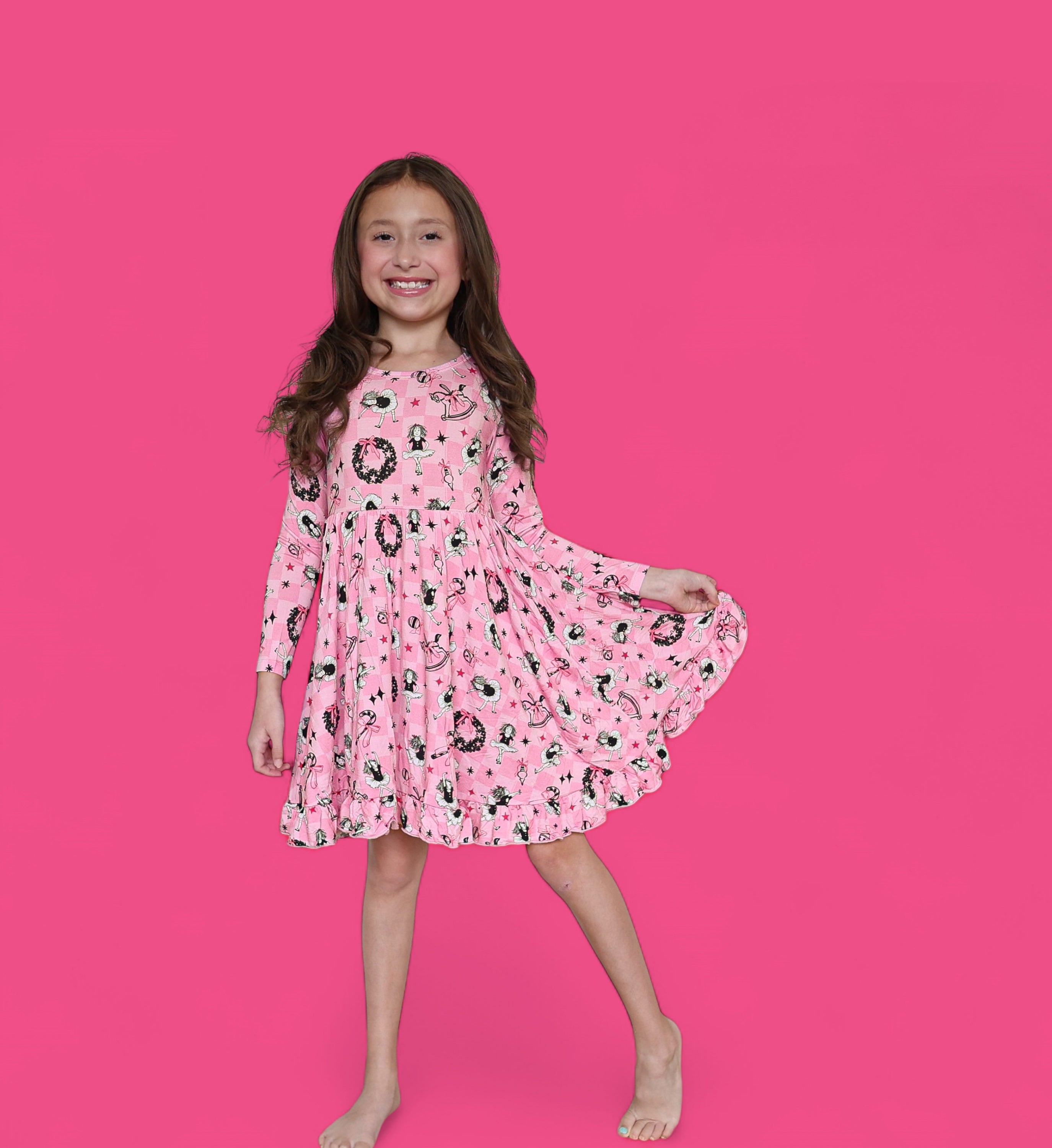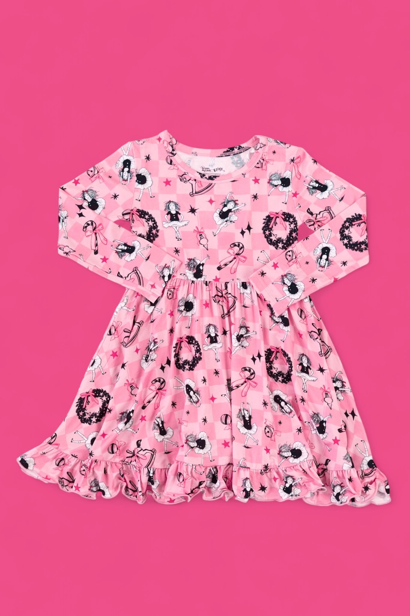 Let her twirl into the magic of the season with the Eloise Holiday Ballet Dream Ruffle Night Dress! Featuring our favorite Plaza darling, Eloise, dancing across a pink checkerboard backdrop with festive wreaths, ornaments, bows, and stars— made from our signature buttery-soft fabric and finished with sweet ruffle details. It's holiday-ready, photo-perfect, and full of Eloise charm!