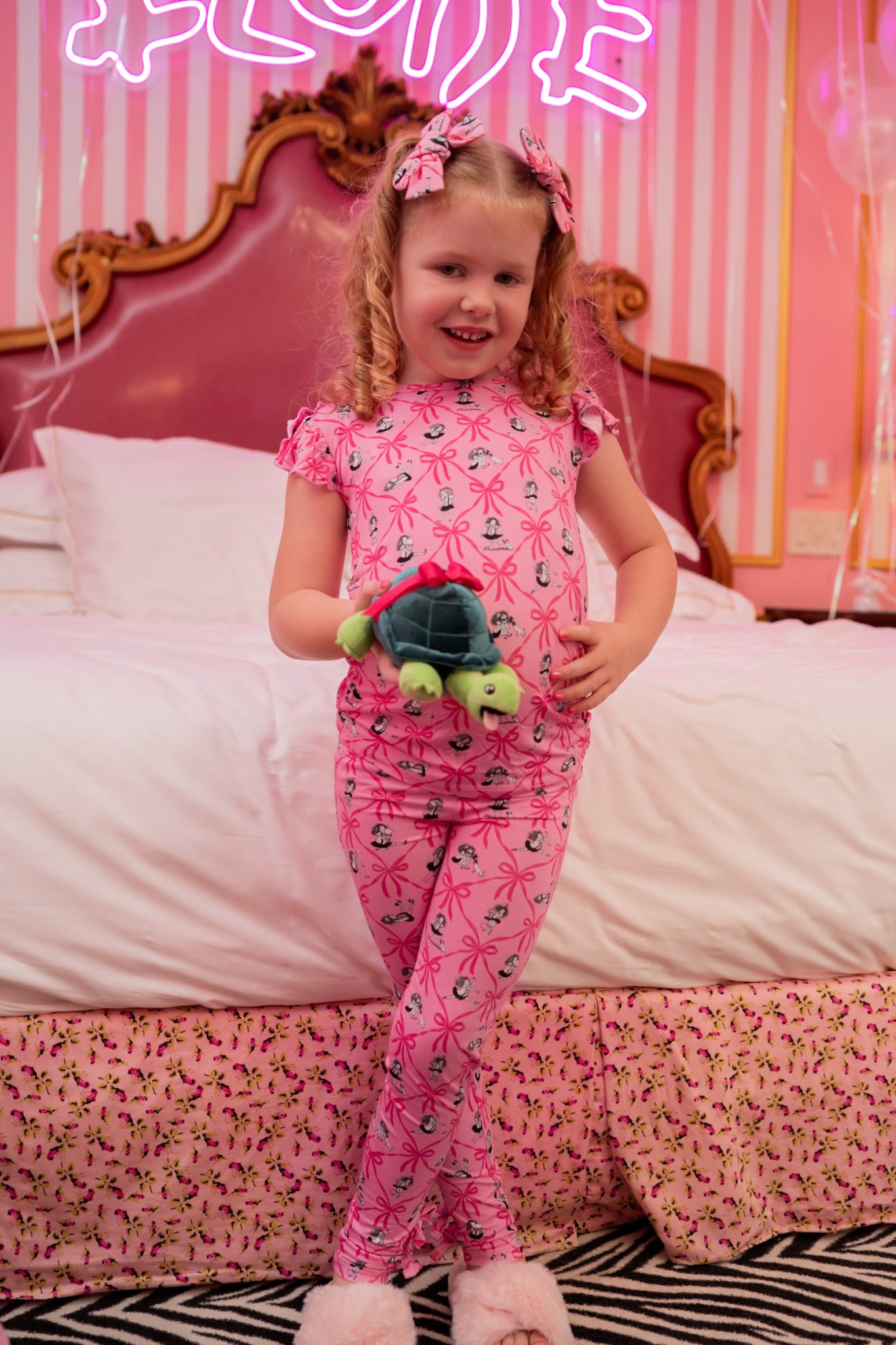 Add a little Plaza flair to her bedtime look with the Eloise Royal Ribbons Dream Sleep Pants! Featuring iconic Eloise illustrations surrounded by oversized pink bows, these buttery-soft leggings are finished with the sweetest bow accents at the ankles.