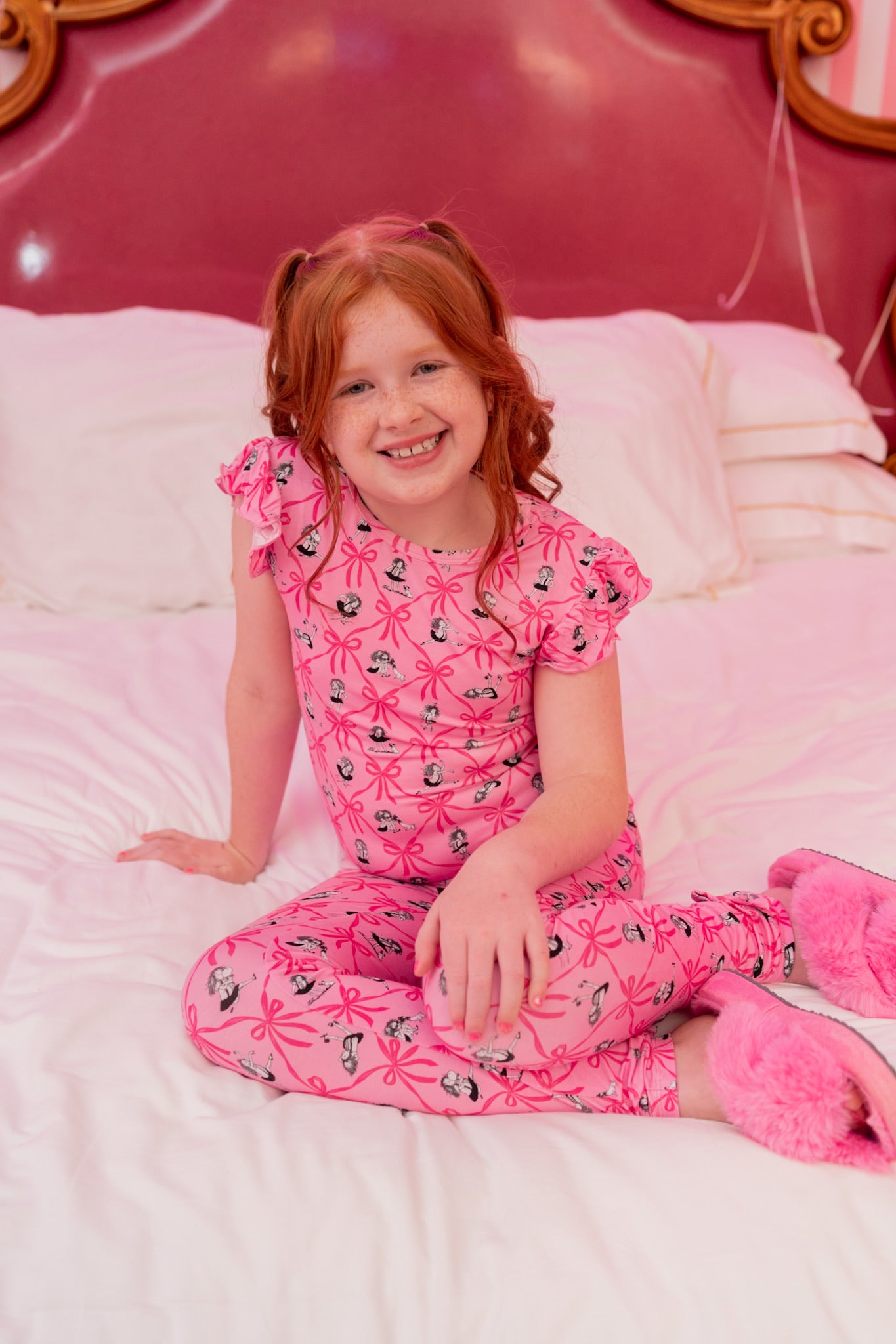 Bring a dash of Plaza charm to your little one’s wardrobe with the Eloise Royal Ribbons Dream Sleep Tee! Featuring playful poses of the iconic Eloise surrounded by oversized pink bows, this top is made from our signature buttery-soft fabric with darling cap sleeves for a feminine touch.