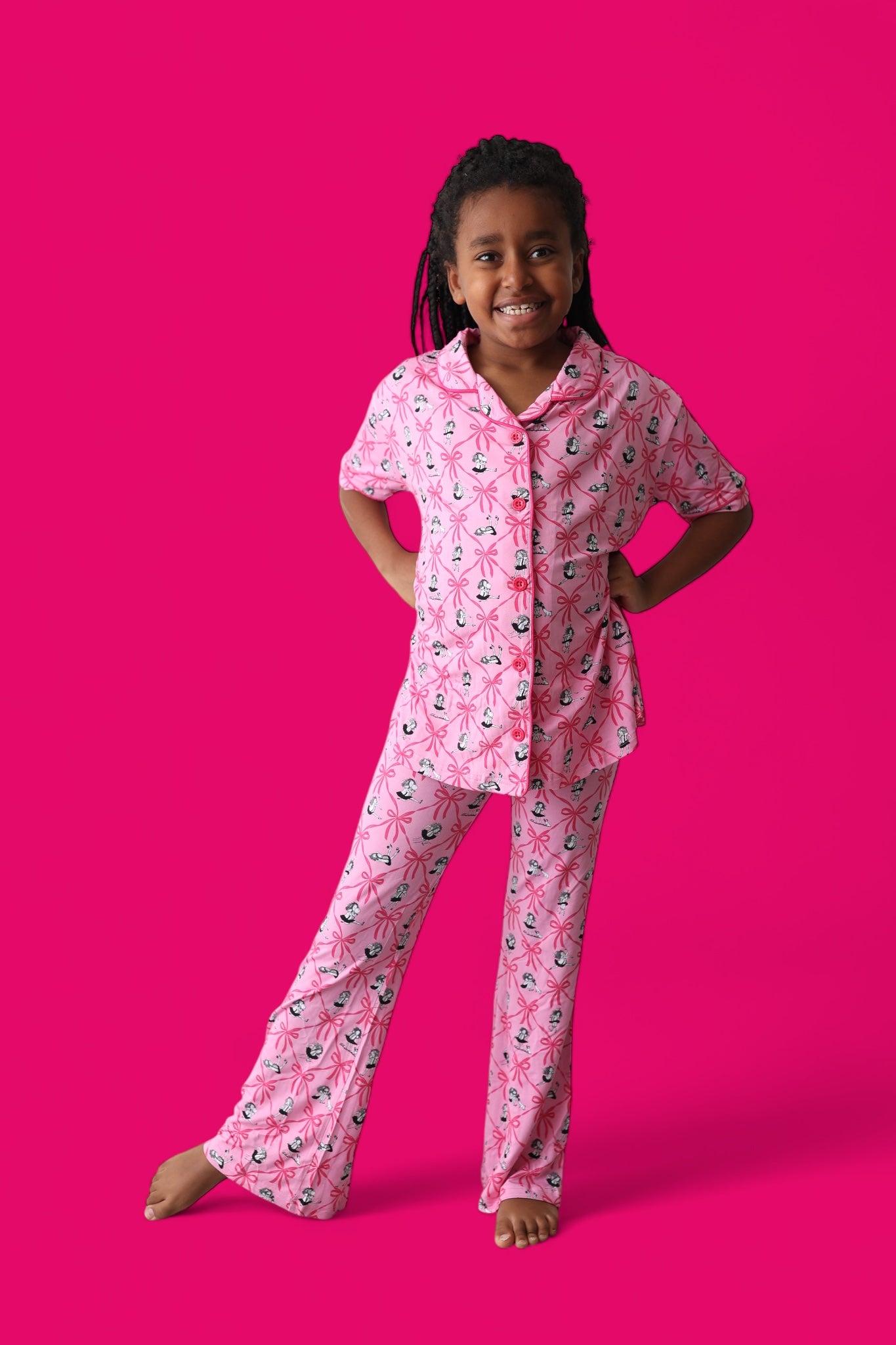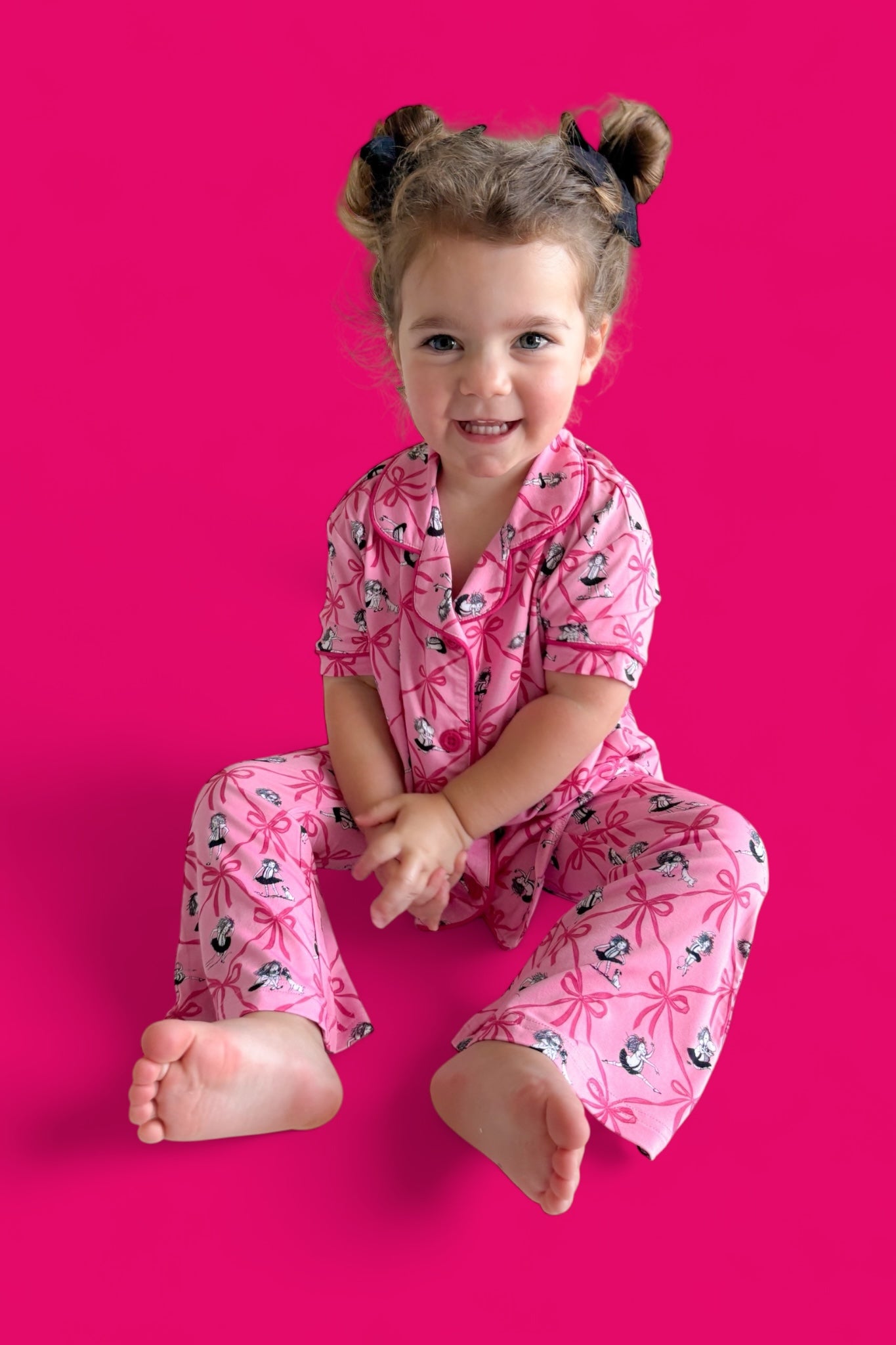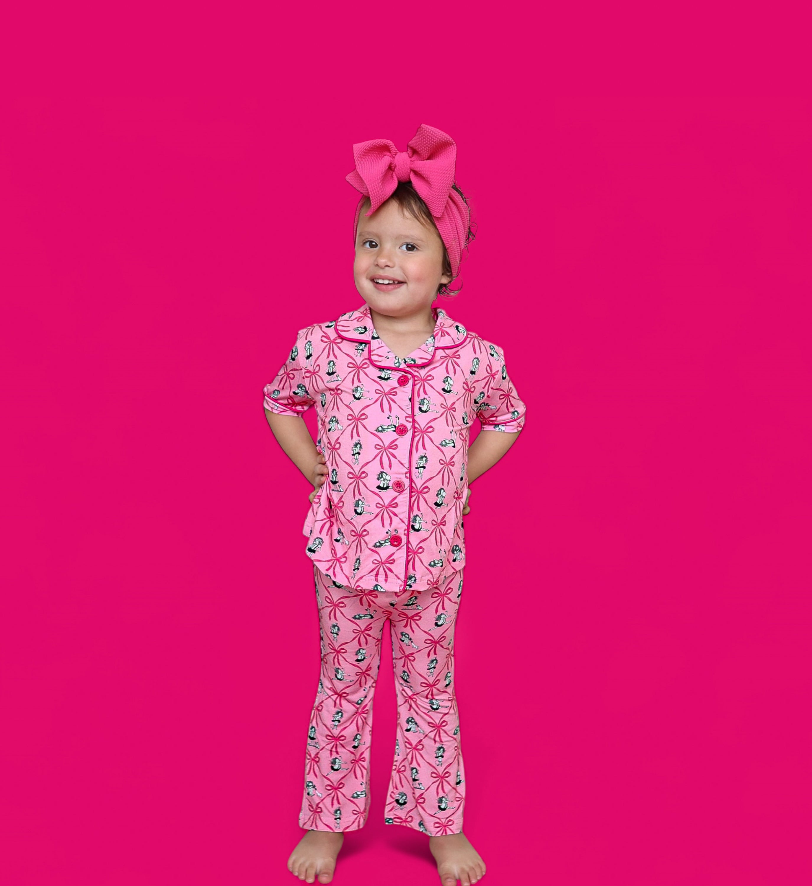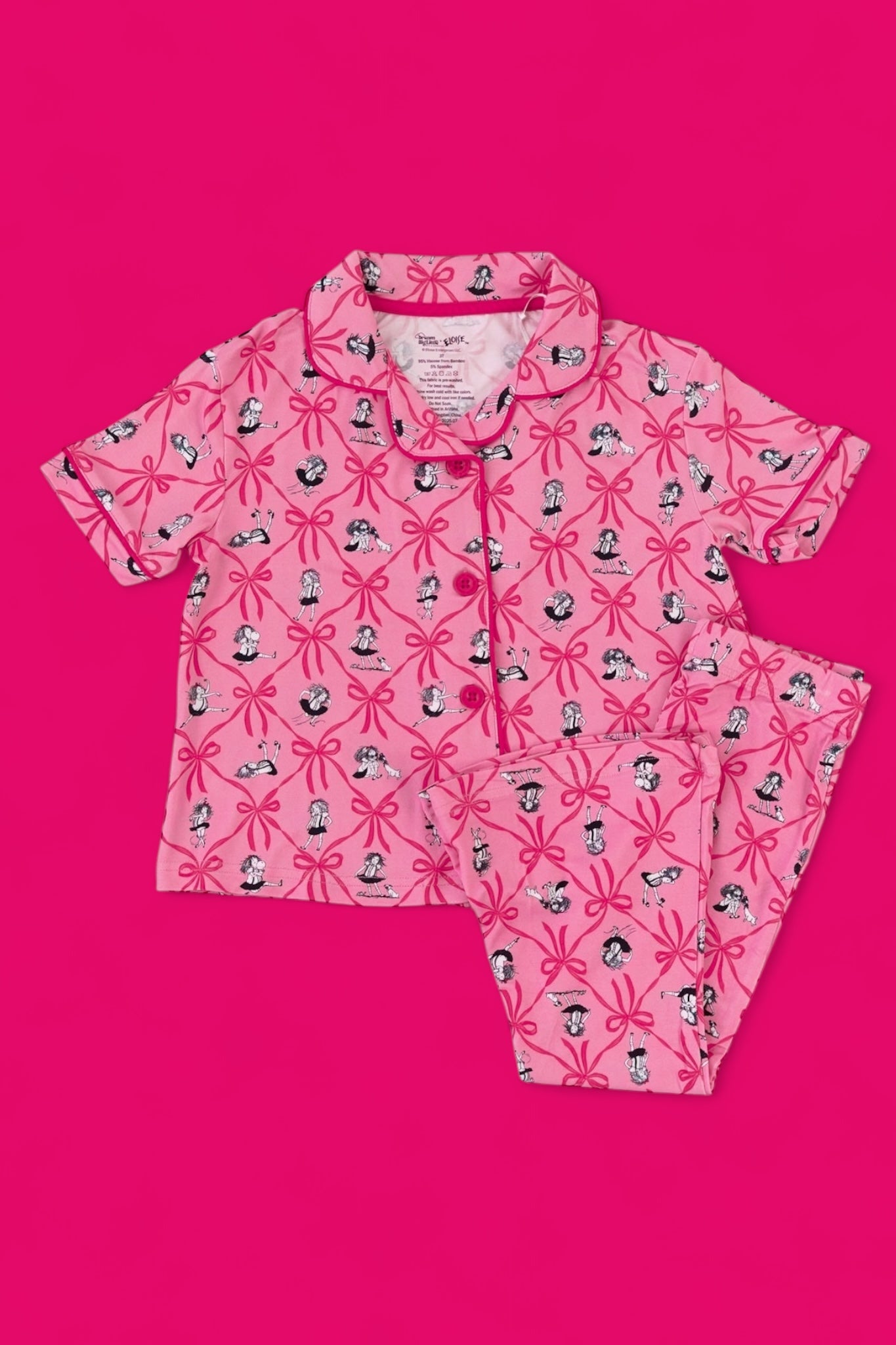 Slumber parties with friends or lounging in style—she’ll be ready for it all in the Eloise Royal Ribbons Dream Girl’s Flare Set! Featuring the ever-iconic Eloise surrounded by oversized hot pink bows on a pretty pink backdrop, this two-piece set is made from our signature buttery-soft fabric with flowy flare pants and a comfy short sleeve top. It's playful, posh, and perfect for your little fashionista.