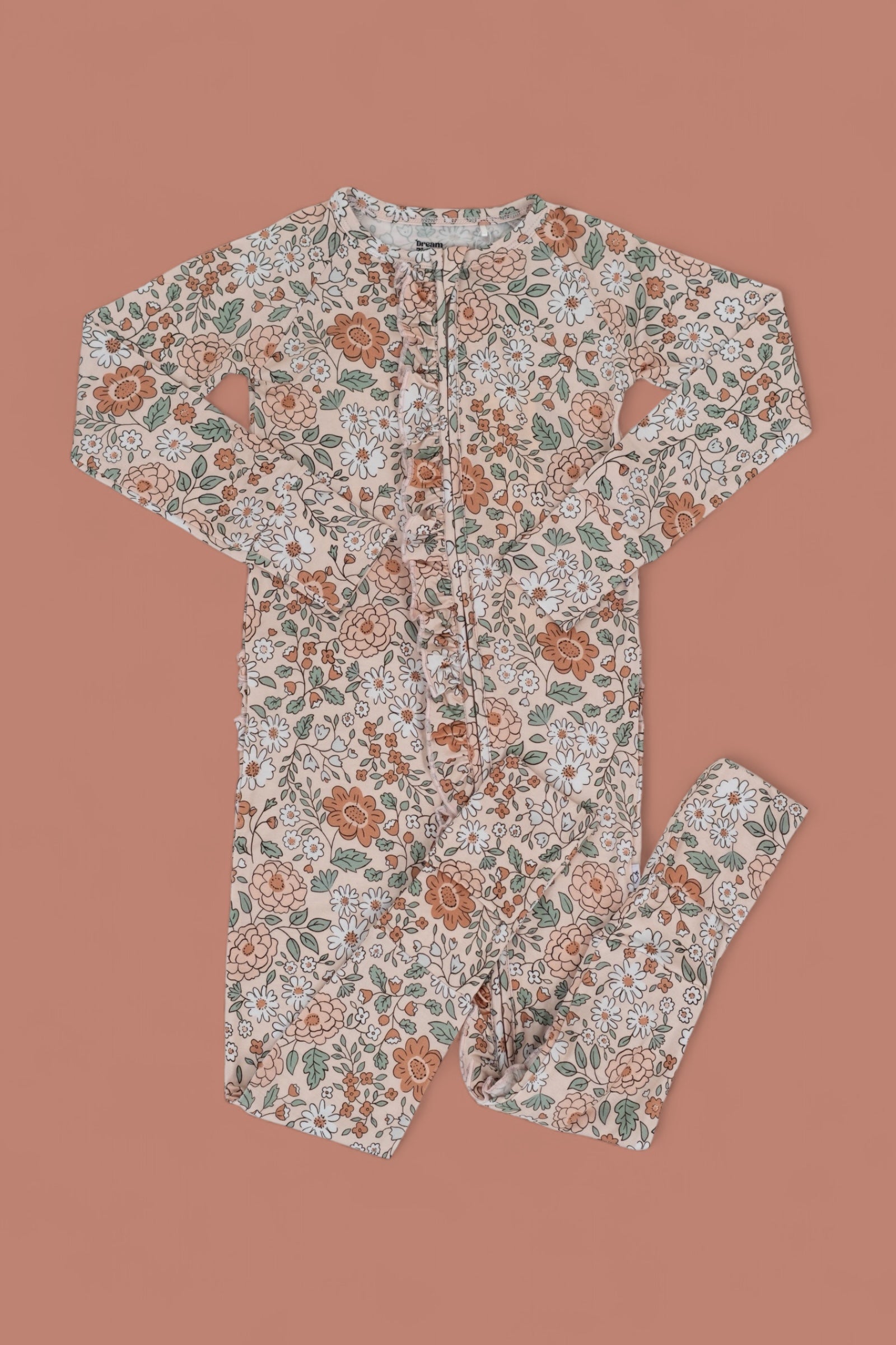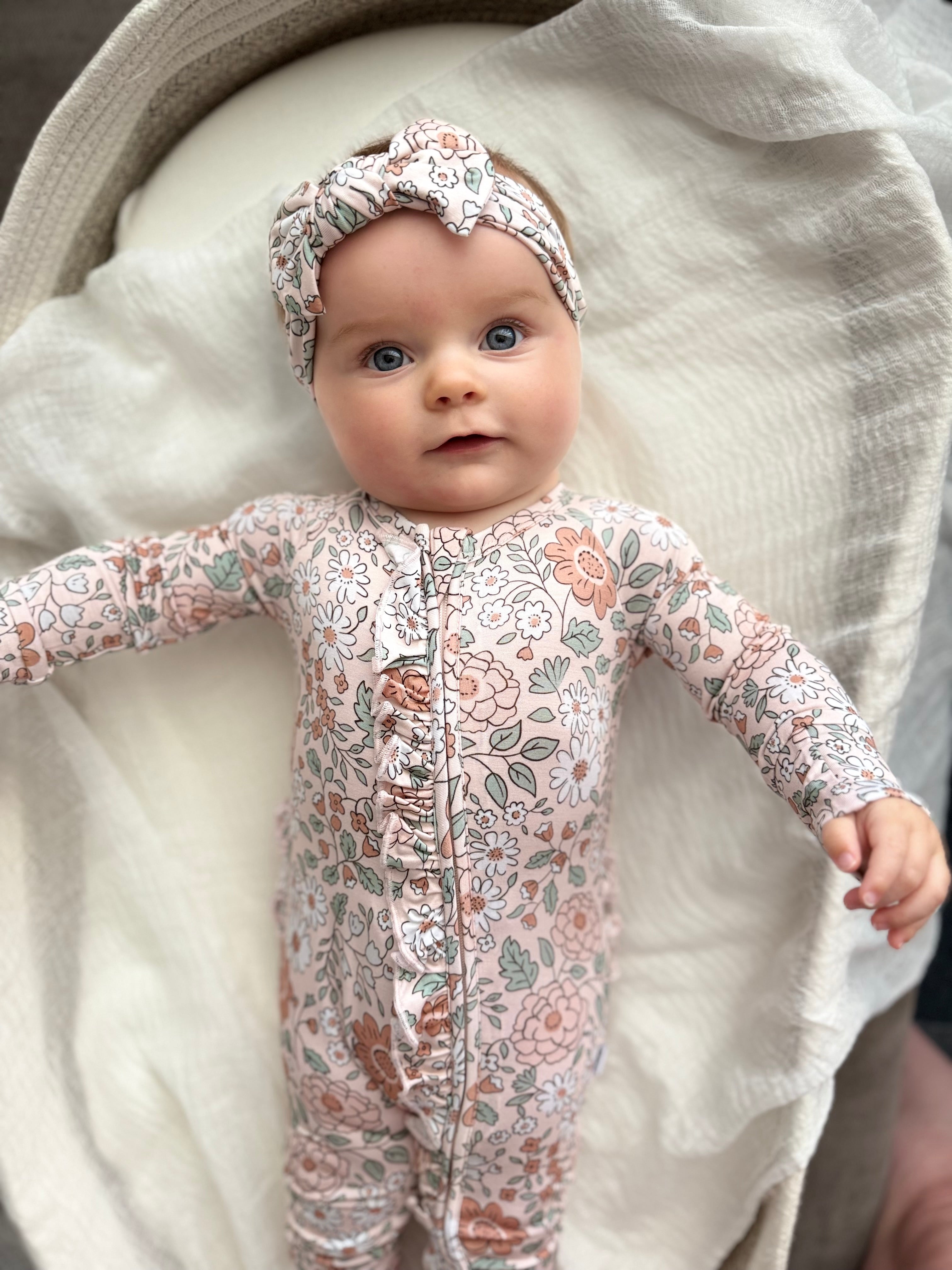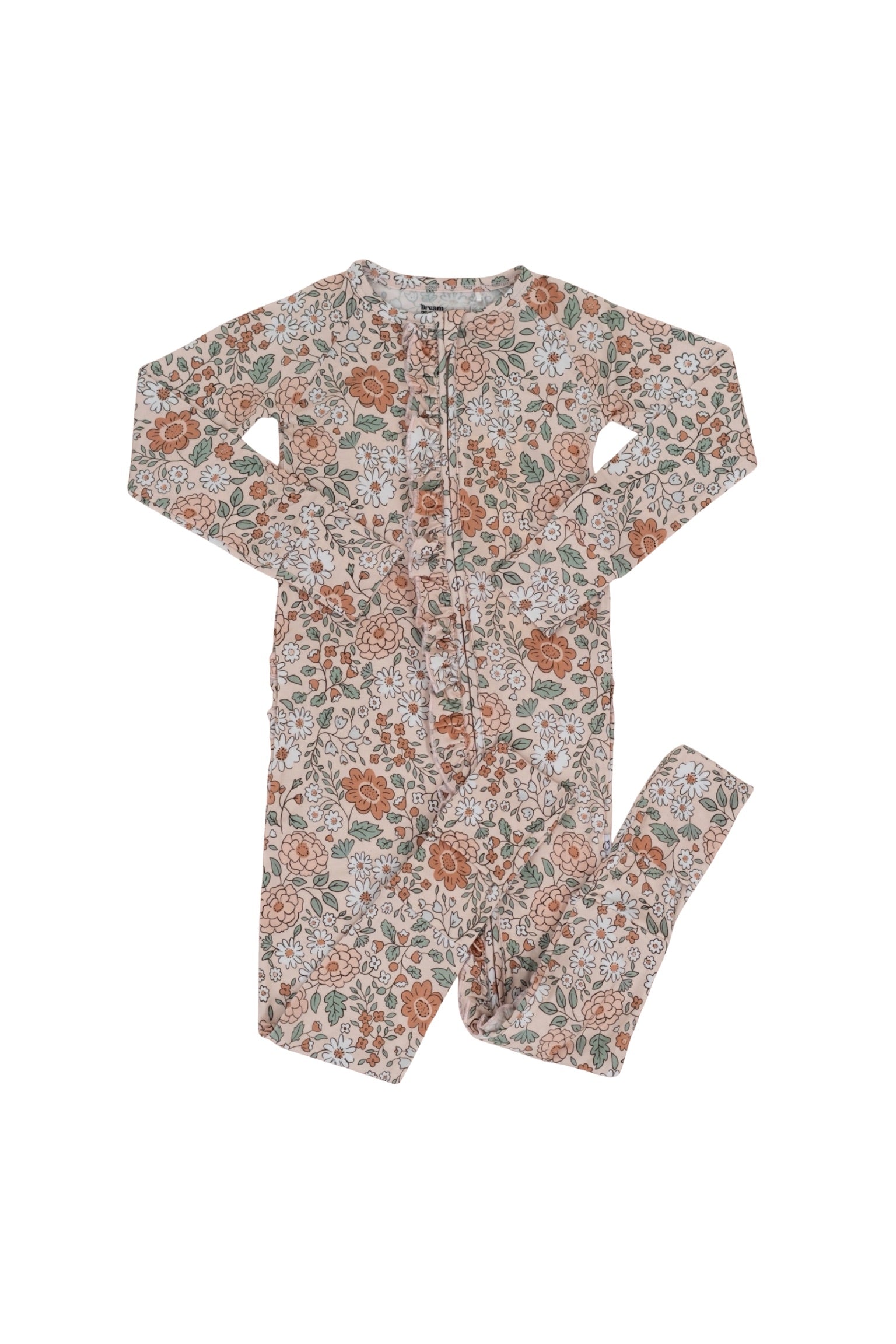 Your little one will be cozy as can be in the Autumn Blossom Dream Ruffle Romper! Featuring a vintage-inspired floral print and delicate ruffle details, this one-piece is made from buttery-soft fabric that’s perfect for play, naps, and everything in between. With built-in mittens, footies, and a double zipper for easy changes, it’s as practical as it is precious.
