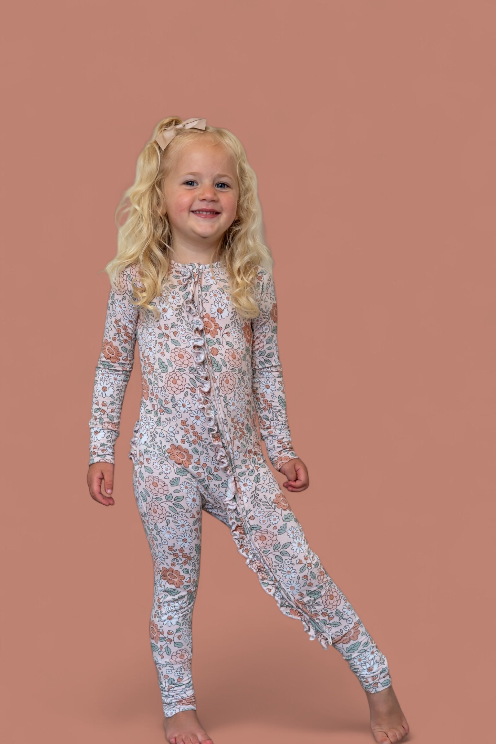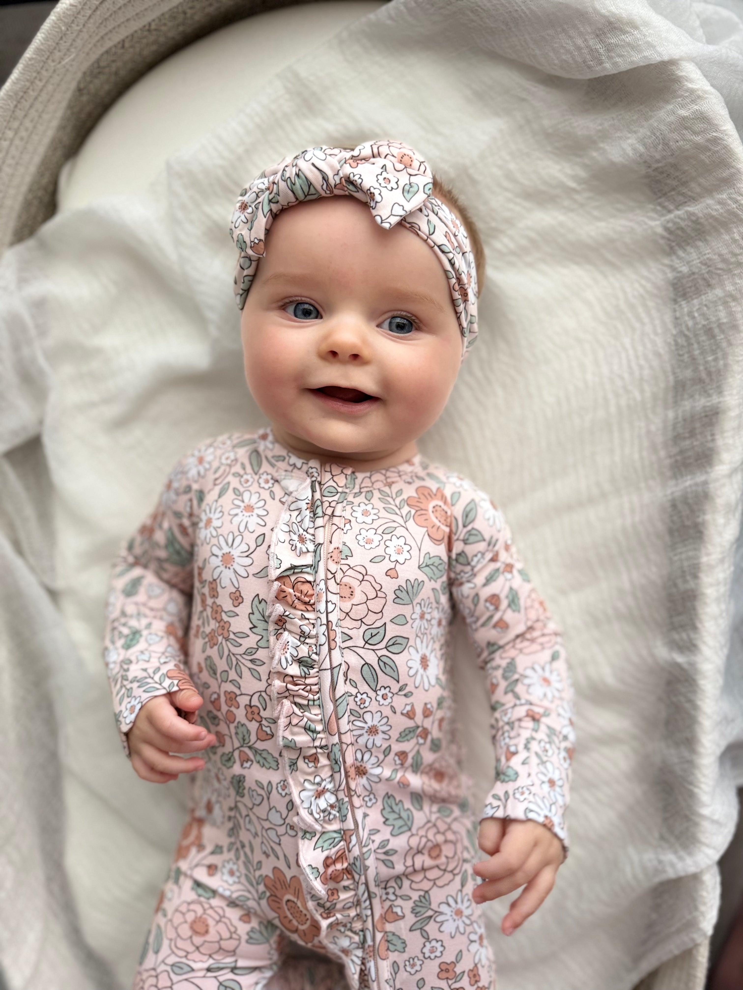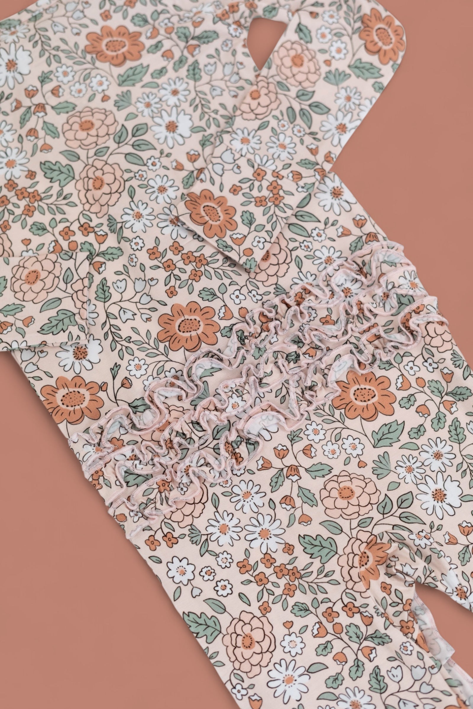 Your little one will be cozy as can be in the Autumn Blossom Dream Ruffle Romper! Featuring a vintage-inspired floral print and delicate ruffle details, this one-piece is made from buttery-soft fabric that’s perfect for play, naps, and everything in between. With built-in mittens, footies, and a double zipper for easy changes, it’s as practical as it is precious.