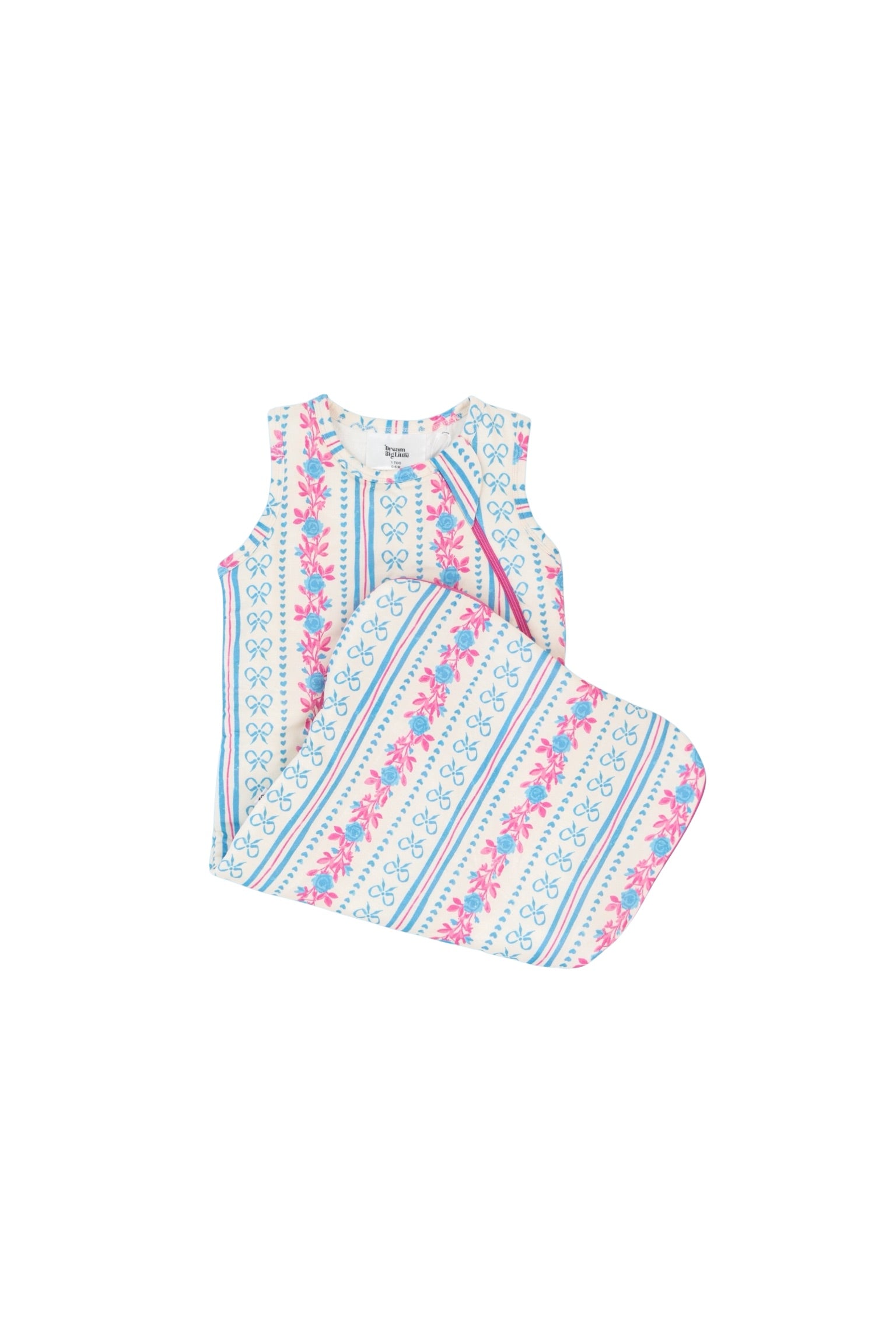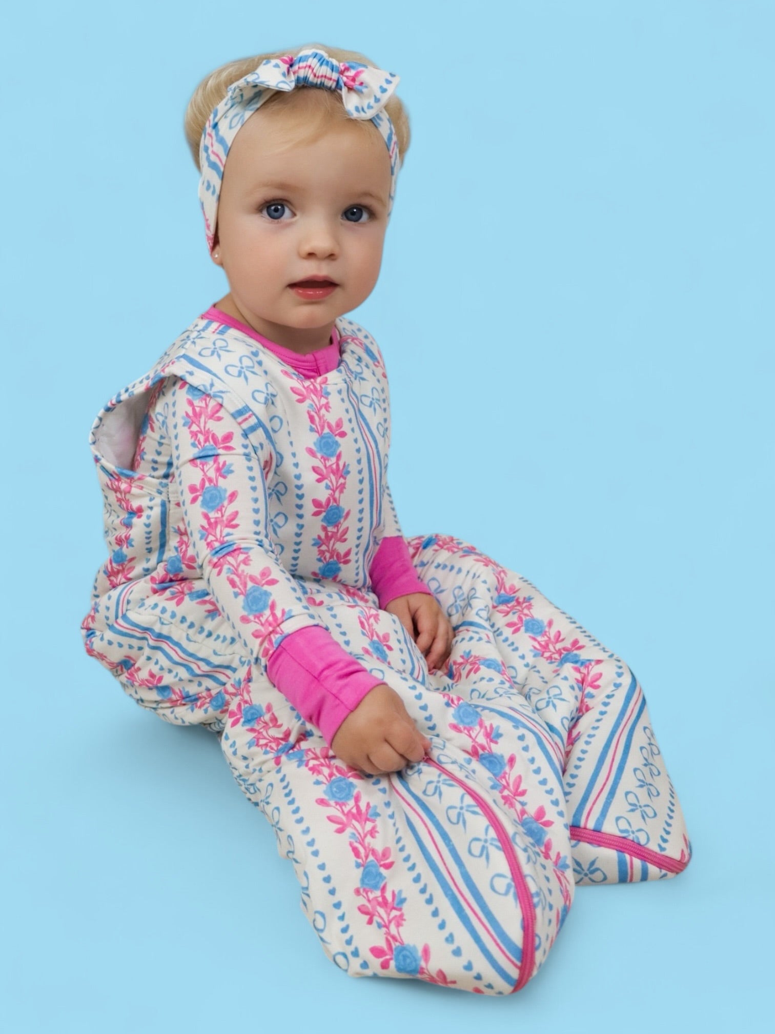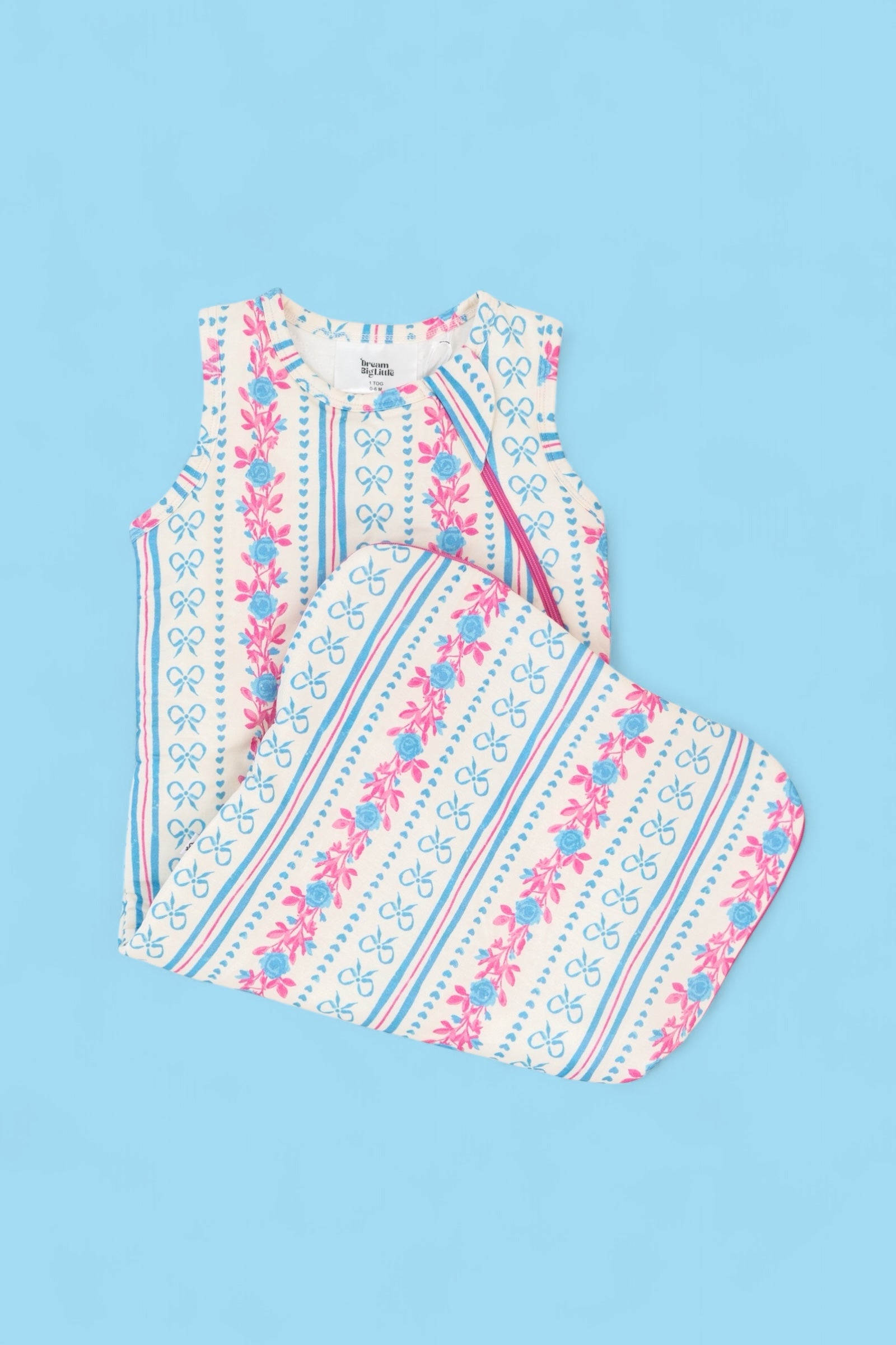 Made from our signature bamboo viscose blend, this sleeveless sleep sack is gentle on sensitive skin and designed for year-round comfort (1.0 TOG). The dreamy Petite Posie print features soft vertical stripes of powder blue bows, pink florals, and tiny hearts—bringing vintage charm to your little one’s bedtime routine.