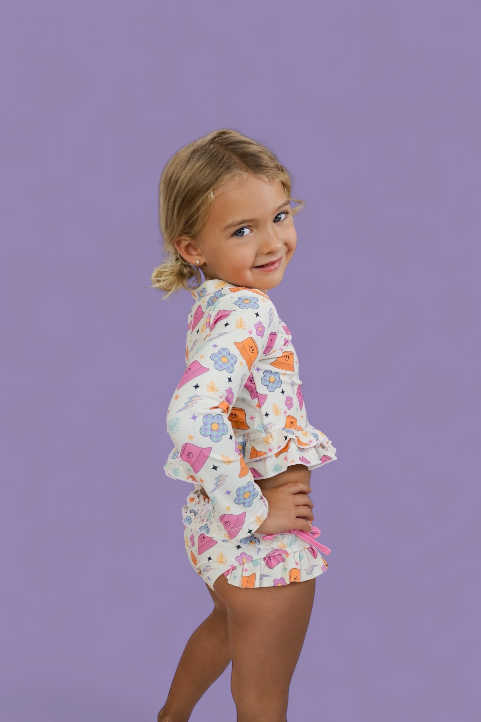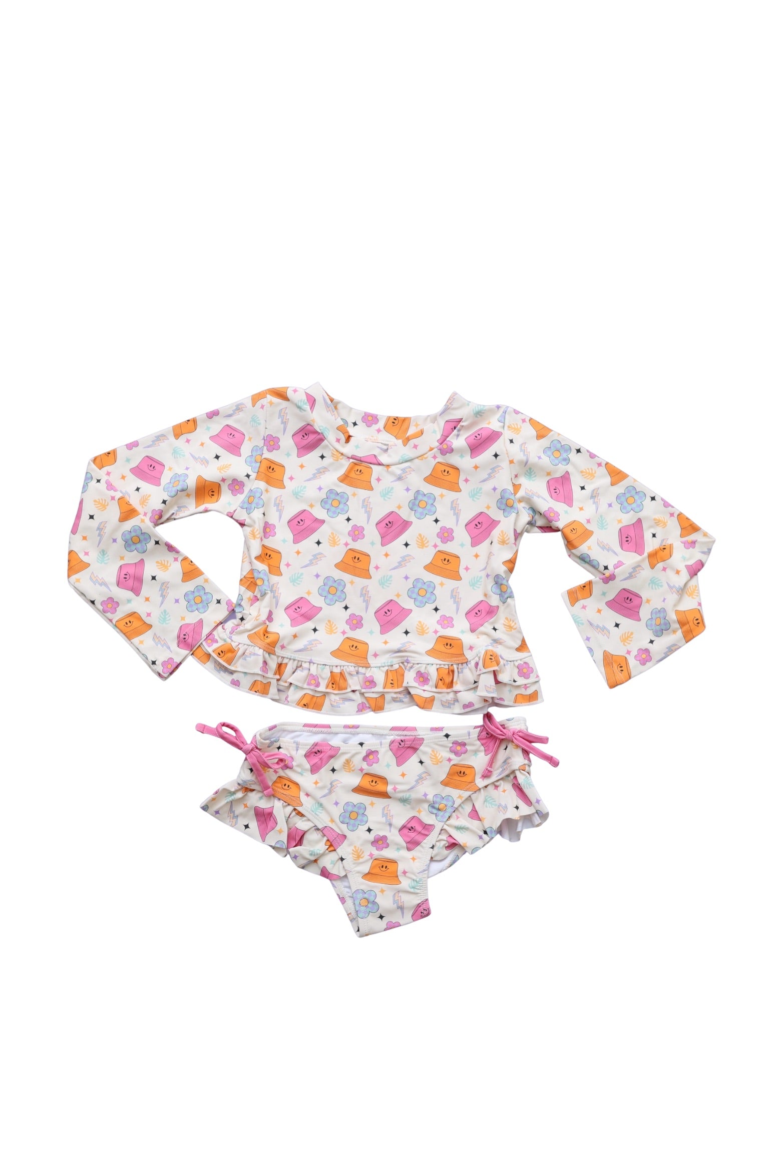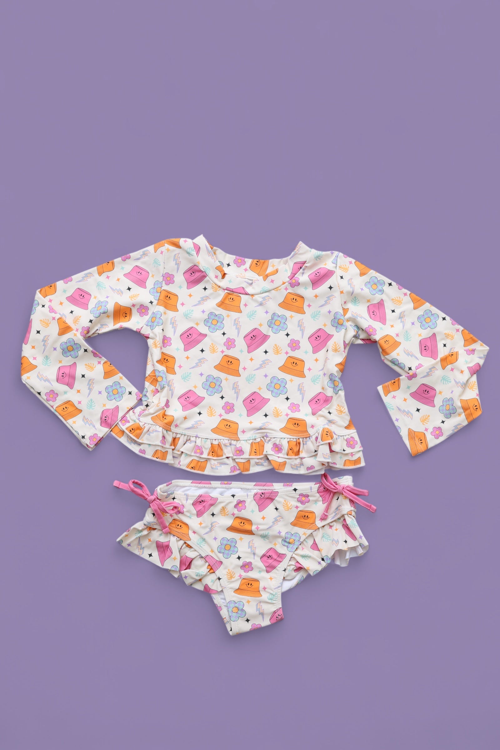 Keep it cute and covered with our BEACH FOR DAISIES Dream Two-Piece Rash Guard Ruffle Swimsuit! This sunny-day set features a pastel-perfect mix of daisies, smiley bucket hats, and tropical touches for the ultimate beachy vibe. The long-sleeve rash guard offers sun protection with a playful twist, while the ruffle-trimmed bottoms bring the fun. Perfect for your little sunshine who’s ready to swim, smile, and shine! ☀️🌊💖