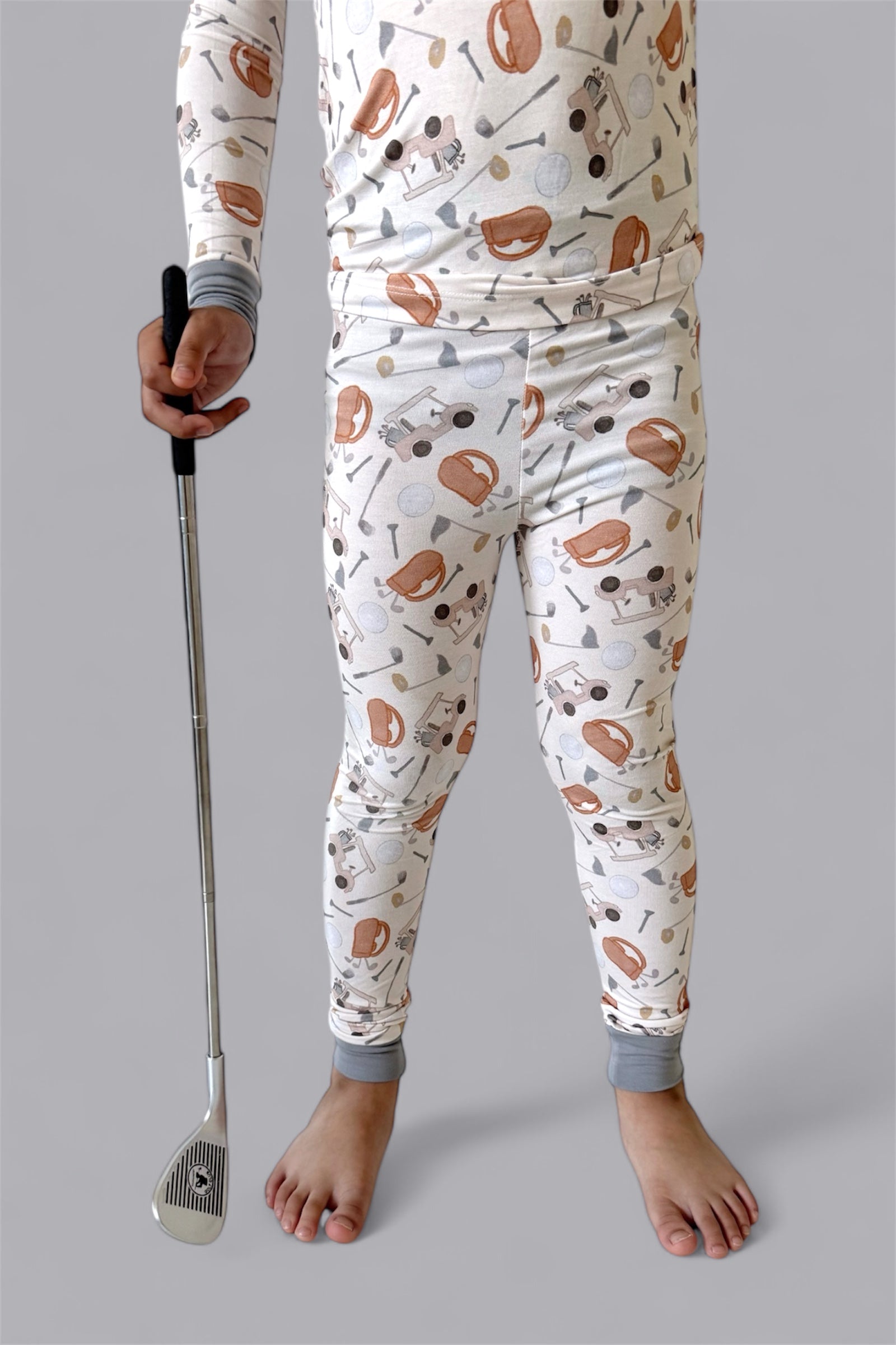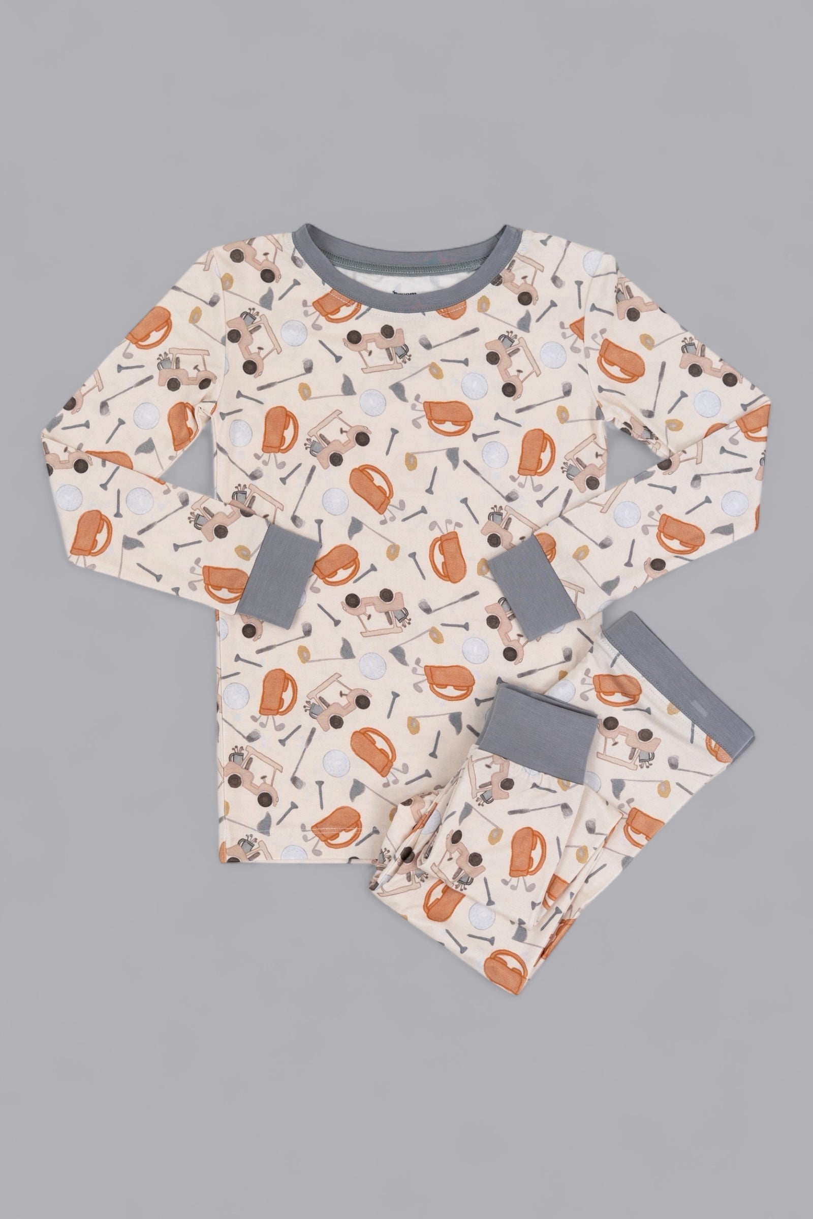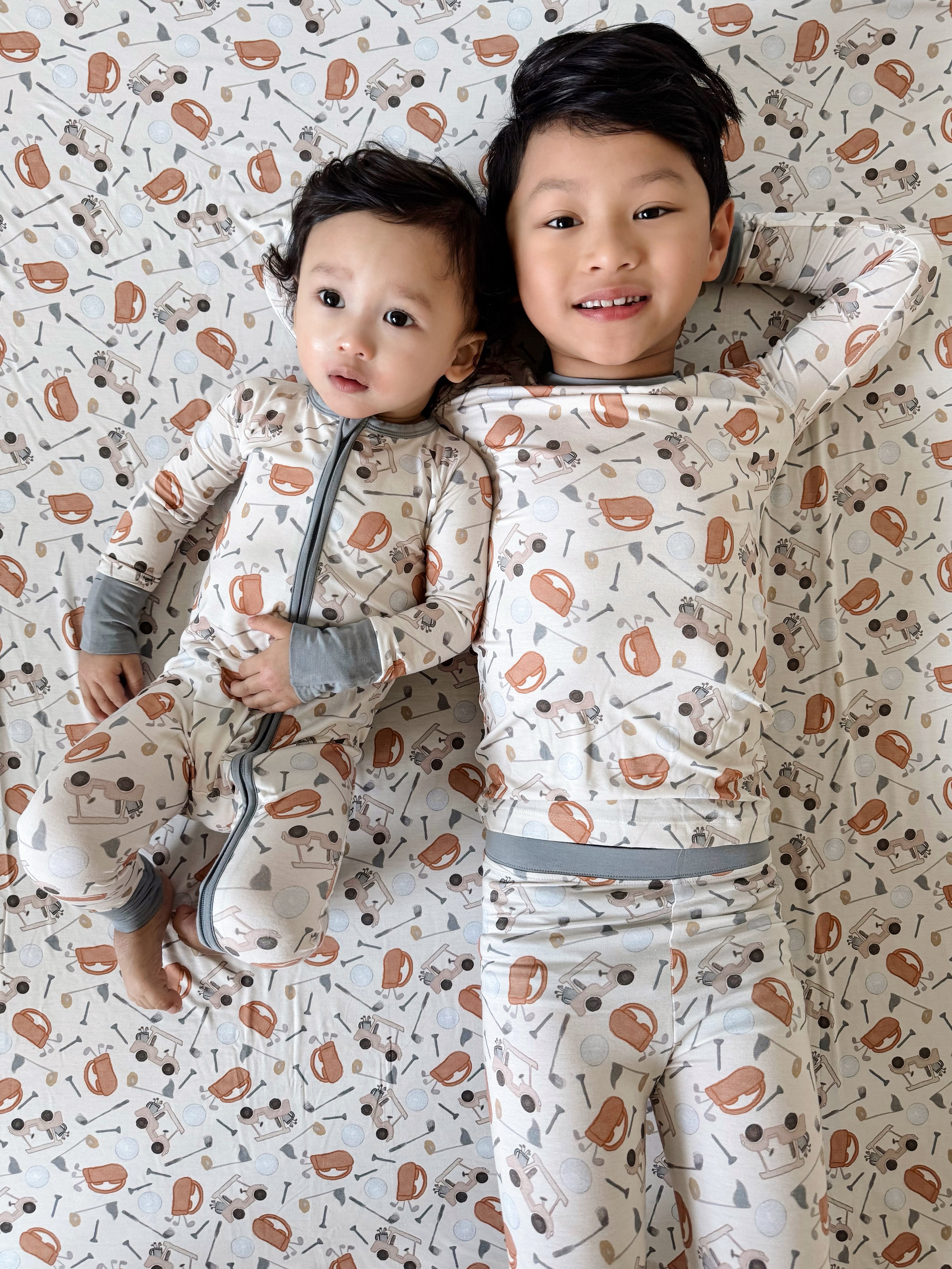 This playful golf-themed print features soft illustrations of golf carts, clubs, balls, and caps in warm, neutral tones—perfect for your mini golfer in training. Whether they’re dreaming of the green or winding down after a day of play, this set brings a touch of country club flair to every cozy moment.