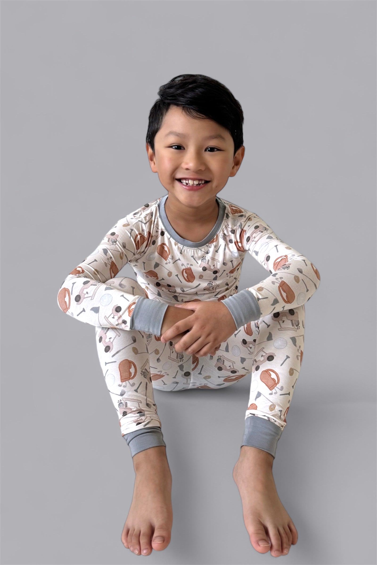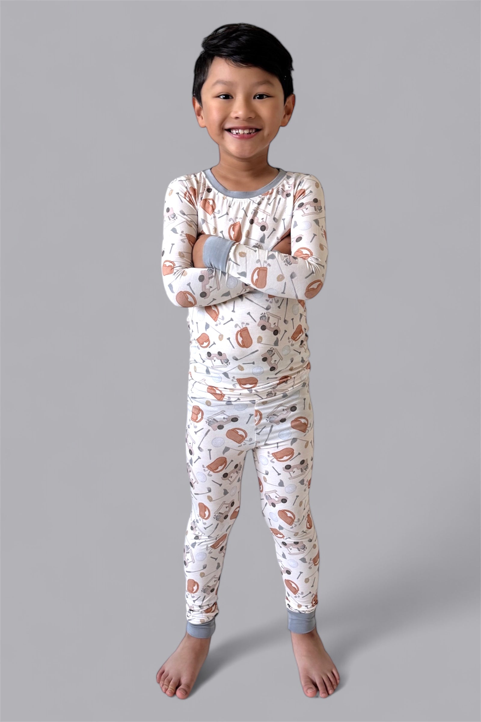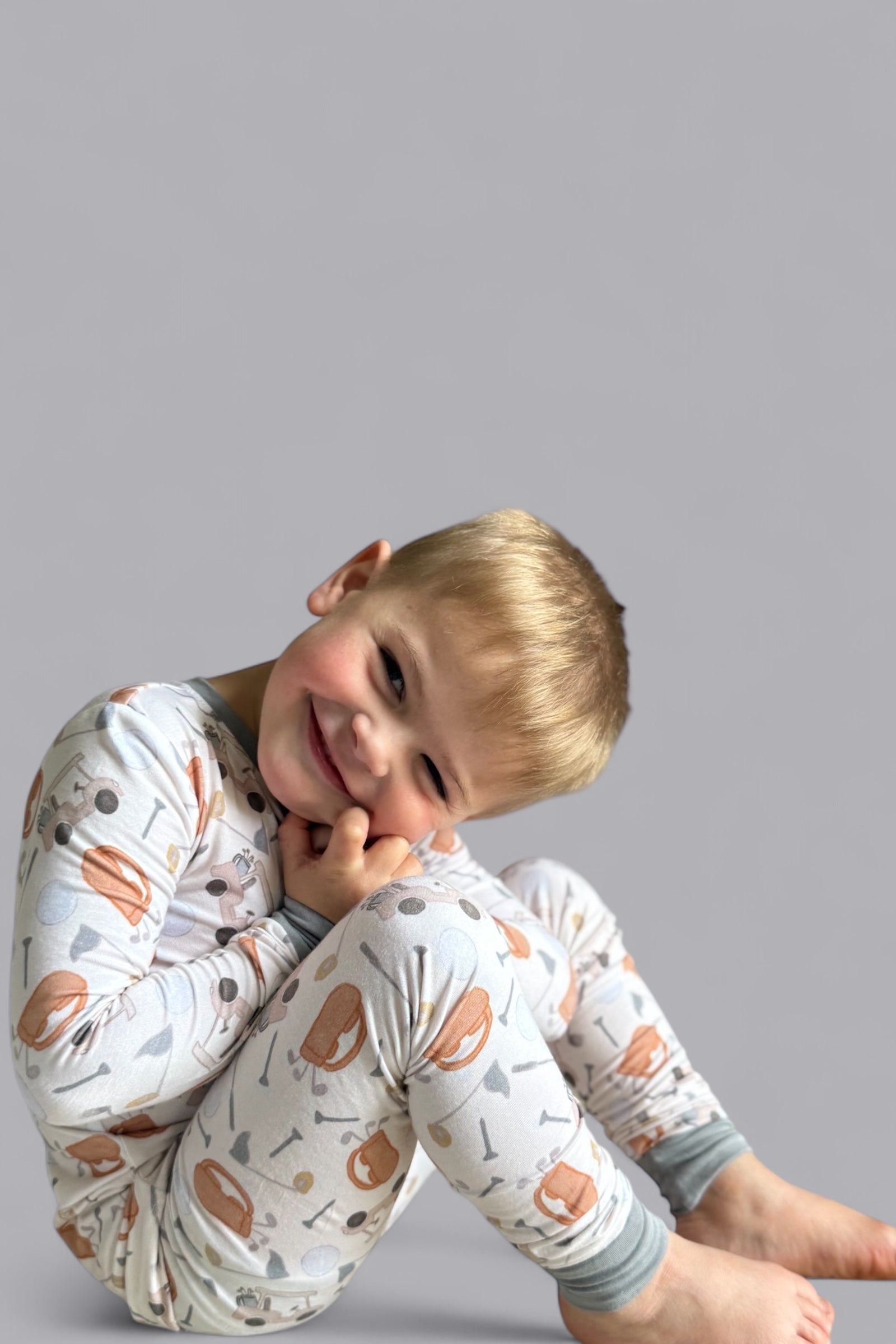 This playful golf-themed print features soft illustrations of golf carts, clubs, balls, and caps in warm, neutral tones—perfect for your mini golfer in training. Whether they’re dreaming of the green or winding down after a day of play, this set brings a touch of country club flair to every cozy moment.