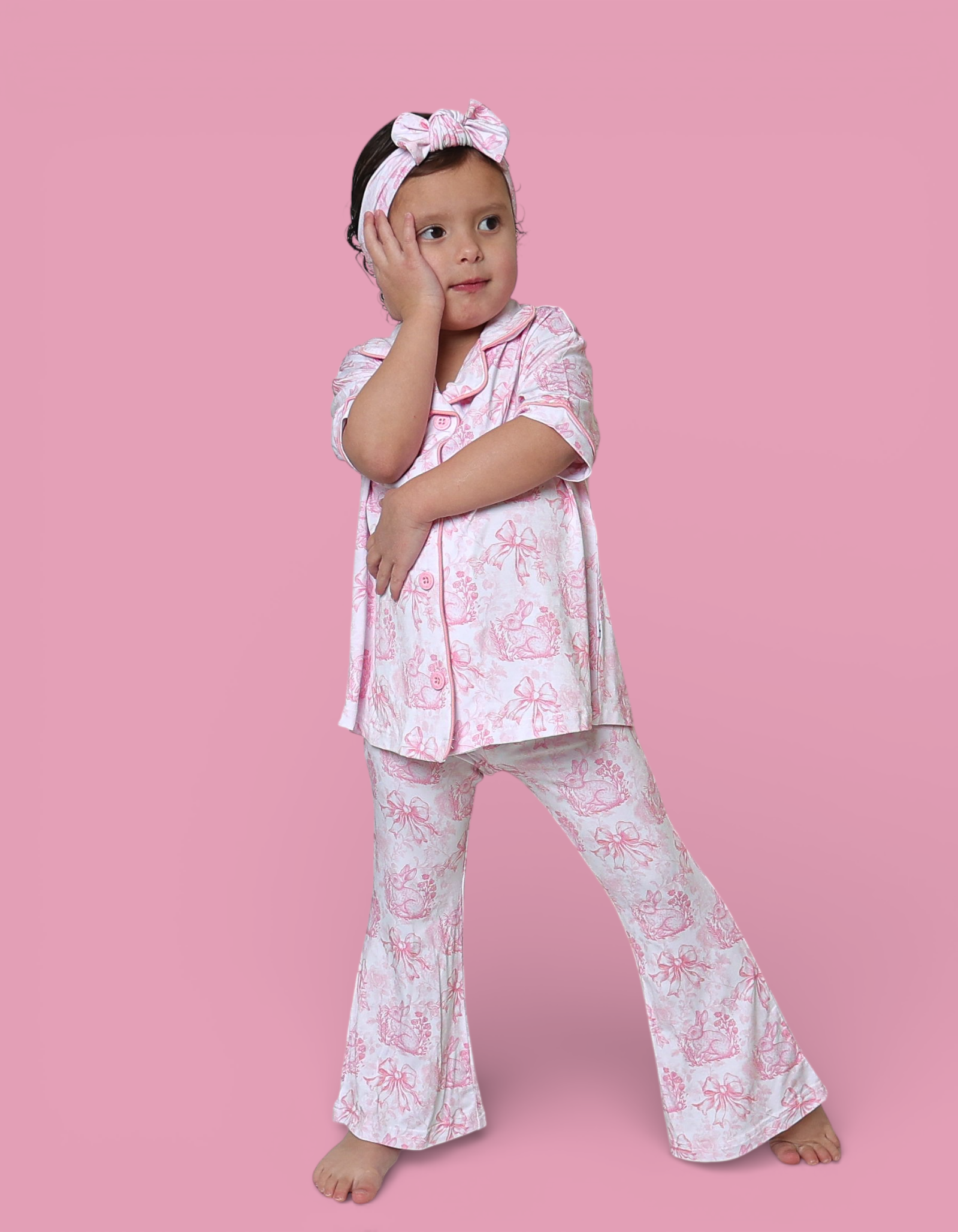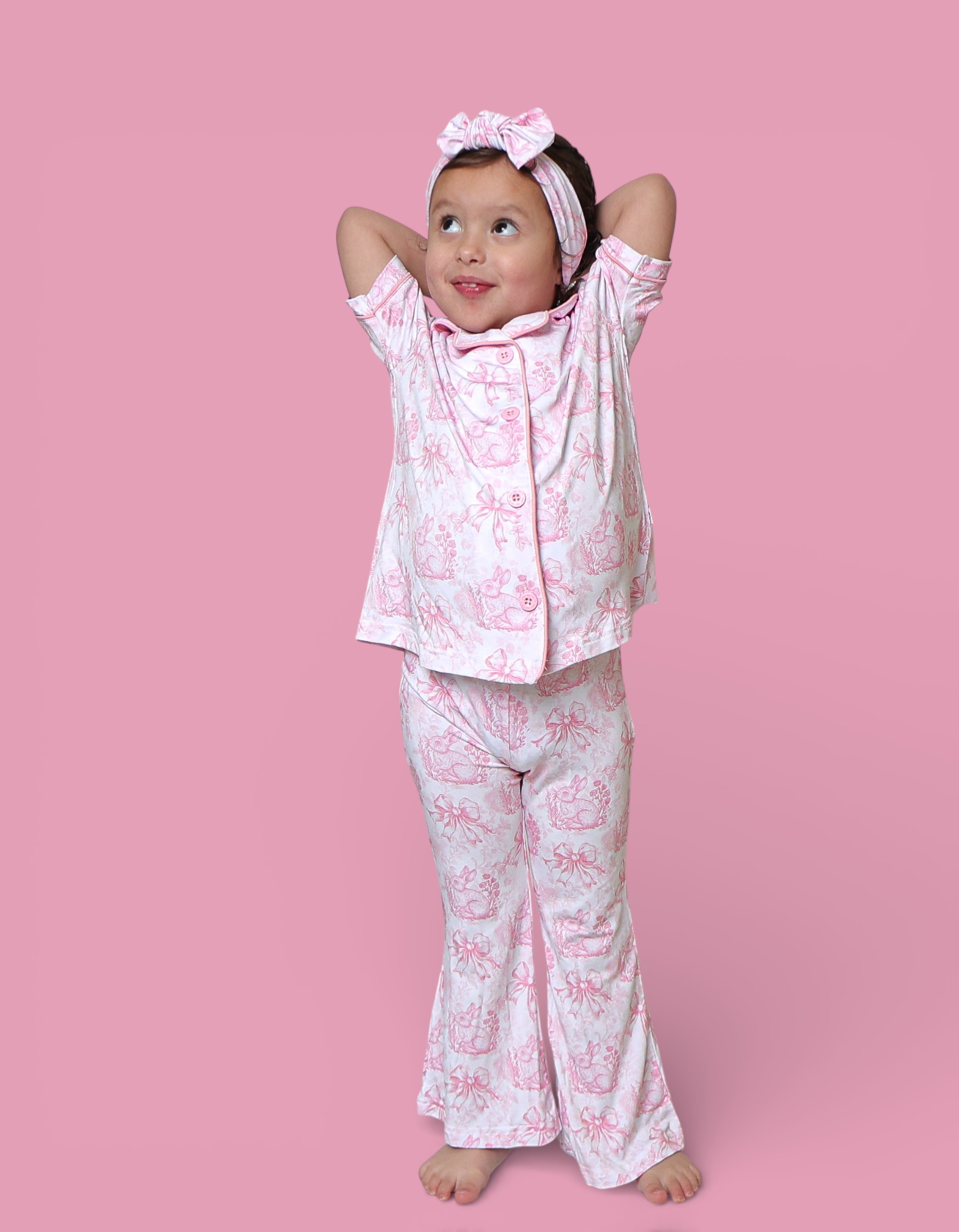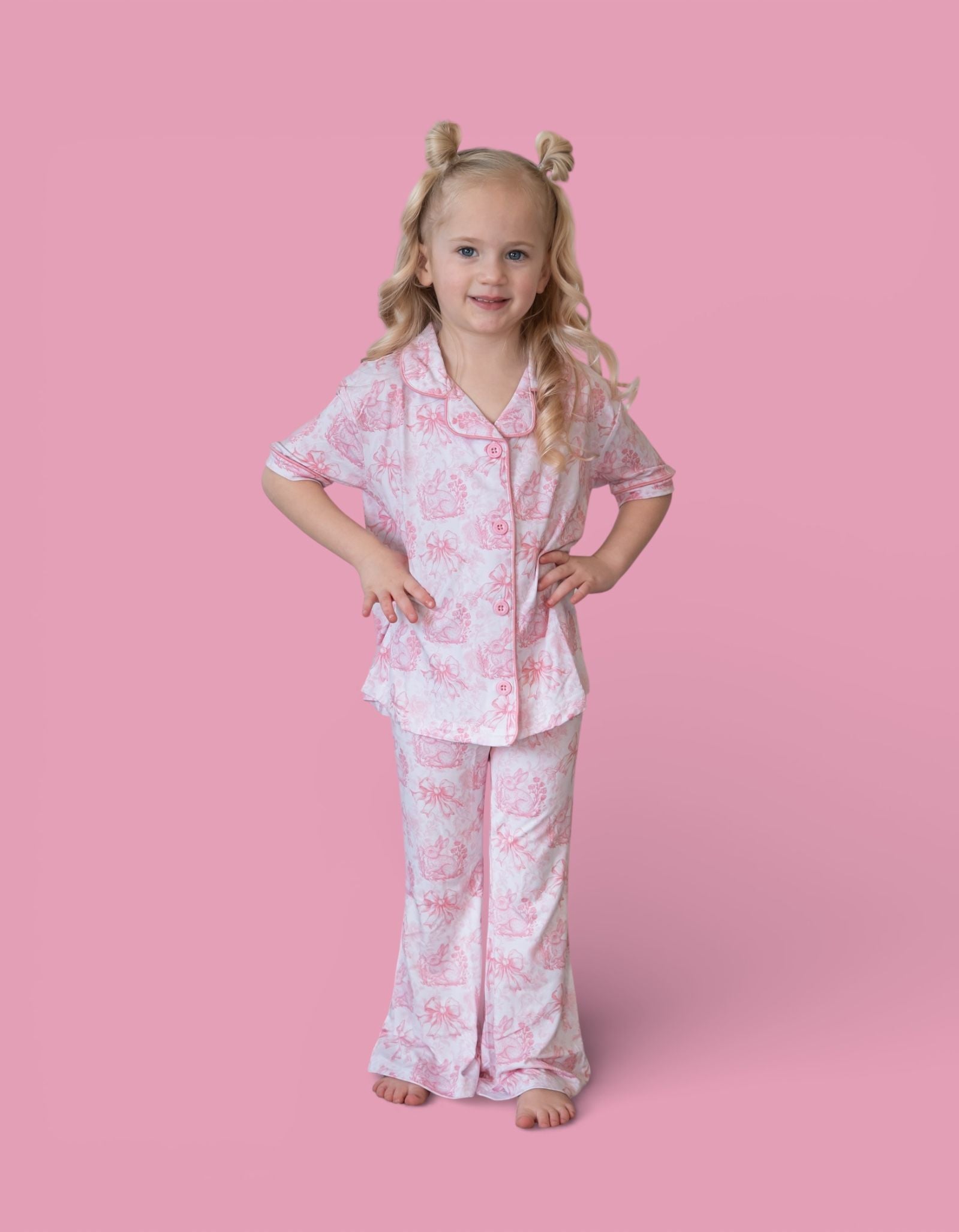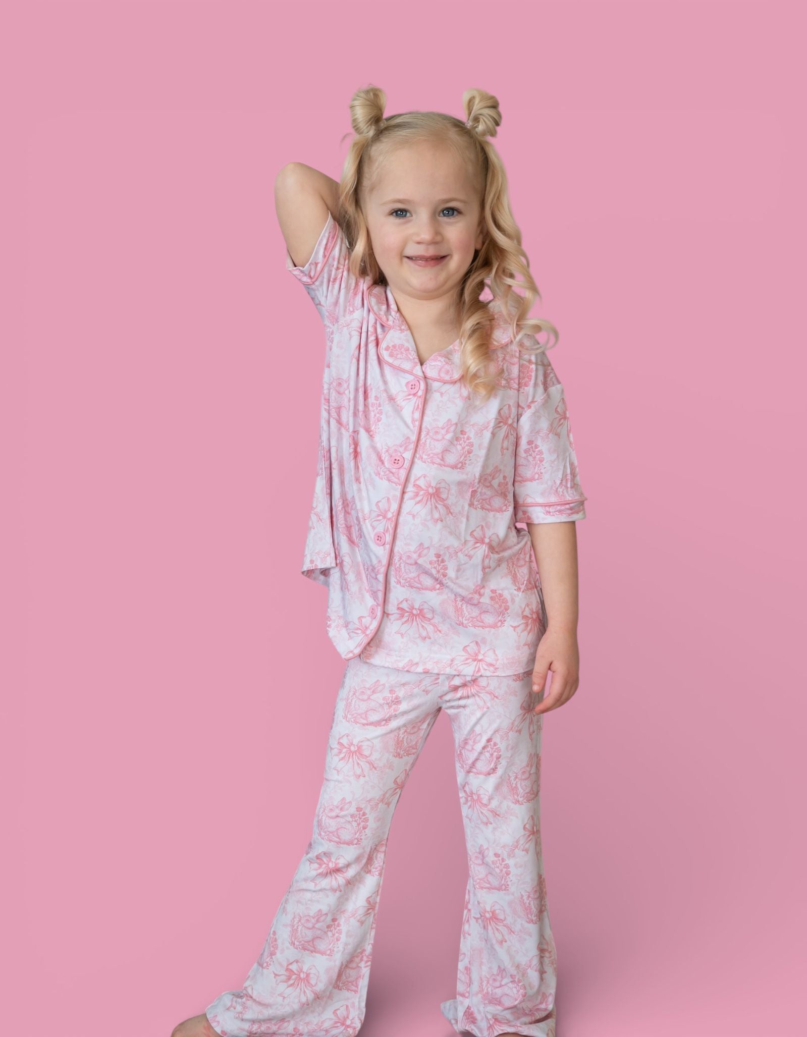 Dreamy, dainty, and oh-so spring. Our Blush Bunny Toile Dream Girl’s Flare Set features a soft pink toile print with bunnies, bows, and florals — a timeless look perfect for Easter celebrations, spring photos, and everyday sweetness. Flutter sleeves and flared pants add an adorable, girly touch for twirls, play, and precious moments. 🌸✨