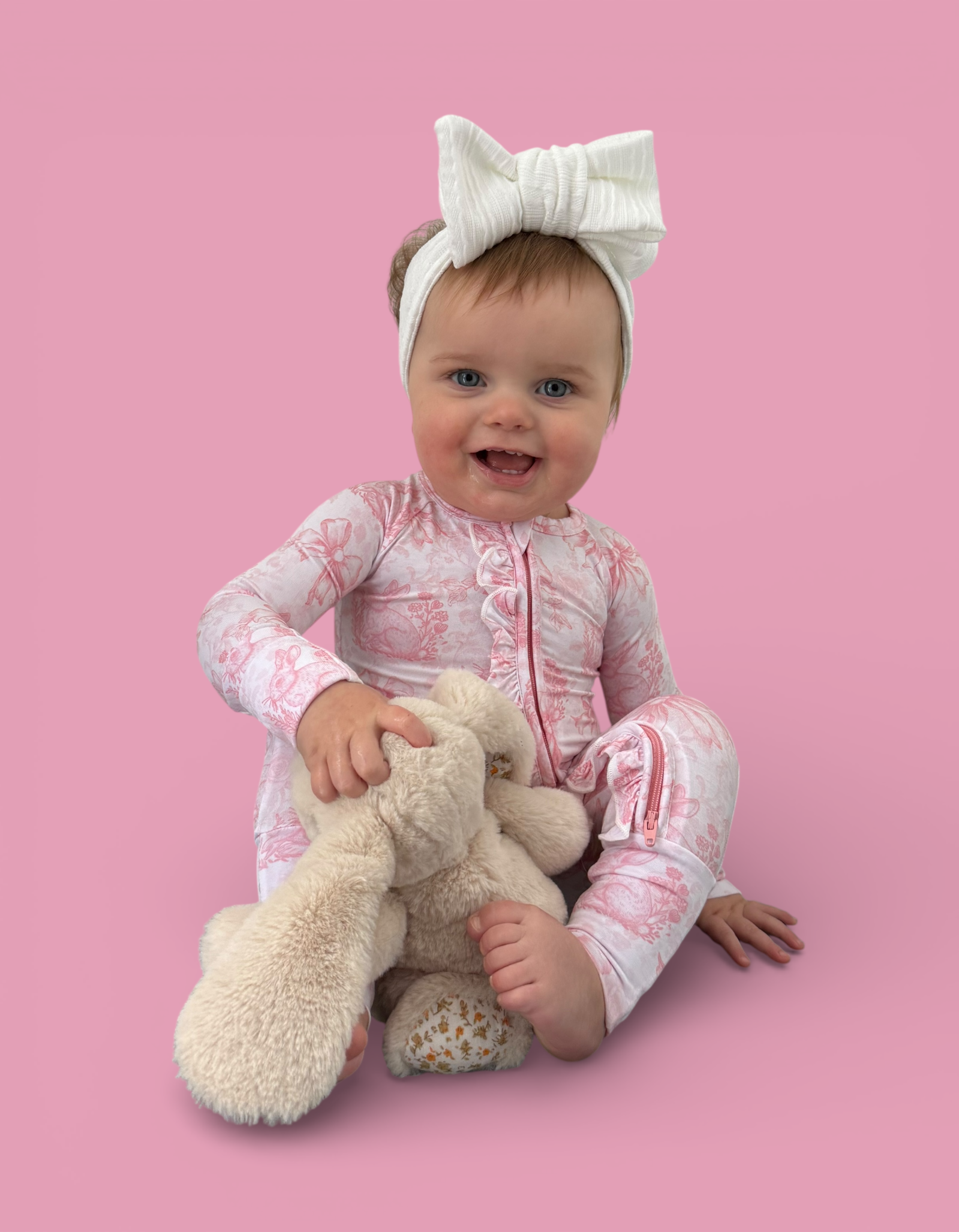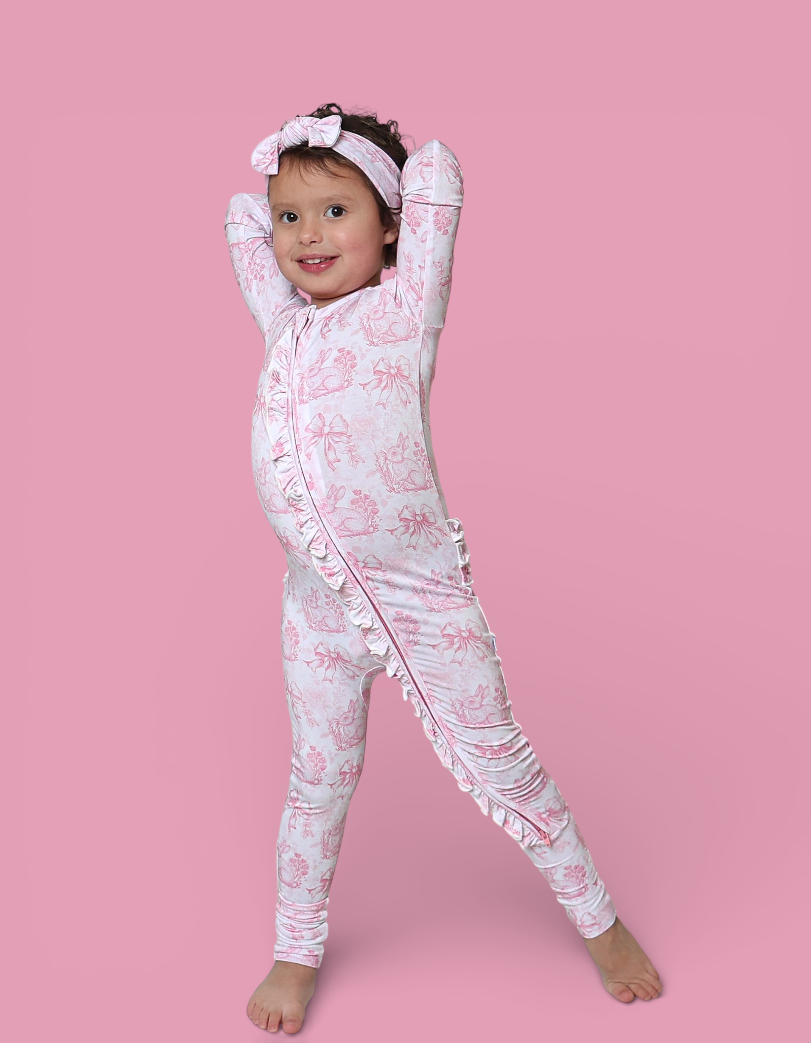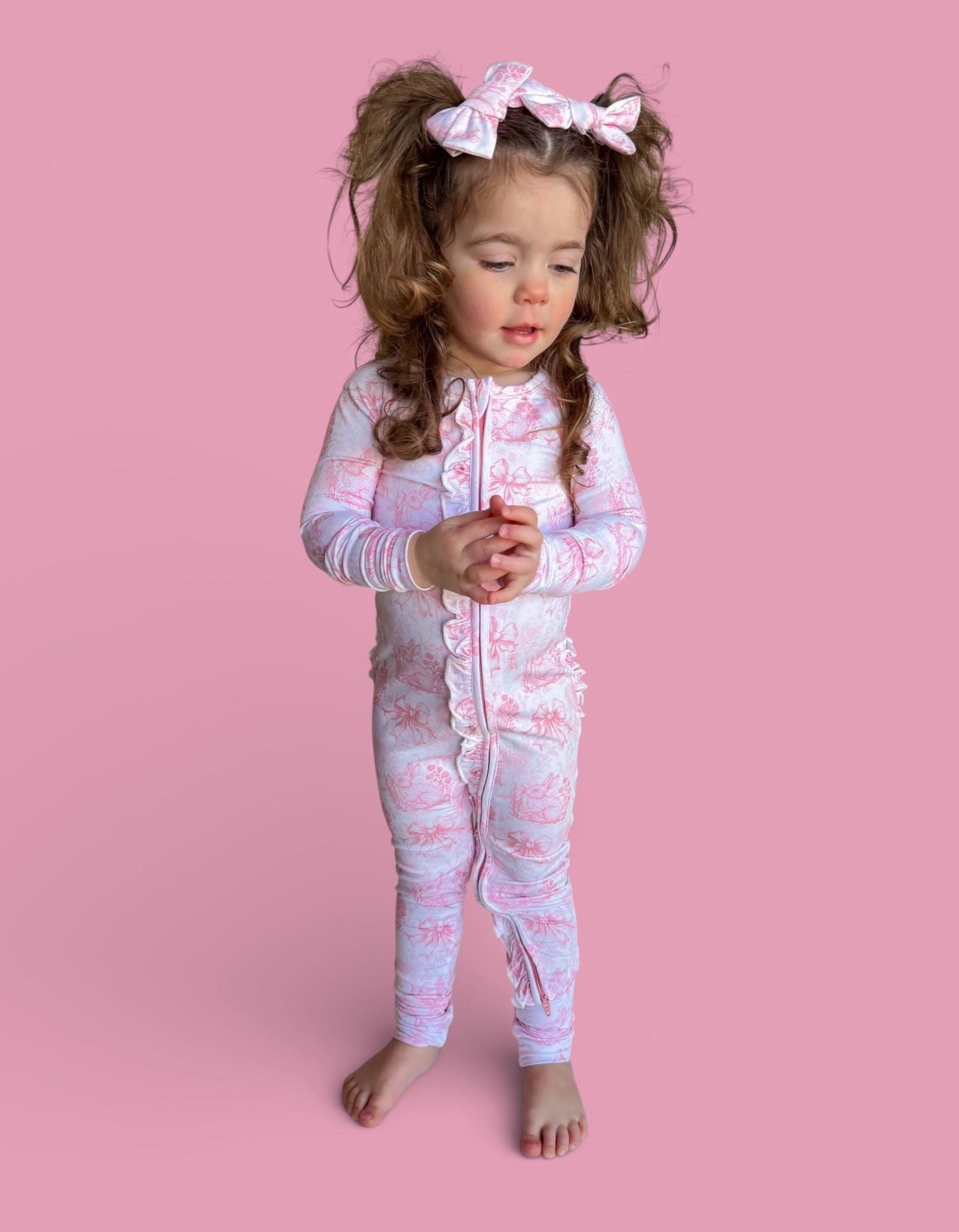 Soft, sweet, and perfectly pink. Our Blush Bunny Toile Dream Ruffle Romper features an elegant toile-style bunny print in a gentle blush tone — complete with delicate florals and bows for the dreamiest spring look. Ruffled trim along the zipper and layered ruffles on the back add an extra touch of charm for your little bunny. 🌸✨