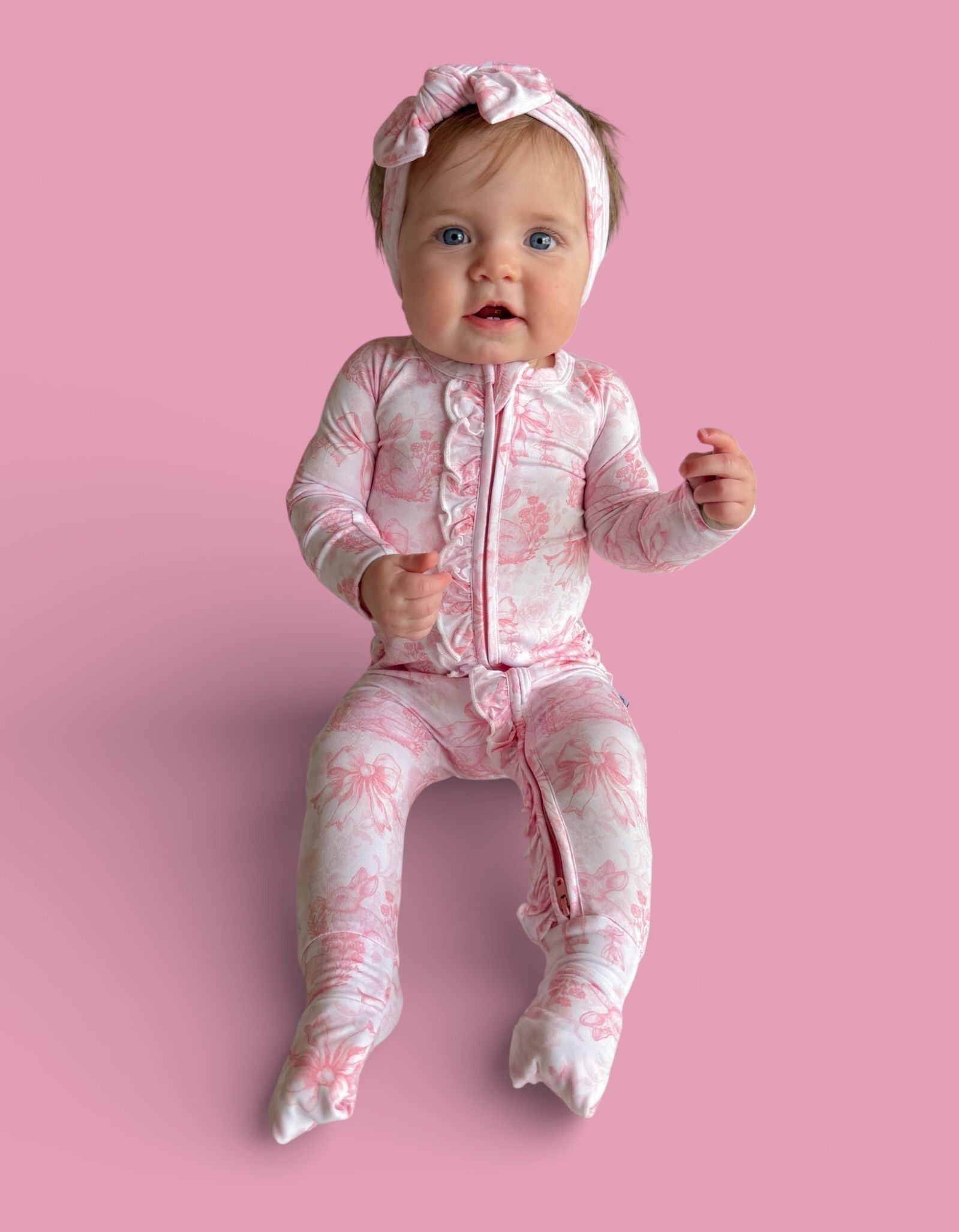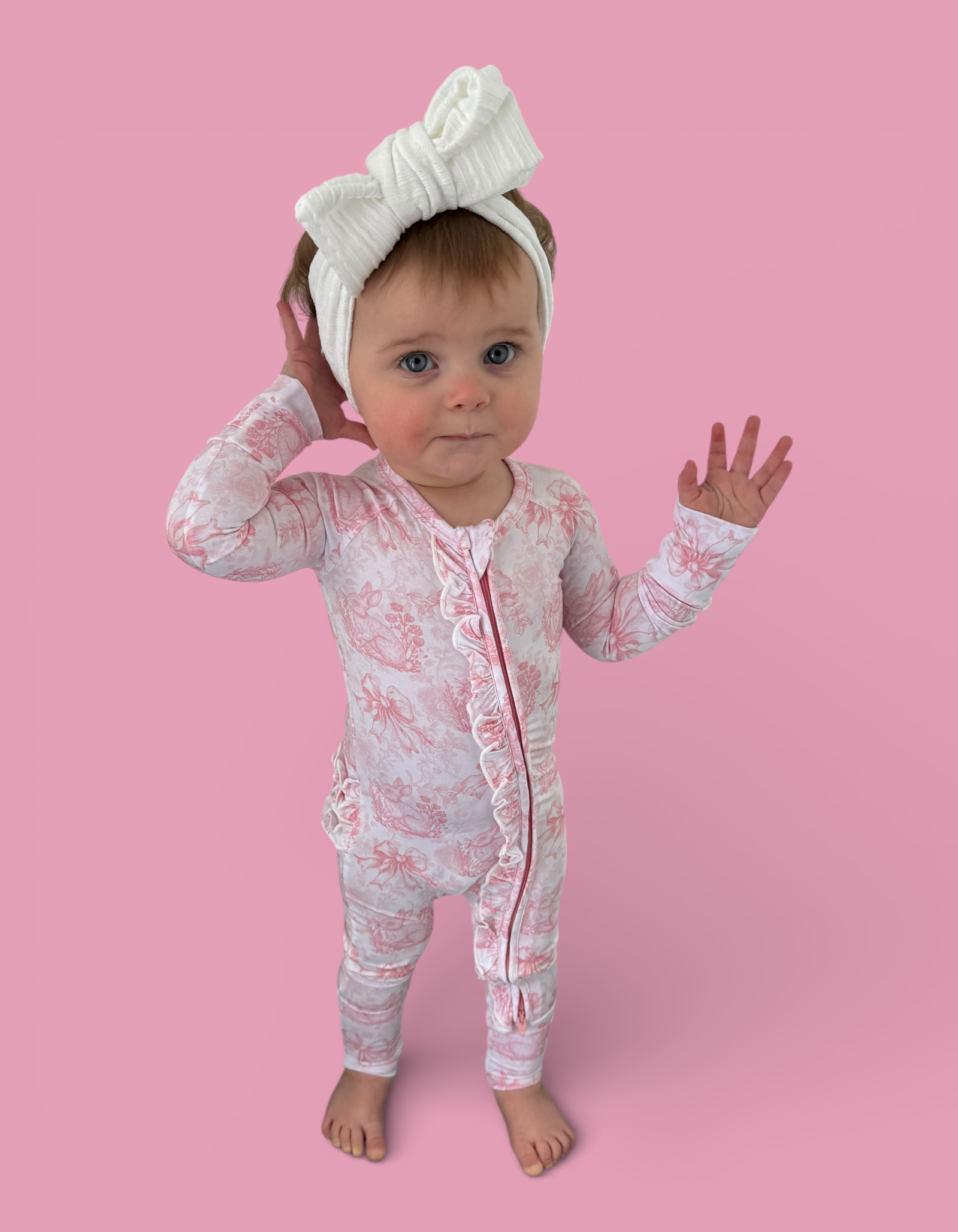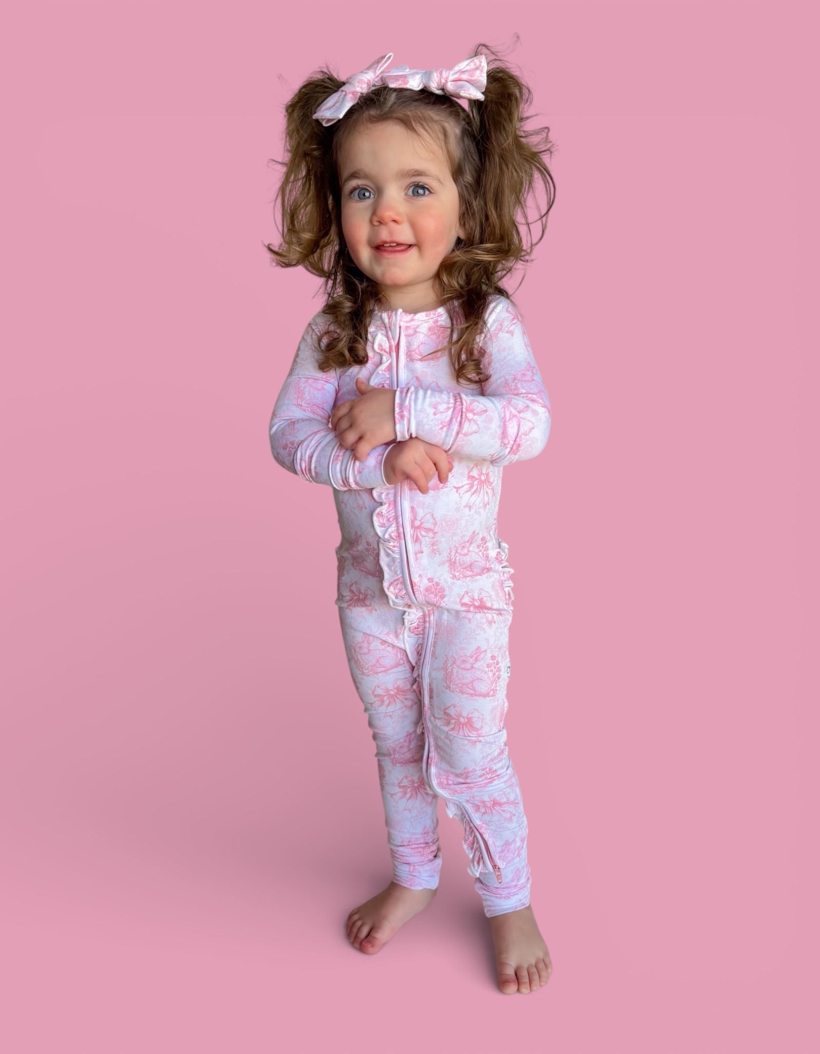 Soft, sweet, and perfectly pink. Our Blush Bunny Toile Dream Ruffle Romper features an elegant toile-style bunny print in a gentle blush tone — complete with delicate florals and bows for the dreamiest spring look. Ruffled trim along the zipper and layered ruffles on the back add an extra touch of charm for your little bunny. 🌸✨